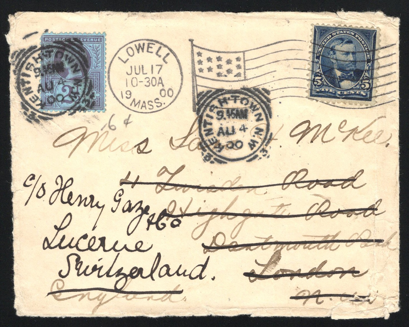 1349 CVR 281 image1900 5c Cover to GB, Forwarded to Switzerland, mailed from Lowell, Mass on JUL.17.1900 to London, England (JUL.26 receiver on back), franked with a 5c blue Grant. Two Kentish Town squared circles on front dated AUG.4.1900, one tying a 2½d blue QV (GB # 114) to forward to Lucerne, Switzerland, with next day receiver on back. Open on three sides and edge wear, else a fine cover.