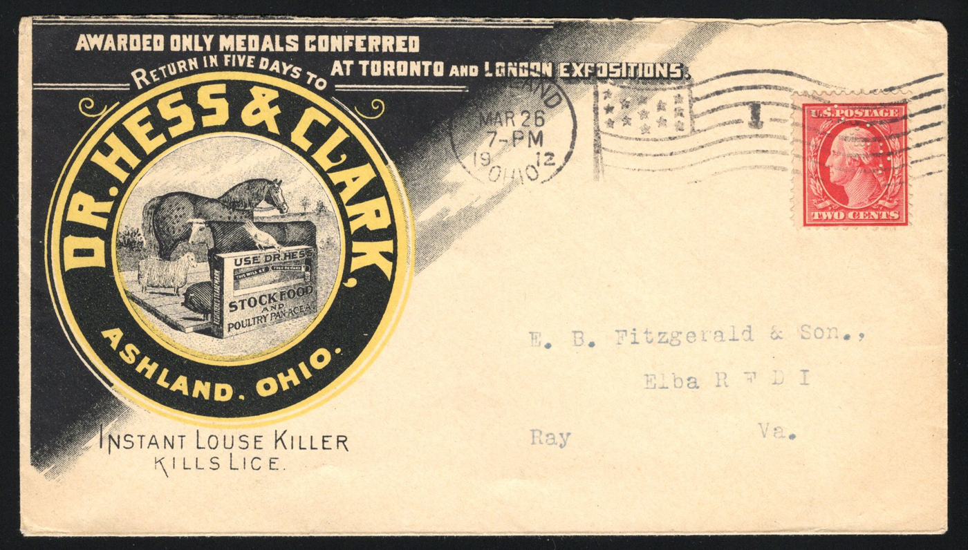 1351 CVR 375 image1912 2c Hess & Clark Illustrated Advertising Perfin Cover, mailed from Ashland, Ohio on MAR.26.1912 to Ray, Virginia (faint receiver on back), franked with a 2c red Washington perfined for Hess & Clark (broken pins), tied by a flag cancel. A lovely and very fine illustrated cover.