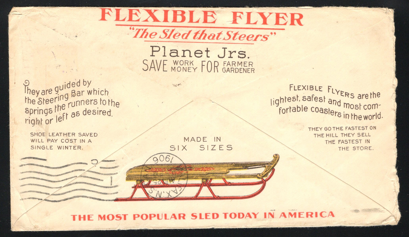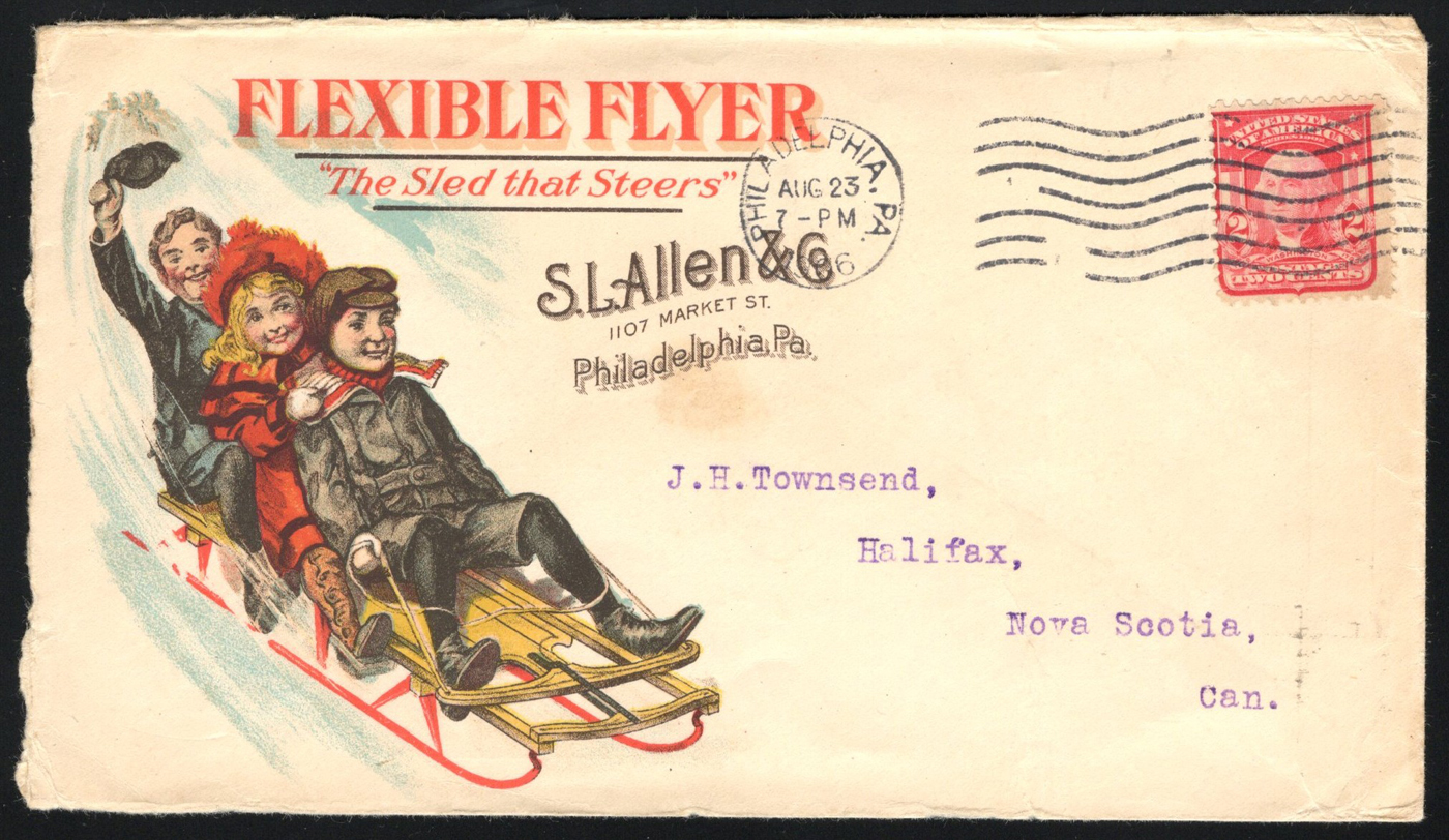 1350 CVR 319 image1906 2c Illustrated Advertising Cover to Canada, mailed from Philadelphia on AUG.23.1906 to Halifax, Nova Scotia (AUG.25 receiver on back) and is franked with a 2c Washington (Scott 319). The two-sided multi-colour illustrated advertising is for the Flexible Flyer toboggan. Slight edge wear, still a very fine and attractive cover. (Scan 1) (Scan 2) (All Scans)
