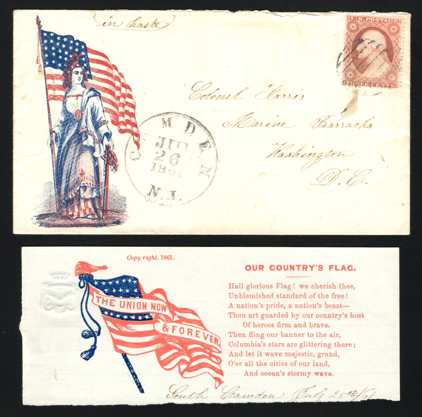 1344 CVR 26 image1861 3c Patriotic Illustrated Cover, mailed from Camden, NJ on JUL.26.1861 (large c.d.s. free strike) to Colonel Harris, Marine Barracks, Washington DC and endorsed "in haste". The cover is franked by a 3c Washington (either Type III or IV) tied by a circular grid, with a lovely blue and red illustration, and encloses an illustrated "The Union Now & Forever" flag letterhead, plus a flag poem, very fine.