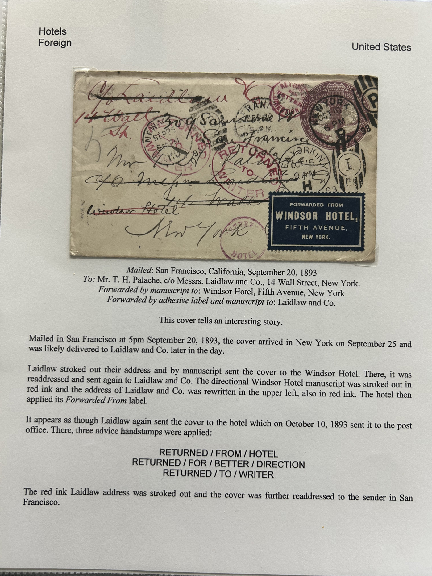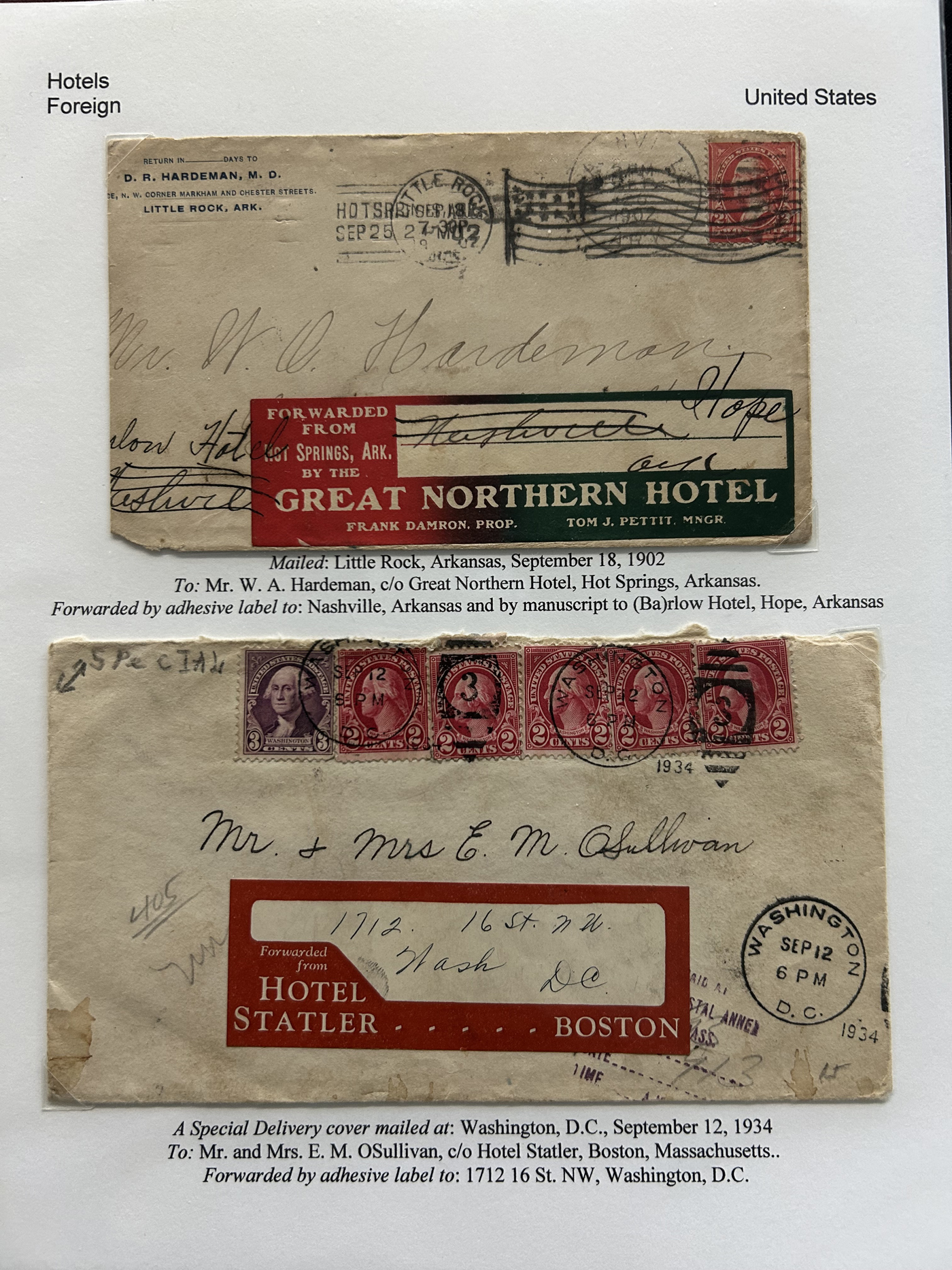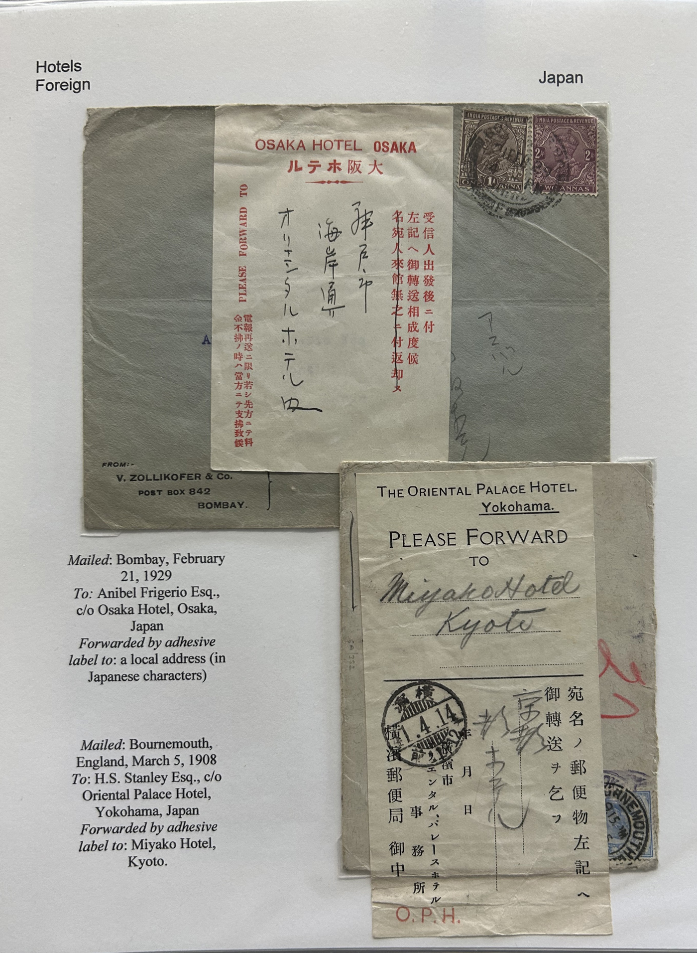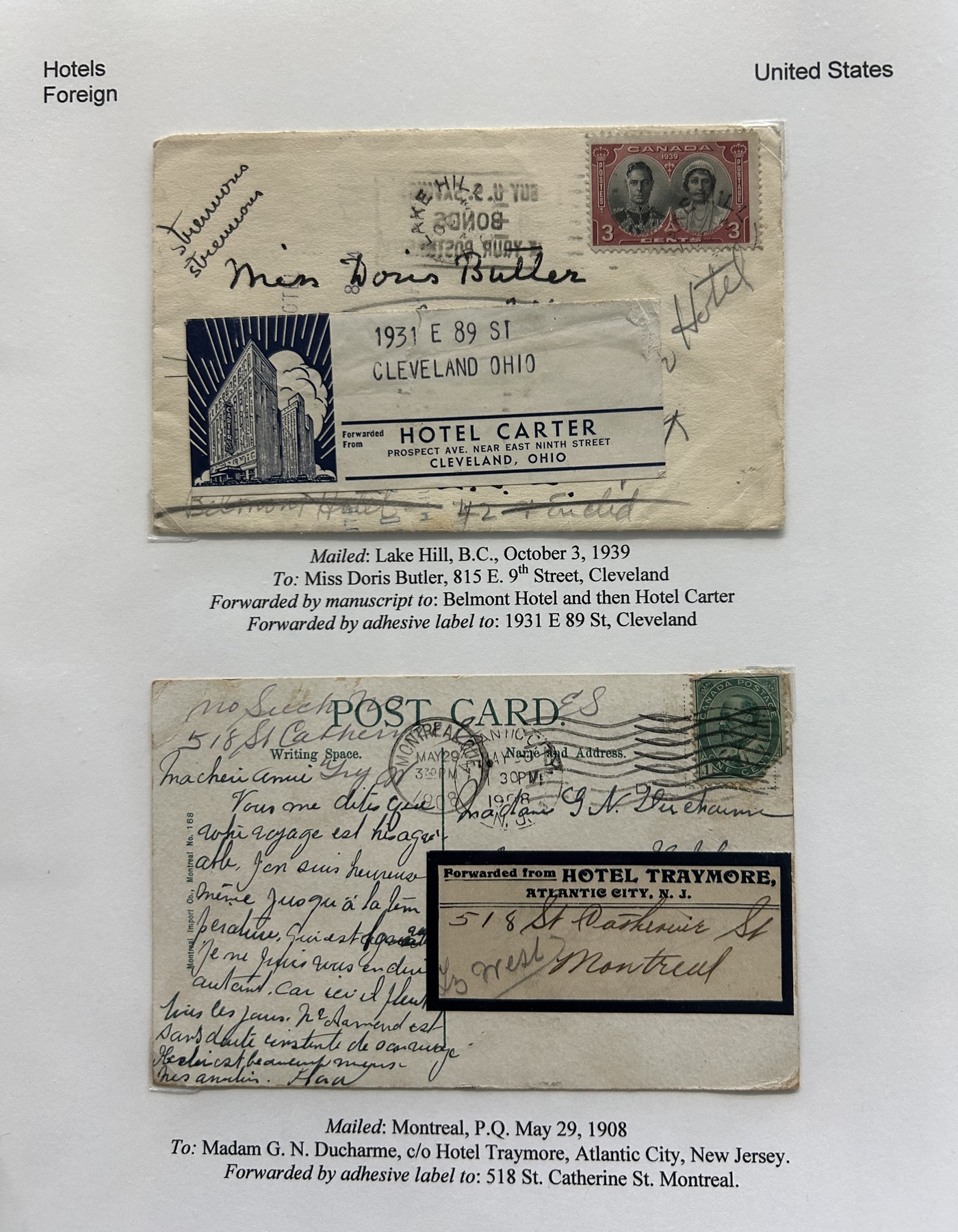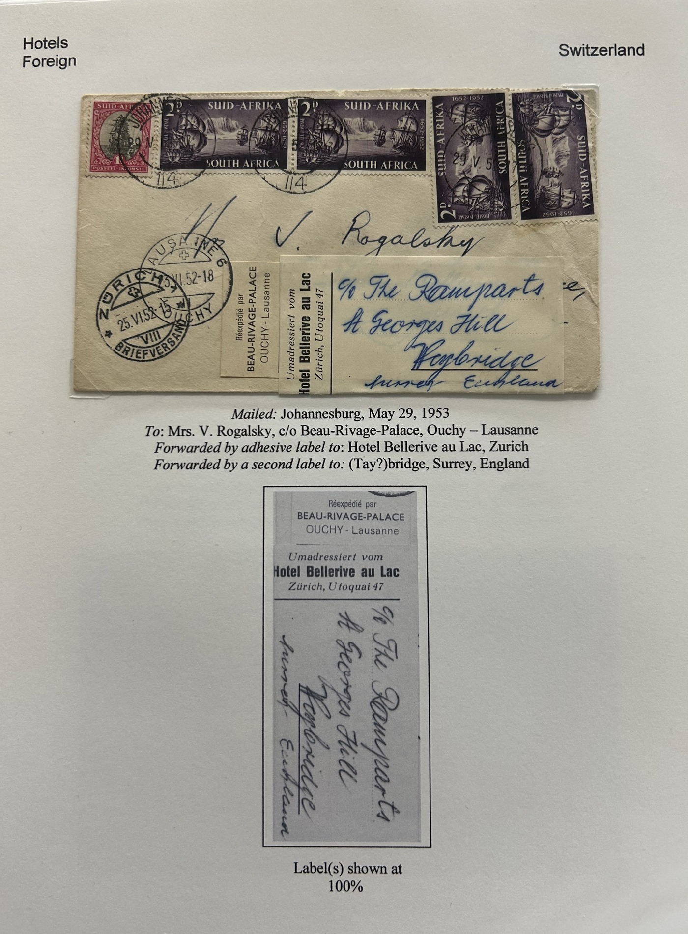 1353 CVR   imageSpecialized Collection / Exhibit of 63 Different Worldwide Hotel Forwarding Labels on Cover, 1890s to 1950s, majority are well written-up on pages, sorted alphabetically by country or continent. Includes a great variety of countries, with good frankings, postmarks (noted a Lake Hill BC), routings, some have been forwarded or re-directed more than once, etc. A fascinating collection of these scarcer labels, which all have the hotel name printed, with a space to put a forwarding address for a guest who has left. Very fine, see our online pictures for a sampling. A great opportunity to start a new collection, or to add to an existing one. (Scan 1) (Scan 2) (Scan 3) (Scan 4) (Scan 5) (Scan 6) (Scan 7) (Scan 8) (Scan 9) (Scan 10) (Scan 11) (Scan 12) (Scan 13) (Scan 14) (All Scans)
