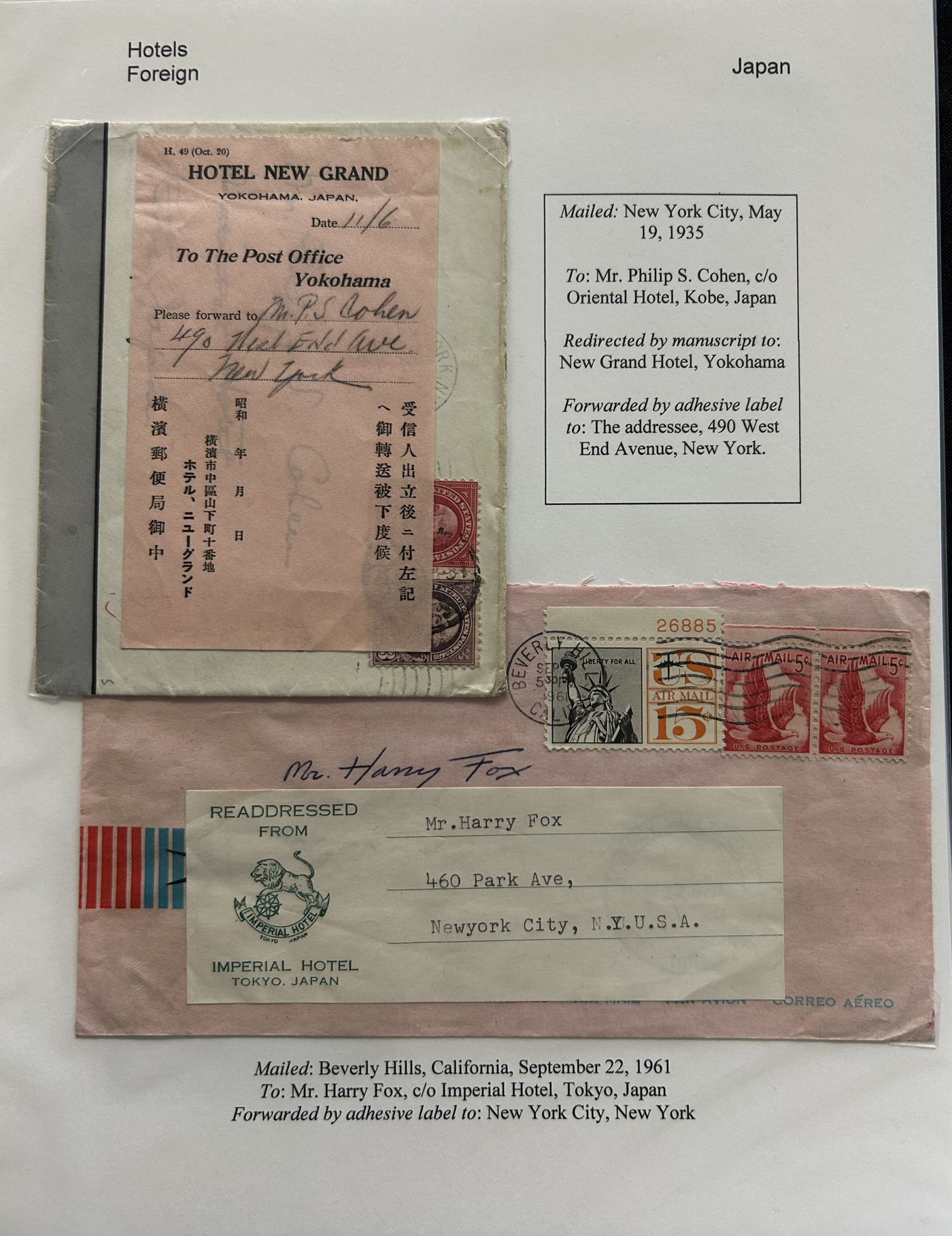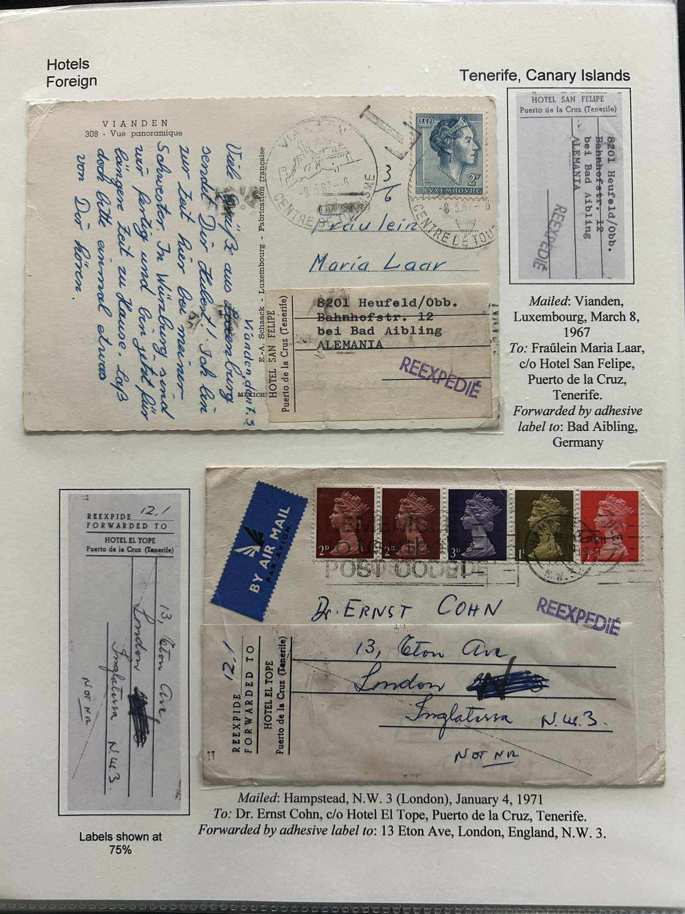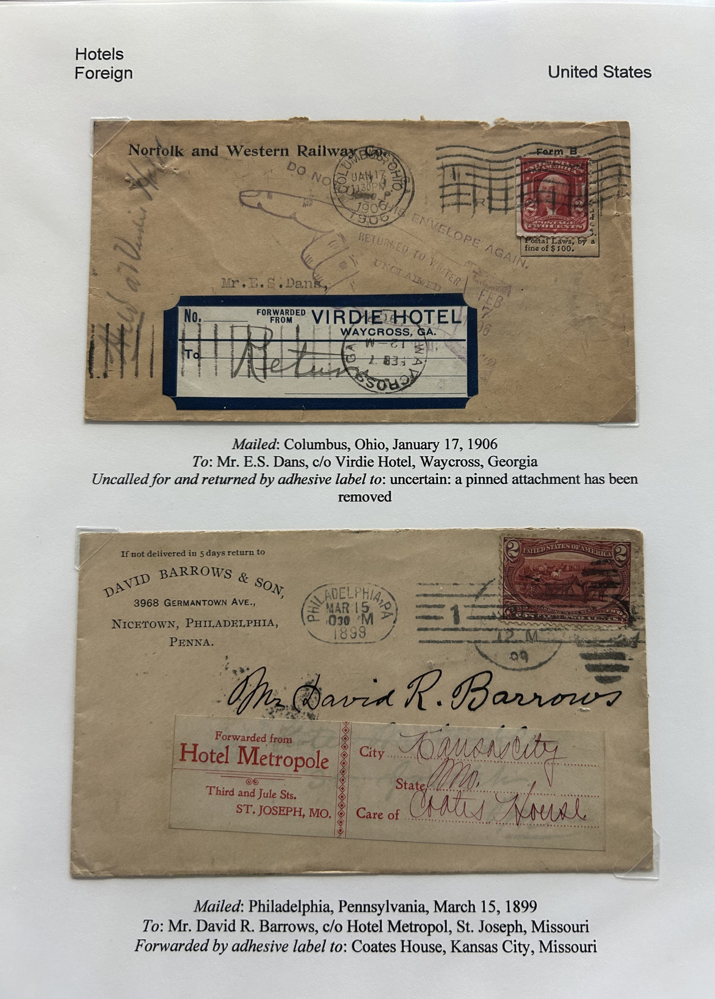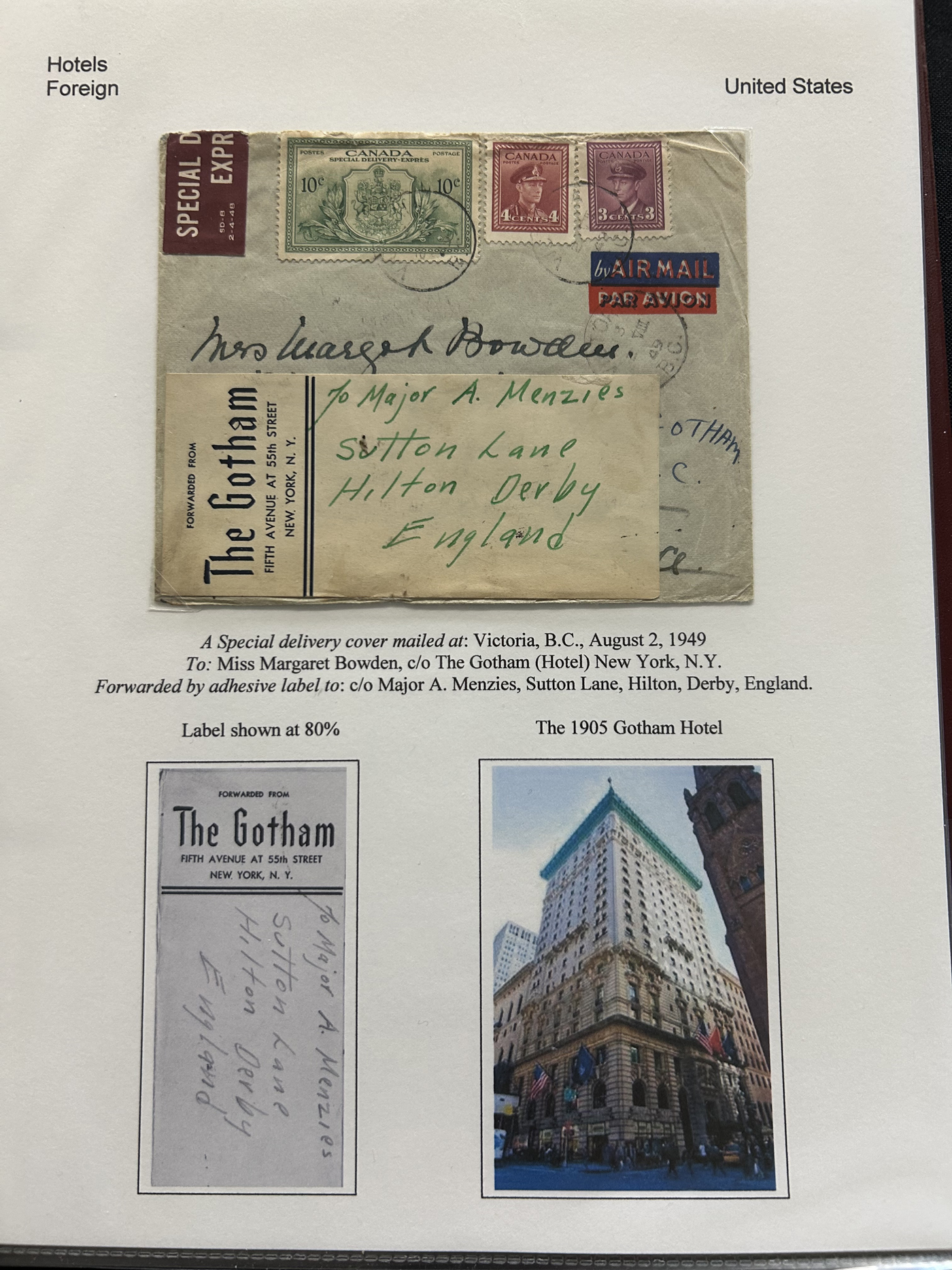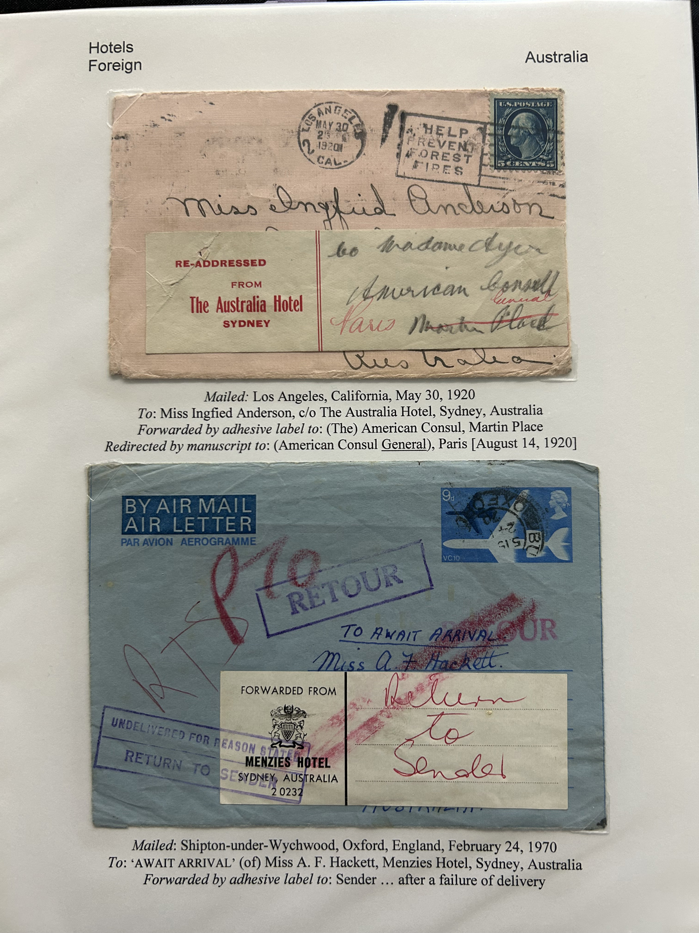 1353 CVR   imageSpecialized Collection / Exhibit of 63 Different Worldwide Hotel Forwarding Labels on Cover, 1890s to 1950s, majority are well written-up on pages, sorted alphabetically by country or continent. Includes a great variety of countries, with good frankings, postmarks (noted a Lake Hill BC), routings, some have been forwarded or re-directed more than once, etc. A fascinating collection of these scarcer labels, which all have the hotel name printed, with a space to put a forwarding address for a guest who has left. Very fine, see our online pictures for a sampling. A great opportunity to start a new collection, or to add to an existing one. (Scan 1) (Scan 2) (Scan 3) (Scan 4) (Scan 5) (Scan 6) (Scan 7) (Scan 8) (Scan 9) (Scan 10) (Scan 11) (Scan 12) (Scan 13) (Scan 14) (All Scans)