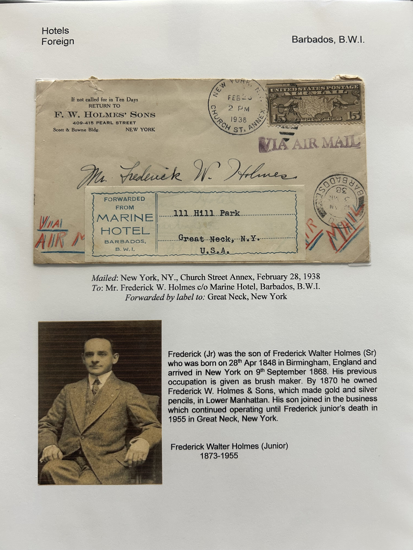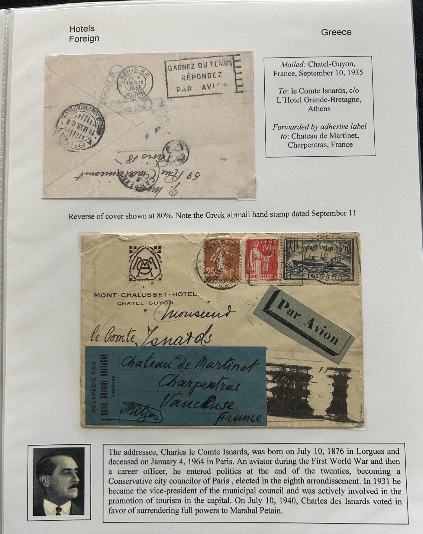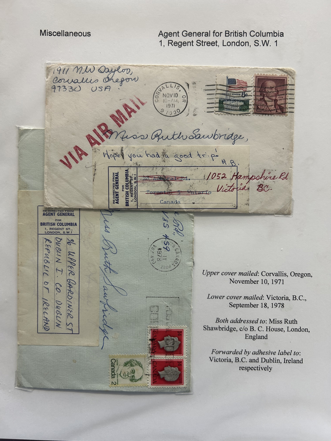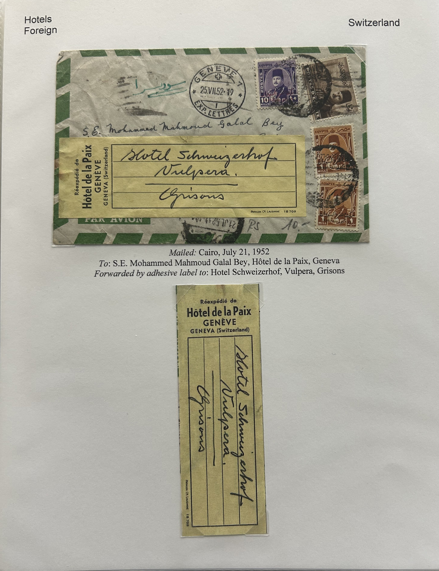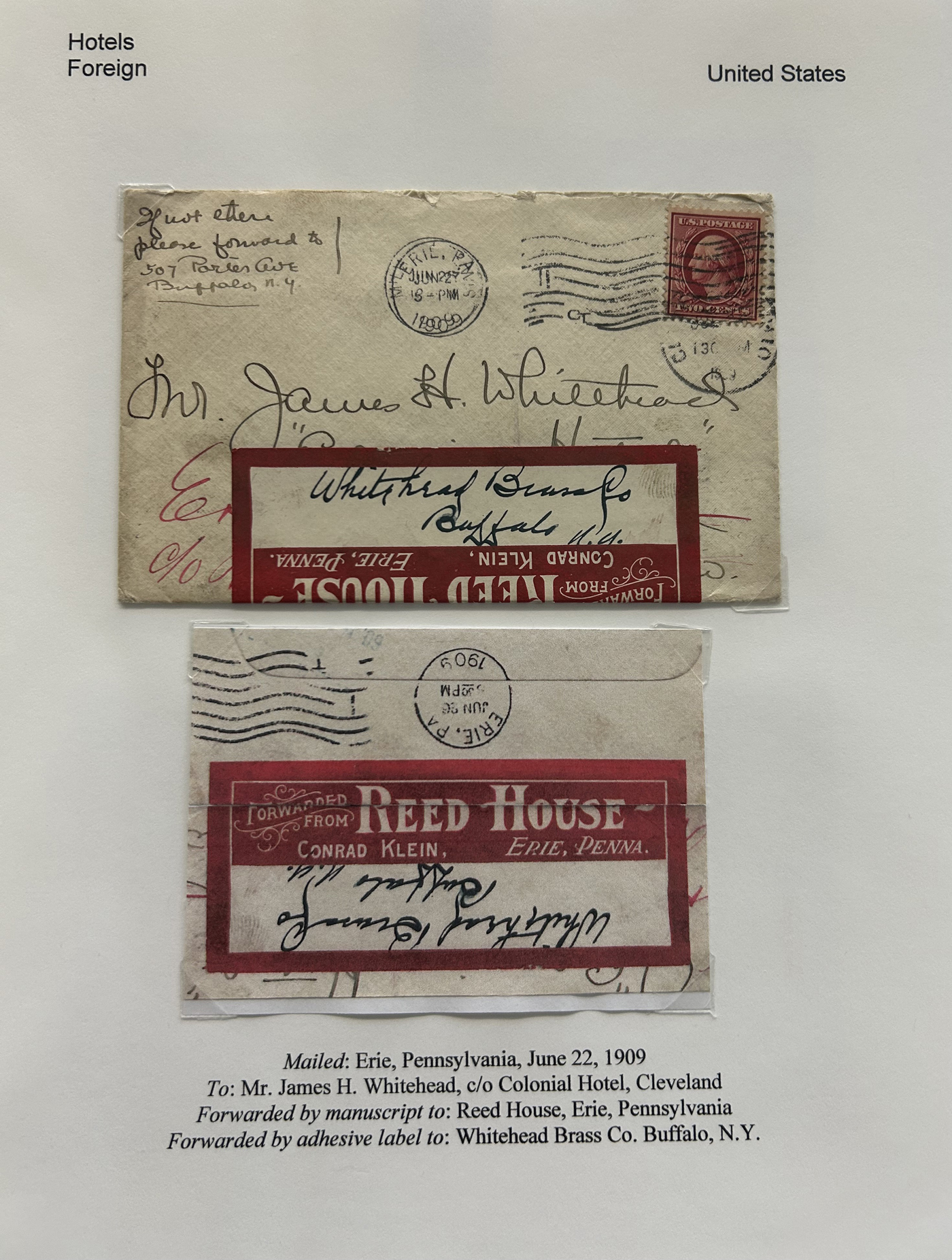 1353 CVR   imageSpecialized Collection / Exhibit of 63 Different Worldwide Hotel Forwarding Labels on Cover, 1890s to 1950s, majority are well written-up on pages, sorted alphabetically by country or continent. Includes a great variety of countries, with good frankings, postmarks (noted a Lake Hill BC), routings, some have been forwarded or re-directed more than once, etc. A fascinating collection of these scarcer labels, which all have the hotel name printed, with a space to put a forwarding address for a guest who has left. Very fine, see our online pictures for a sampling. A great opportunity to start a new collection, or to add to an existing one. (Scan 1) (Scan 2) (Scan 3) (Scan 4) (Scan 5) (Scan 6) (Scan 7) (Scan 8) (Scan 9) (Scan 10) (Scan 11) (Scan 12) (Scan 13) (Scan 14) (All Scans)