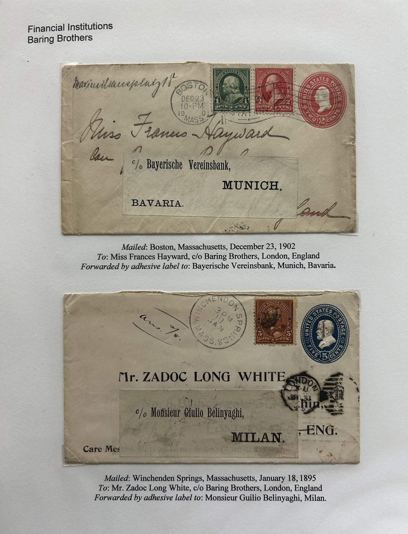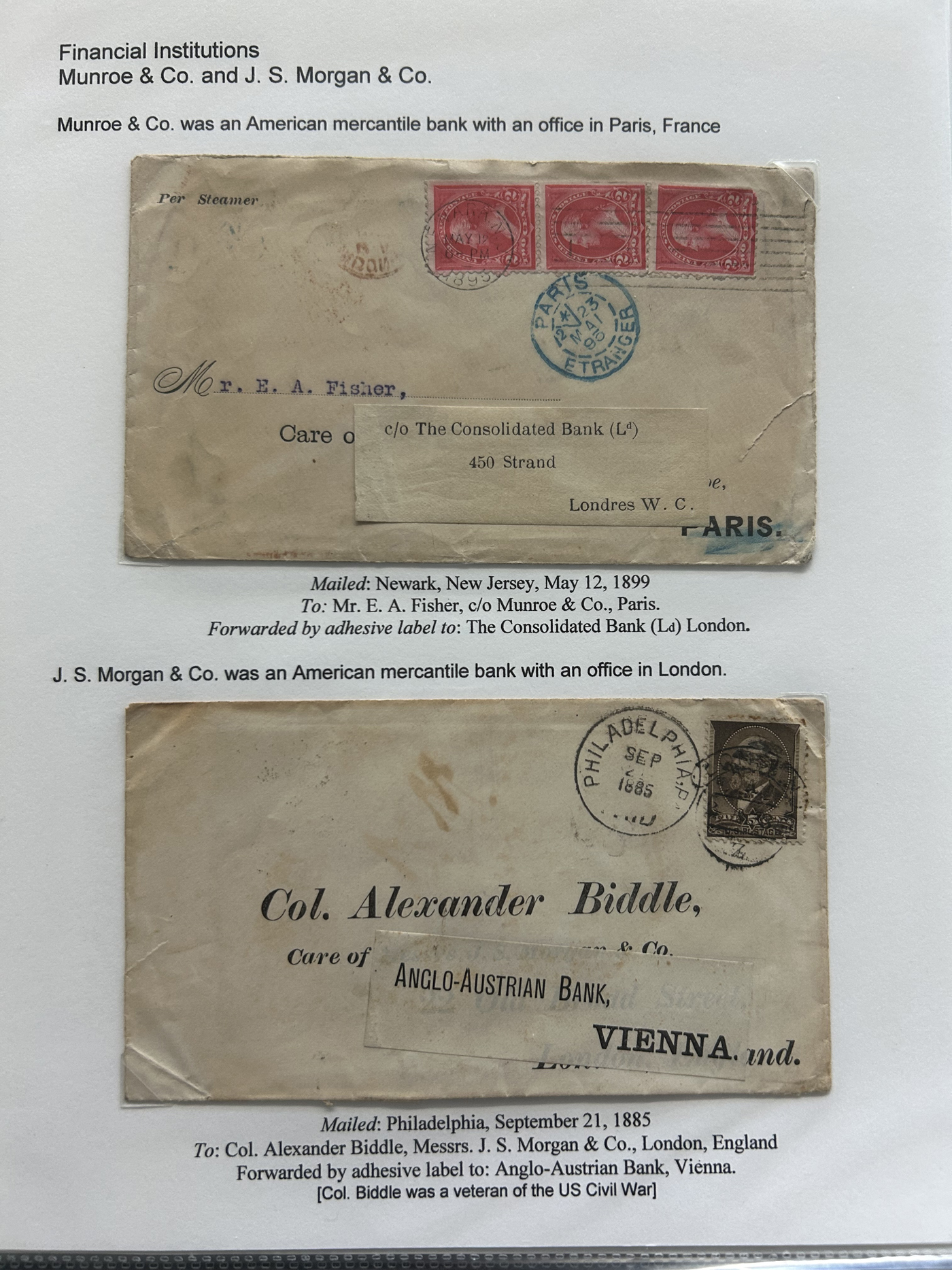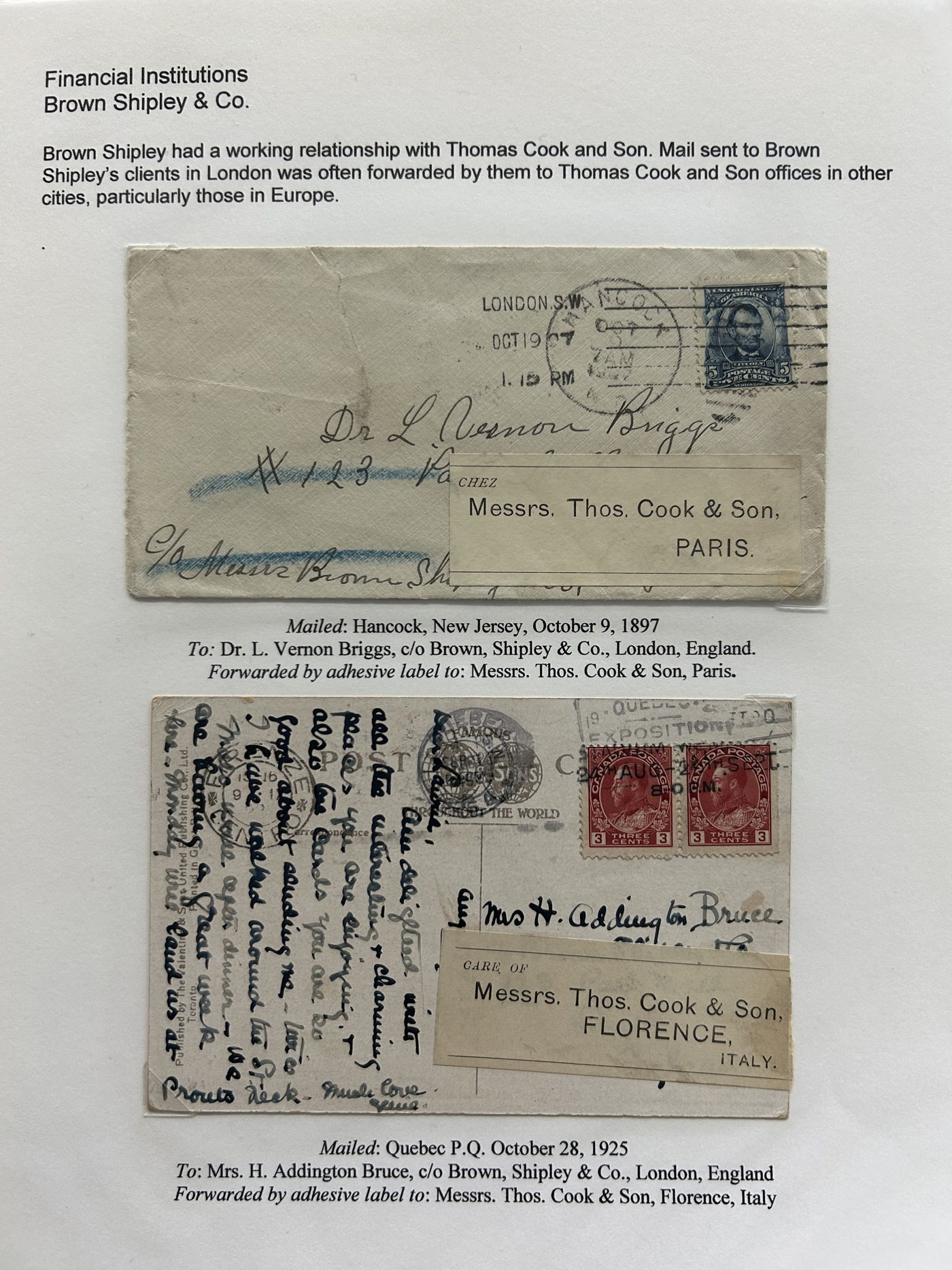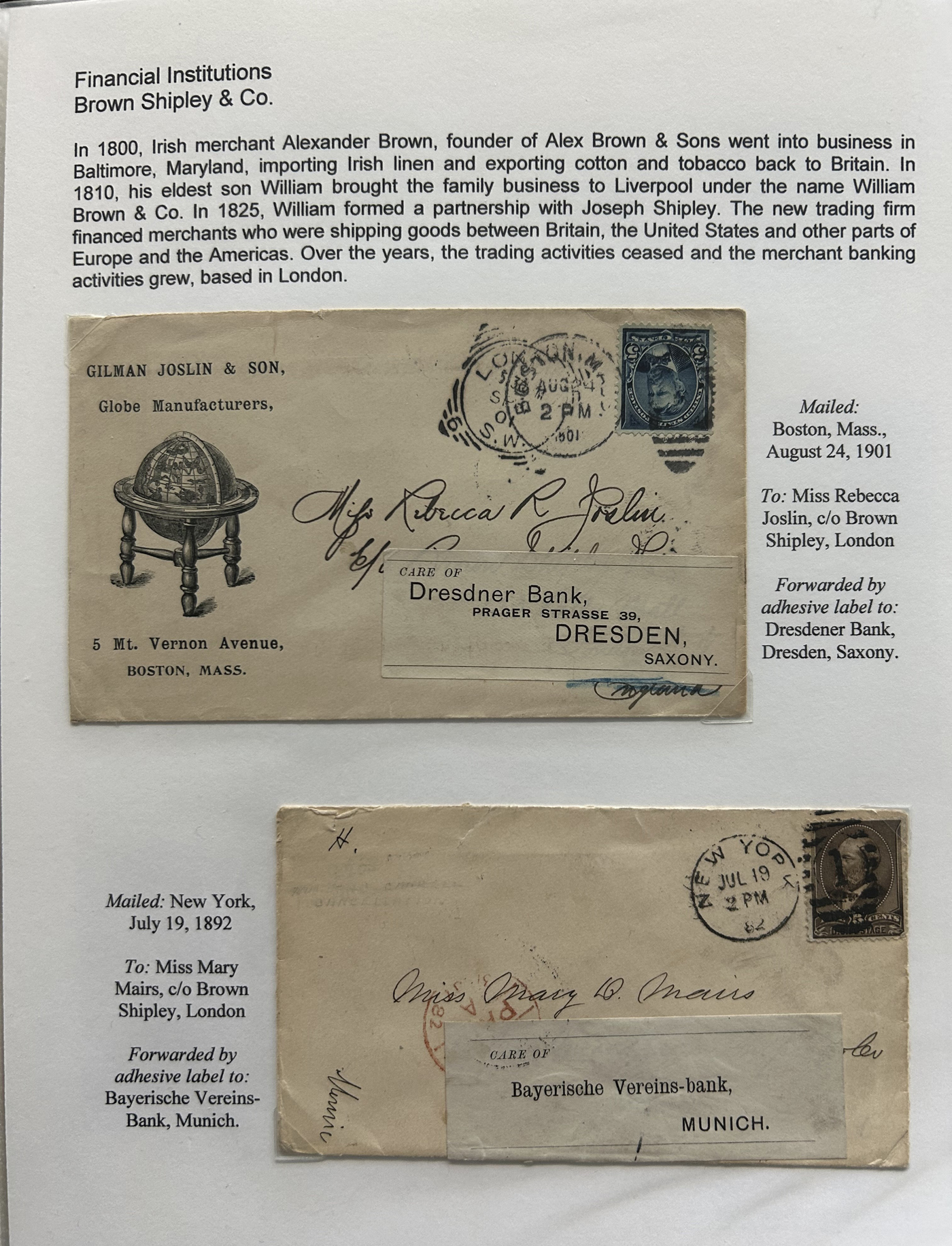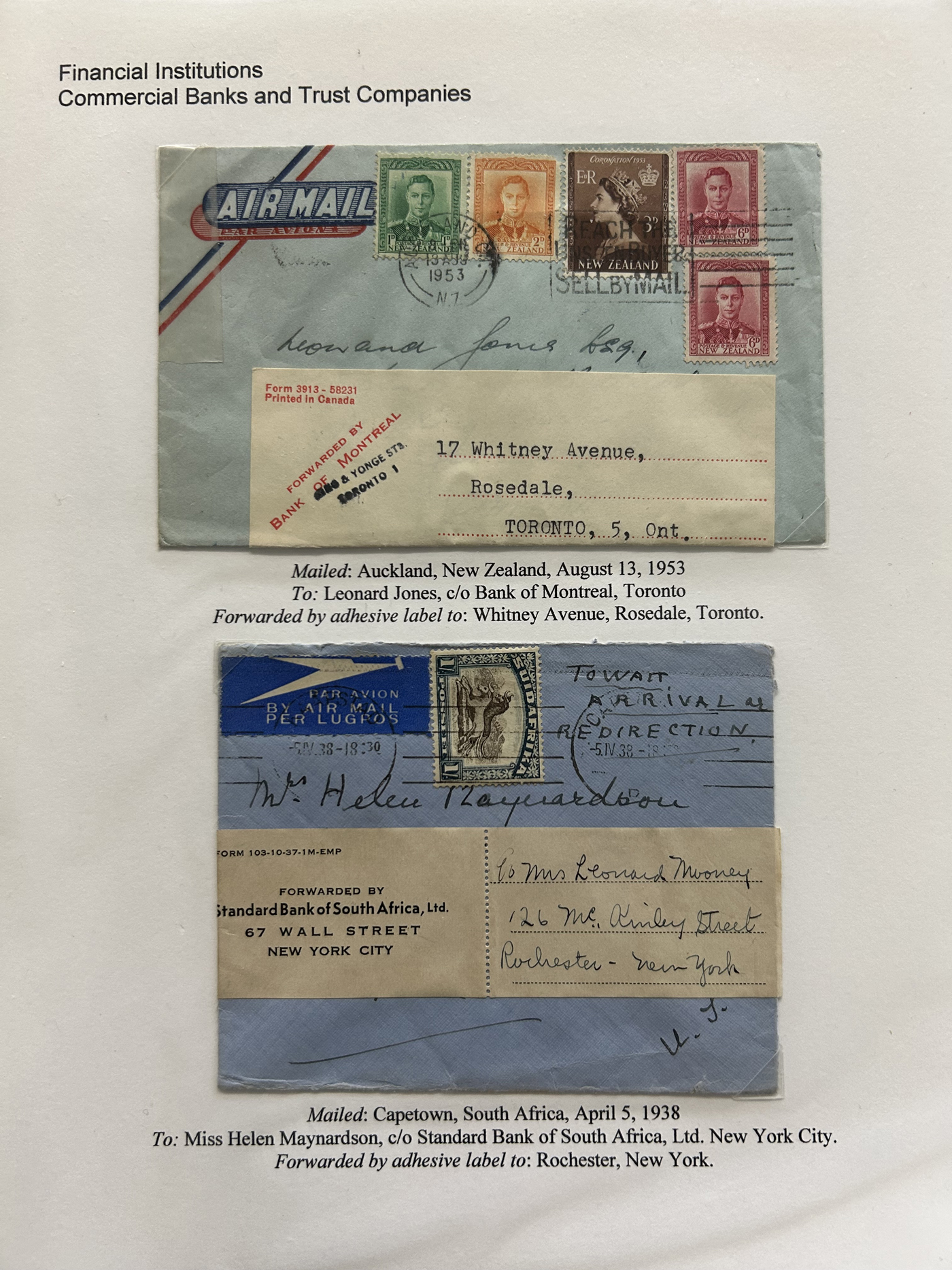 1354 CVR   imageSpecialized Collection / Exhibit of 70 Different Worldwide Financial Institution Forwarding Address Labels on Cover, 1880s to 1970s, majority are well written-up on pages, sorted alphabetically by name of the financial institution. Includes a good variety of countries (many were mailed from the US), with good frankings, postmarks, routings, some have forwarding country postage due stamps, etc. A fascinating collection of these scarcer labels, which mostly all have the financial institution name printed, with a forwarding address. Very fine, see our online pictures for a sampling. A great opportunity to start a new collection, or to add to an existing one. (Scan 1) (Scan 2) (Scan 3) (Scan 4) (Scan 5) (Scan 6) (Scan 7) (Scan 8) (Scan 9) (Scan 10) (Scan 11) (Scan 12) (Scan 13) (Scan 14) (Scan 15) (Scan 16) (All Scans)