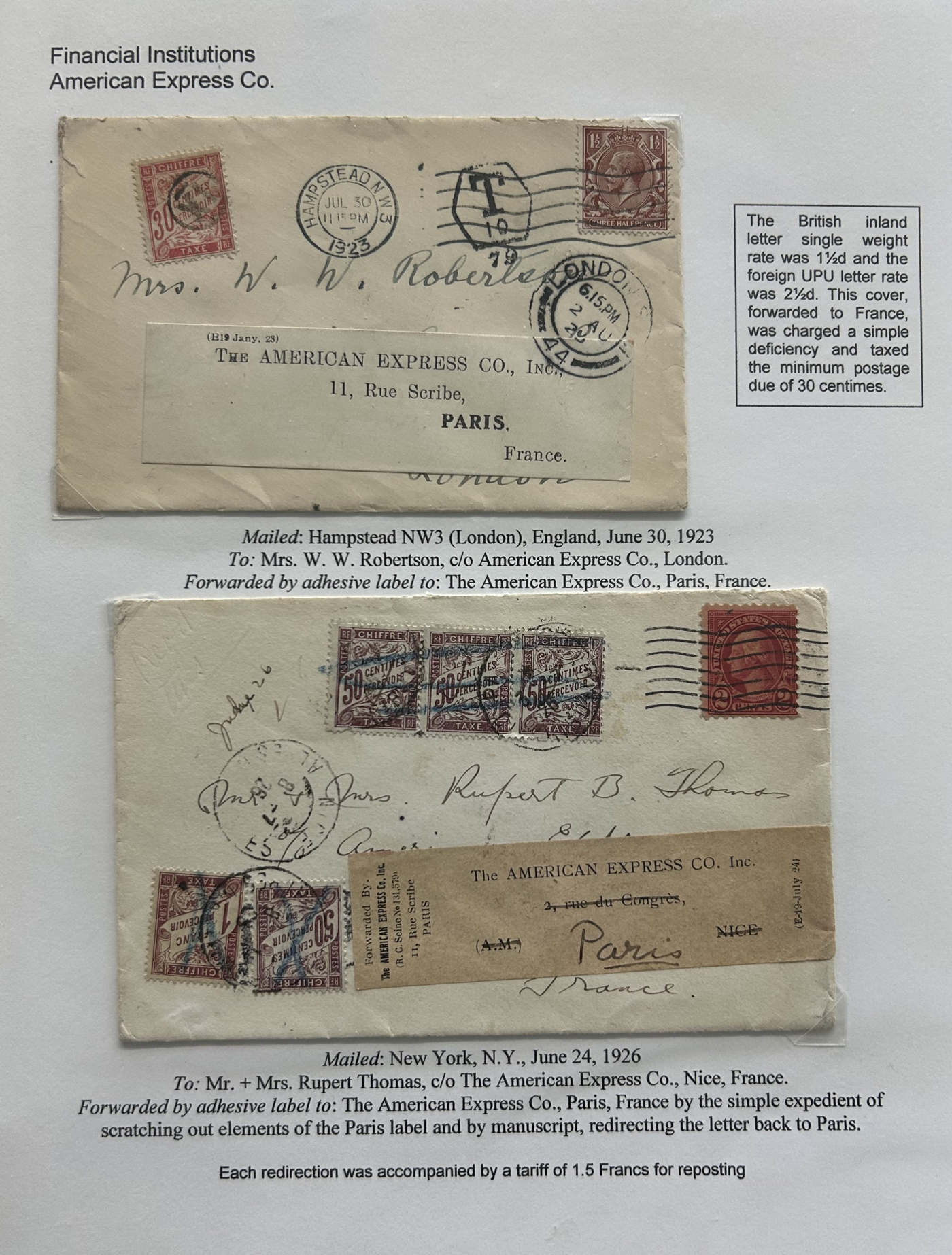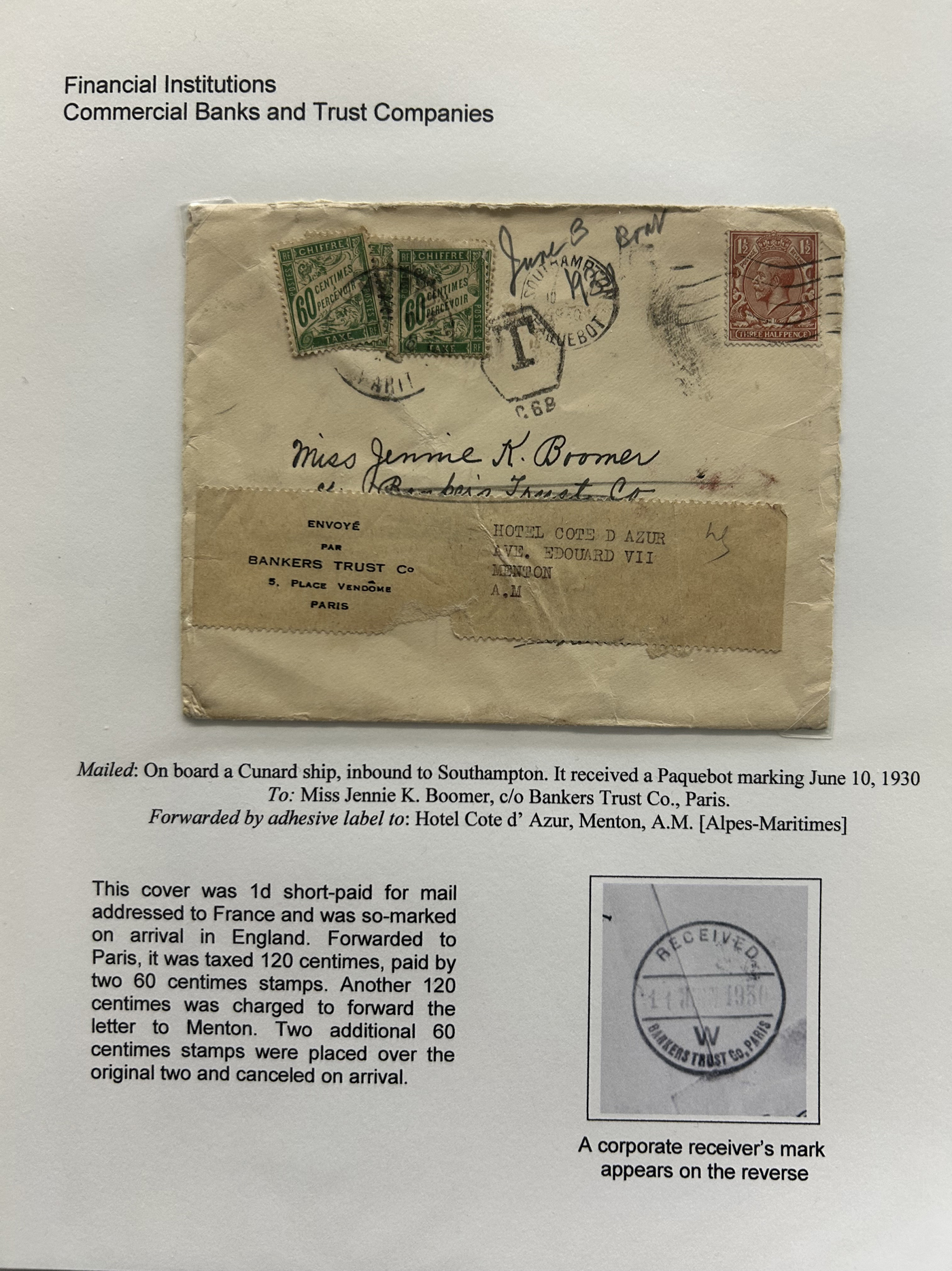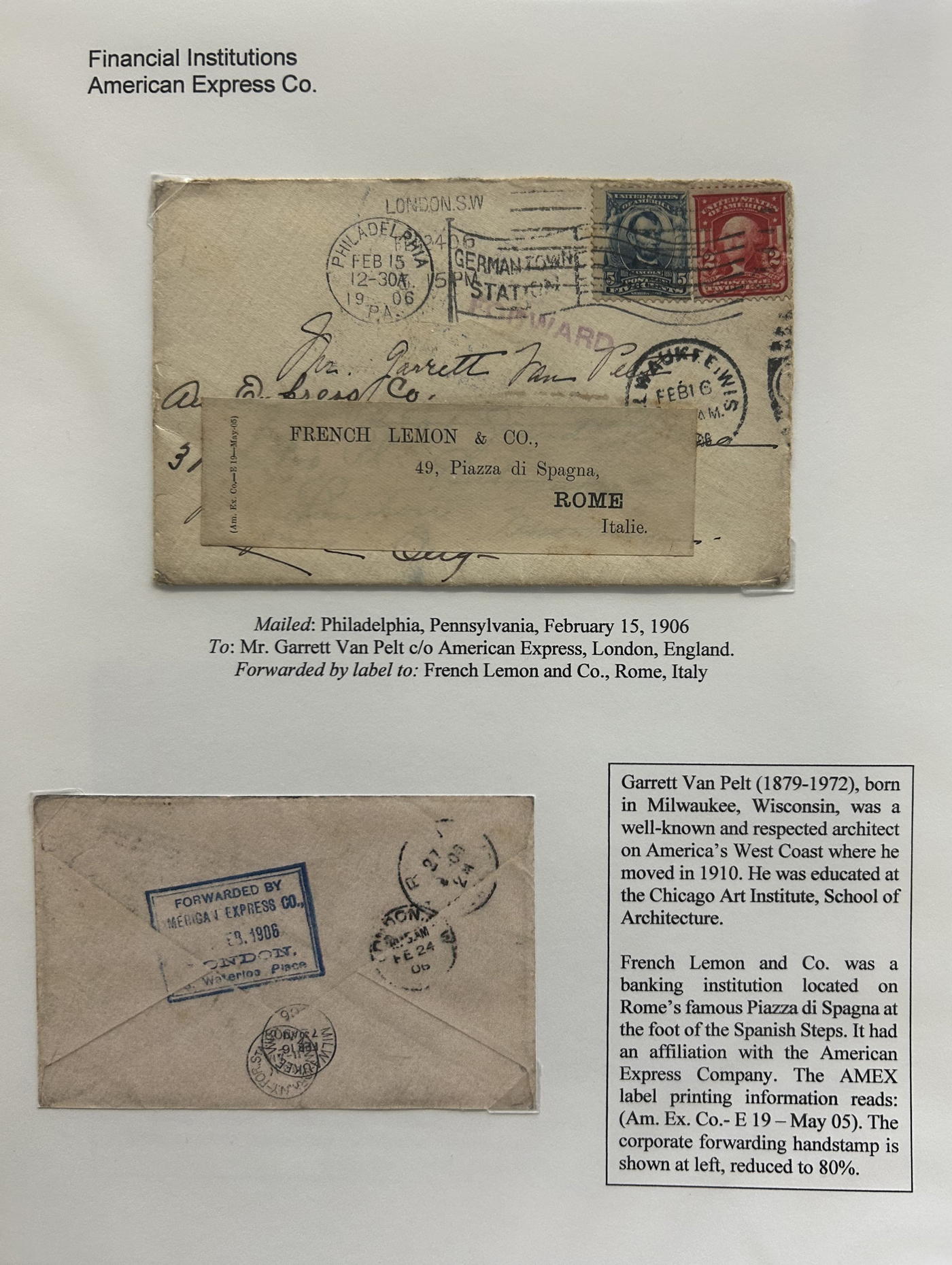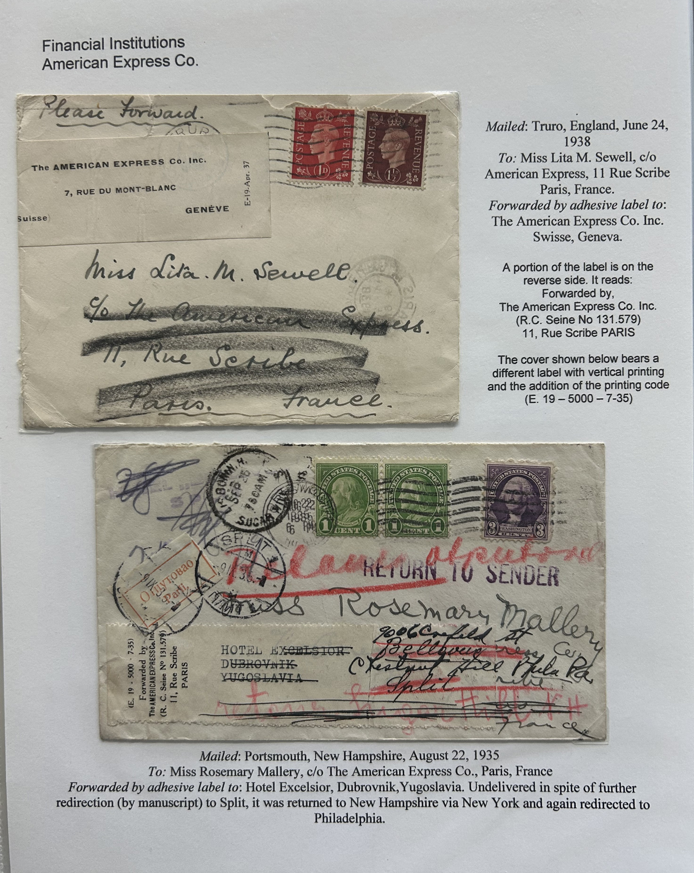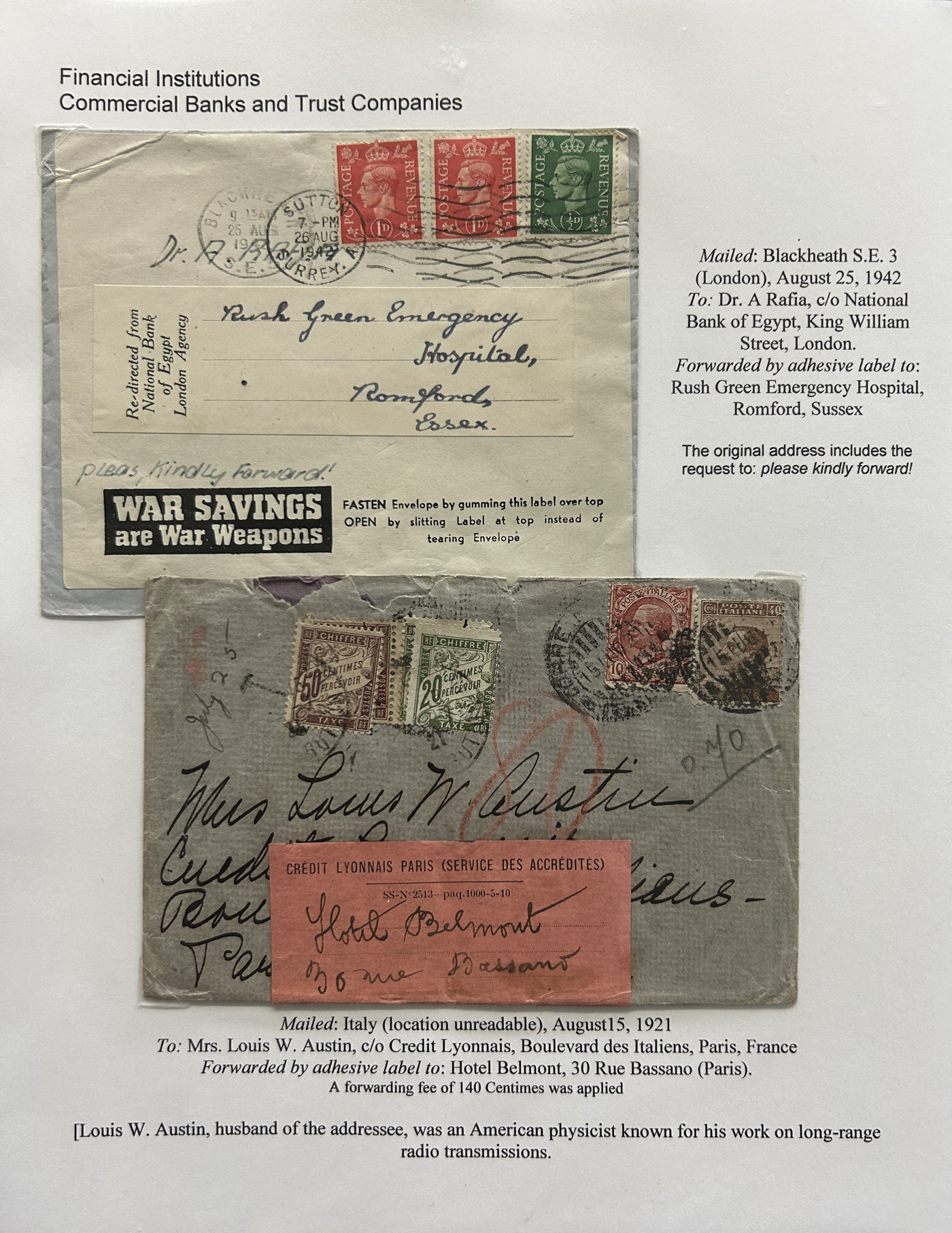 1354 CVR   imageSpecialized Collection / Exhibit of 70 Different Worldwide Financial Institution Forwarding Address Labels on Cover, 1880s to 1970s, majority are well written-up on pages, sorted alphabetically by name of the financial institution. Includes a good variety of countries (many were mailed from the US), with good frankings, postmarks, routings, some have forwarding country postage due stamps, etc. A fascinating collection of these scarcer labels, which mostly all have the financial institution name printed, with a forwarding address. Very fine, see our online pictures for a sampling. A great opportunity to start a new collection, or to add to an existing one. (Scan 1) (Scan 2) (Scan 3) (Scan 4) (Scan 5) (Scan 6) (Scan 7) (Scan 8) (Scan 9) (Scan 10) (Scan 11) (Scan 12) (Scan 13) (Scan 14) (Scan 15) (Scan 16) (All Scans)