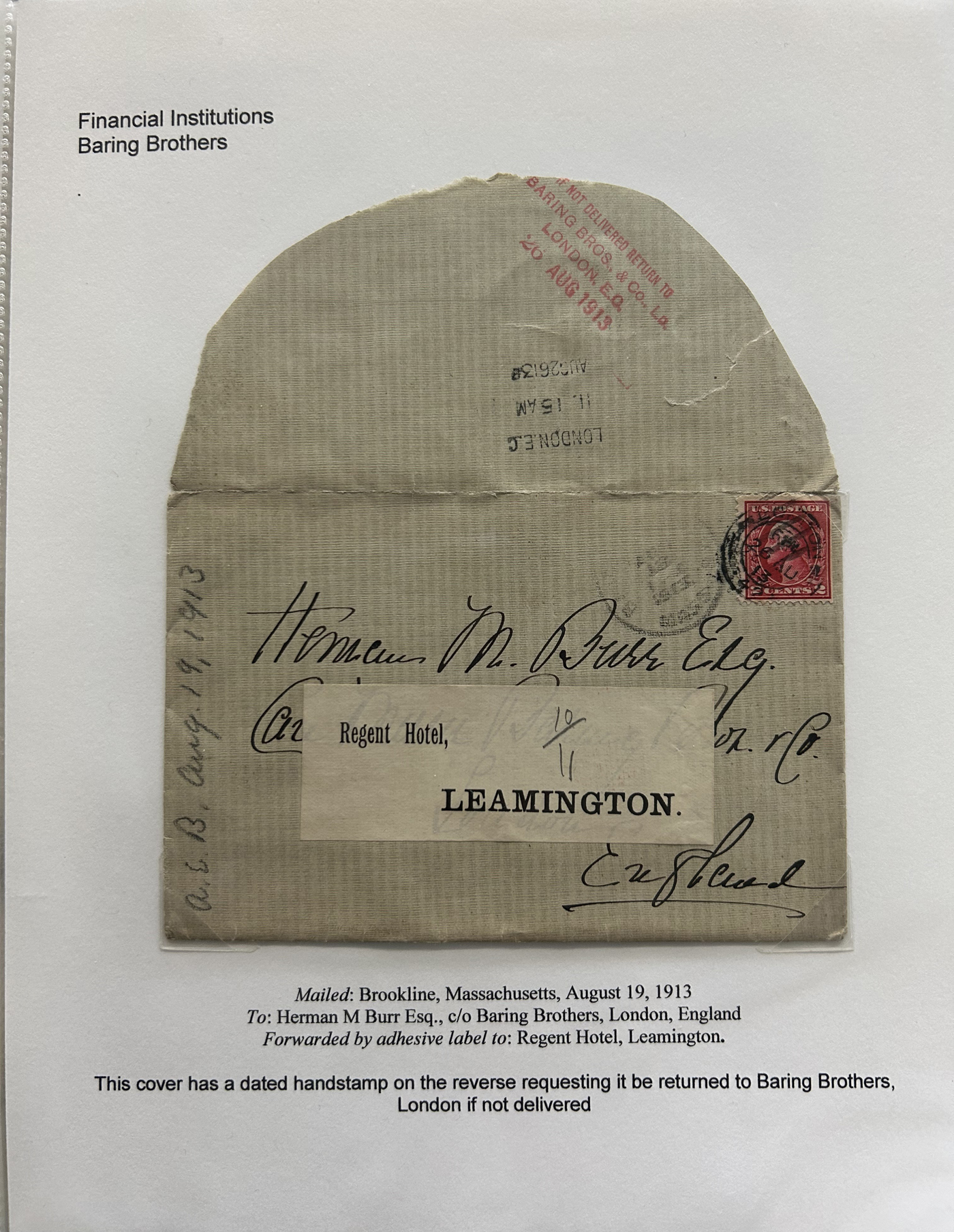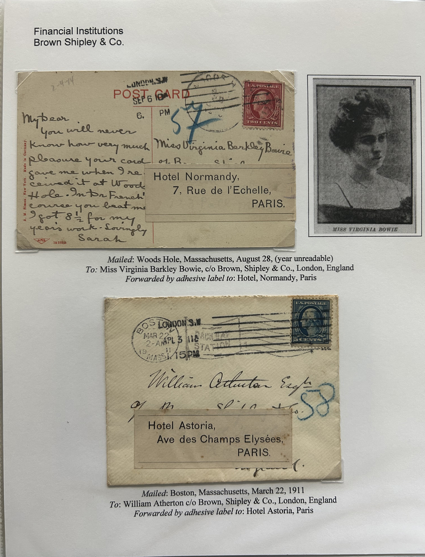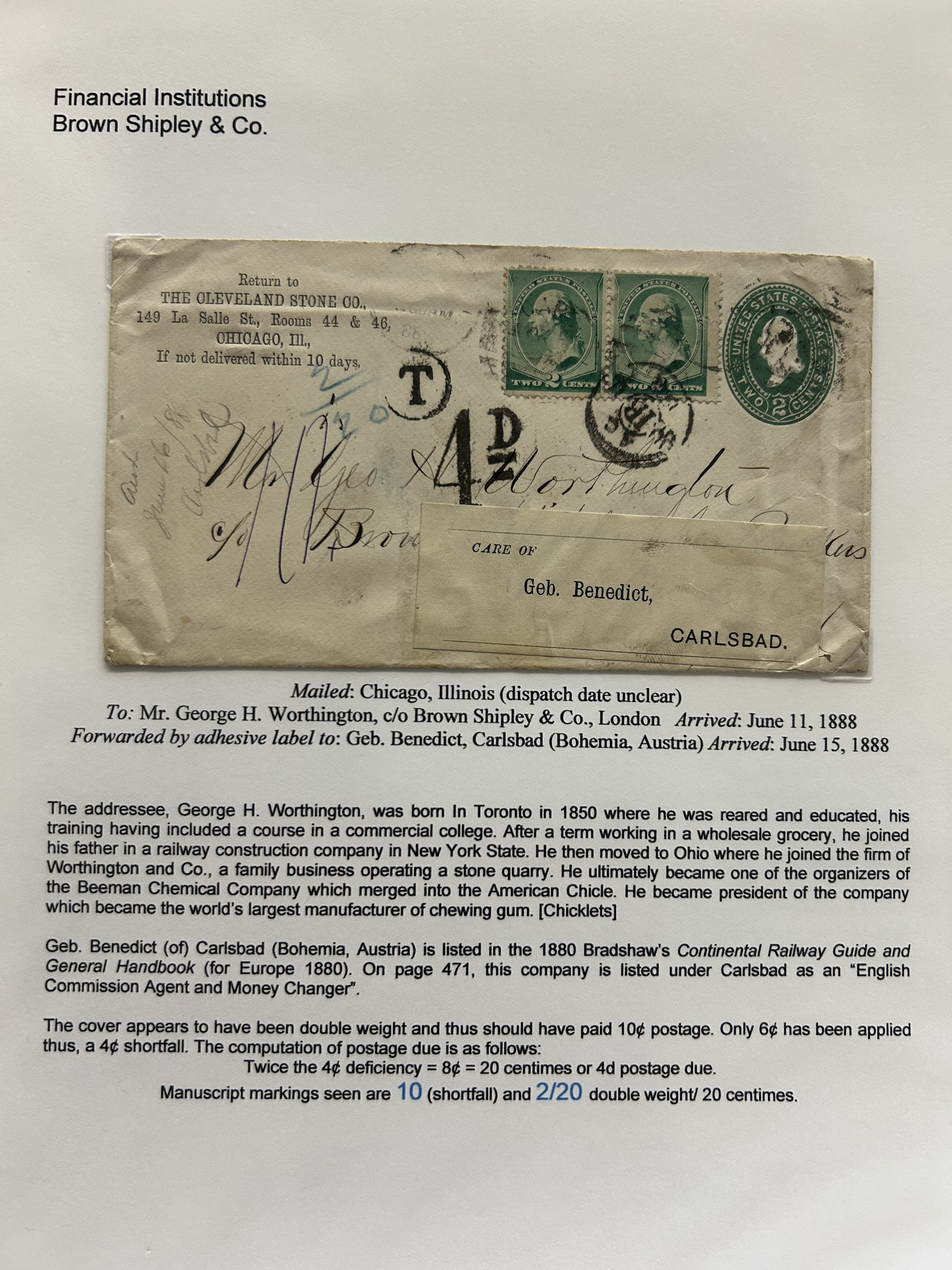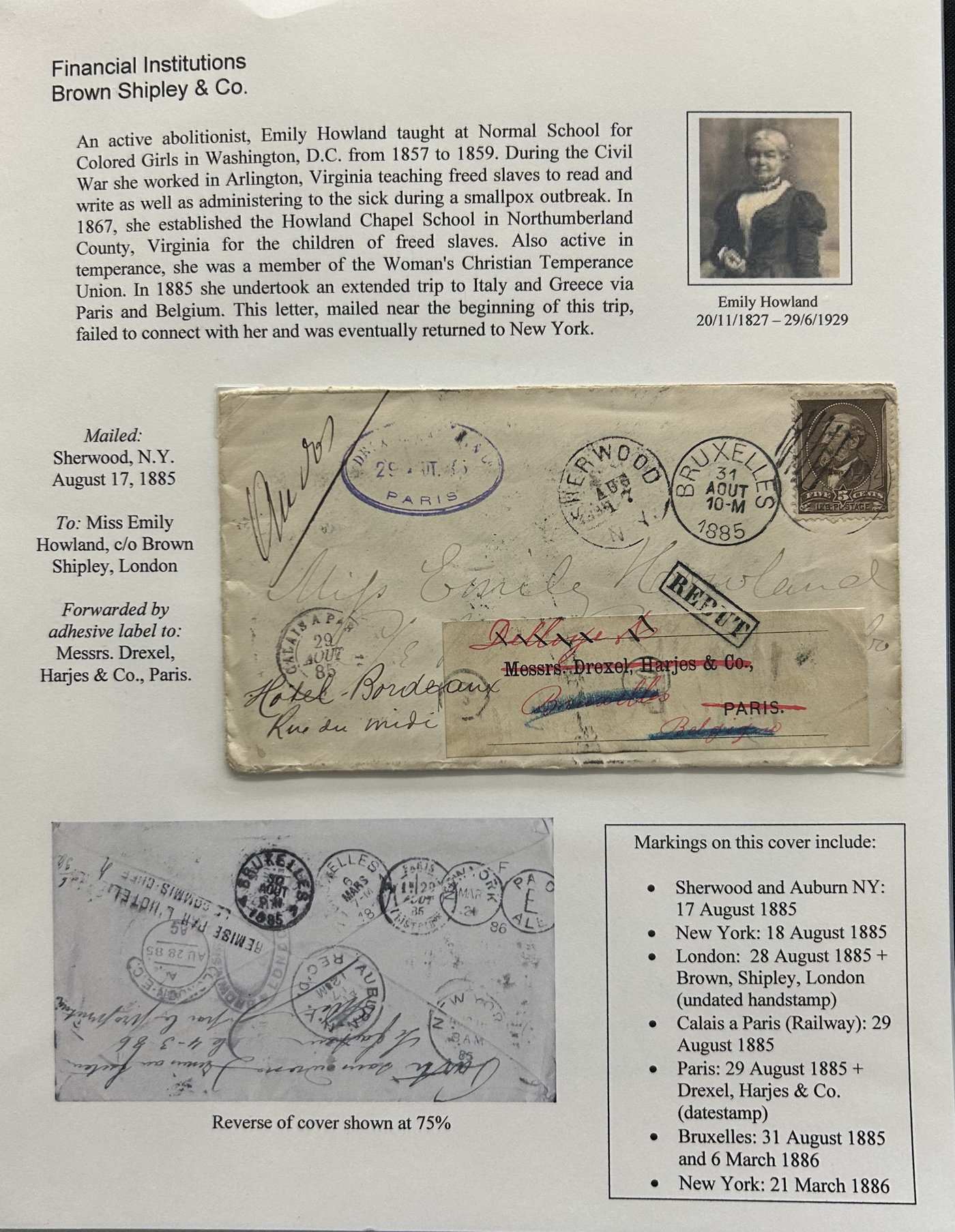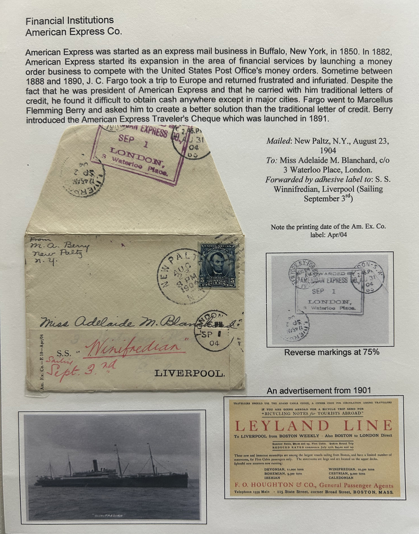 1354 CVR   imageSpecialized Collection / Exhibit of 70 Different Worldwide Financial Institution Forwarding Address Labels on Cover, 1880s to 1970s, majority are well written-up on pages, sorted alphabetically by name of the financial institution. Includes a good variety of countries (many were mailed from the US), with good frankings, postmarks, routings, some have forwarding country postage due stamps, etc. A fascinating collection of these scarcer labels, which mostly all have the financial institution name printed, with a forwarding address. Very fine, see our online pictures for a sampling. A great opportunity to start a new collection, or to add to an existing one. (Scan 1) (Scan 2) (Scan 3) (Scan 4) (Scan 5) (Scan 6) (Scan 7) (Scan 8) (Scan 9) (Scan 10) (Scan 11) (Scan 12) (Scan 13) (Scan 14) (Scan 15) (Scan 16) (All Scans)