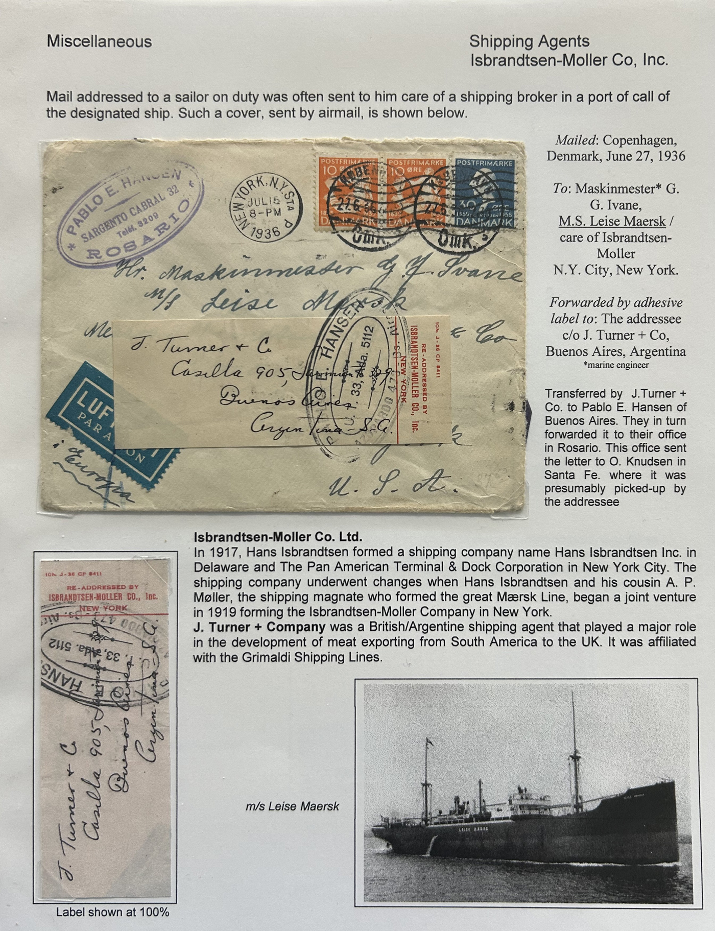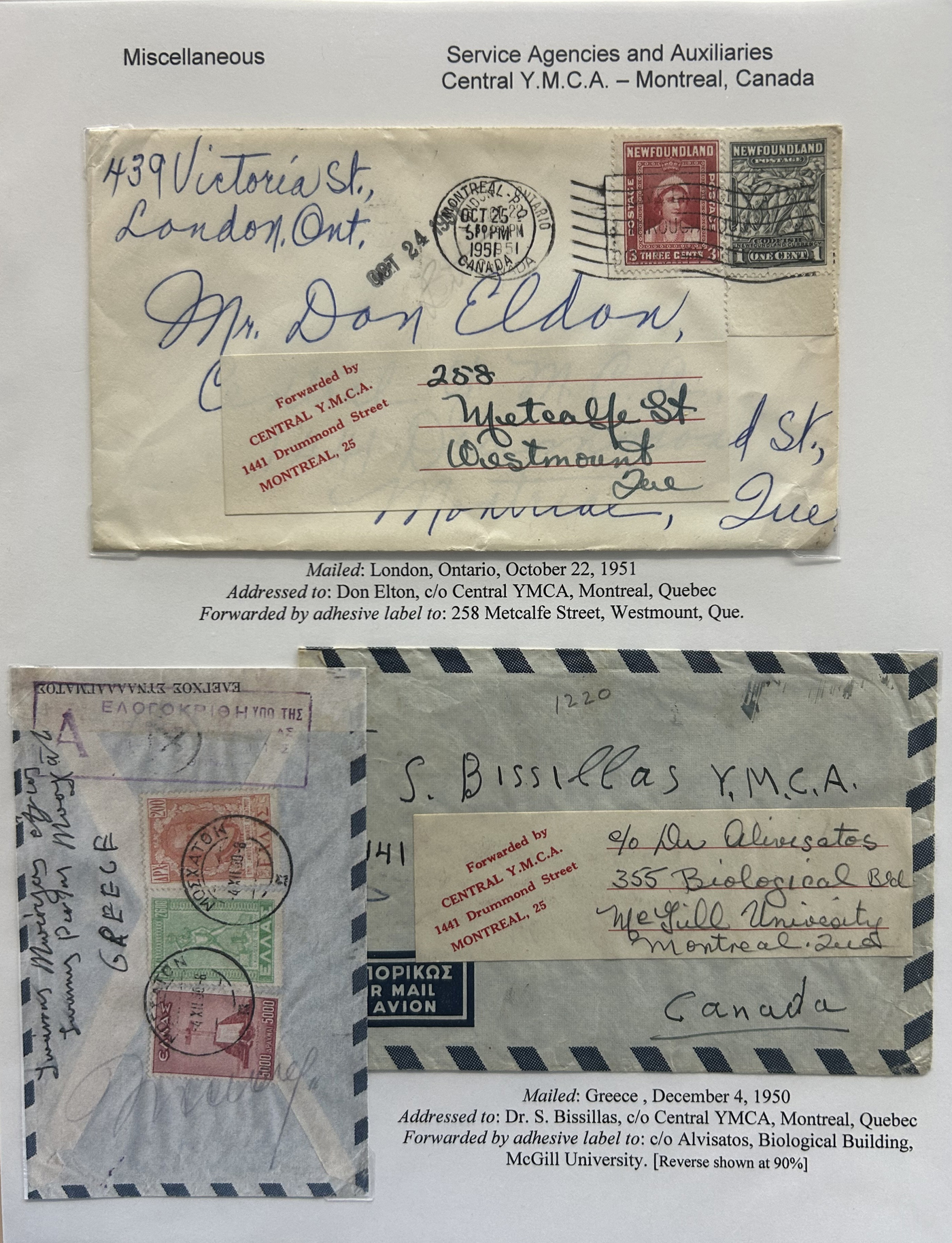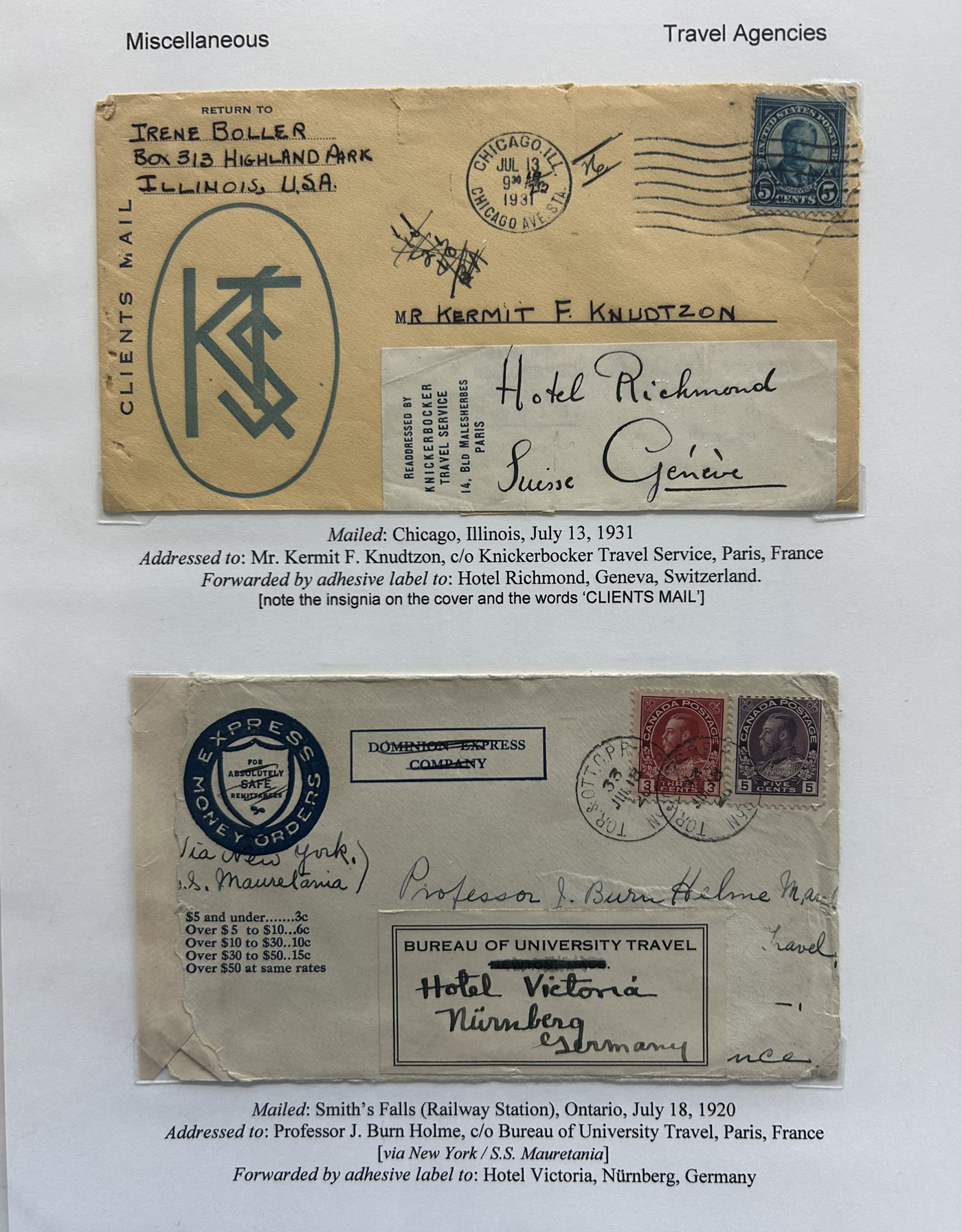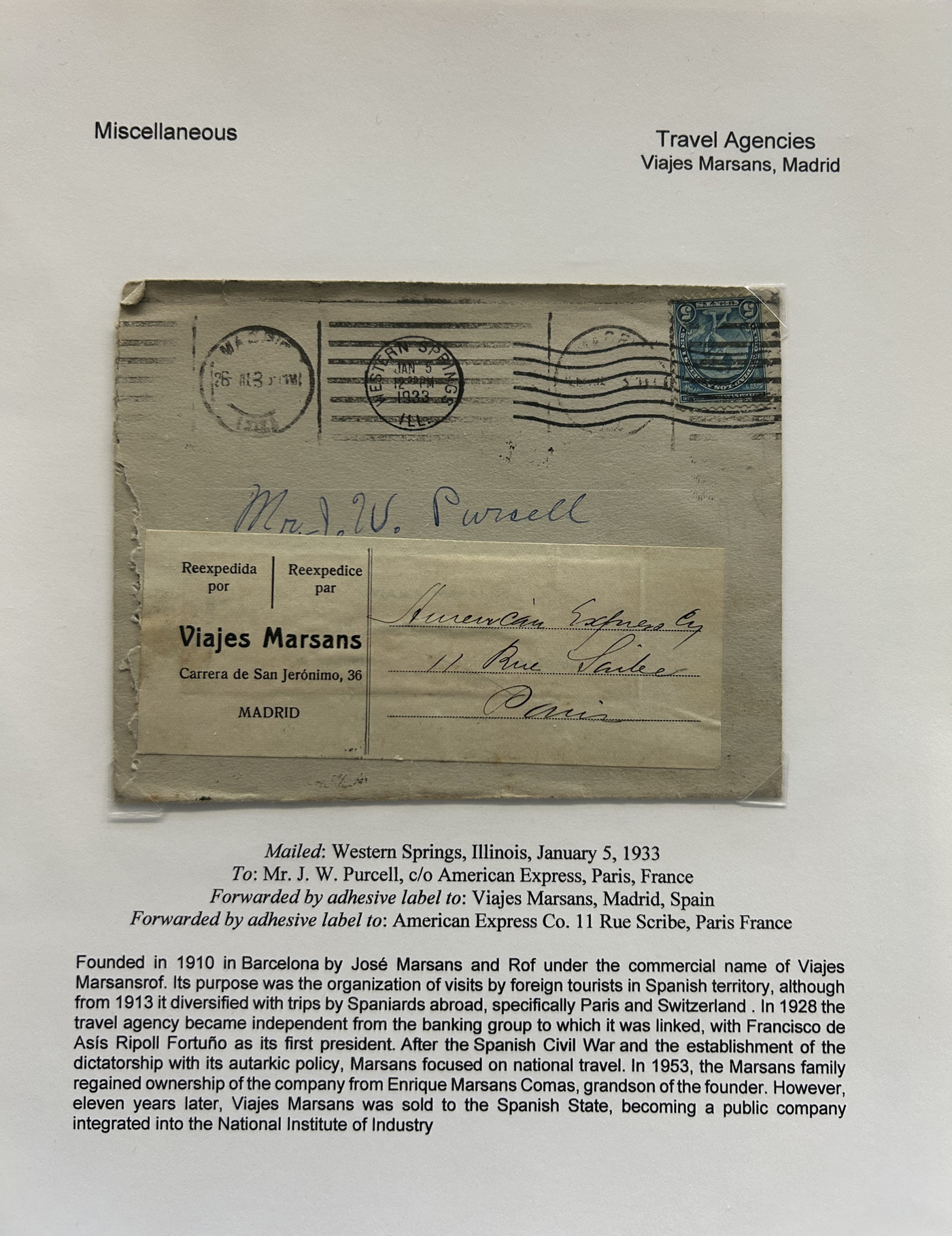 1355 CVR   imageSpecialized Collection / Exhibit of 30 Worldwide Covers with Different Various Forwarding Address Labels, 1920s to 1970s, majority are well written-up on pages, sorted by type of label, with categories such as Military, Service Agencies, Travel Agencies, Shipping Agencies and a few Government / Official. Includes a good variety of countries (many were mailed from the US), with good frankings, postmarks, routings, etc. A fascinating collection of these scarcer forwarding address labels. Very fine, see our online pictures for a sampling. A great opportunity to start a new collection, or to add to an existing one. (Scan 1) (Scan 2) (Scan 3) (Scan 4) (Scan 5) (Scan 6) (Scan 7) (Scan 8) (Scan 9) (All Scans)