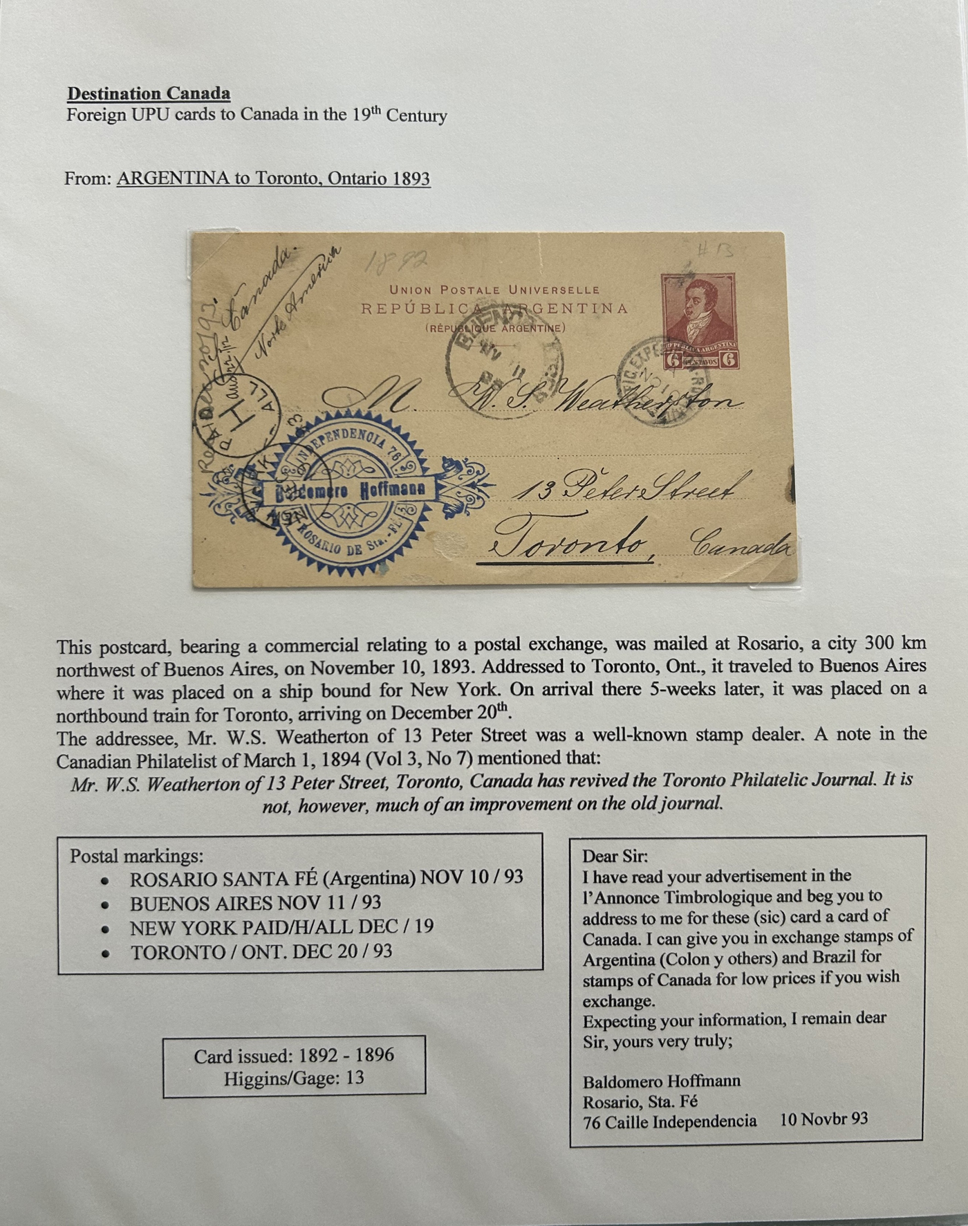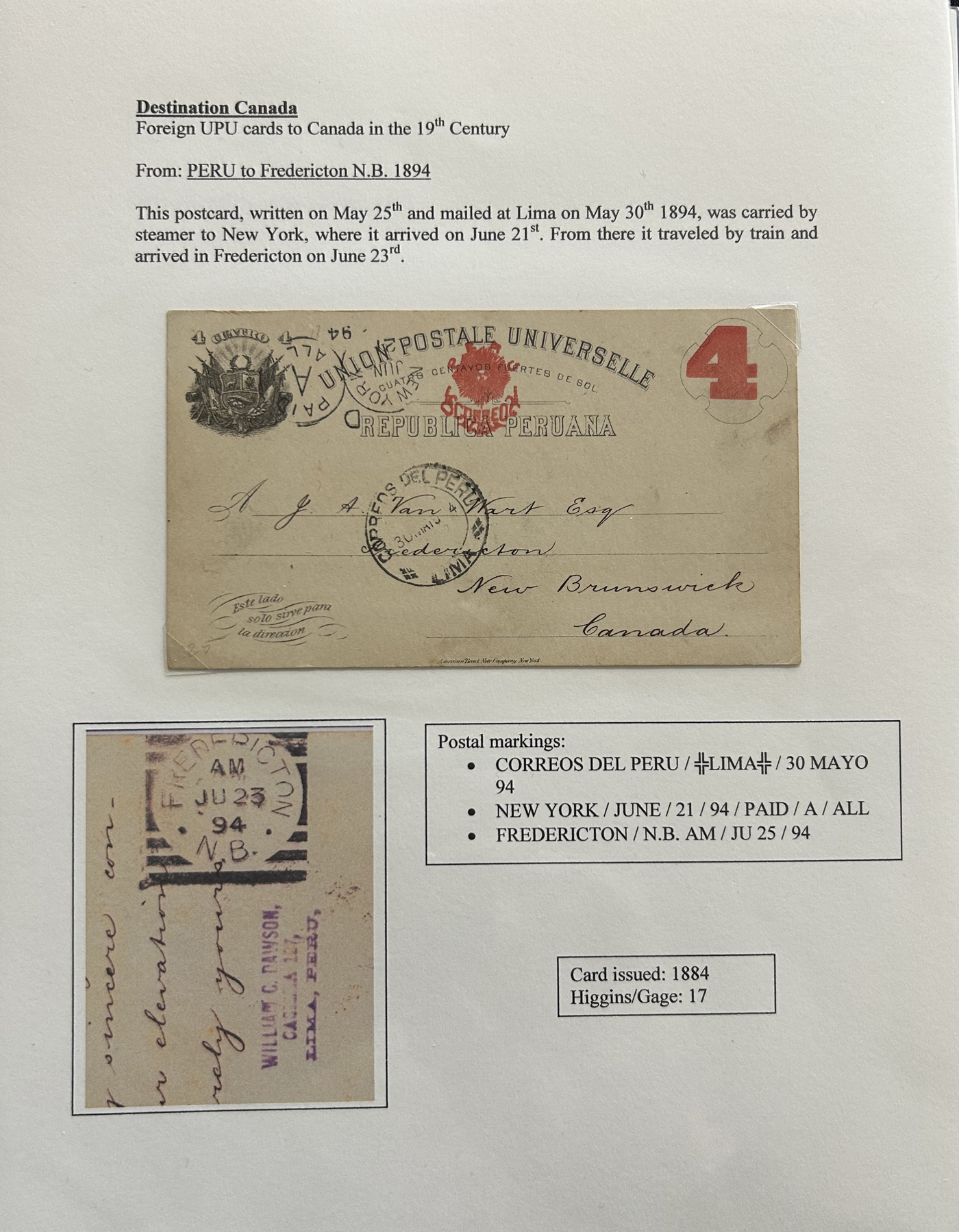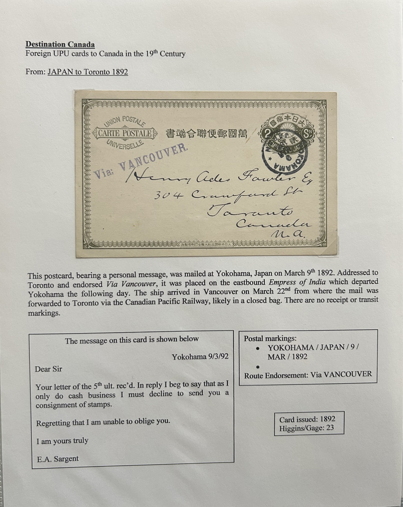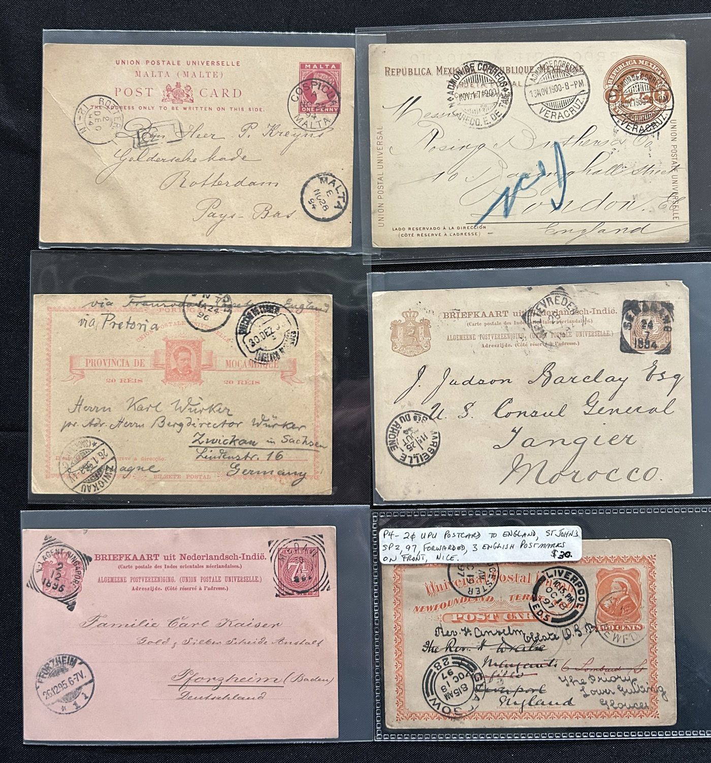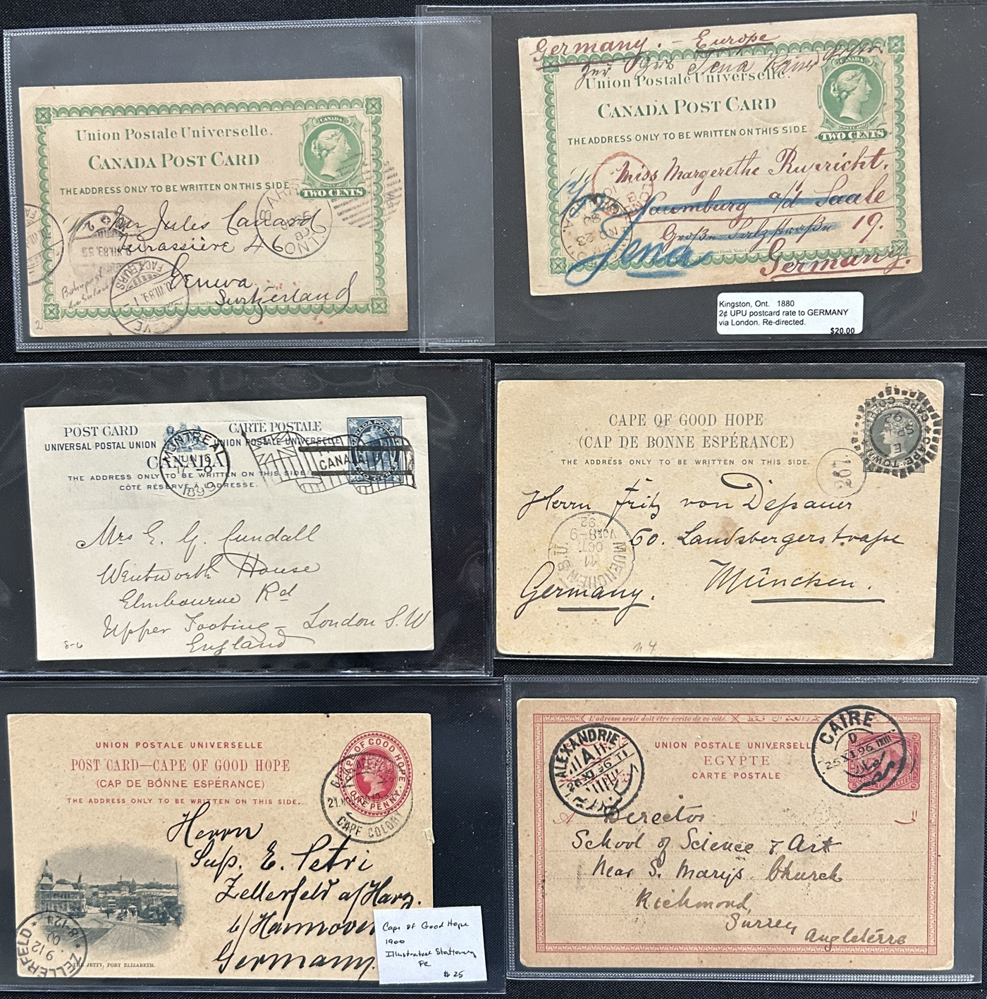 1356 PC   imageExhibit of U.P.U. Stationery Postal Cards Mailed to Canada, 1878 to 1900, with 84 cards in all, in a 3-frame display arranged alphabetically by country, from Argentina to Wurttemberg, including better such as Bahamas, Barbados, British Guiana, British Honduras, Bulgaria, Burma, Cape of Good Hope, Ceylon (2 different, both uprated), China / Canton Treaty Port / Hong Kong, Cyprus, Danish West Indies, Egypt, Germany to Newfoundland, Greece, Grenada, Guadeloupe, Hawaii, India, Italy, Jamaica, Japan, Lagos, Leeward Islands, Malta, Machonaland (2 different), Mexico, New South Wales, Niger Coast Protectorate, Russia, San Marino, Sierra Leone, Turks Islands, and many more. We note some that are postage due, some useful receivers or transit markings, a few have their reply portions still attached, etc. Overall very fine and won a gold award at exhibit. See our photos for a sampling. (Scan 1) (Scan 2) (Scan 3) (Scan 4) (Scan 5) (Scan 6) (Scan 7) (Scan 8) (Scan 9) (Scan 10) (Scan 11) (Scan 12) (Scan 13) (Scan 14) (Scan 15) (Scan 16) (Scan 17) (Scan 18) (Scan 19) (Scan 20) (All Scans)