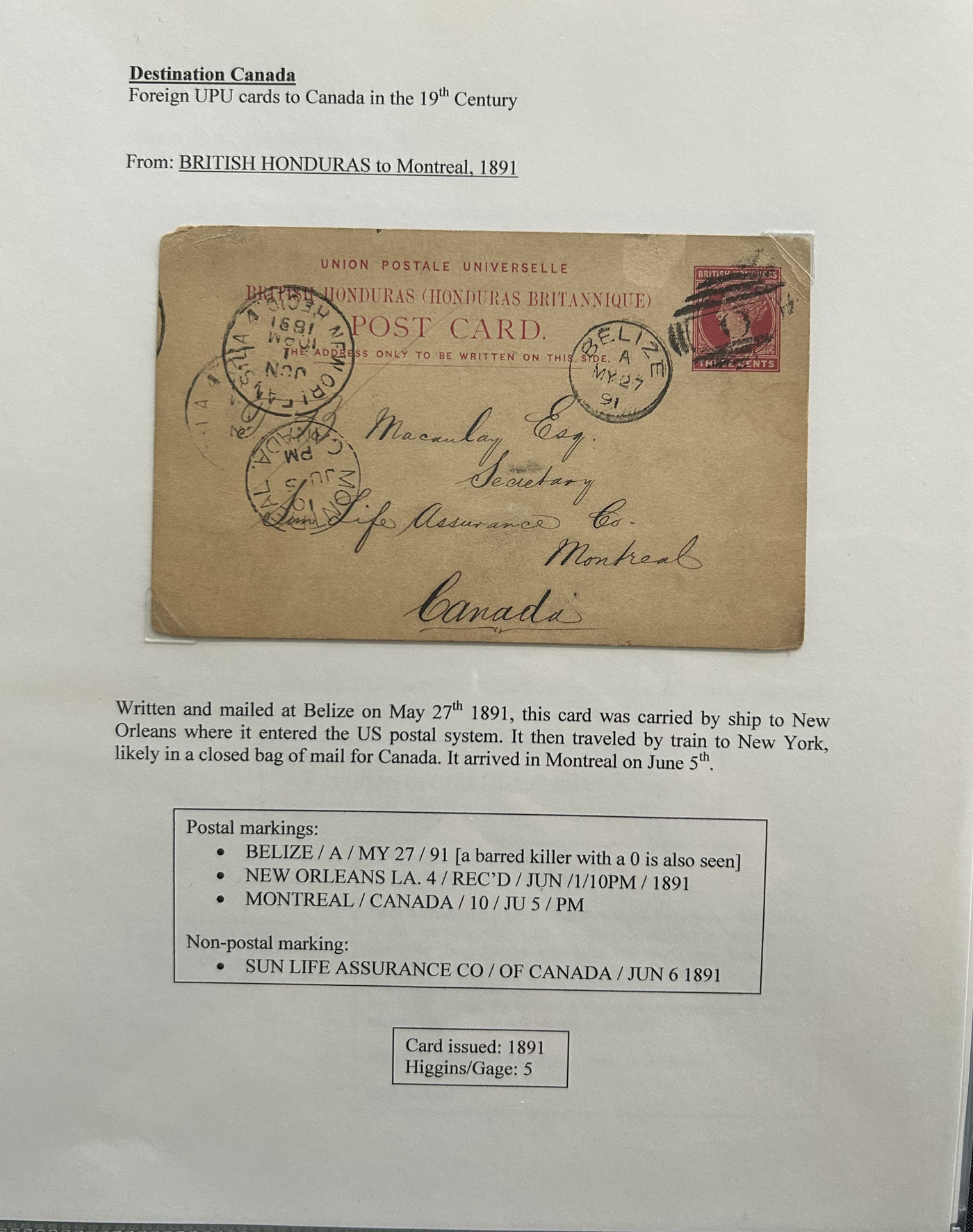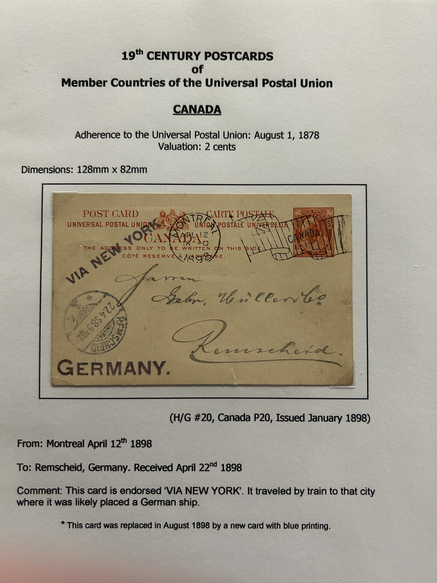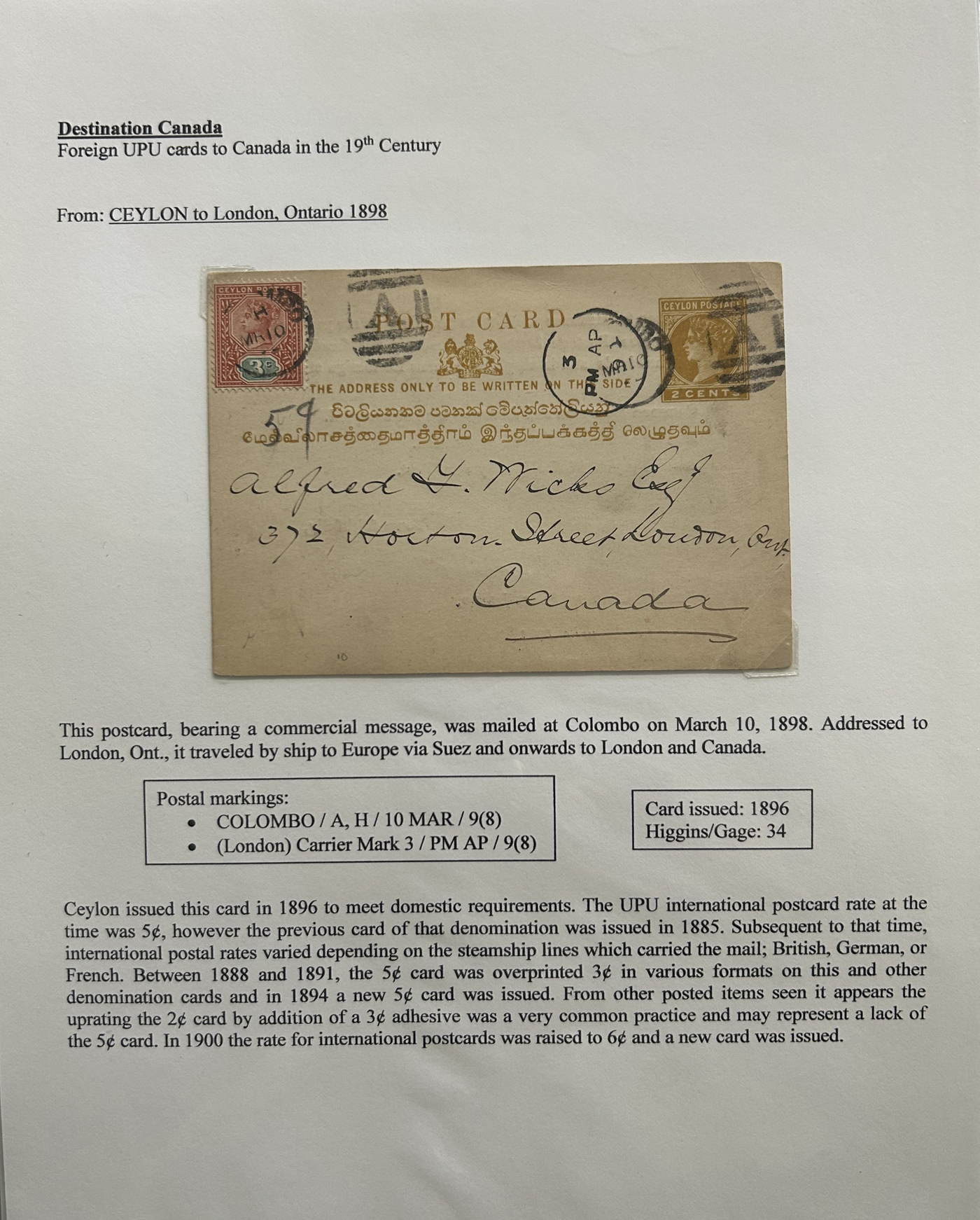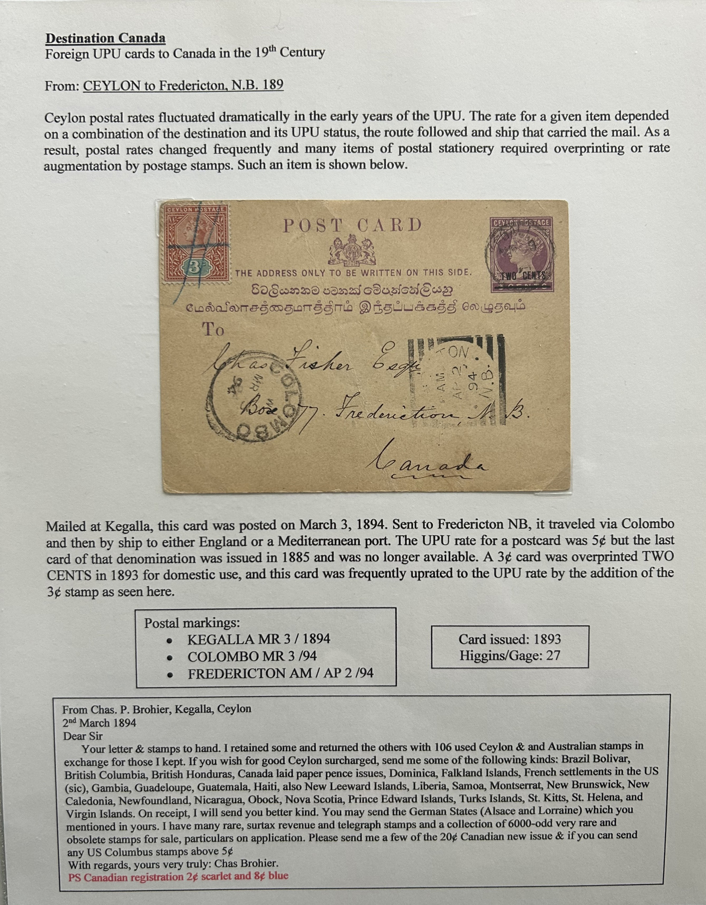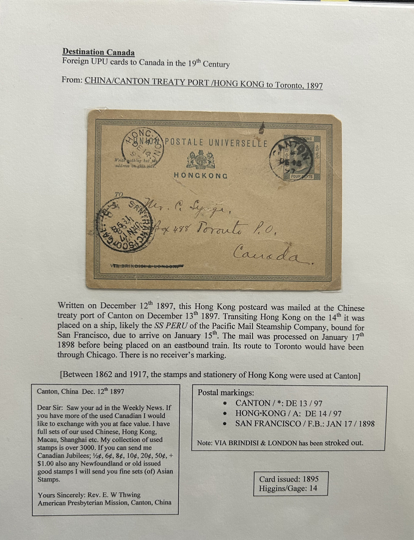 1356 PC   imageExhibit of U.P.U. Stationery Postal Cards Mailed to Canada, 1878 to 1900, with 84 cards in all, in a 3-frame display arranged alphabetically by country, from Argentina to Wurttemberg, including better such as Bahamas, Barbados, British Guiana, British Honduras, Bulgaria, Burma, Cape of Good Hope, Ceylon (2 different, both uprated), China / Canton Treaty Port / Hong Kong, Cyprus, Danish West Indies, Egypt, Germany to Newfoundland, Greece, Grenada, Guadeloupe, Hawaii, India, Italy, Jamaica, Japan, Lagos, Leeward Islands, Malta, Machonaland (2 different), Mexico, New South Wales, Niger Coast Protectorate, Russia, San Marino, Sierra Leone, Turks Islands, and many more. We note some that are postage due, some useful receivers or transit markings, a few have their reply portions still attached, etc. Overall very fine and won a gold award at exhibit. See our photos for a sampling. (Scan 1) (Scan 2) (Scan 3) (Scan 4) (Scan 5) (Scan 6) (Scan 7) (Scan 8) (Scan 9) (Scan 10) (Scan 11) (Scan 12) (Scan 13) (Scan 14) (Scan 15) (Scan 16) (Scan 17) (Scan 18) (Scan 19) (Scan 20) (All Scans)