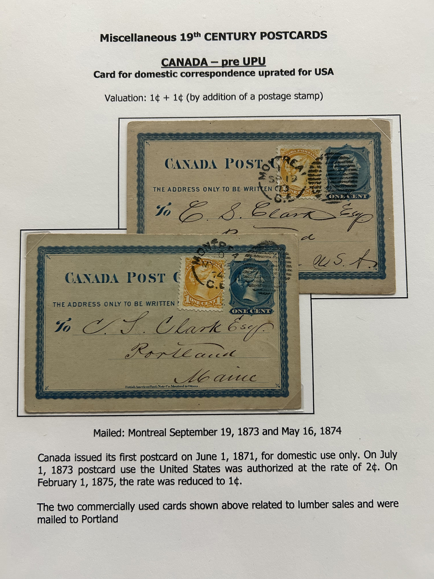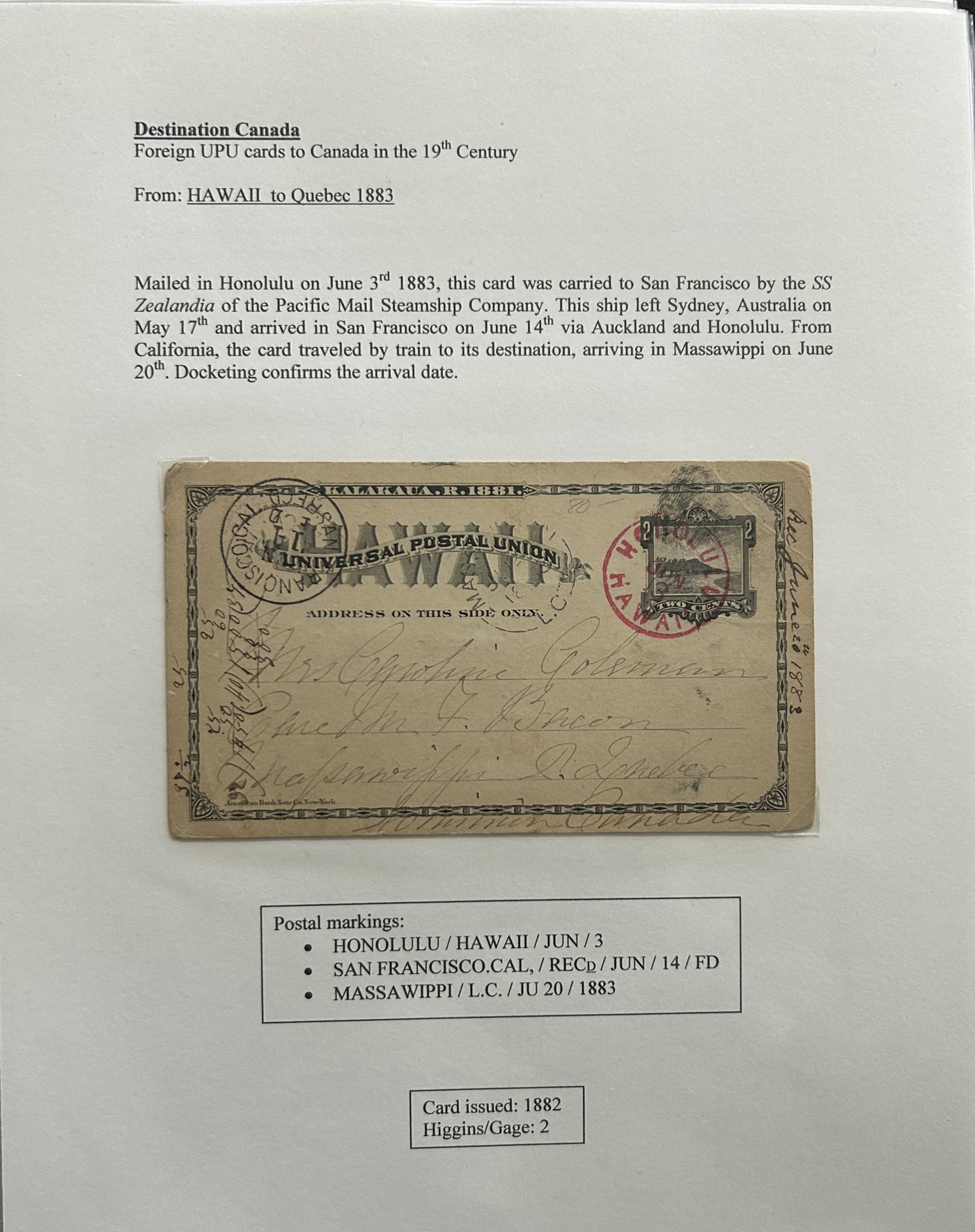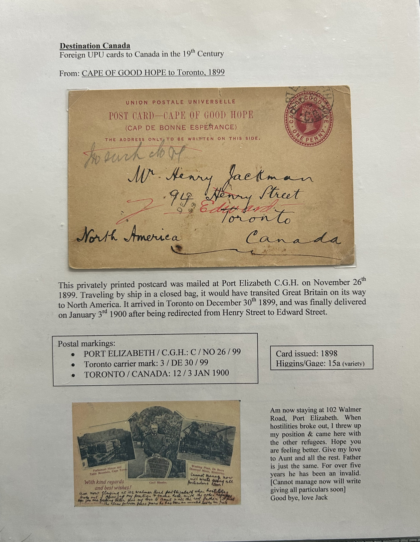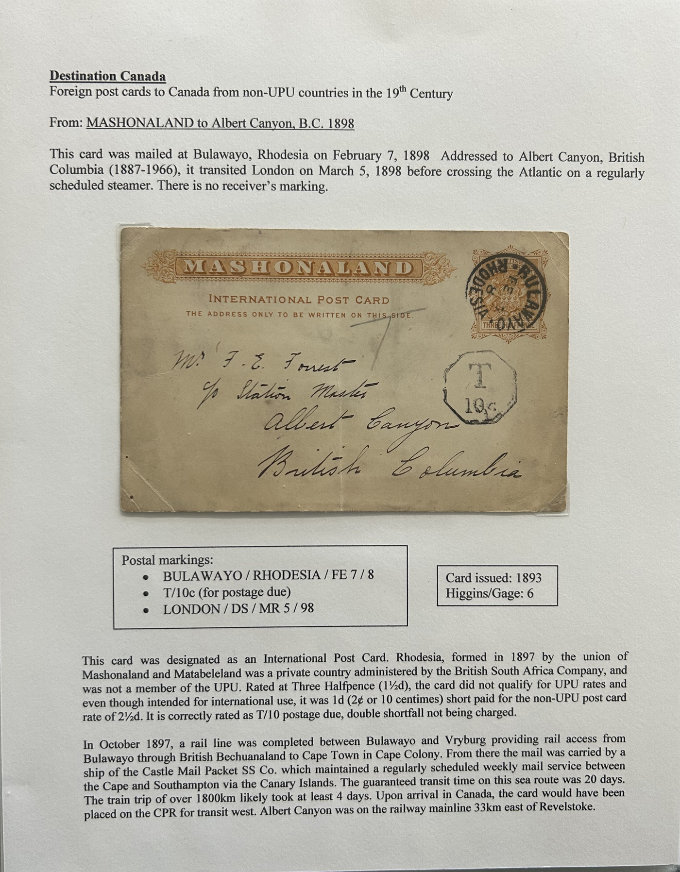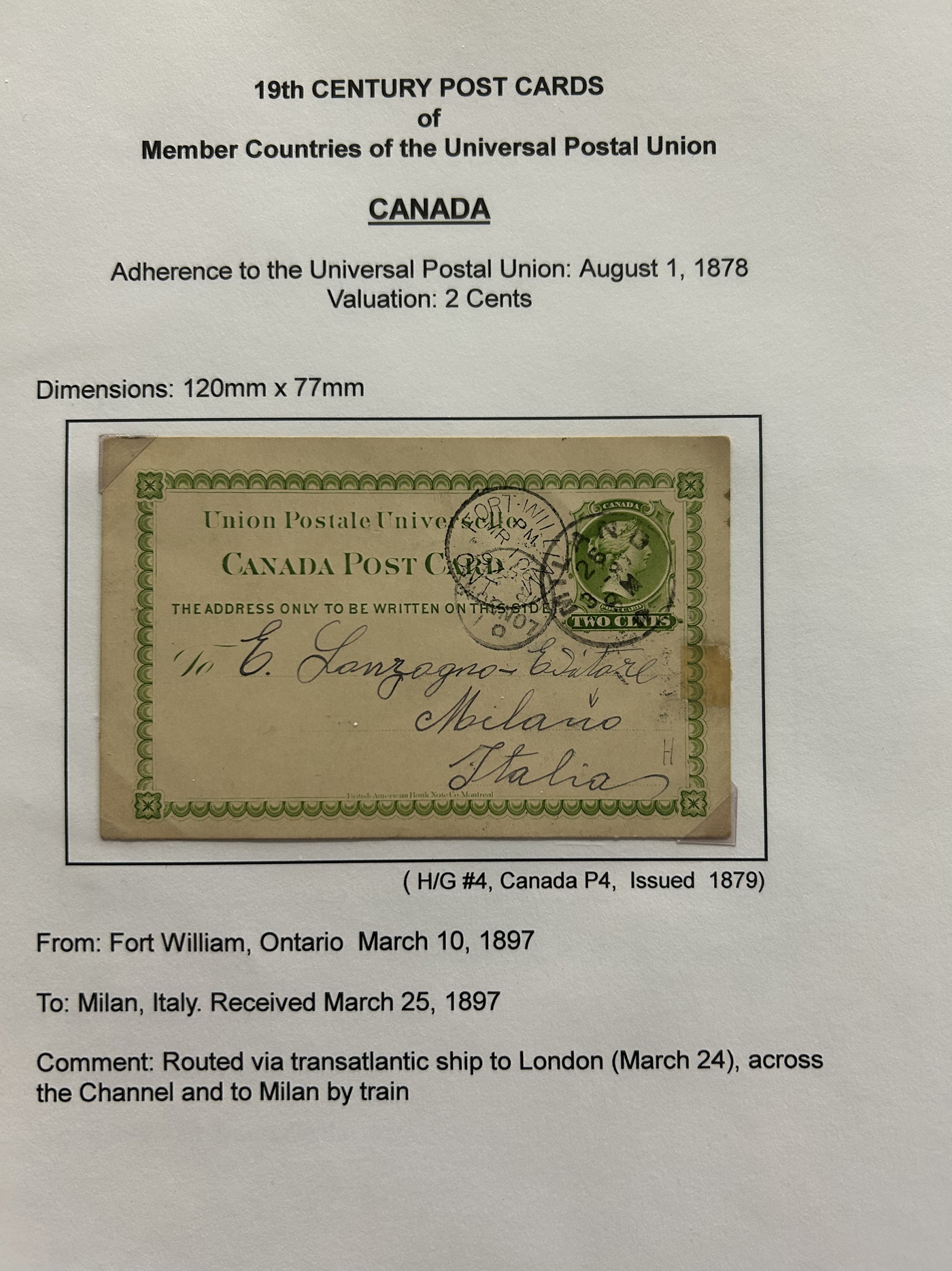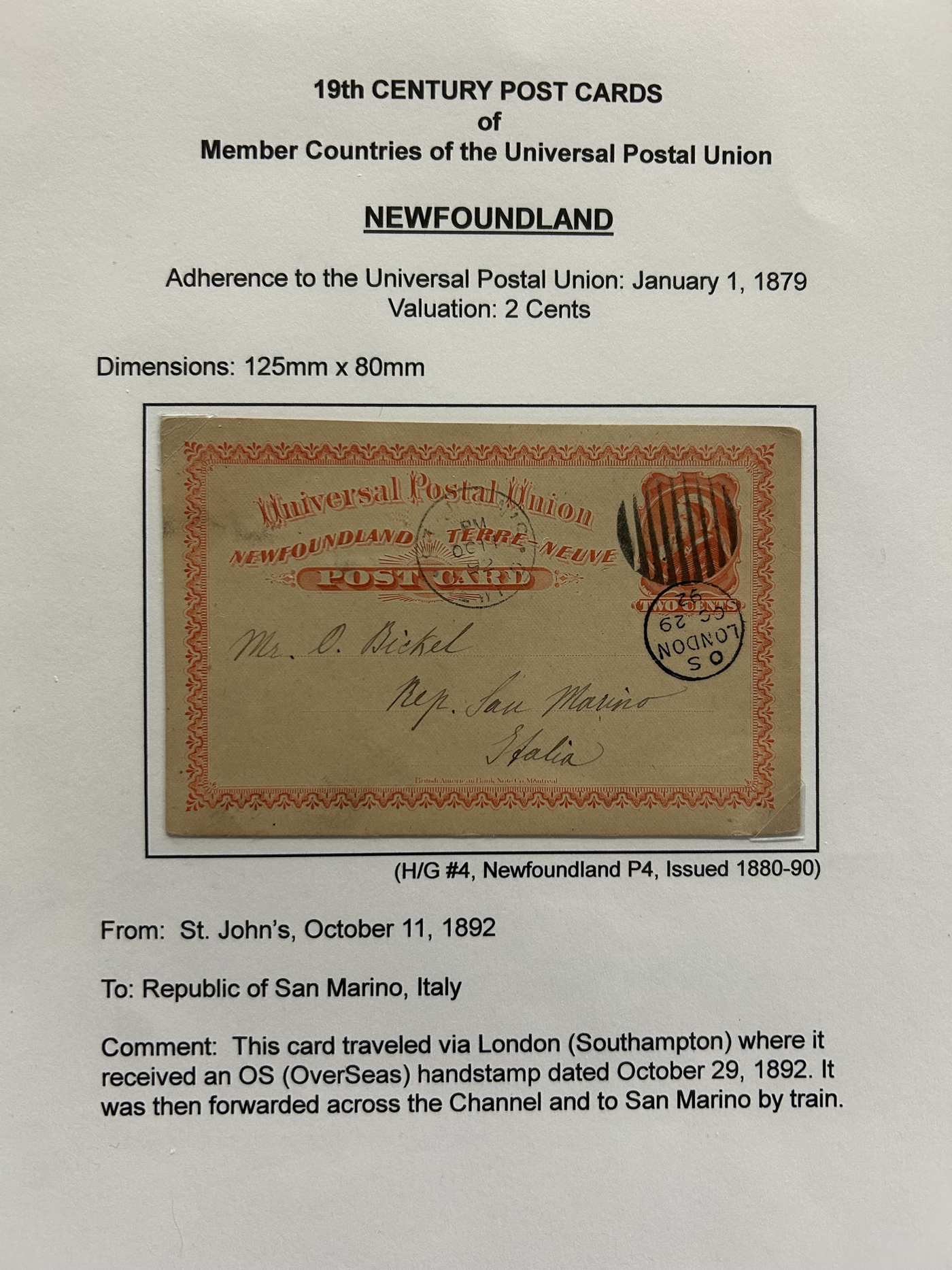 1356 PC   imageExhibit of U.P.U. Stationery Postal Cards Mailed to Canada, 1878 to 1900, with 84 cards in all, in a 3-frame display arranged alphabetically by country, from Argentina to Wurttemberg, including better such as Bahamas, Barbados, British Guiana, British Honduras, Bulgaria, Burma, Cape of Good Hope, Ceylon (2 different, both uprated), China / Canton Treaty Port / Hong Kong, Cyprus, Danish West Indies, Egypt, Germany to Newfoundland, Greece, Grenada, Guadeloupe, Hawaii, India, Italy, Jamaica, Japan, Lagos, Leeward Islands, Malta, Machonaland (2 different), Mexico, New South Wales, Niger Coast Protectorate, Russia, San Marino, Sierra Leone, Turks Islands, and many more. We note some that are postage due, some useful receivers or transit markings, a few have their reply portions still attached, etc. Overall very fine and won a gold award at exhibit. See our photos for a sampling. (Scan 1) (Scan 2) (Scan 3) (Scan 4) (Scan 5) (Scan 6) (Scan 7) (Scan 8) (Scan 9) (Scan 10) (Scan 11) (Scan 12) (Scan 13) (Scan 14) (Scan 15) (Scan 16) (Scan 17) (Scan 18) (Scan 19) (Scan 20) (All Scans)