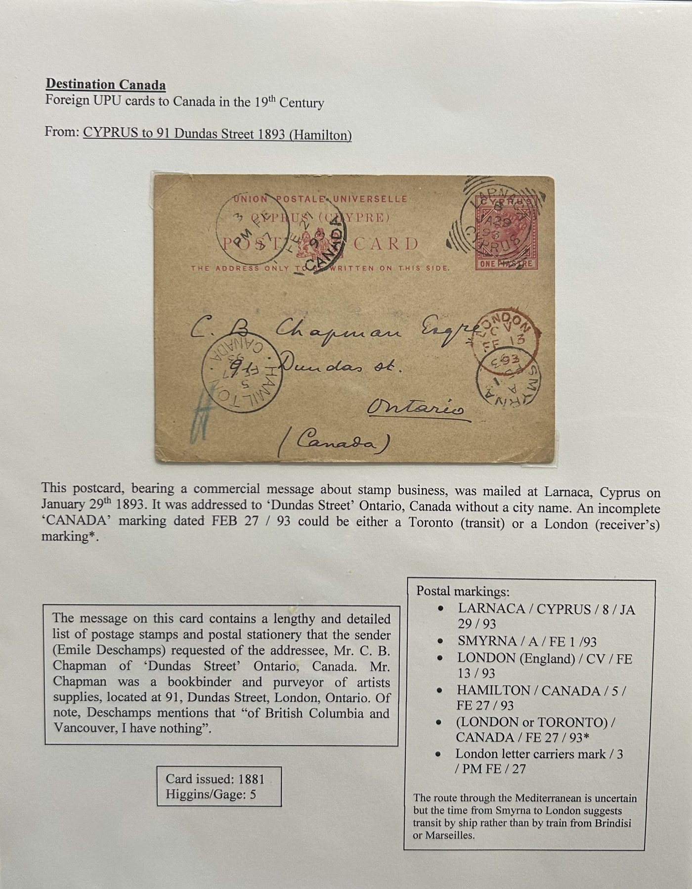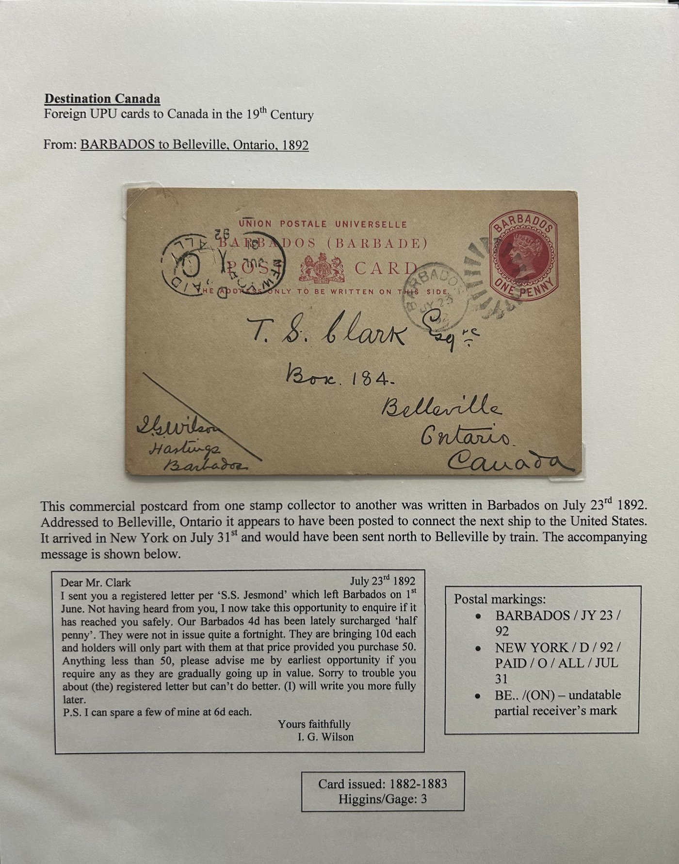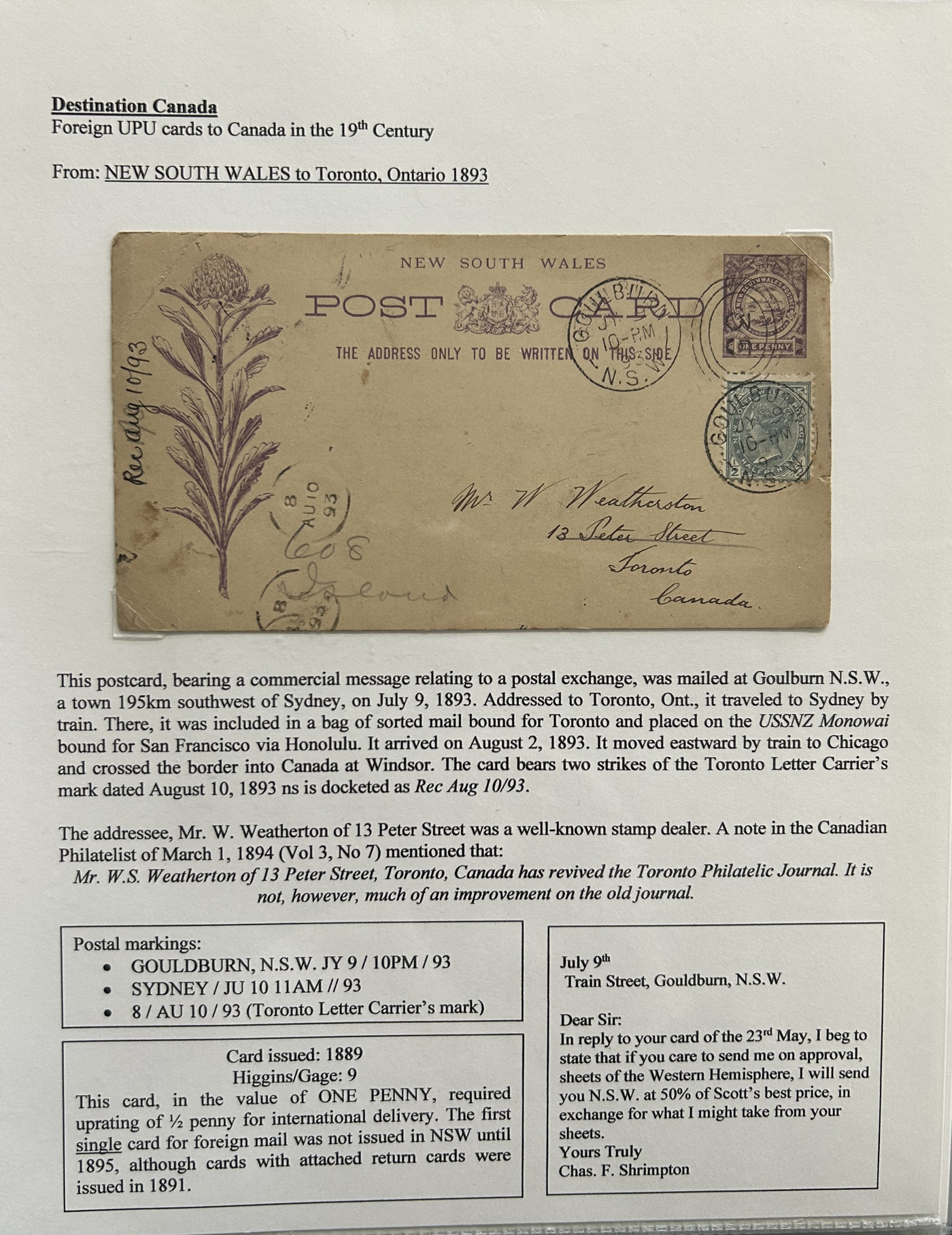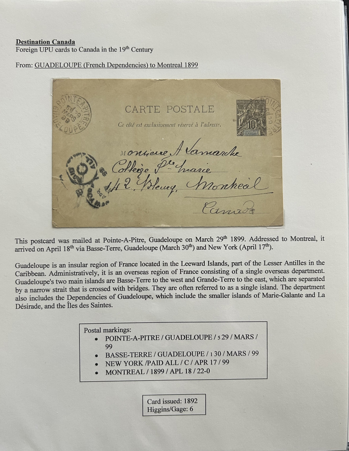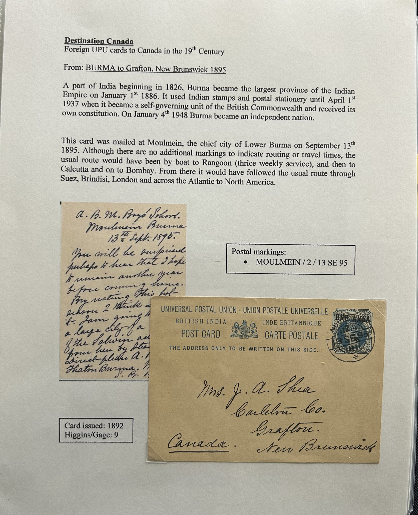 1356 PC   imageExhibit of U.P.U. Stationery Postal Cards Mailed to Canada, 1878 to 1900, with 84 cards in all, in a 3-frame display arranged alphabetically by country, from Argentina to Wurttemberg, including better such as Bahamas, Barbados, British Guiana, British Honduras, Bulgaria, Burma, Cape of Good Hope, Ceylon (2 different, both uprated), China / Canton Treaty Port / Hong Kong, Cyprus, Danish West Indies, Egypt, Germany to Newfoundland, Greece, Grenada, Guadeloupe, Hawaii, India, Italy, Jamaica, Japan, Lagos, Leeward Islands, Malta, Machonaland (2 different), Mexico, New South Wales, Niger Coast Protectorate, Russia, San Marino, Sierra Leone, Turks Islands, and many more. We note some that are postage due, some useful receivers or transit markings, a few have their reply portions still attached, etc. Overall very fine and won a gold award at exhibit. See our photos for a sampling. (Scan 1) (Scan 2) (Scan 3) (Scan 4) (Scan 5) (Scan 6) (Scan 7) (Scan 8) (Scan 9) (Scan 10) (Scan 11) (Scan 12) (Scan 13) (Scan 14) (Scan 15) (Scan 16) (Scan 17) (Scan 18) (Scan 19) (Scan 20) (All Scans)