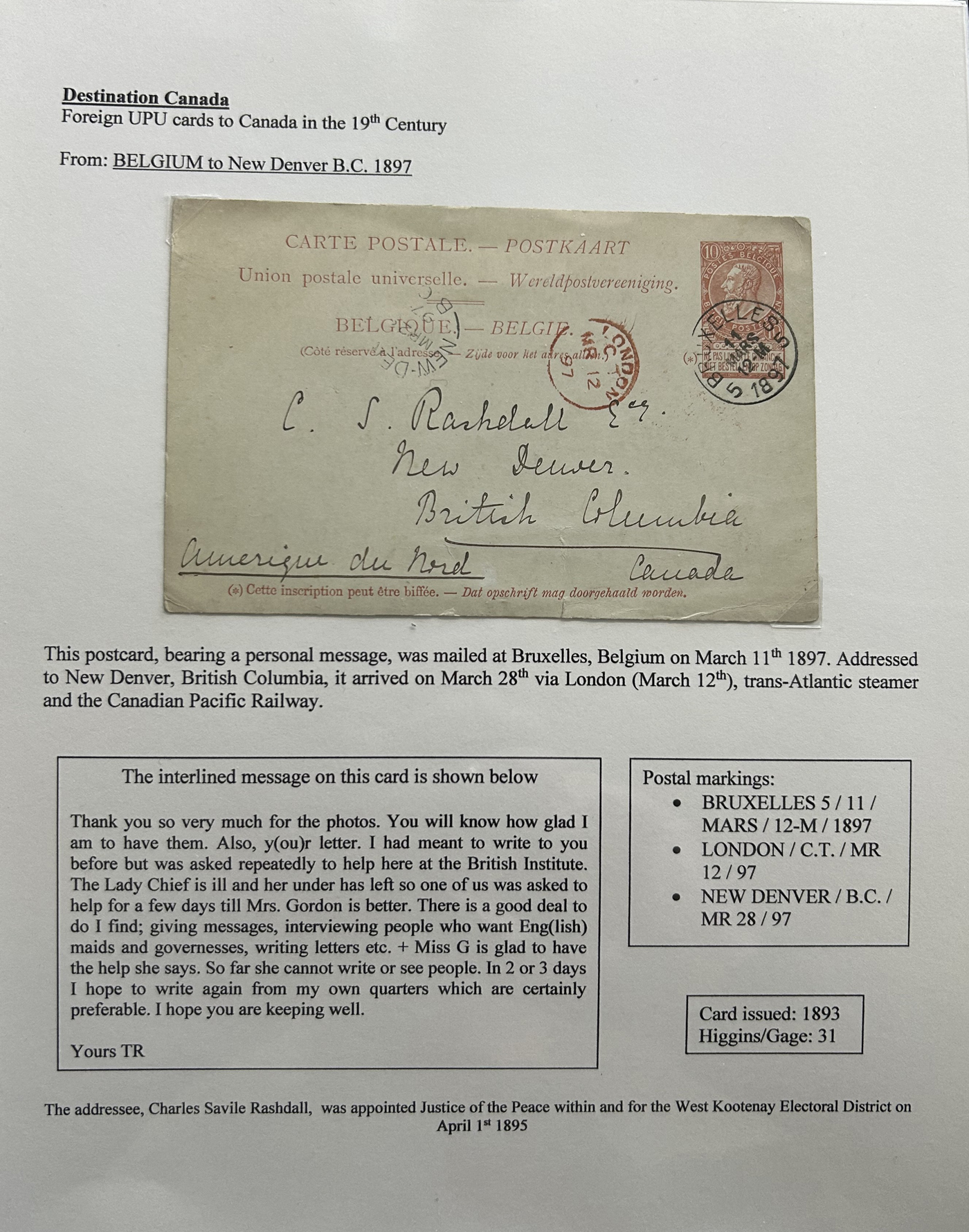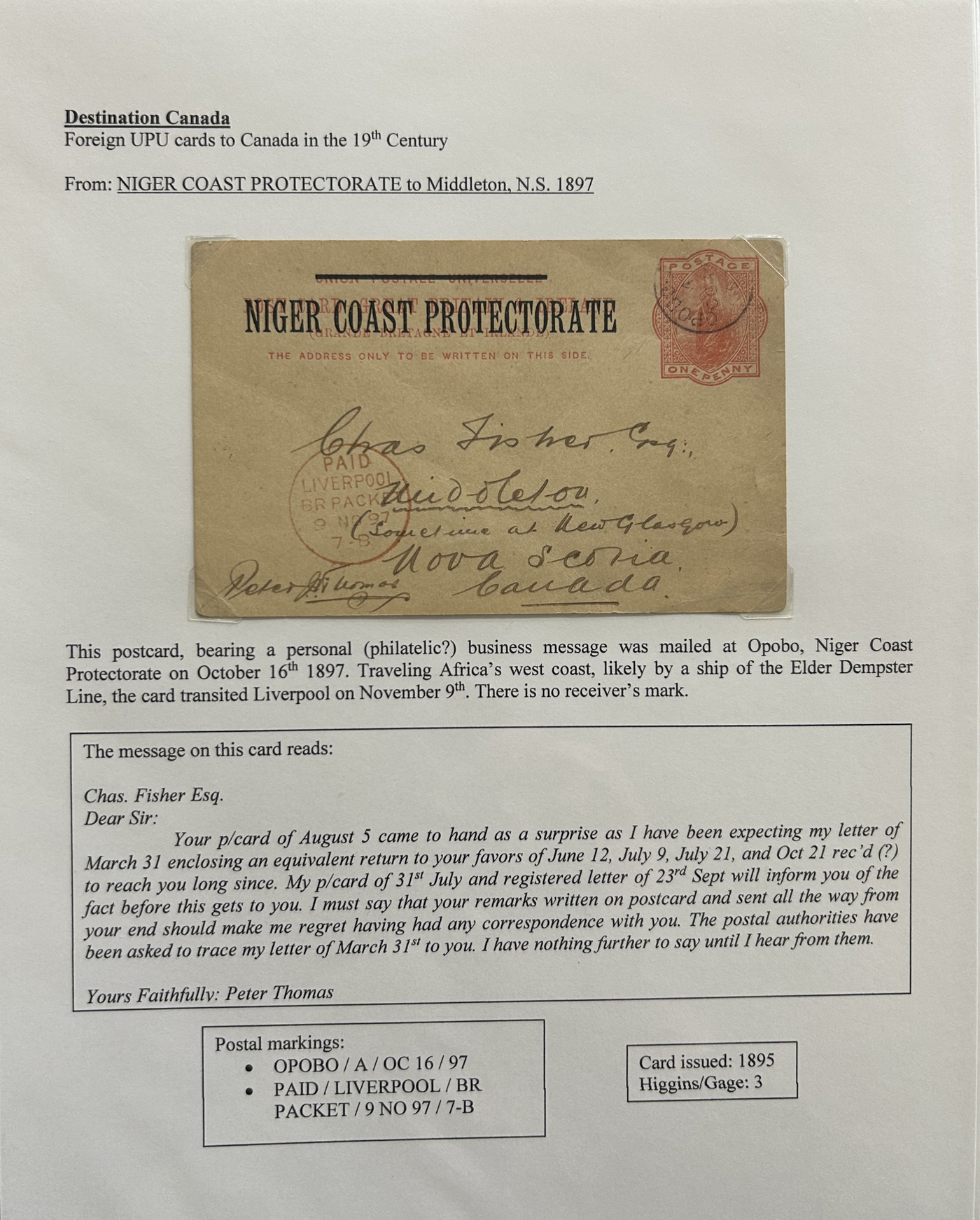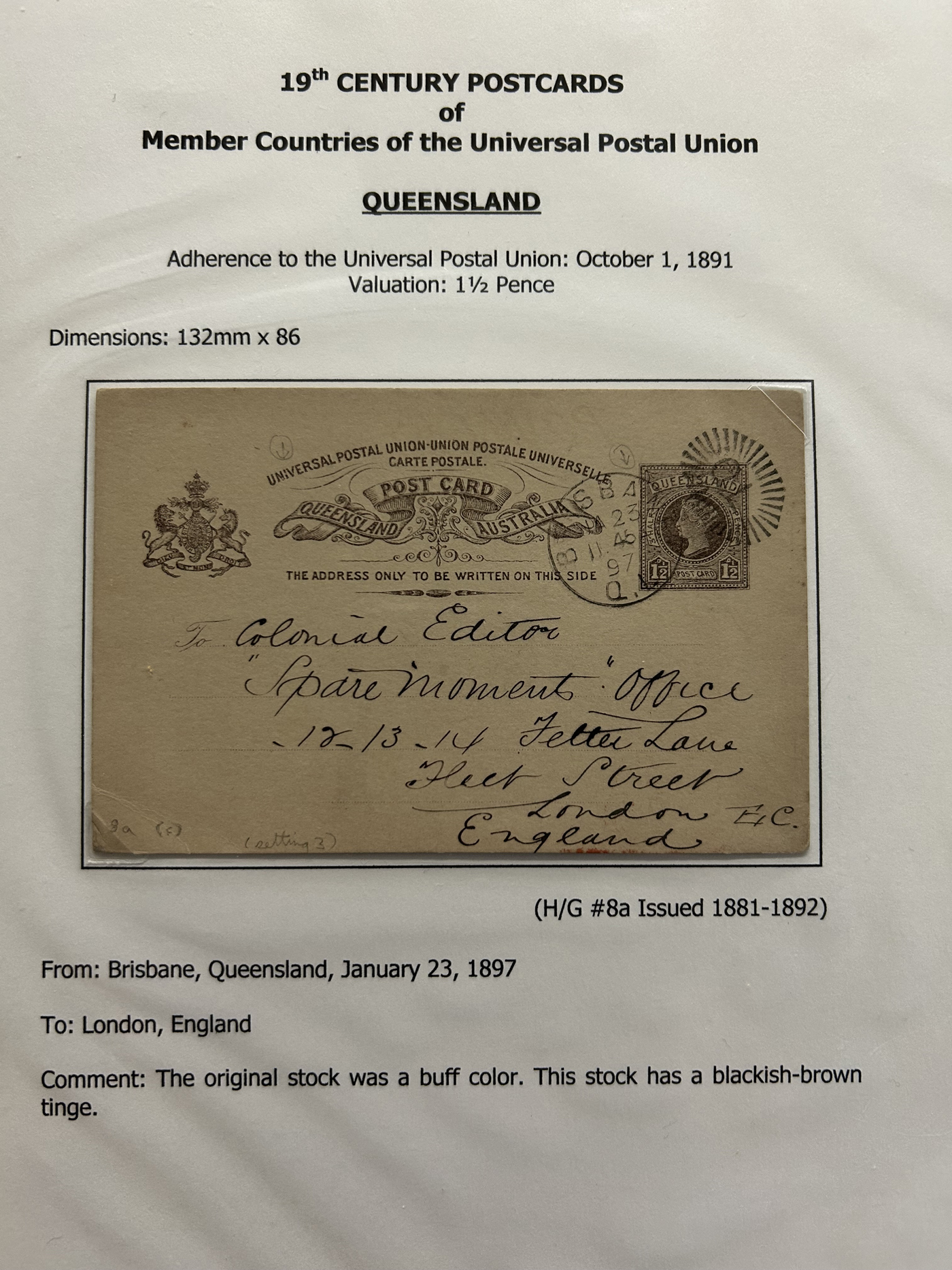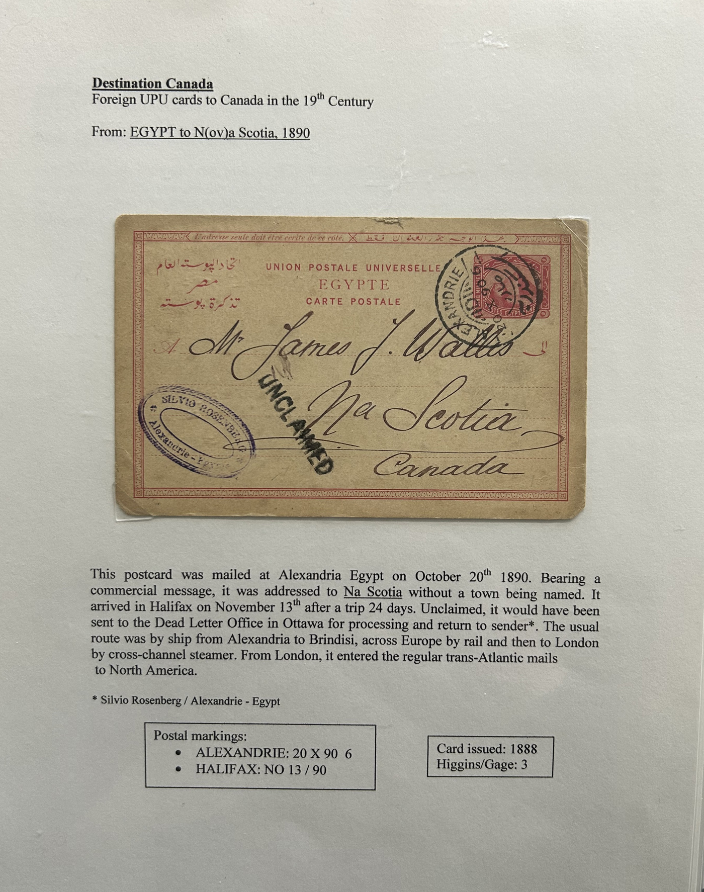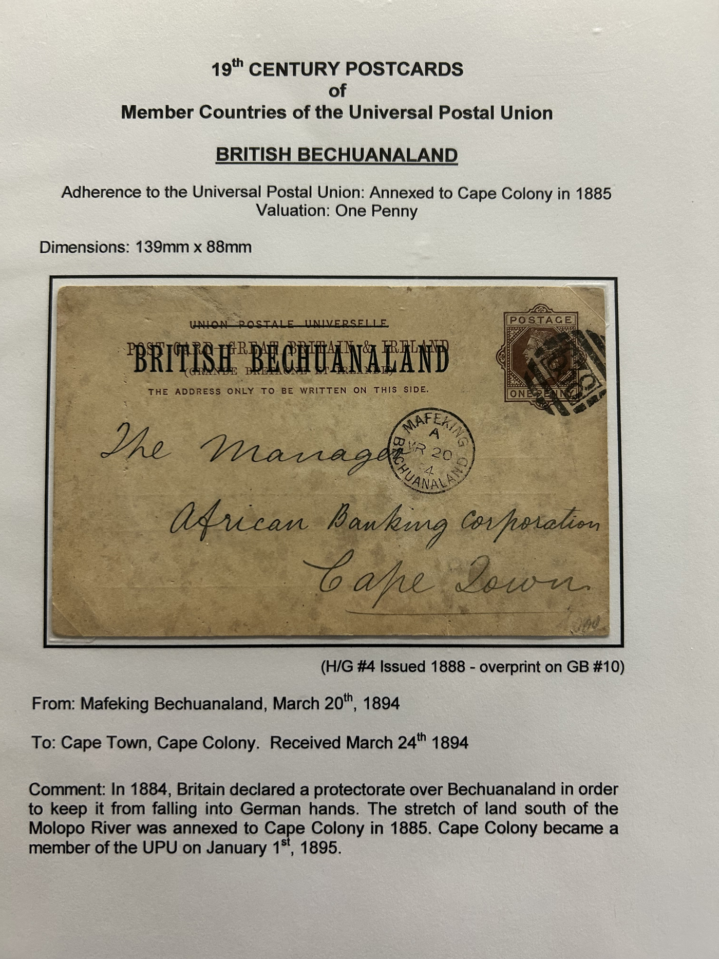 1356 PC   imageExhibit of U.P.U. Stationery Postal Cards Mailed to Canada, 1878 to 1900, with 84 cards in all, in a 3-frame display arranged alphabetically by country, from Argentina to Wurttemberg, including better such as Bahamas, Barbados, British Guiana, British Honduras, Bulgaria, Burma, Cape of Good Hope, Ceylon (2 different, both uprated), China / Canton Treaty Port / Hong Kong, Cyprus, Danish West Indies, Egypt, Germany to Newfoundland, Greece, Grenada, Guadeloupe, Hawaii, India, Italy, Jamaica, Japan, Lagos, Leeward Islands, Malta, Machonaland (2 different), Mexico, New South Wales, Niger Coast Protectorate, Russia, San Marino, Sierra Leone, Turks Islands, and many more. We note some that are postage due, some useful receivers or transit markings, a few have their reply portions still attached, etc. Overall very fine and won a gold award at exhibit. See our photos for a sampling. (Scan 1) (Scan 2) (Scan 3) (Scan 4) (Scan 5) (Scan 6) (Scan 7) (Scan 8) (Scan 9) (Scan 10) (Scan 11) (Scan 12) (Scan 13) (Scan 14) (Scan 15) (Scan 16) (Scan 17) (Scan 18) (Scan 19) (Scan 20) (All Scans)