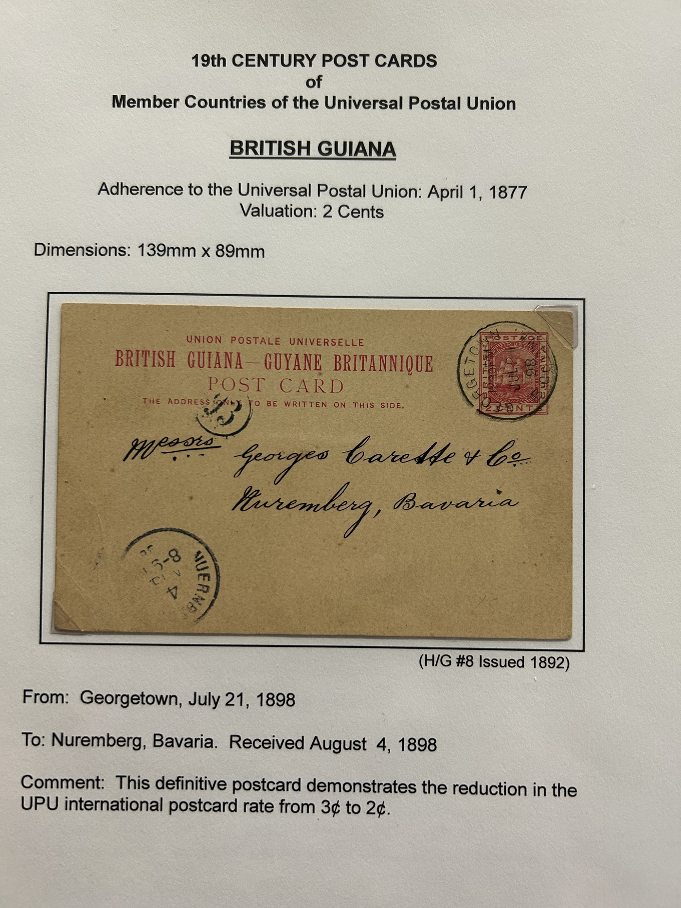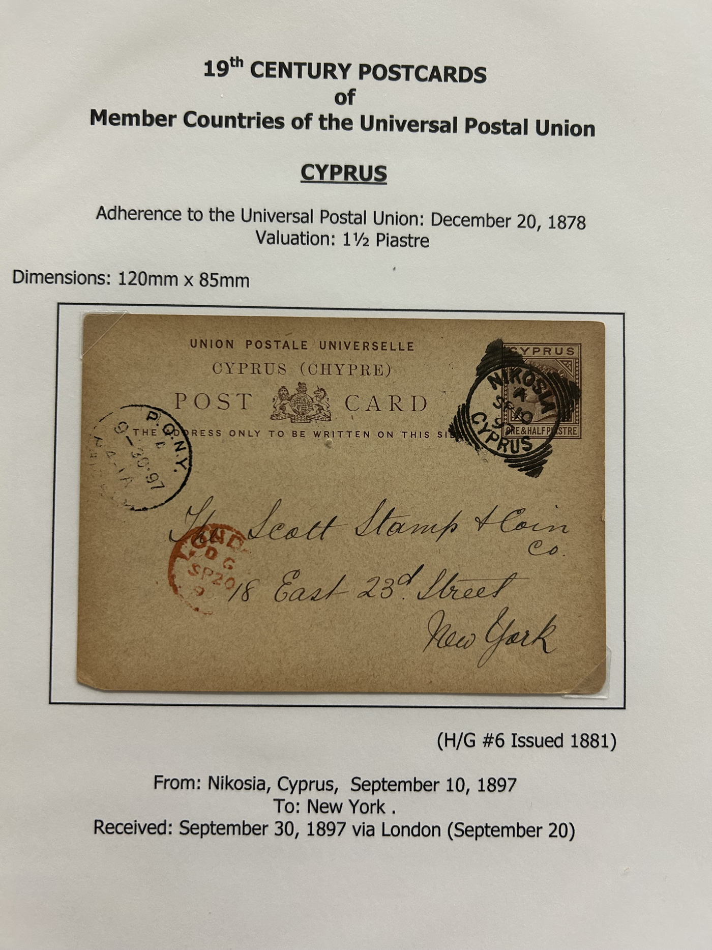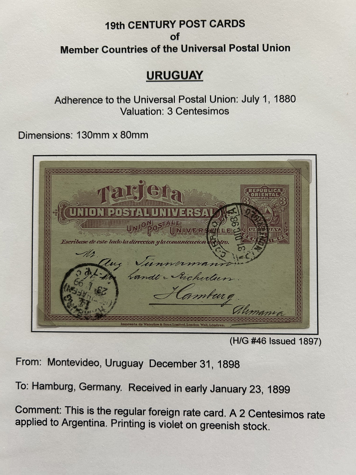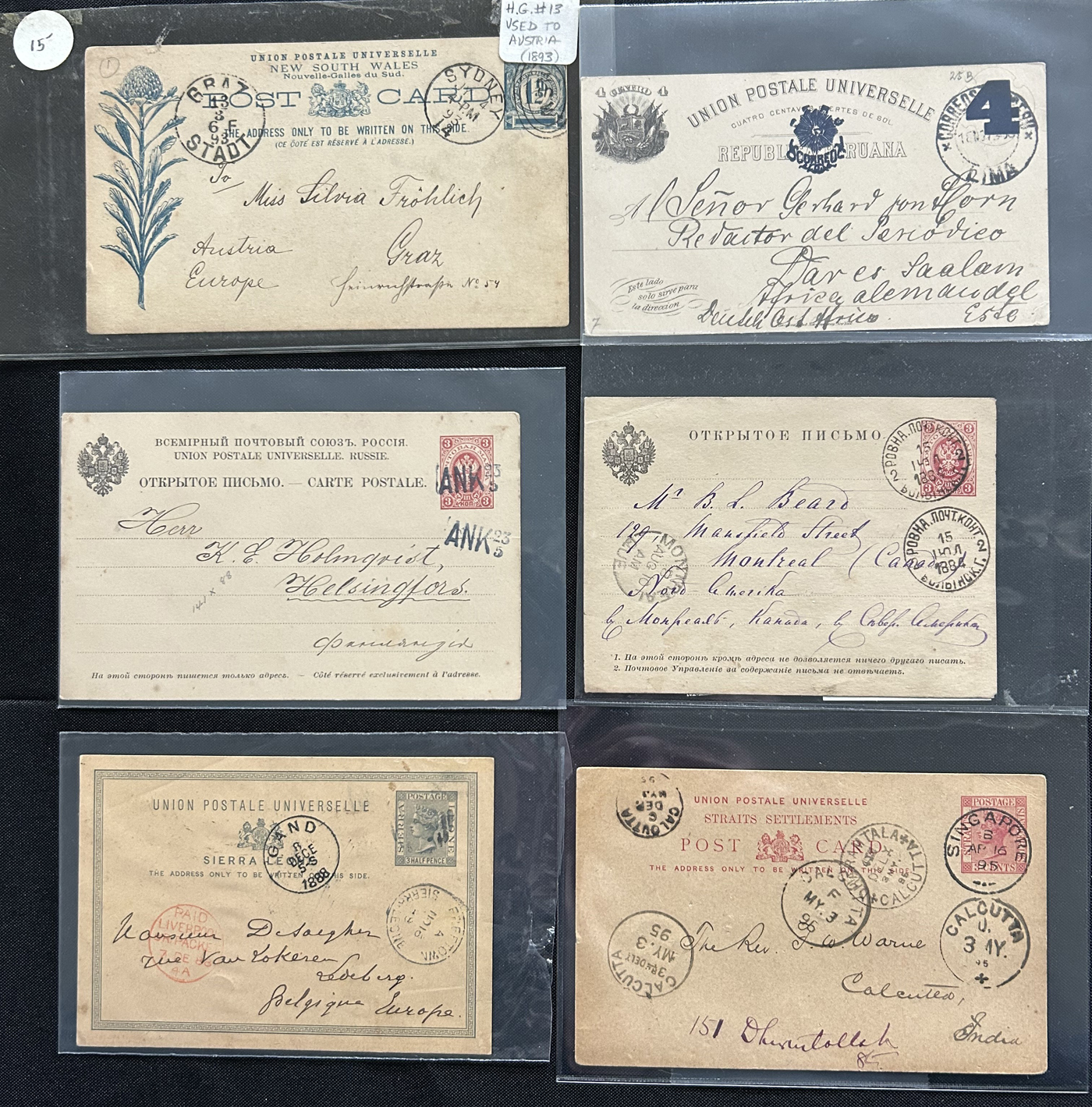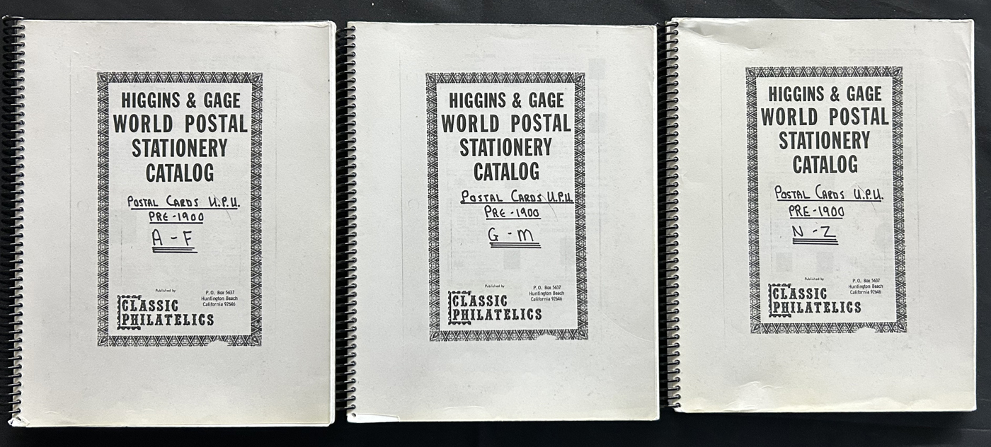1359 PC   imageExtensive Collection of Used Worldwide U.P.U. Postal Stationery Cards to 1900, with 295 cards from about 115 different countries of the world (no France or Great Britain - offered elsewhere in this sale), all well researched and written-up on pages. Within each country, when there is duplication it is either of a different type, destination, etc. Except for a few rare exceptions, none of the cards were uprated, and all pay the proper rate for mailing to a foreign country. We note many difficult to obtain cards from countries one rarely encounters, and there is great postmark interest as well as different country destinations. An exceptional collection just waiting to be exhibited, and a rare opportunity to acquire such a variety of different cards. Overall very fine, our online photos only show a small representation. Should easily be worth our low estimate of $5 per card, as most were bought in the range of $10 to $50 and in some cases more. Also includes a useful photocopy of all the Higgins and Gage listings pertaining to pre-1900 U.P.U. cards in three volumes. (Scan 1) (Scan 2) (Scan 3) (Scan 4) (Scan 5) (Scan 6) (Scan 7) (Scan 8) (Scan 9) (Scan 10) (Scan 11) (Scan 12) (Scan 13) (Scan 14) (Scan 15) (Scan 16) (Scan 17) (Scan 18) (Scan 19) (Scan 20) (Scan 21) (Scan 22) (Scan 23) (Scan 24) (Scan 25) (Scan 26) (Scan 27) (Scan 28) (Scan 29) (Scan 30) (Scan 31) (Scan 32) (Scan 33) (Scan 34) (Scan 35) (Scan 36) (Scan 37) (Scan 38) (Scan 39) (Scan 40) (Scan 41) (Scan 42) (Scan 43) (Scan 44) (Scan 45) (Scan 46) (All Scans)