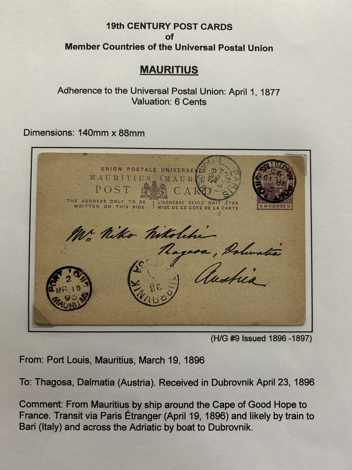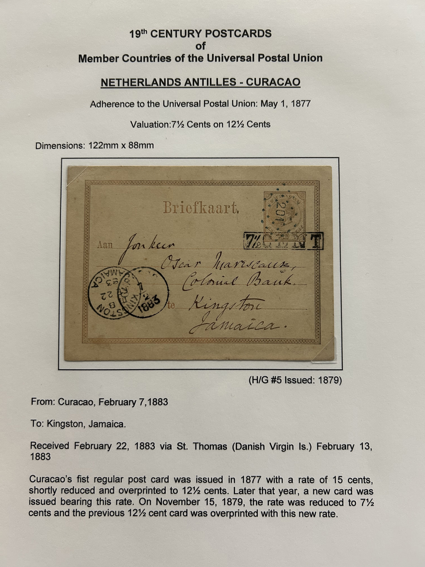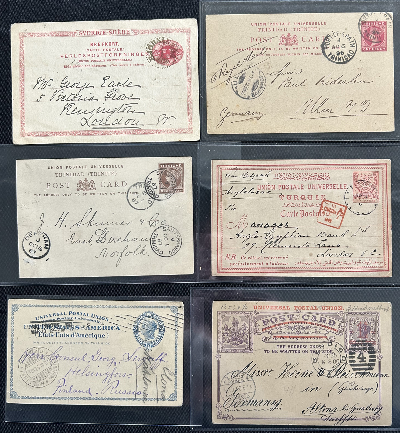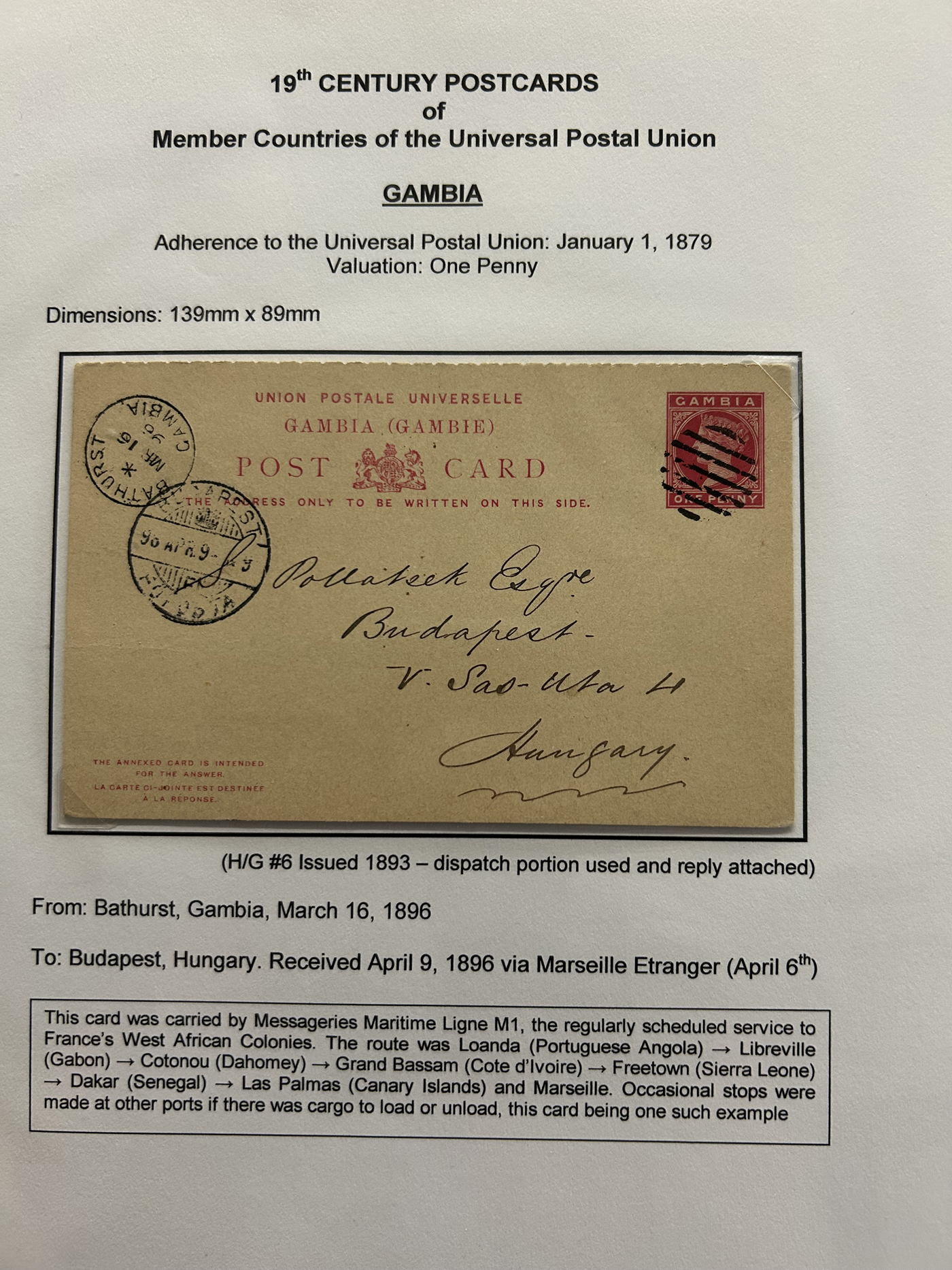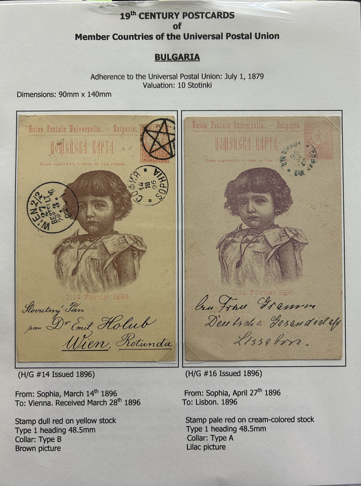 1359 PC   imageExtensive Collection of Used Worldwide U.P.U. Postal Stationery Cards to 1900, with 295 cards from about 115 different countries of the world (no France or Great Britain - offered elsewhere in this sale), all well researched and written-up on pages. Within each country, when there is duplication it is either of a different type, destination, etc. Except for a few rare exceptions, none of the cards were uprated, and all pay the proper rate for mailing to a foreign country. We note many difficult to obtain cards from countries one rarely encounters, and there is great postmark interest as well as different country destinations. An exceptional collection just waiting to be exhibited, and a rare opportunity to acquire such a variety of different cards. Overall very fine, our online photos only show a small representation. Should easily be worth our low estimate of $5 per card, as most were bought in the range of $10 to $50 and in some cases more. Also includes a useful photocopy of all the Higgins and Gage listings pertaining to pre-1900 U.P.U. cards in three volumes. (Scan 1) (Scan 2) (Scan 3) (Scan 4) (Scan 5) (Scan 6) (Scan 7) (Scan 8) (Scan 9) (Scan 10) (Scan 11) (Scan 12) (Scan 13) (Scan 14) (Scan 15) (Scan 16) (Scan 17) (Scan 18) (Scan 19) (Scan 20) (Scan 21) (Scan 22) (Scan 23) (Scan 24) (Scan 25) (Scan 26) (Scan 27) (Scan 28) (Scan 29) (Scan 30) (Scan 31) (Scan 32) (Scan 33) (Scan 34) (Scan 35) (Scan 36) (Scan 37) (Scan 38) (Scan 39) (Scan 40) (Scan 41) (Scan 42) (Scan 43) (Scan 44) (Scan 45) (Scan 46) (All Scans)