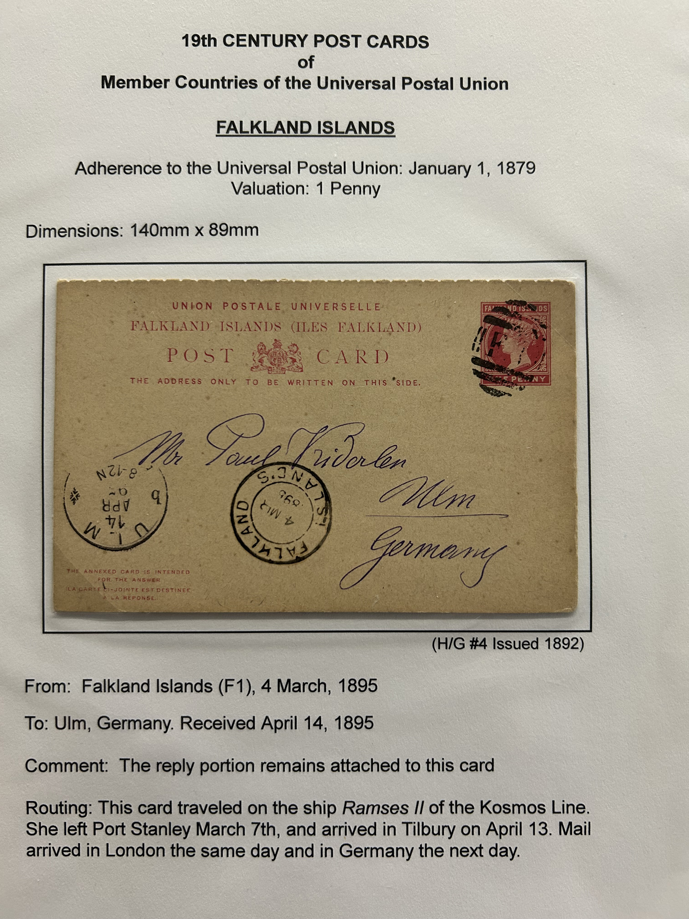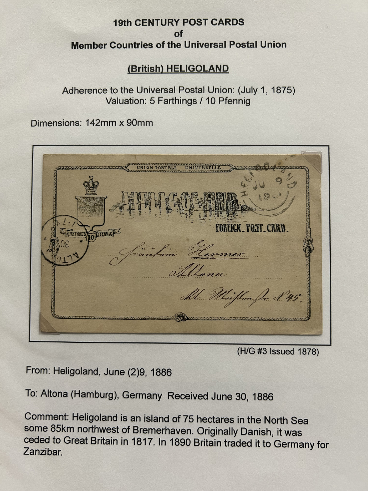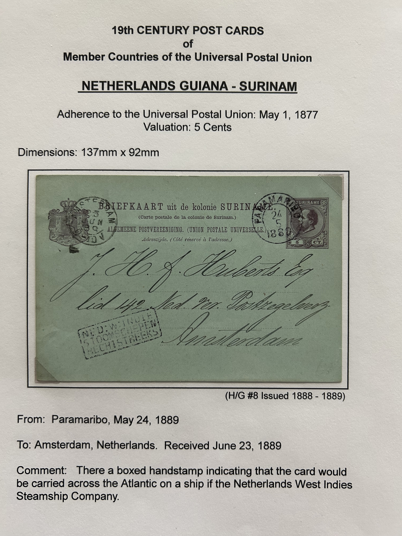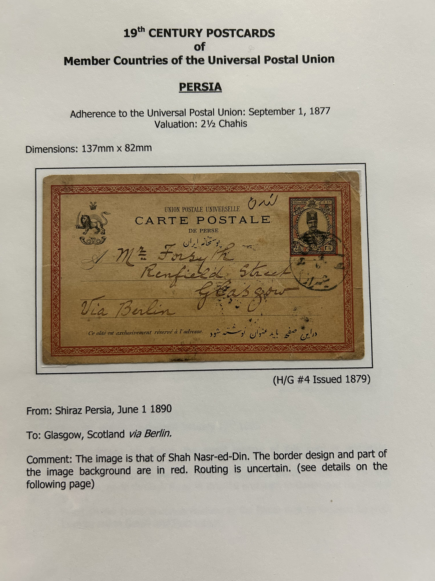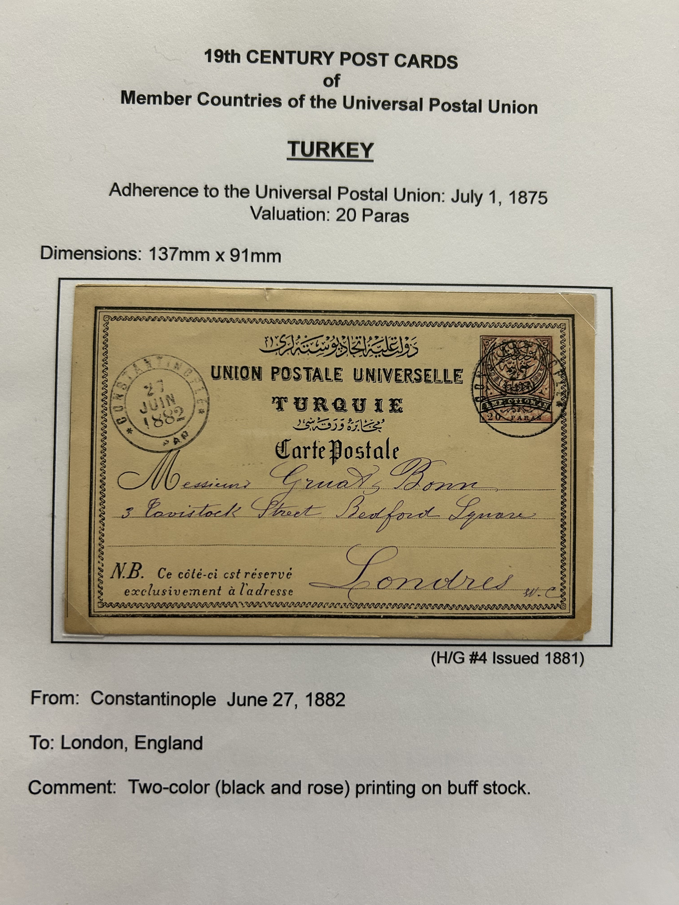 1359 PC   imageExtensive Collection of Used Worldwide U.P.U. Postal Stationery Cards to 1900, with 295 cards from about 115 different countries of the world (no France or Great Britain - offered elsewhere in this sale), all well researched and written-up on pages. Within each country, when there is duplication it is either of a different type, destination, etc. Except for a few rare exceptions, none of the cards were uprated, and all pay the proper rate for mailing to a foreign country. We note many difficult to obtain cards from countries one rarely encounters, and there is great postmark interest as well as different country destinations. An exceptional collection just waiting to be exhibited, and a rare opportunity to acquire such a variety of different cards. Overall very fine, our online photos only show a small representation. Should easily be worth our low estimate of $5 per card, as most were bought in the range of $10 to $50 and in some cases more. Also includes a useful photocopy of all the Higgins and Gage listings pertaining to pre-1900 U.P.U. cards in three volumes. (Scan 1) (Scan 2) (Scan 3) (Scan 4) (Scan 5) (Scan 6) (Scan 7) (Scan 8) (Scan 9) (Scan 10) (Scan 11) (Scan 12) (Scan 13) (Scan 14) (Scan 15) (Scan 16) (Scan 17) (Scan 18) (Scan 19) (Scan 20) (Scan 21) (Scan 22) (Scan 23) (Scan 24) (Scan 25) (Scan 26) (Scan 27) (Scan 28) (Scan 29) (Scan 30) (Scan 31) (Scan 32) (Scan 33) (Scan 34) (Scan 35) (Scan 36) (Scan 37) (Scan 38) (Scan 39) (Scan 40) (Scan 41) (Scan 42) (Scan 43) (Scan 44) (Scan 45) (Scan 46) (All Scans)