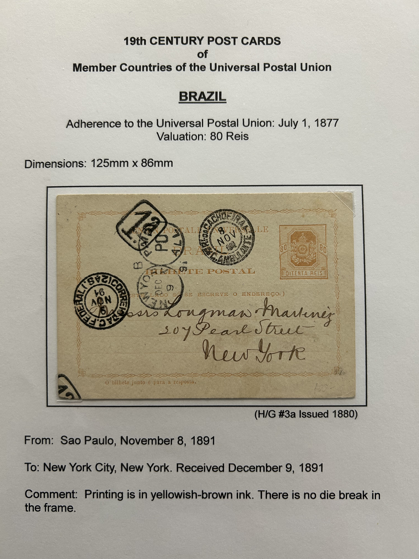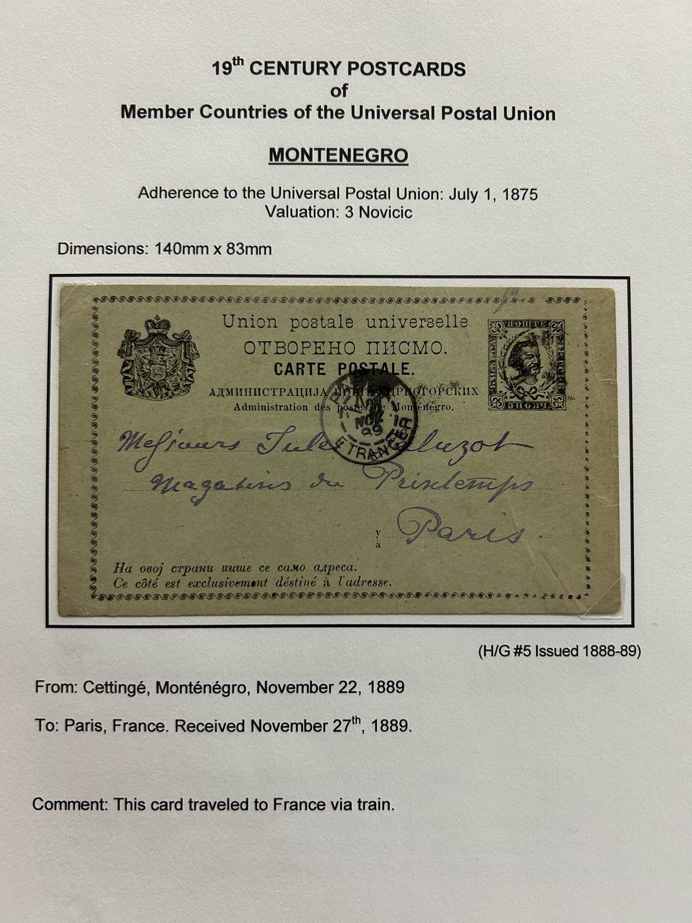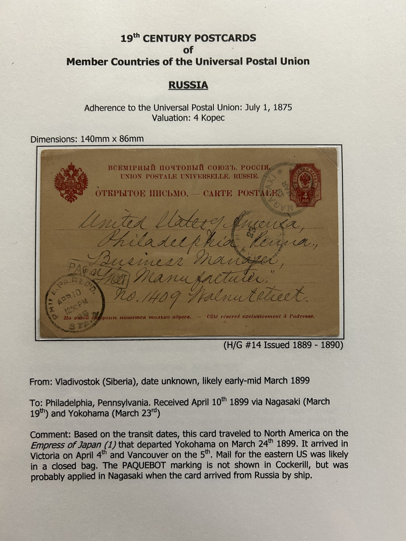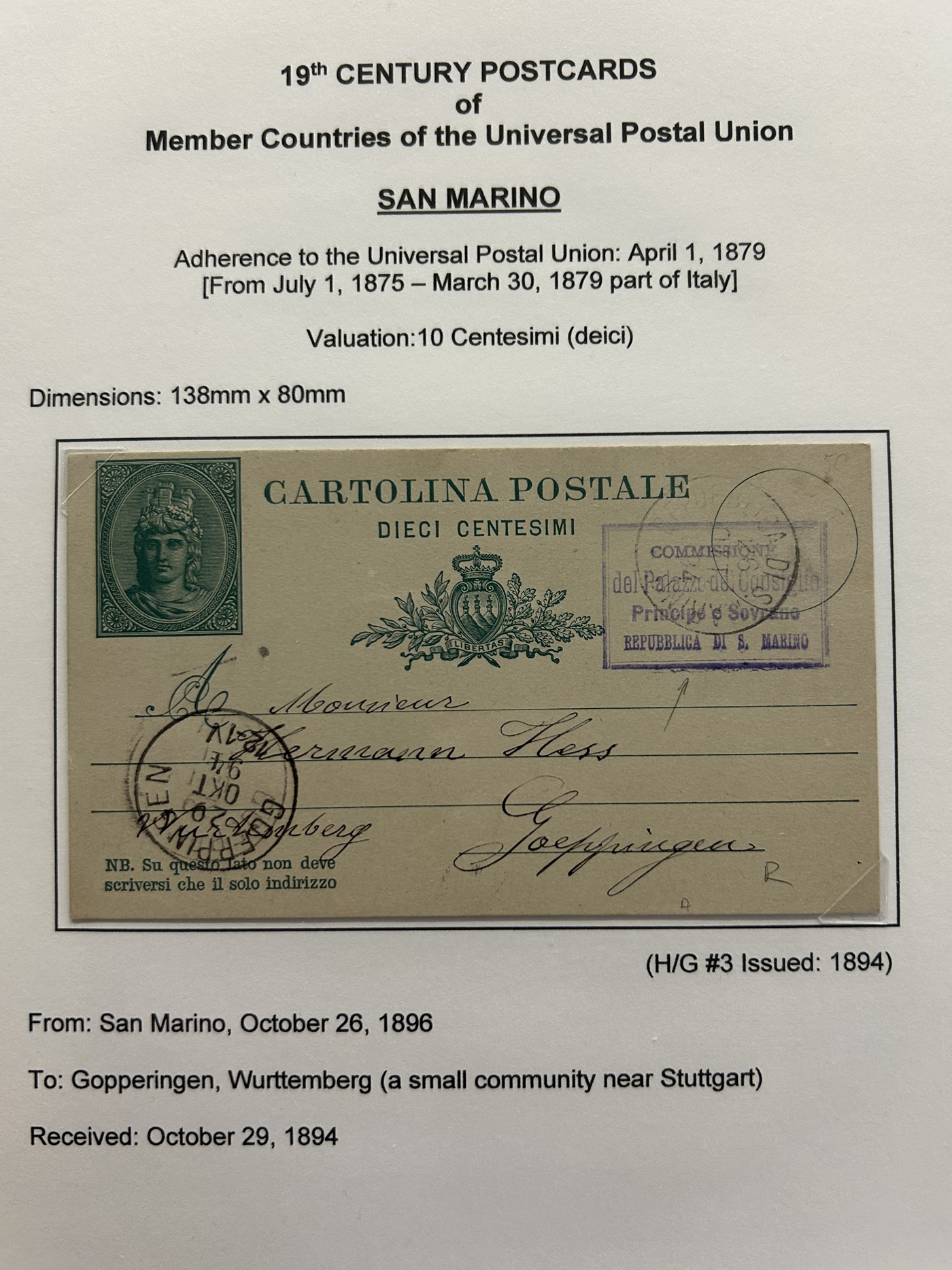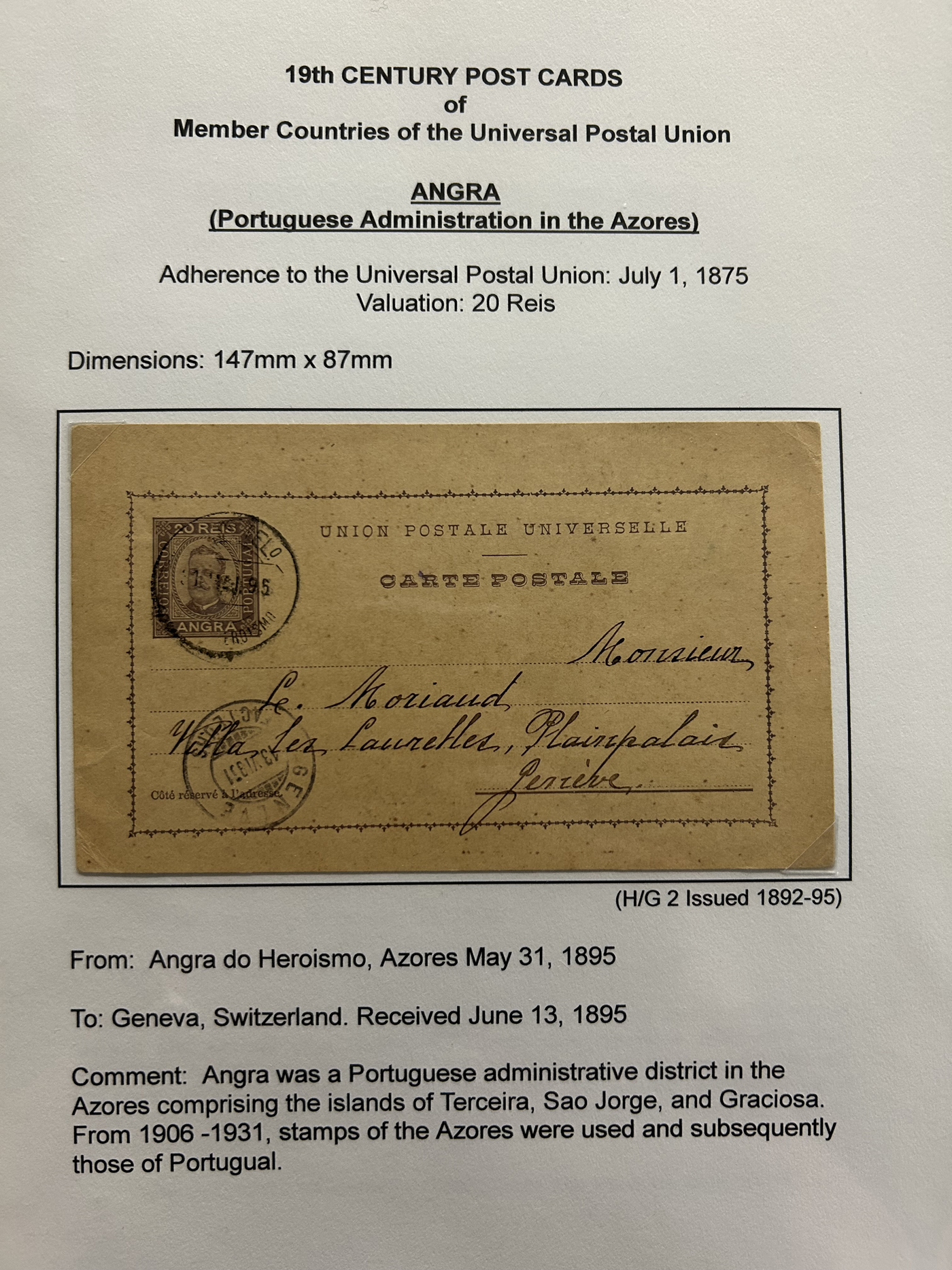 1359 PC   imageExtensive Collection of Used Worldwide U.P.U. Postal Stationery Cards to 1900, with 295 cards from about 115 different countries of the world (no France or Great Britain - offered elsewhere in this sale), all well researched and written-up on pages. Within each country, when there is duplication it is either of a different type, destination, etc. Except for a few rare exceptions, none of the cards were uprated, and all pay the proper rate for mailing to a foreign country. We note many difficult to obtain cards from countries one rarely encounters, and there is great postmark interest as well as different country destinations. An exceptional collection just waiting to be exhibited, and a rare opportunity to acquire such a variety of different cards. Overall very fine, our online photos only show a small representation. Should easily be worth our low estimate of $5 per card, as most were bought in the range of $10 to $50 and in some cases more. Also includes a useful photocopy of all the Higgins and Gage listings pertaining to pre-1900 U.P.U. cards in three volumes. (Scan 1) (Scan 2) (Scan 3) (Scan 4) (Scan 5) (Scan 6) (Scan 7) (Scan 8) (Scan 9) (Scan 10) (Scan 11) (Scan 12) (Scan 13) (Scan 14) (Scan 15) (Scan 16) (Scan 17) (Scan 18) (Scan 19) (Scan 20) (Scan 21) (Scan 22) (Scan 23) (Scan 24) (Scan 25) (Scan 26) (Scan 27) (Scan 28) (Scan 29) (Scan 30) (Scan 31) (Scan 32) (Scan 33) (Scan 34) (Scan 35) (Scan 36) (Scan 37) (Scan 38) (Scan 39) (Scan 40) (Scan 41) (Scan 42) (Scan 43) (Scan 44) (Scan 45) (Scan 46) (All Scans)