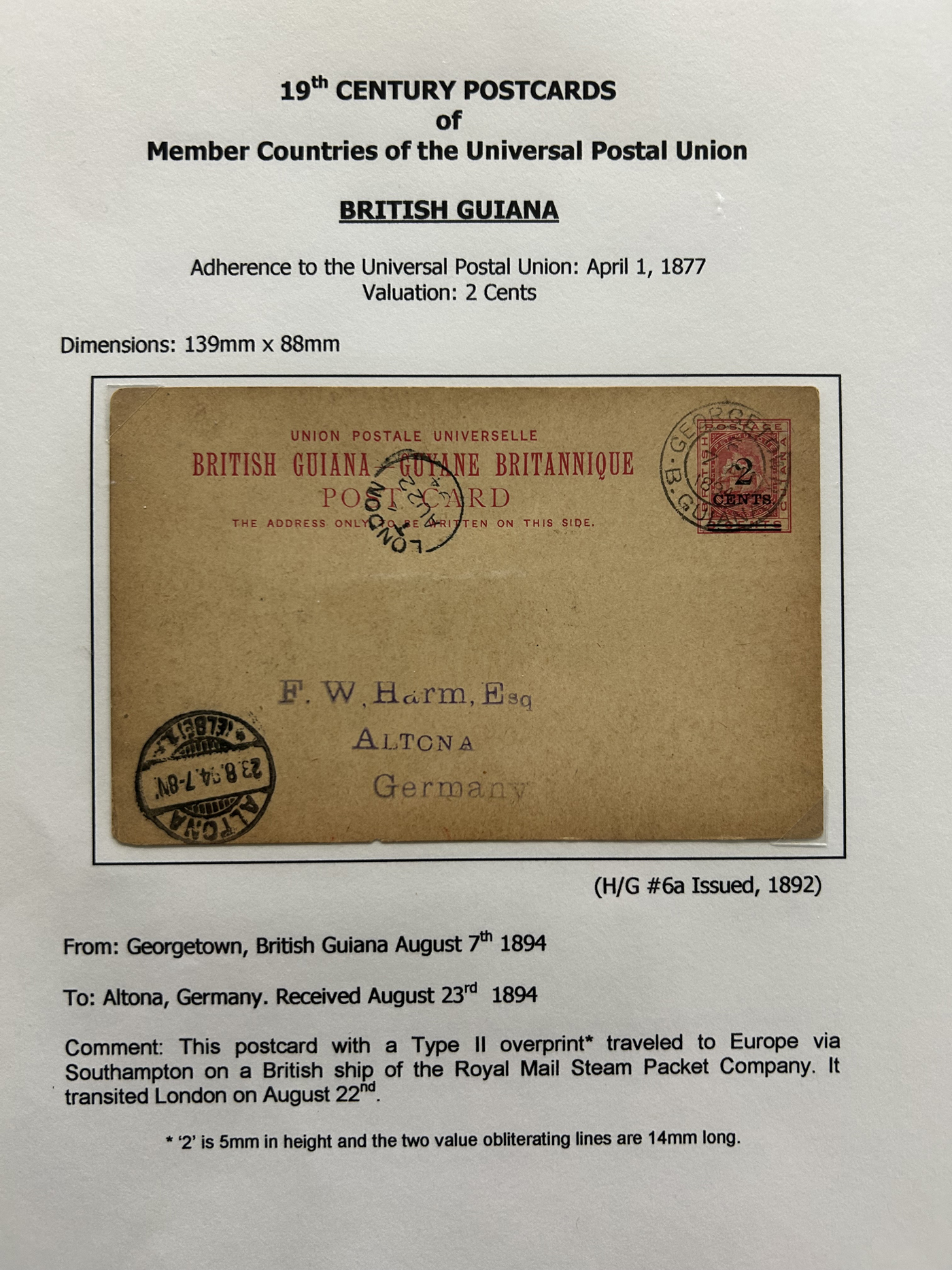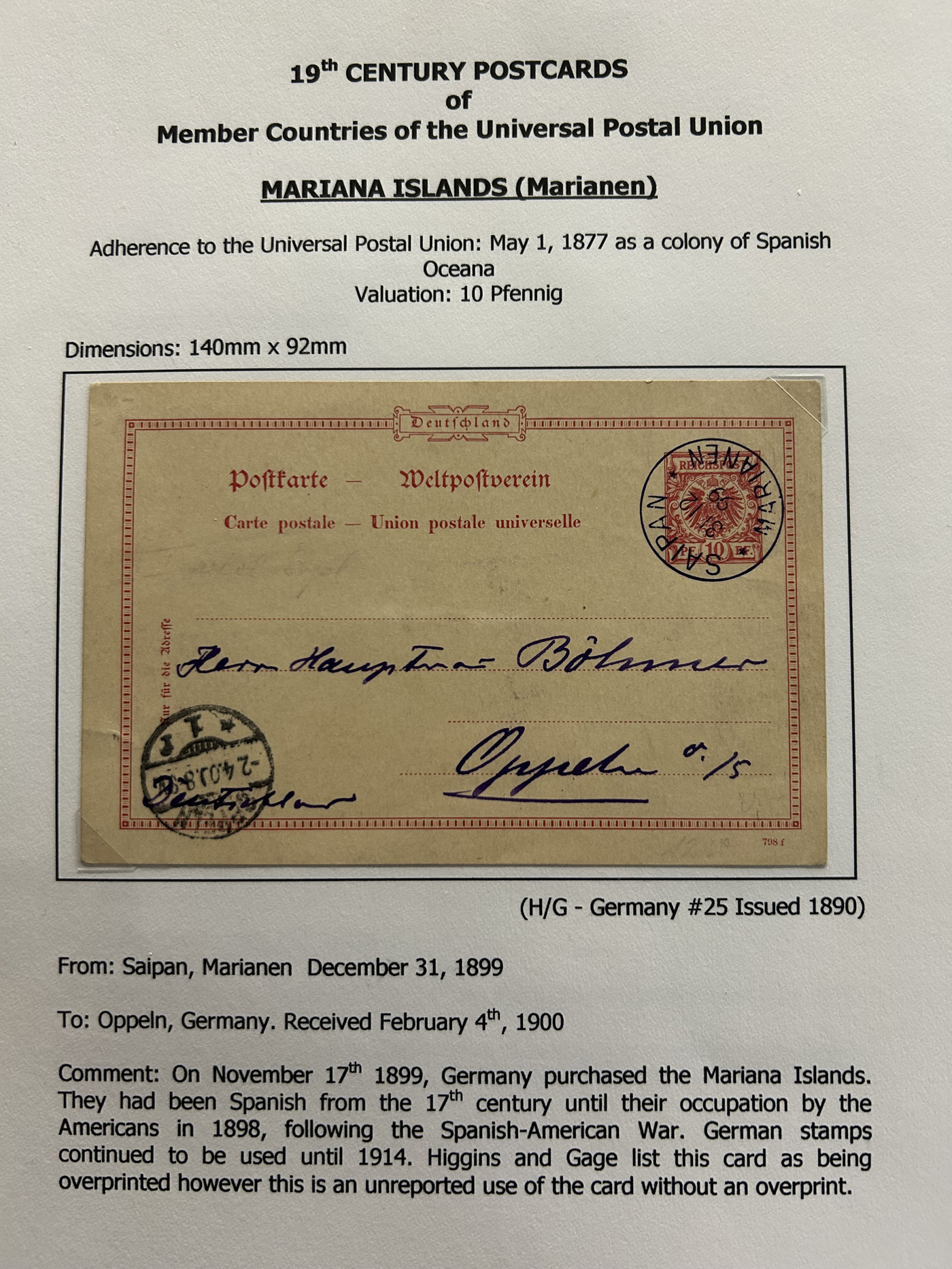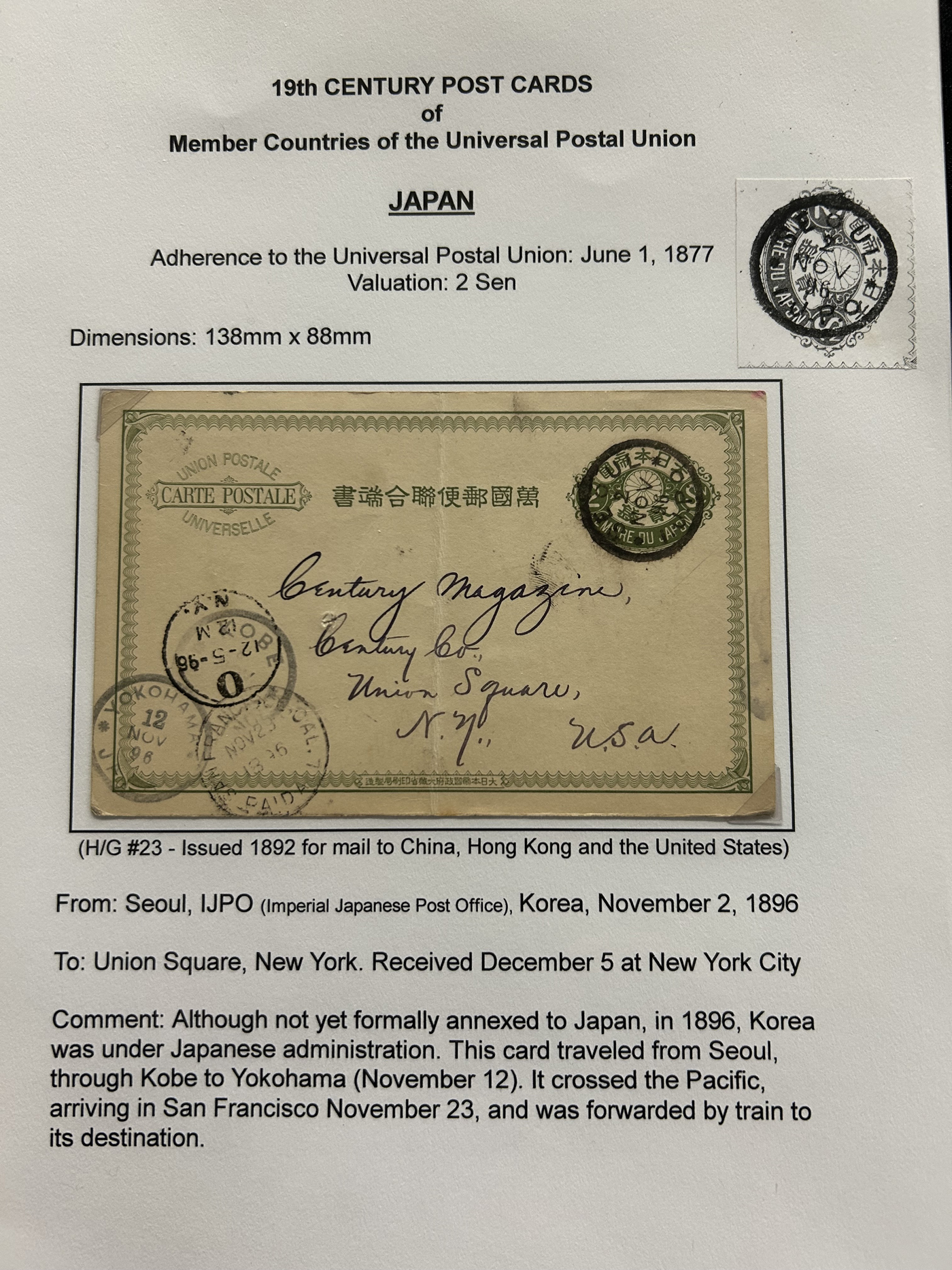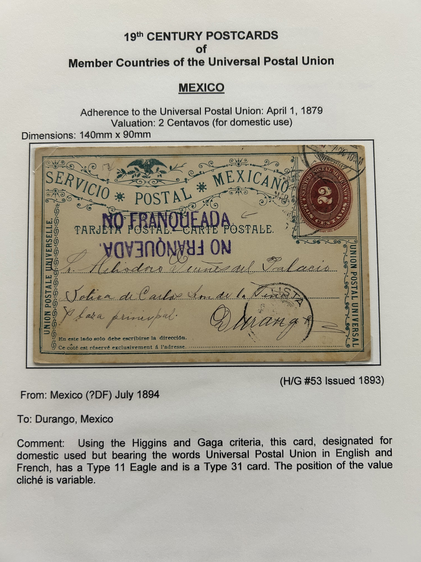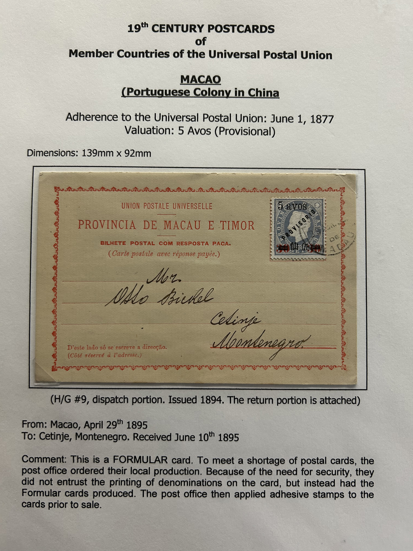 1359 PC   imageExtensive Collection of Used Worldwide U.P.U. Postal Stationery Cards to 1900, with 295 cards from about 115 different countries of the world (no France or Great Britain - offered elsewhere in this sale), all well researched and written-up on pages. Within each country, when there is duplication it is either of a different type, destination, etc. Except for a few rare exceptions, none of the cards were uprated, and all pay the proper rate for mailing to a foreign country. We note many difficult to obtain cards from countries one rarely encounters, and there is great postmark interest as well as different country destinations. An exceptional collection just waiting to be exhibited, and a rare opportunity to acquire such a variety of different cards. Overall very fine, our online photos only show a small representation. Should easily be worth our low estimate of $5 per card, as most were bought in the range of $10 to $50 and in some cases more. Also includes a useful photocopy of all the Higgins and Gage listings pertaining to pre-1900 U.P.U. cards in three volumes. (Scan 1) (Scan 2) (Scan 3) (Scan 4) (Scan 5) (Scan 6) (Scan 7) (Scan 8) (Scan 9) (Scan 10) (Scan 11) (Scan 12) (Scan 13) (Scan 14) (Scan 15) (Scan 16) (Scan 17) (Scan 18) (Scan 19) (Scan 20) (Scan 21) (Scan 22) (Scan 23) (Scan 24) (Scan 25) (Scan 26) (Scan 27) (Scan 28) (Scan 29) (Scan 30) (Scan 31) (Scan 32) (Scan 33) (Scan 34) (Scan 35) (Scan 36) (Scan 37) (Scan 38) (Scan 39) (Scan 40) (Scan 41) (Scan 42) (Scan 43) (Scan 44) (Scan 45) (Scan 46) (All Scans)