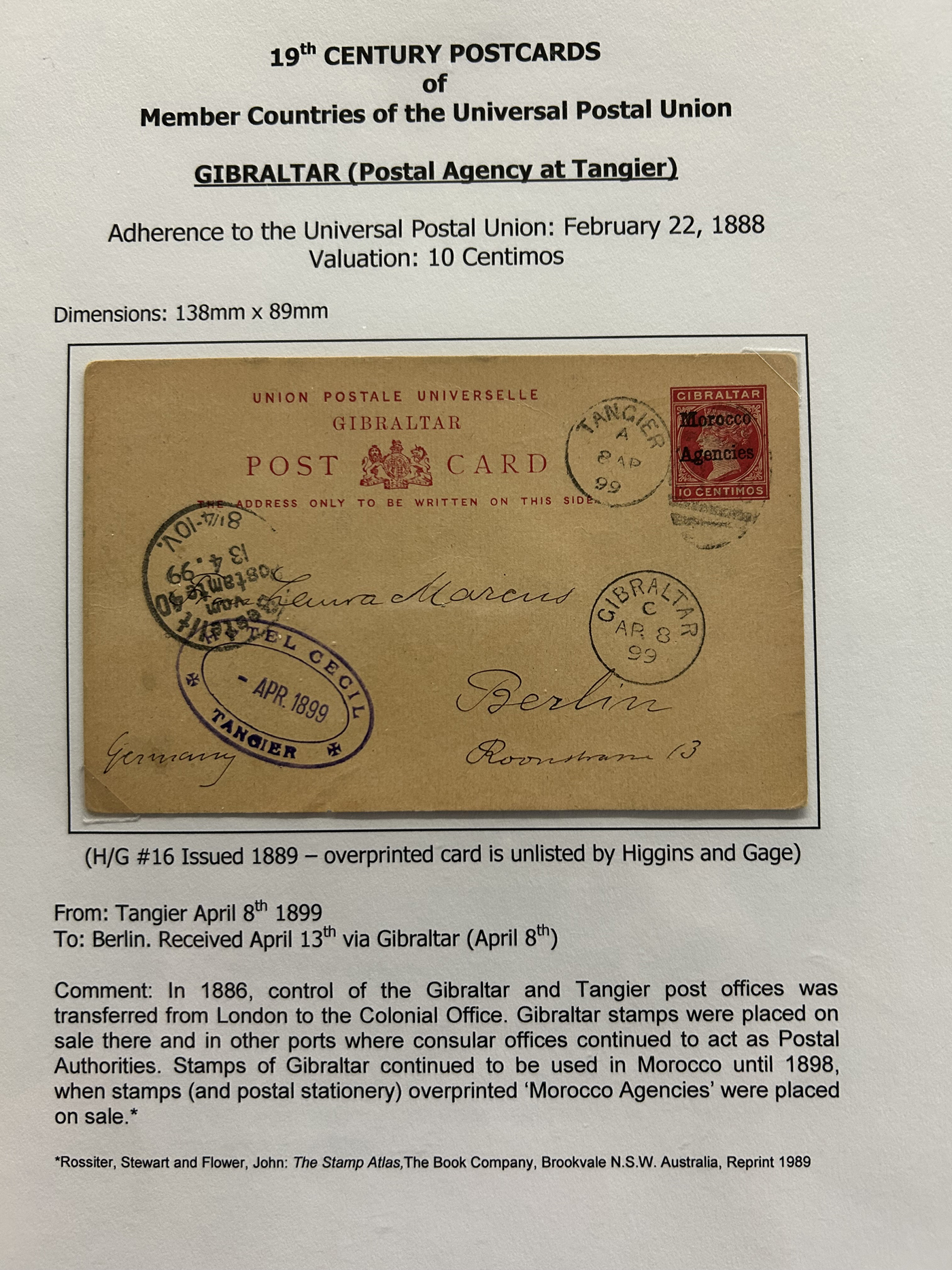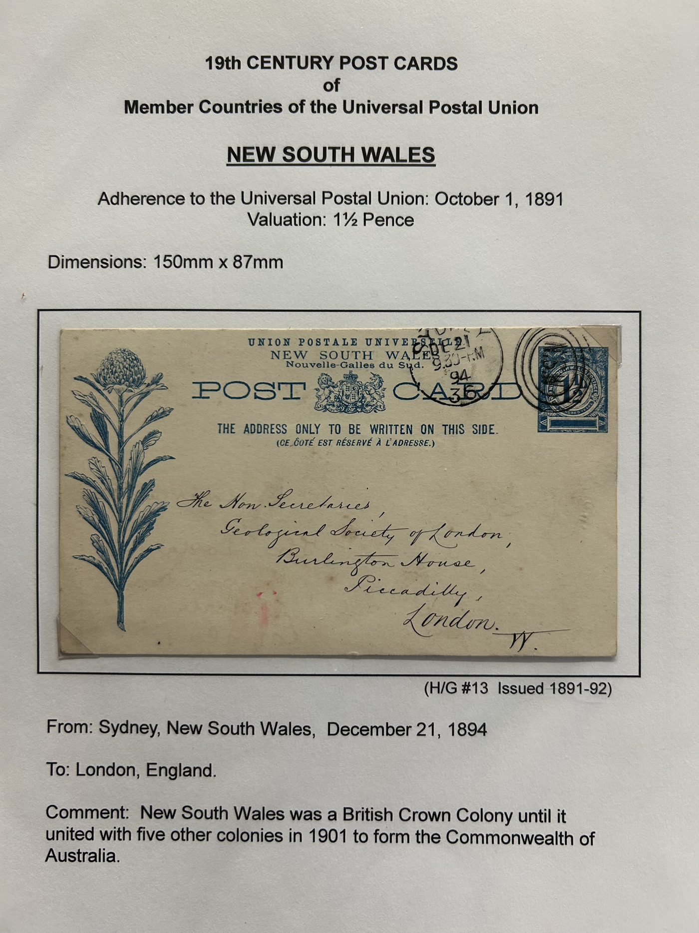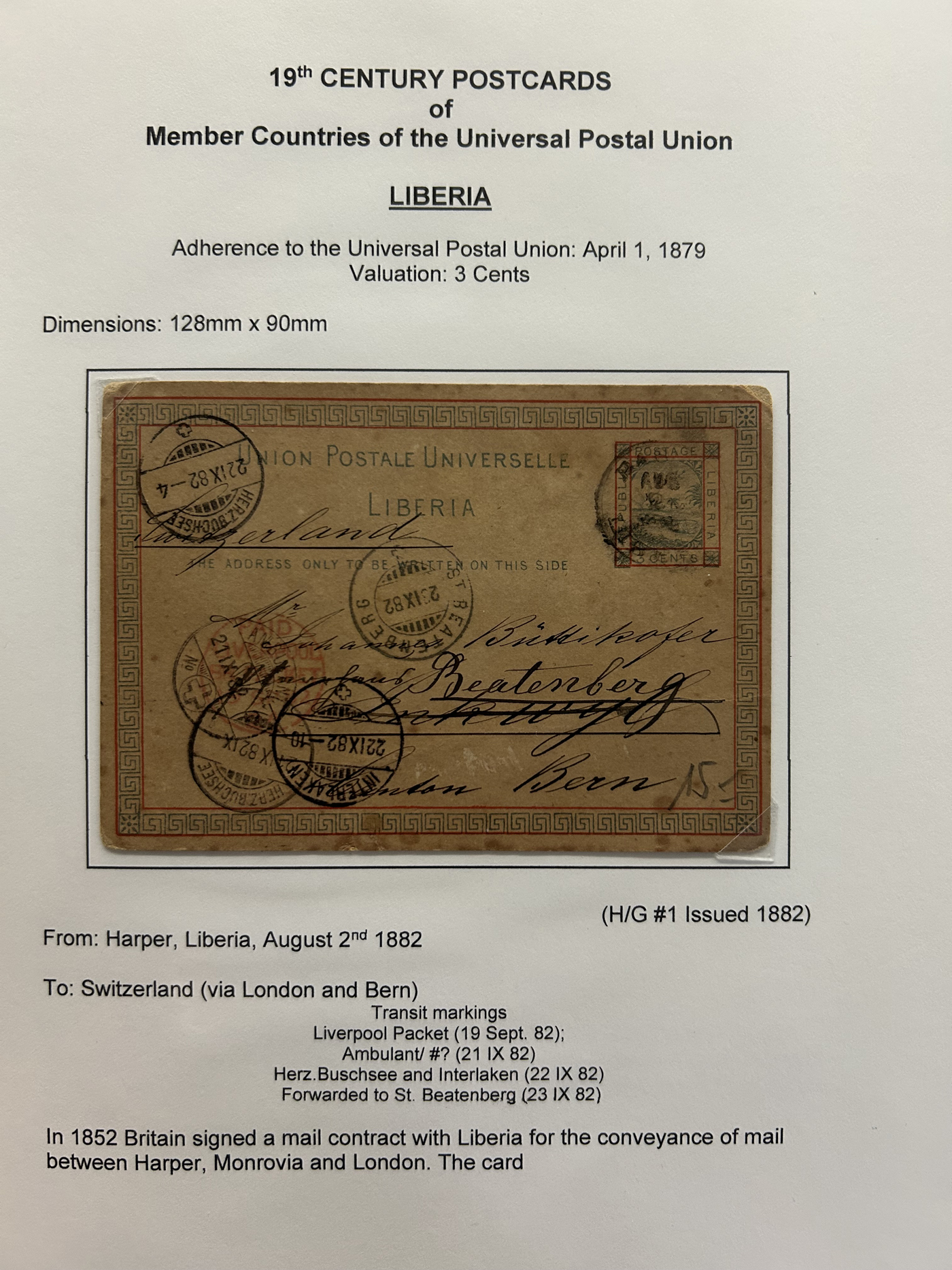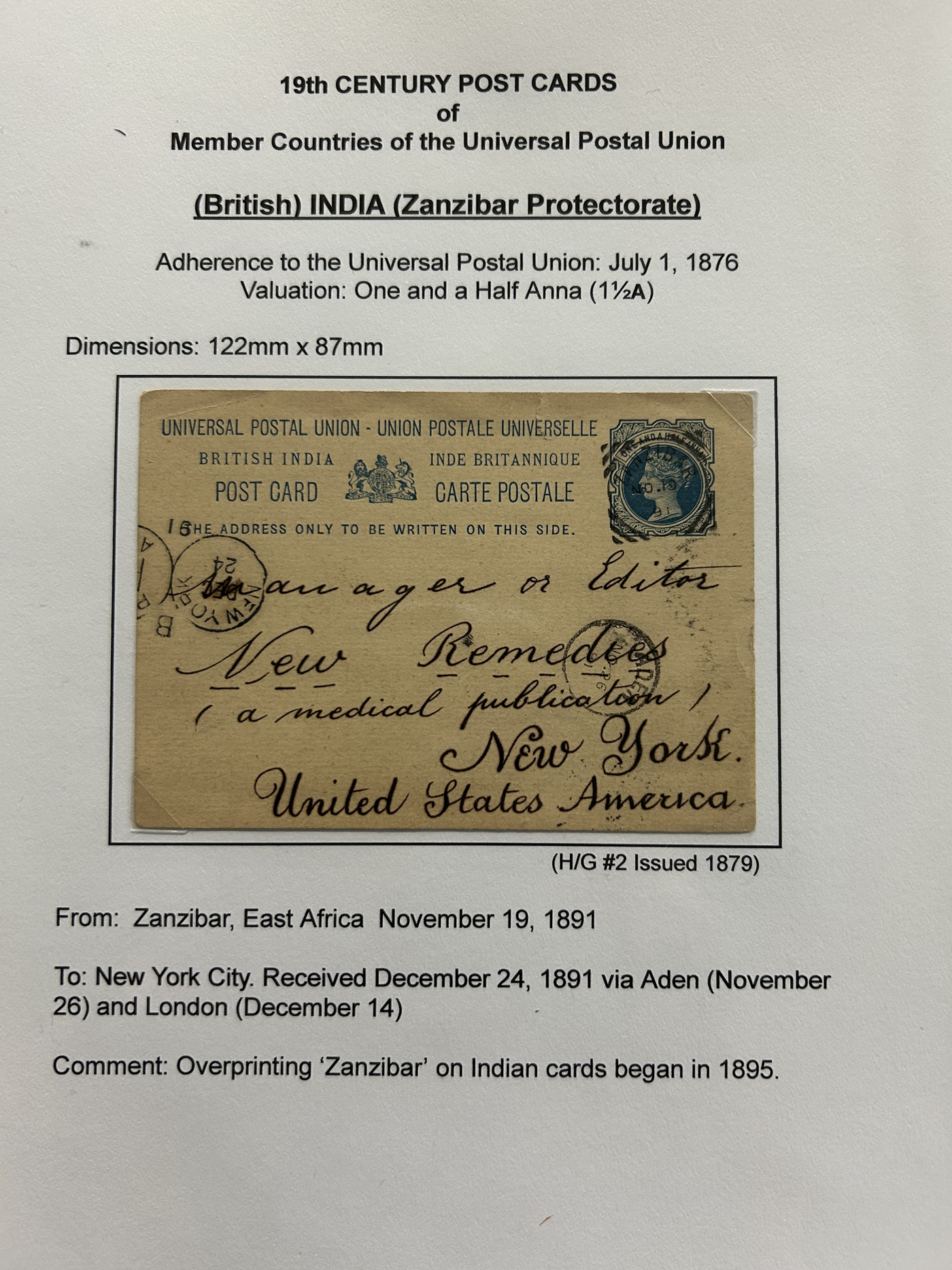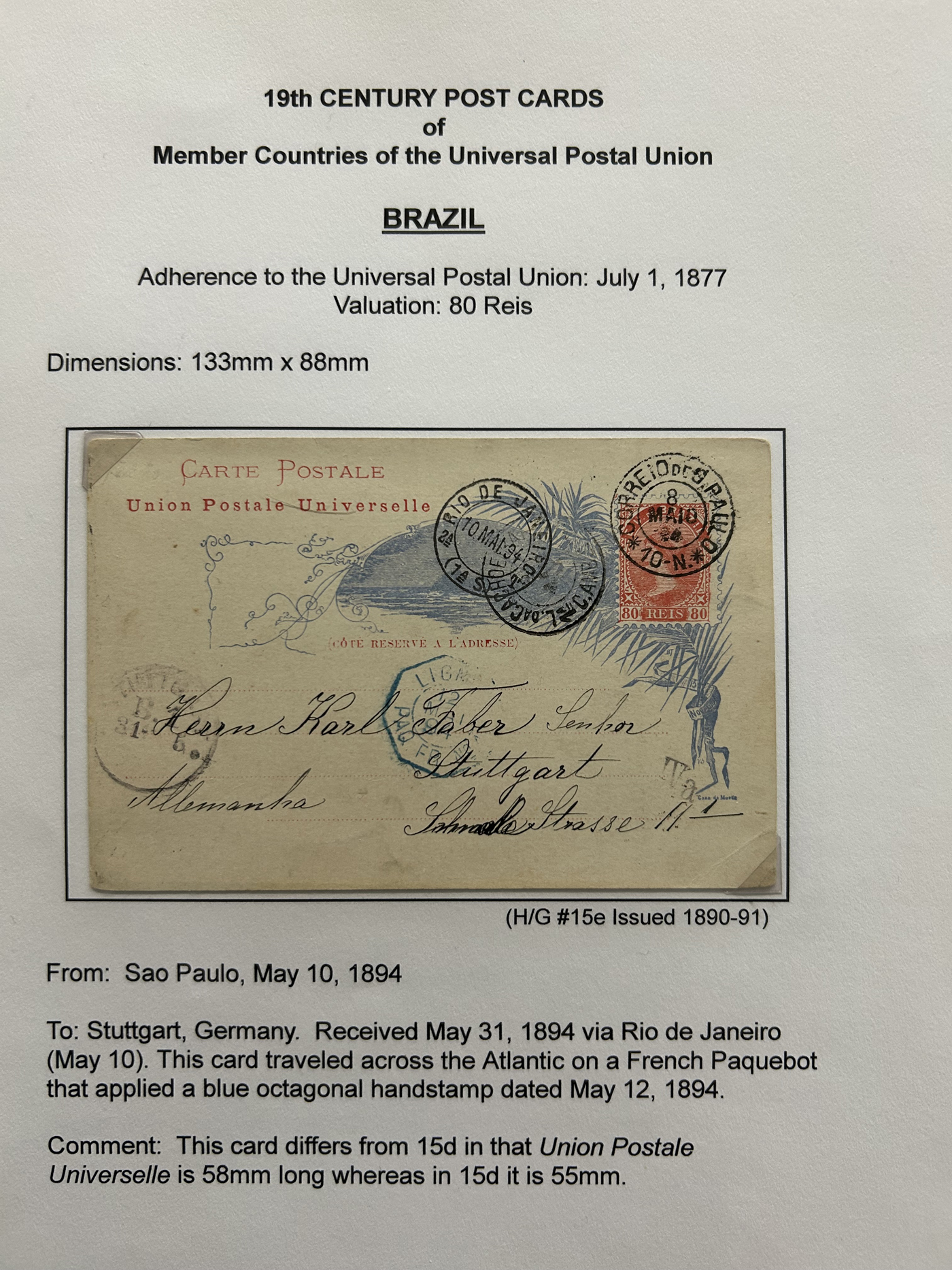 1359 PC   imageExtensive Collection of Used Worldwide U.P.U. Postal Stationery Cards to 1900, with 295 cards from about 115 different countries of the world (no France or Great Britain - offered elsewhere in this sale), all well researched and written-up on pages. Within each country, when there is duplication it is either of a different type, destination, etc. Except for a few rare exceptions, none of the cards were uprated, and all pay the proper rate for mailing to a foreign country. We note many difficult to obtain cards from countries one rarely encounters, and there is great postmark interest as well as different country destinations. An exceptional collection just waiting to be exhibited, and a rare opportunity to acquire such a variety of different cards. Overall very fine, our online photos only show a small representation. Should easily be worth our low estimate of $5 per card, as most were bought in the range of $10 to $50 and in some cases more. Also includes a useful photocopy of all the Higgins and Gage listings pertaining to pre-1900 U.P.U. cards in three volumes. (Scan 1) (Scan 2) (Scan 3) (Scan 4) (Scan 5) (Scan 6) (Scan 7) (Scan 8) (Scan 9) (Scan 10) (Scan 11) (Scan 12) (Scan 13) (Scan 14) (Scan 15) (Scan 16) (Scan 17) (Scan 18) (Scan 19) (Scan 20) (Scan 21) (Scan 22) (Scan 23) (Scan 24) (Scan 25) (Scan 26) (Scan 27) (Scan 28) (Scan 29) (Scan 30) (Scan 31) (Scan 32) (Scan 33) (Scan 34) (Scan 35) (Scan 36) (Scan 37) (Scan 38) (Scan 39) (Scan 40) (Scan 41) (Scan 42) (Scan 43) (Scan 44) (Scan 45) (Scan 46) (All Scans)