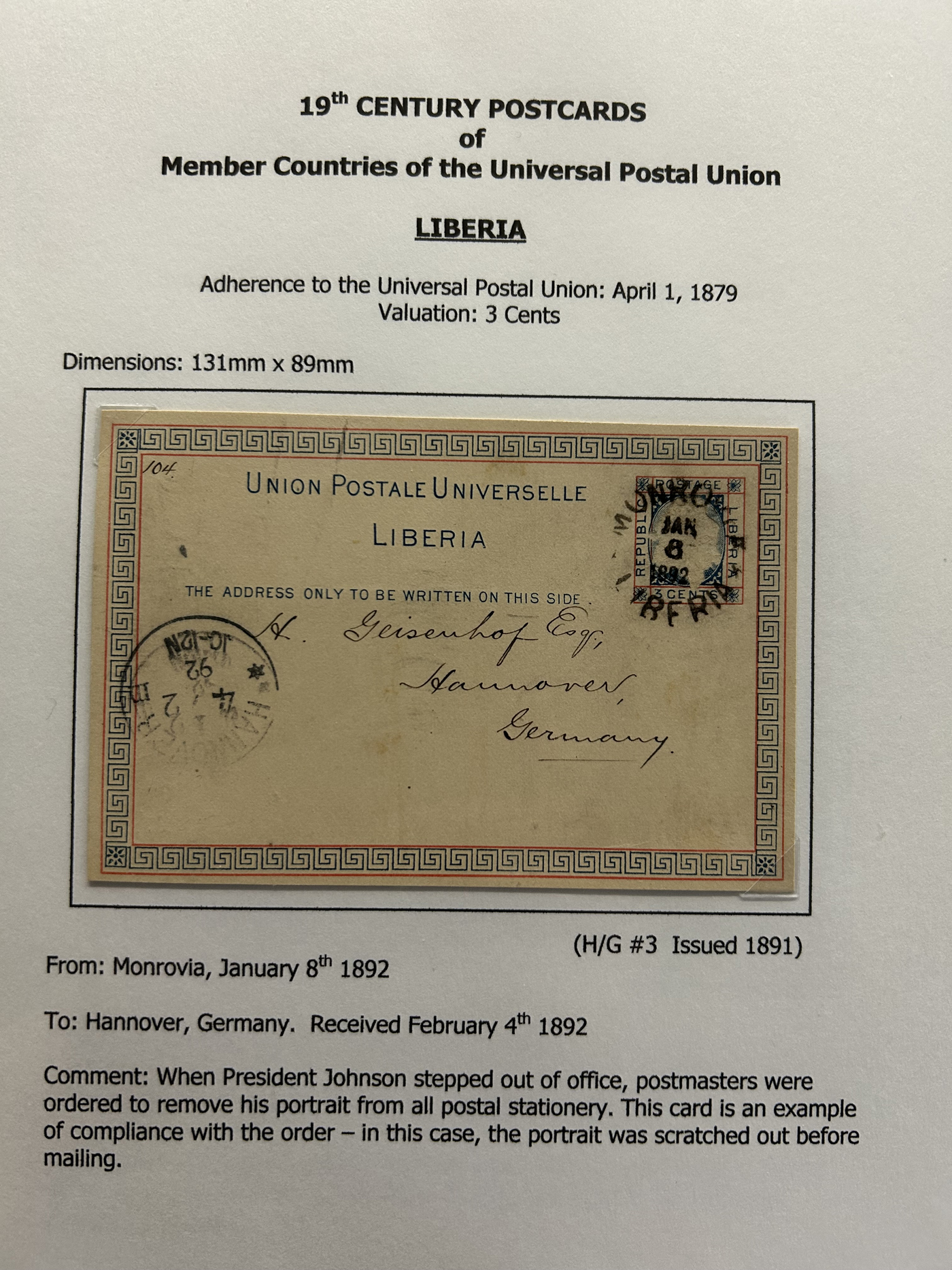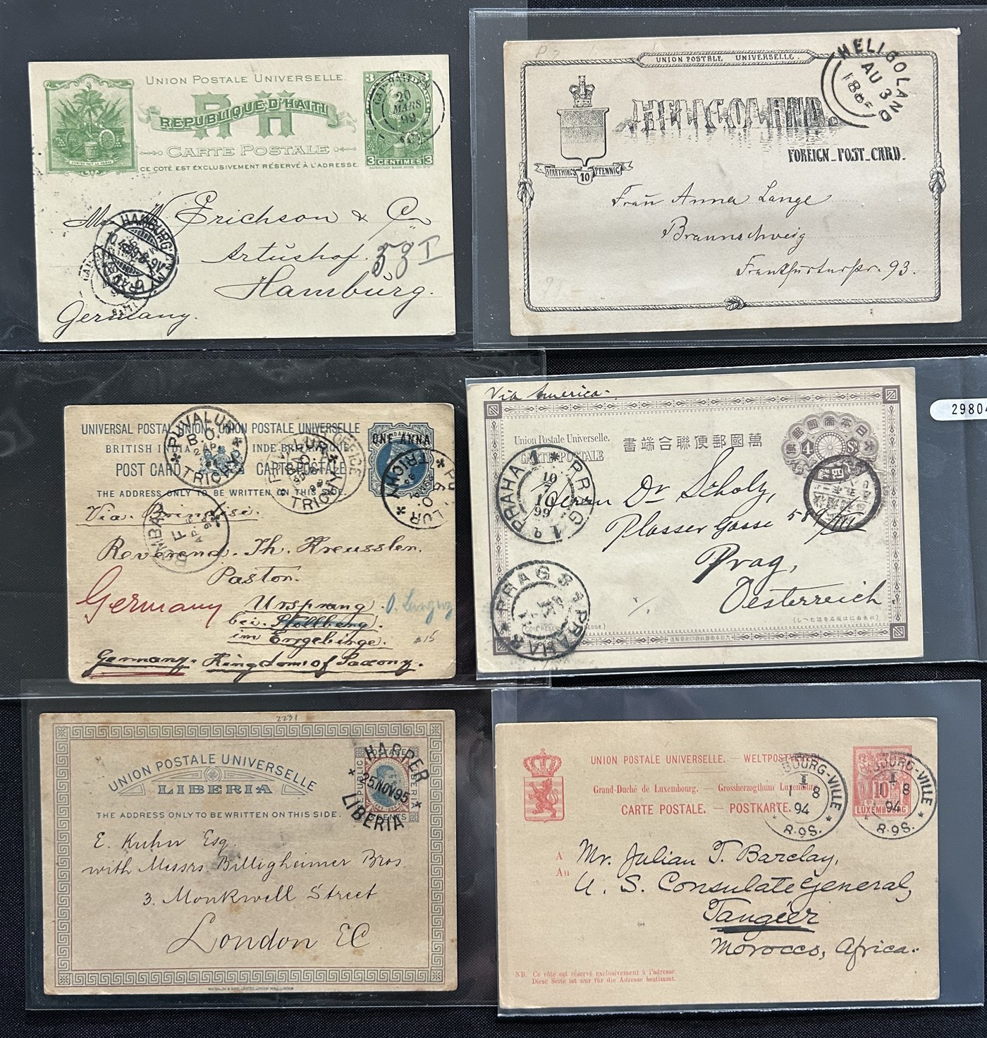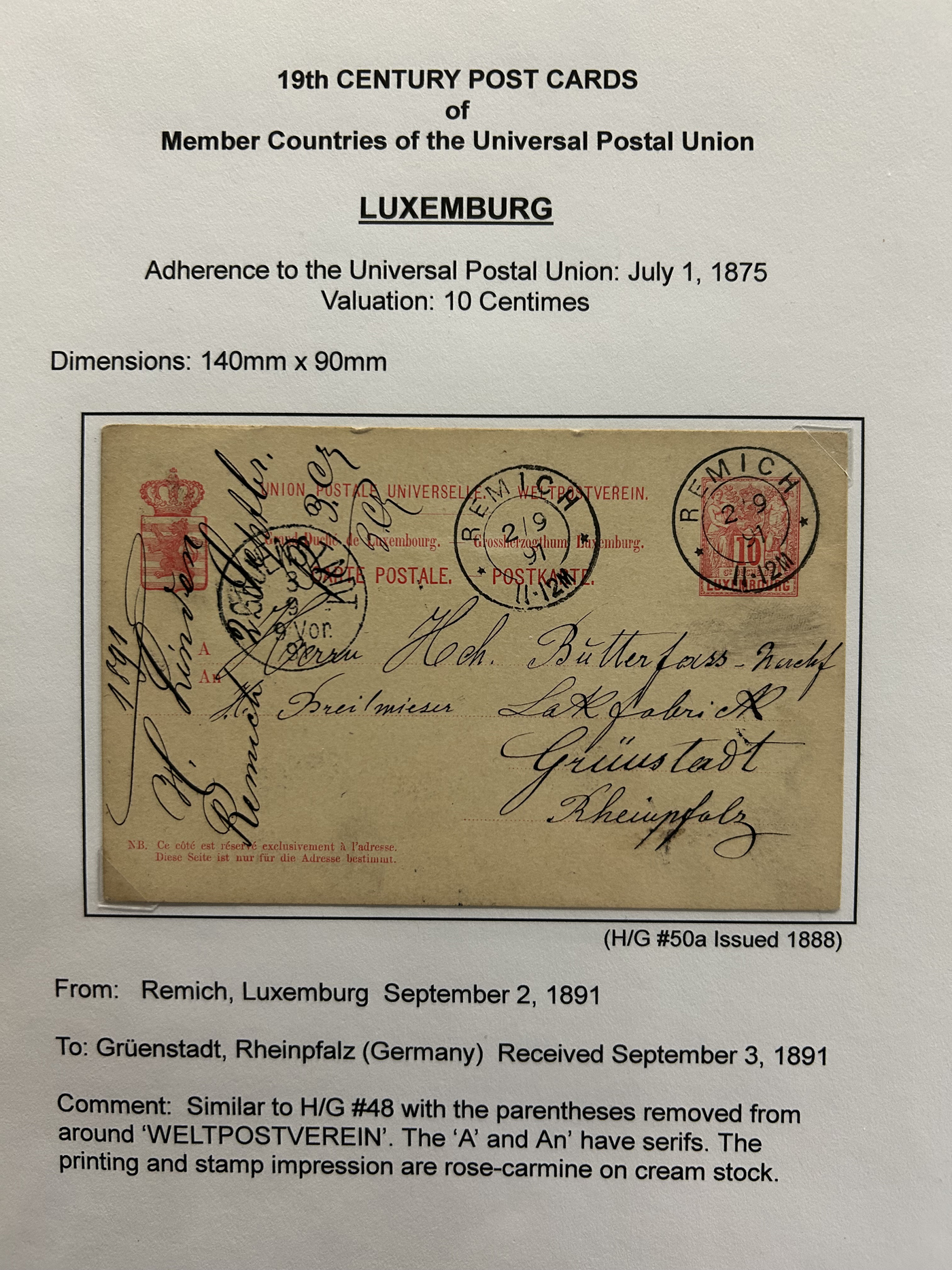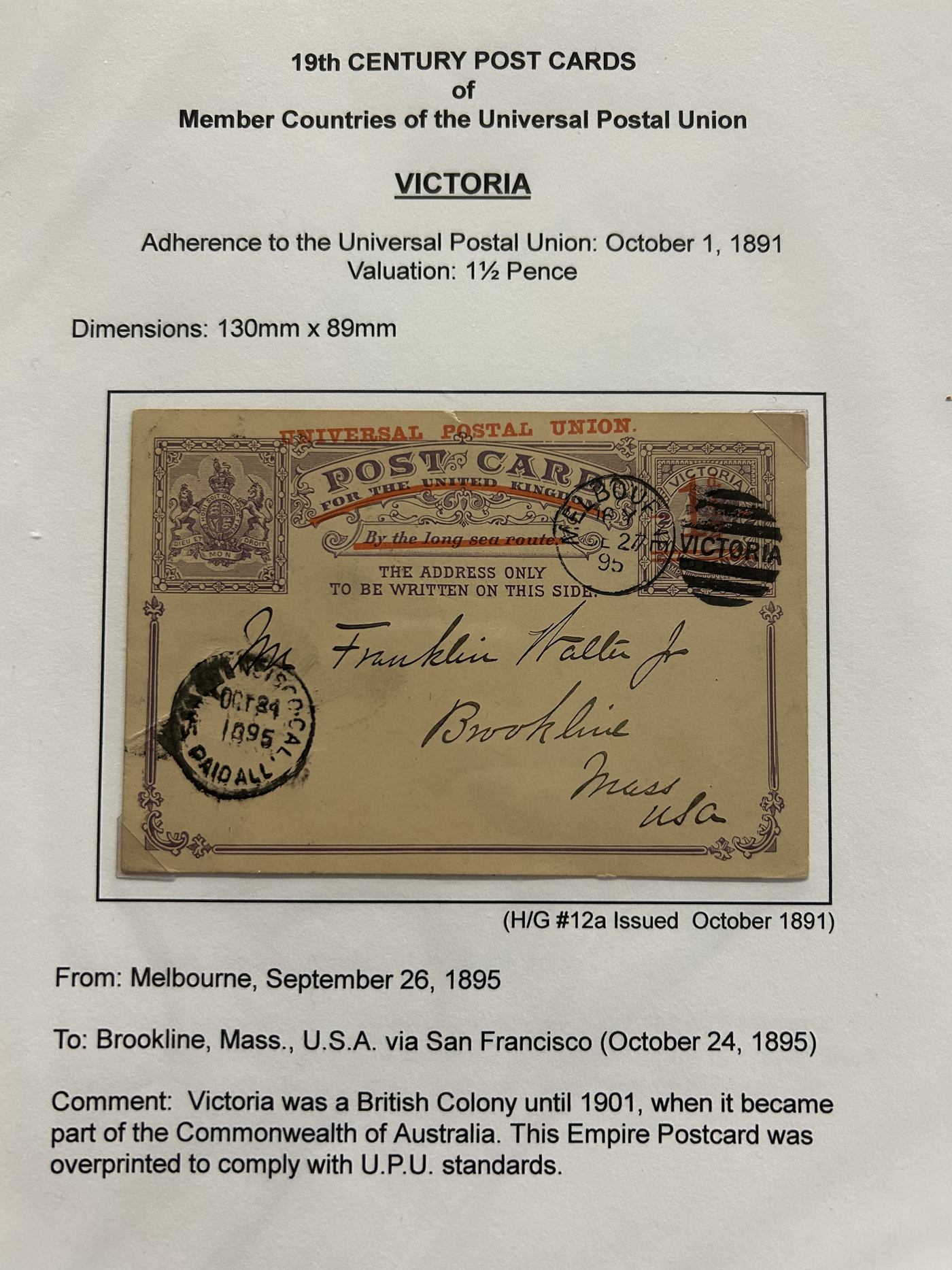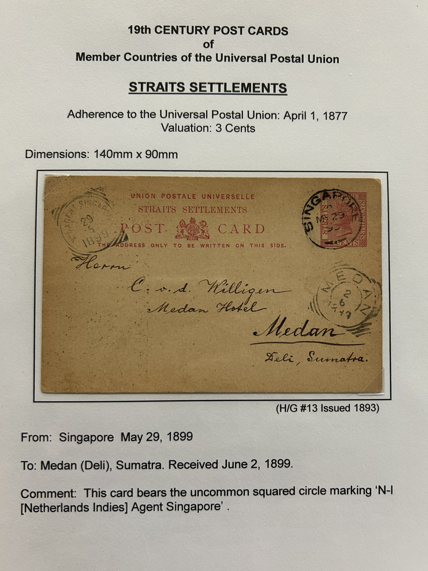 1359 PC   imageExtensive Collection of Used Worldwide U.P.U. Postal Stationery Cards to 1900, with 295 cards from about 115 different countries of the world (no France or Great Britain - offered elsewhere in this sale), all well researched and written-up on pages. Within each country, when there is duplication it is either of a different type, destination, etc. Except for a few rare exceptions, none of the cards were uprated, and all pay the proper rate for mailing to a foreign country. We note many difficult to obtain cards from countries one rarely encounters, and there is great postmark interest as well as different country destinations. An exceptional collection just waiting to be exhibited, and a rare opportunity to acquire such a variety of different cards. Overall very fine, our online photos only show a small representation. Should easily be worth our low estimate of $5 per card, as most were bought in the range of $10 to $50 and in some cases more. Also includes a useful photocopy of all the Higgins and Gage listings pertaining to pre-1900 U.P.U. cards in three volumes. (Scan 1) (Scan 2) (Scan 3) (Scan 4) (Scan 5) (Scan 6) (Scan 7) (Scan 8) (Scan 9) (Scan 10) (Scan 11) (Scan 12) (Scan 13) (Scan 14) (Scan 15) (Scan 16) (Scan 17) (Scan 18) (Scan 19) (Scan 20) (Scan 21) (Scan 22) (Scan 23) (Scan 24) (Scan 25) (Scan 26) (Scan 27) (Scan 28) (Scan 29) (Scan 30) (Scan 31) (Scan 32) (Scan 33) (Scan 34) (Scan 35) (Scan 36) (Scan 37) (Scan 38) (Scan 39) (Scan 40) (Scan 41) (Scan 42) (Scan 43) (Scan 44) (Scan 45) (Scan 46) (All Scans)