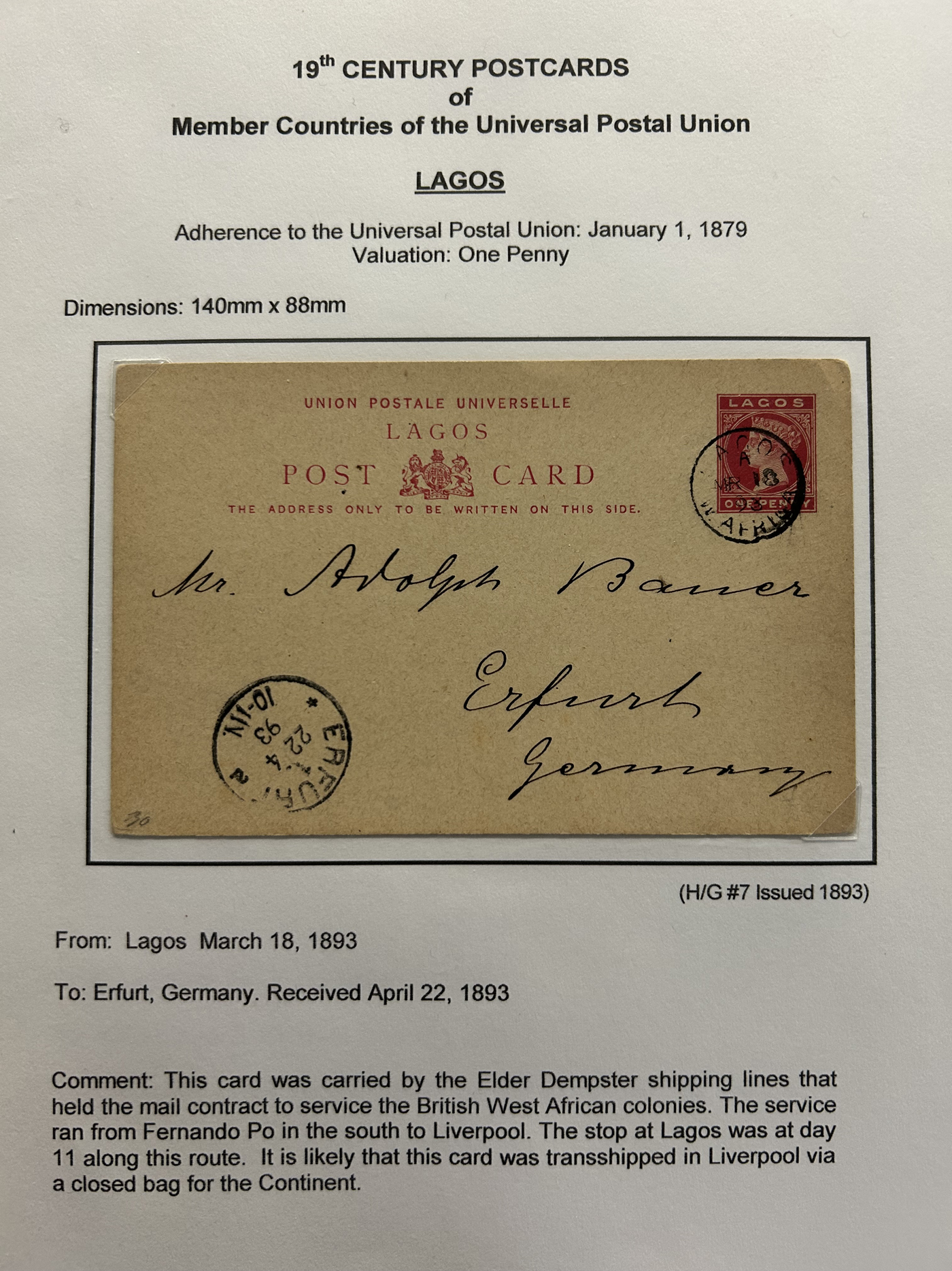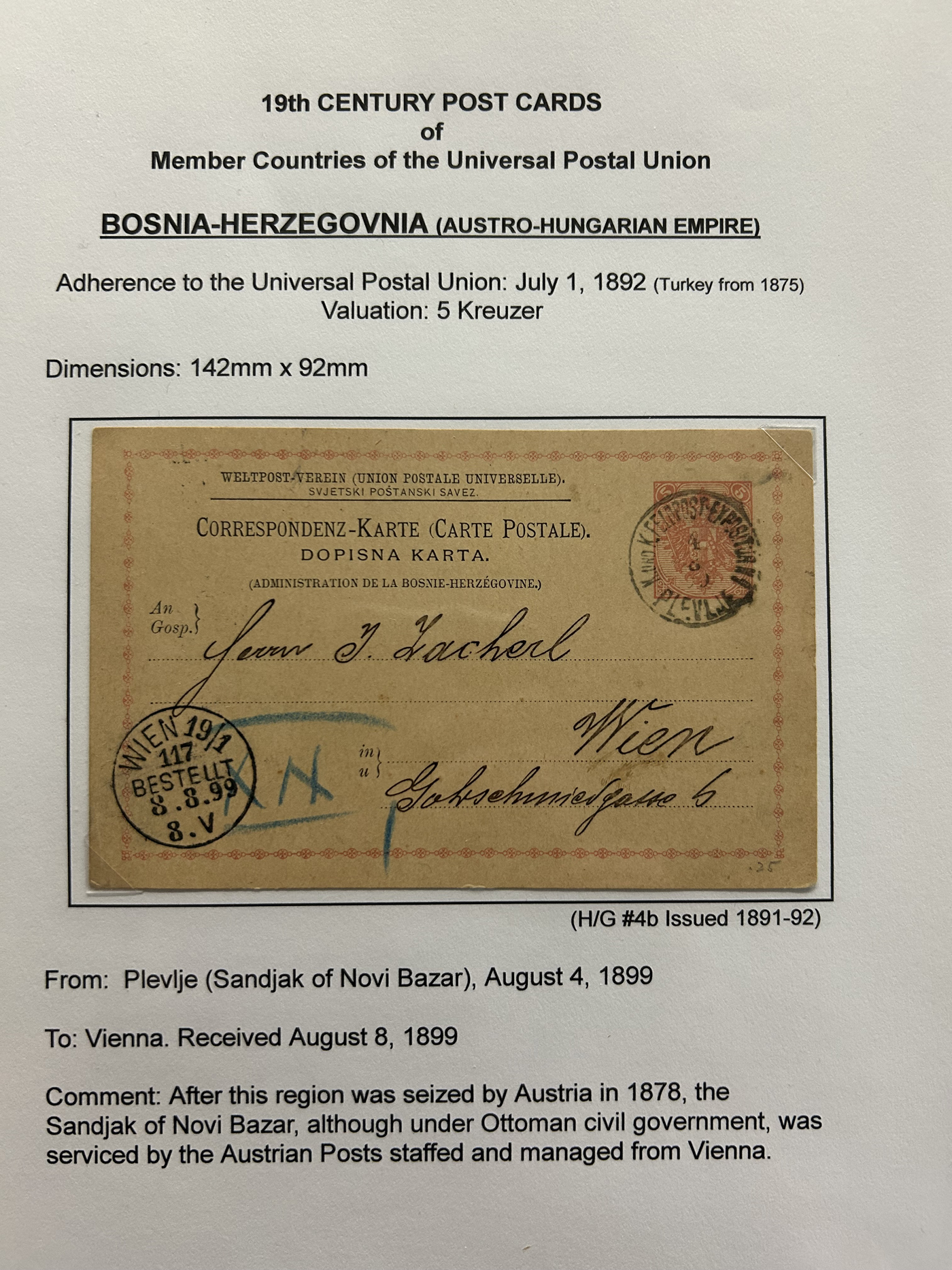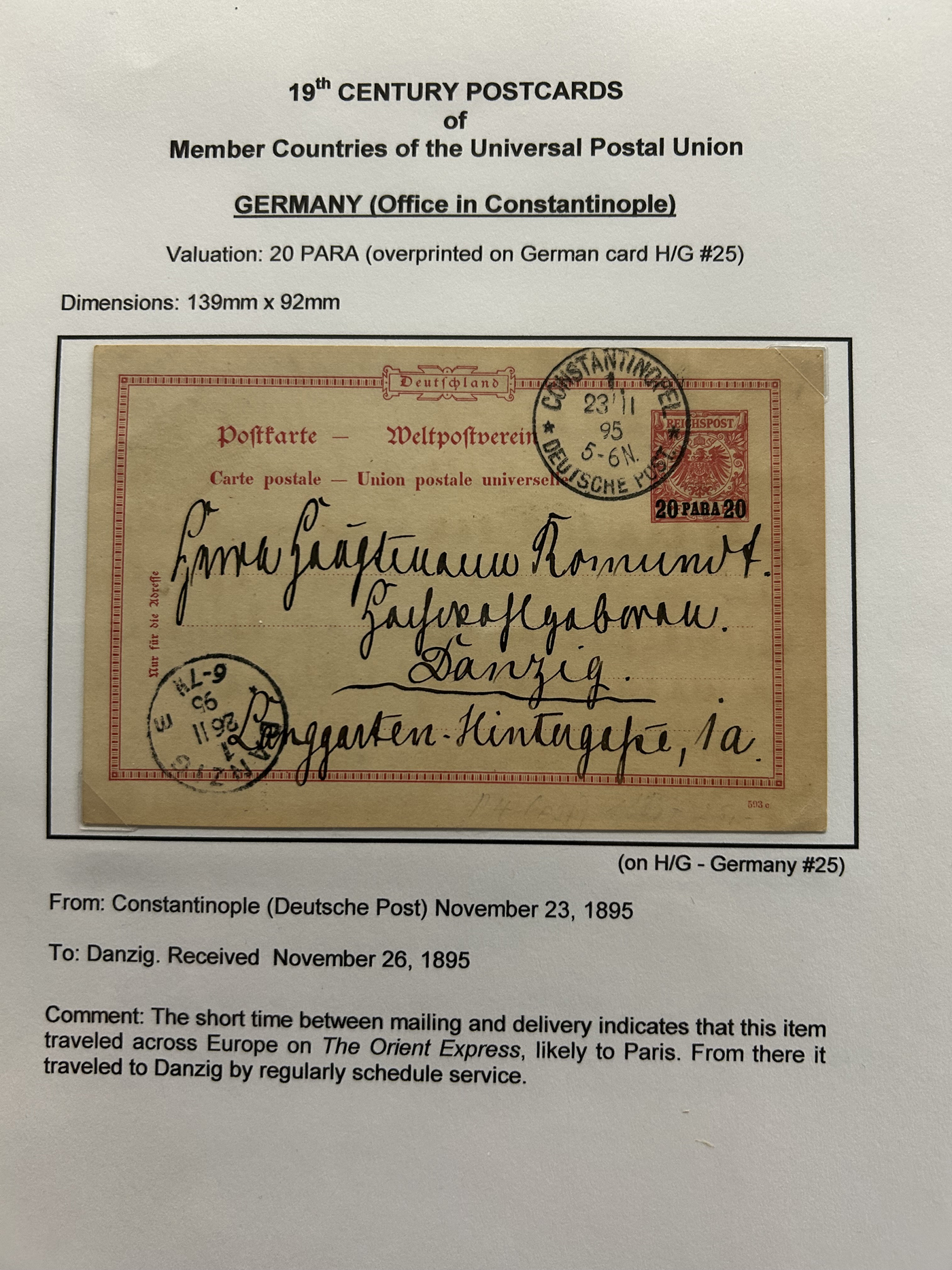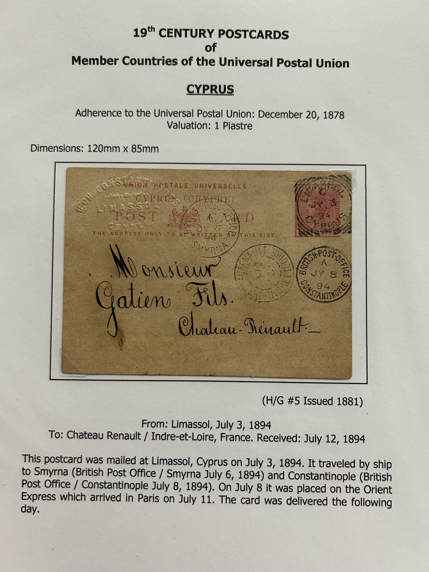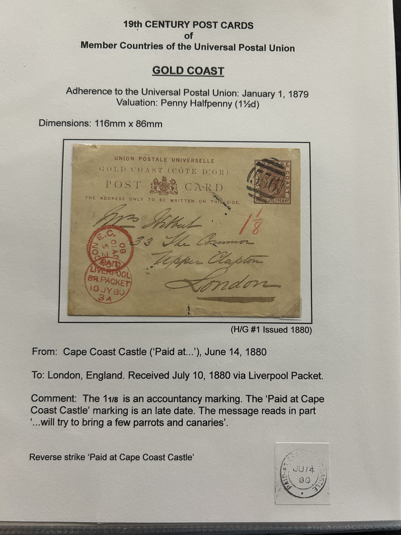 1359 PC   imageExtensive Collection of Used Worldwide U.P.U. Postal Stationery Cards to 1900, with 295 cards from about 115 different countries of the world (no France or Great Britain - offered elsewhere in this sale), all well researched and written-up on pages. Within each country, when there is duplication it is either of a different type, destination, etc. Except for a few rare exceptions, none of the cards were uprated, and all pay the proper rate for mailing to a foreign country. We note many difficult to obtain cards from countries one rarely encounters, and there is great postmark interest as well as different country destinations. An exceptional collection just waiting to be exhibited, and a rare opportunity to acquire such a variety of different cards. Overall very fine, our online photos only show a small representation. Should easily be worth our low estimate of $5 per card, as most were bought in the range of $10 to $50 and in some cases more. Also includes a useful photocopy of all the Higgins and Gage listings pertaining to pre-1900 U.P.U. cards in three volumes. (Scan 1) (Scan 2) (Scan 3) (Scan 4) (Scan 5) (Scan 6) (Scan 7) (Scan 8) (Scan 9) (Scan 10) (Scan 11) (Scan 12) (Scan 13) (Scan 14) (Scan 15) (Scan 16) (Scan 17) (Scan 18) (Scan 19) (Scan 20) (Scan 21) (Scan 22) (Scan 23) (Scan 24) (Scan 25) (Scan 26) (Scan 27) (Scan 28) (Scan 29) (Scan 30) (Scan 31) (Scan 32) (Scan 33) (Scan 34) (Scan 35) (Scan 36) (Scan 37) (Scan 38) (Scan 39) (Scan 40) (Scan 41) (Scan 42) (Scan 43) (Scan 44) (Scan 45) (Scan 46) (All Scans)