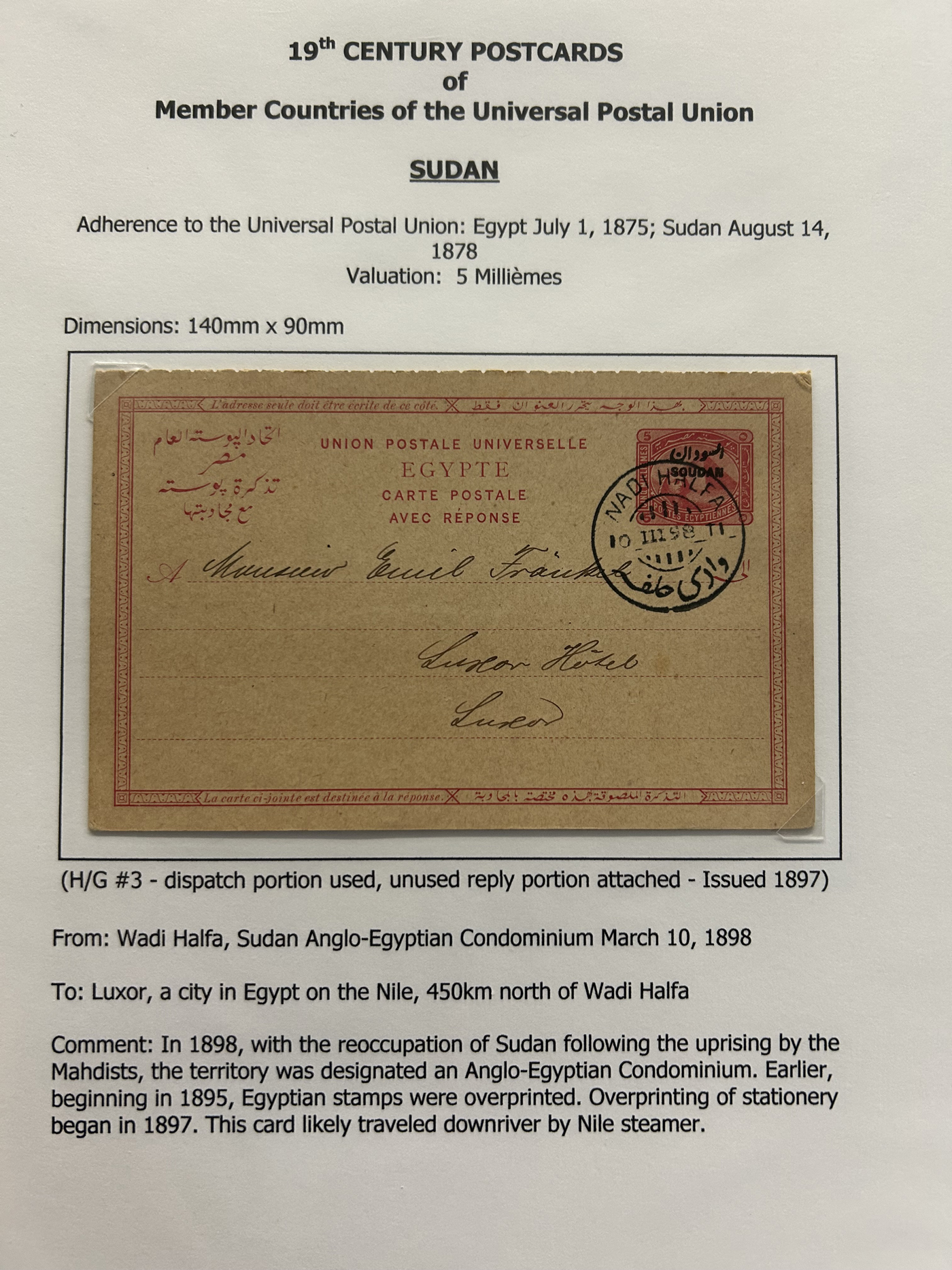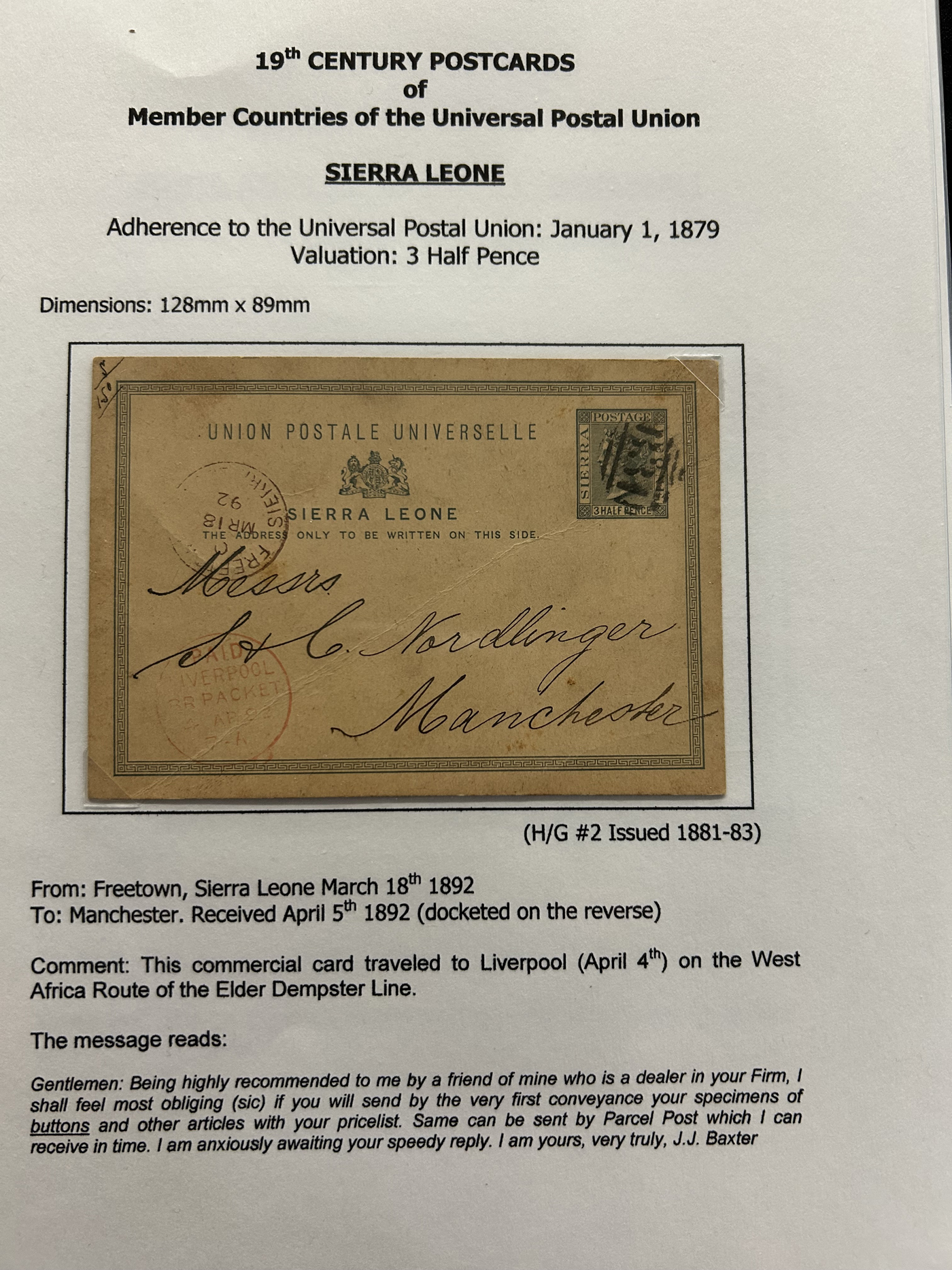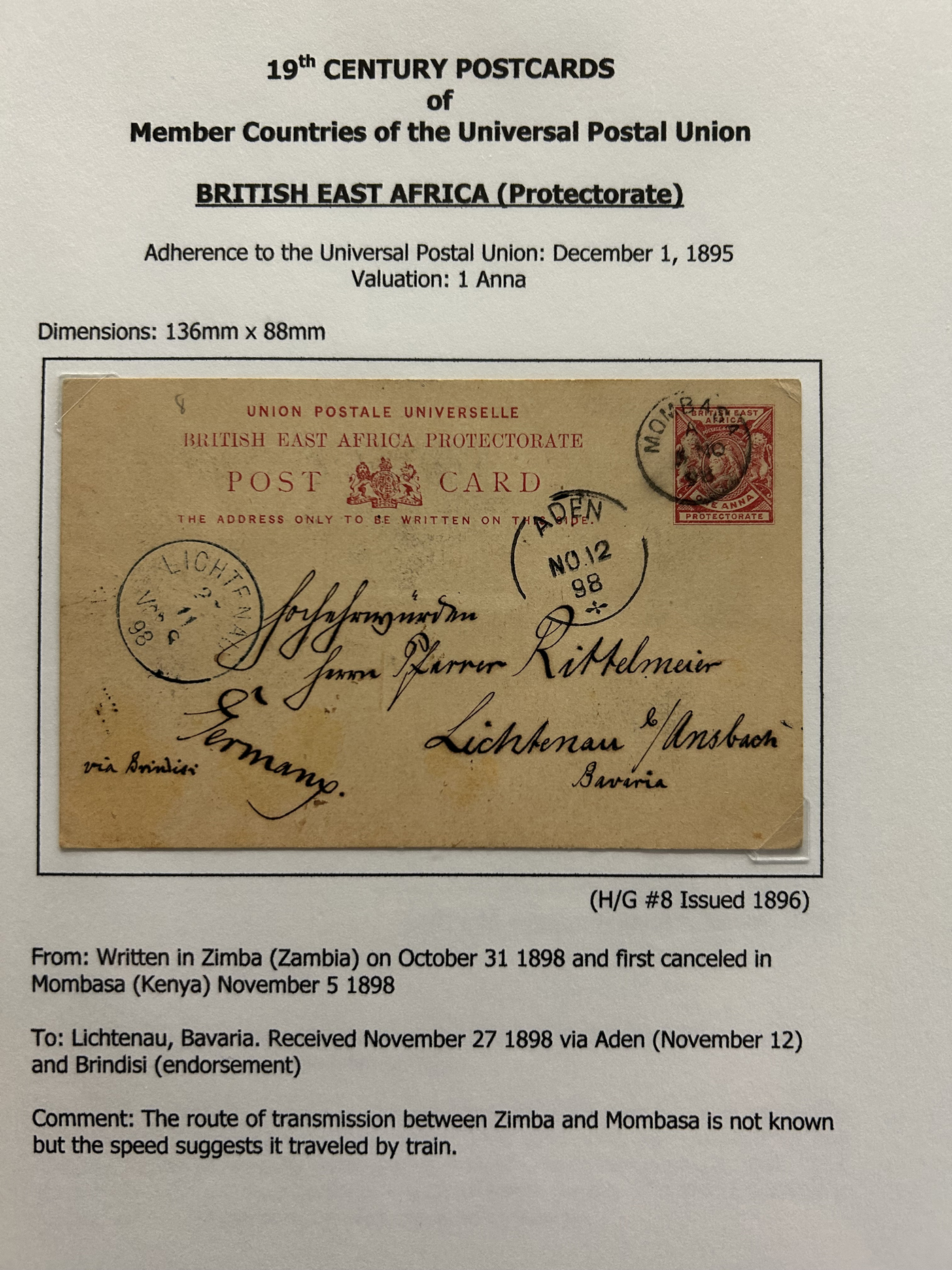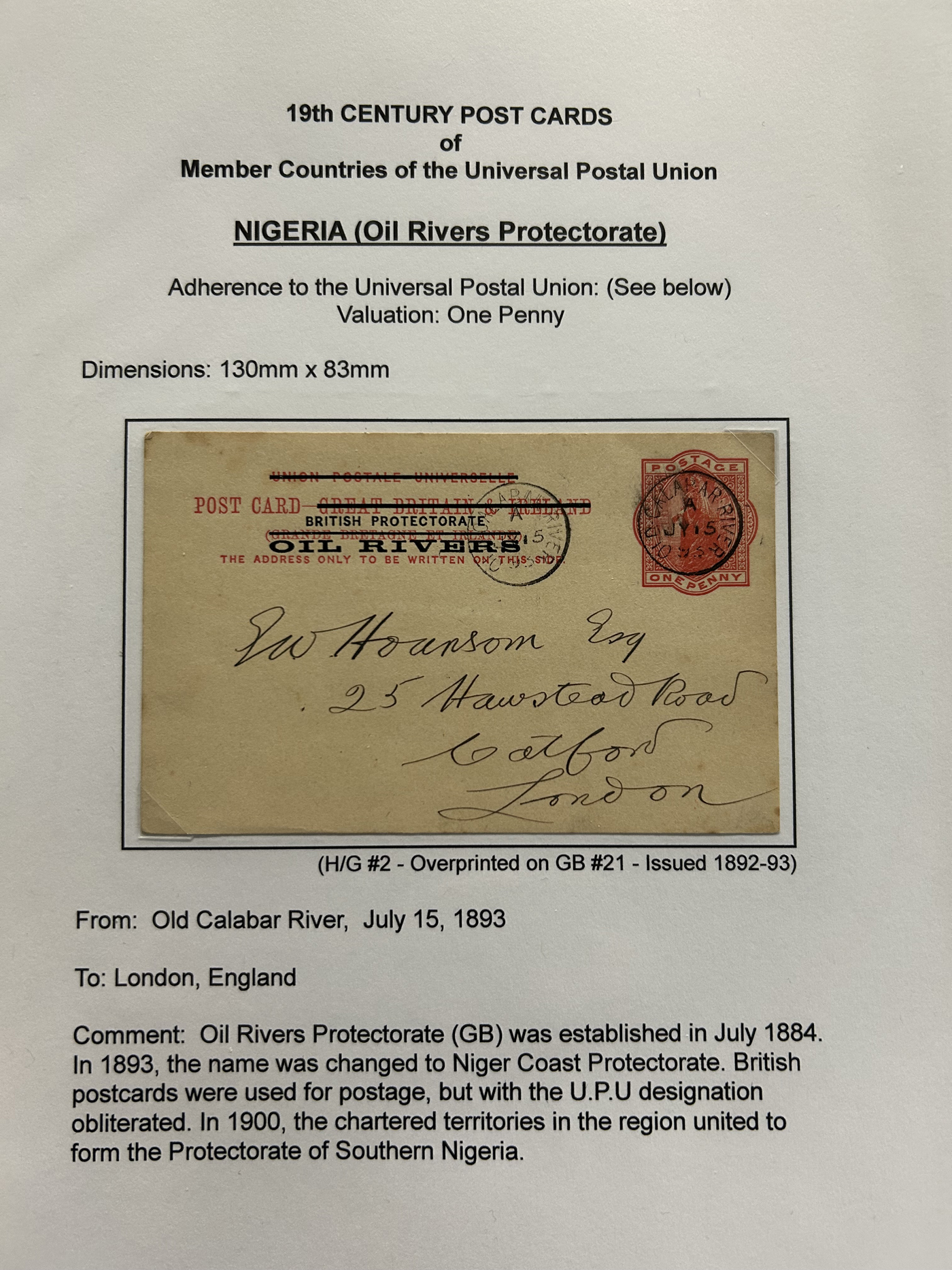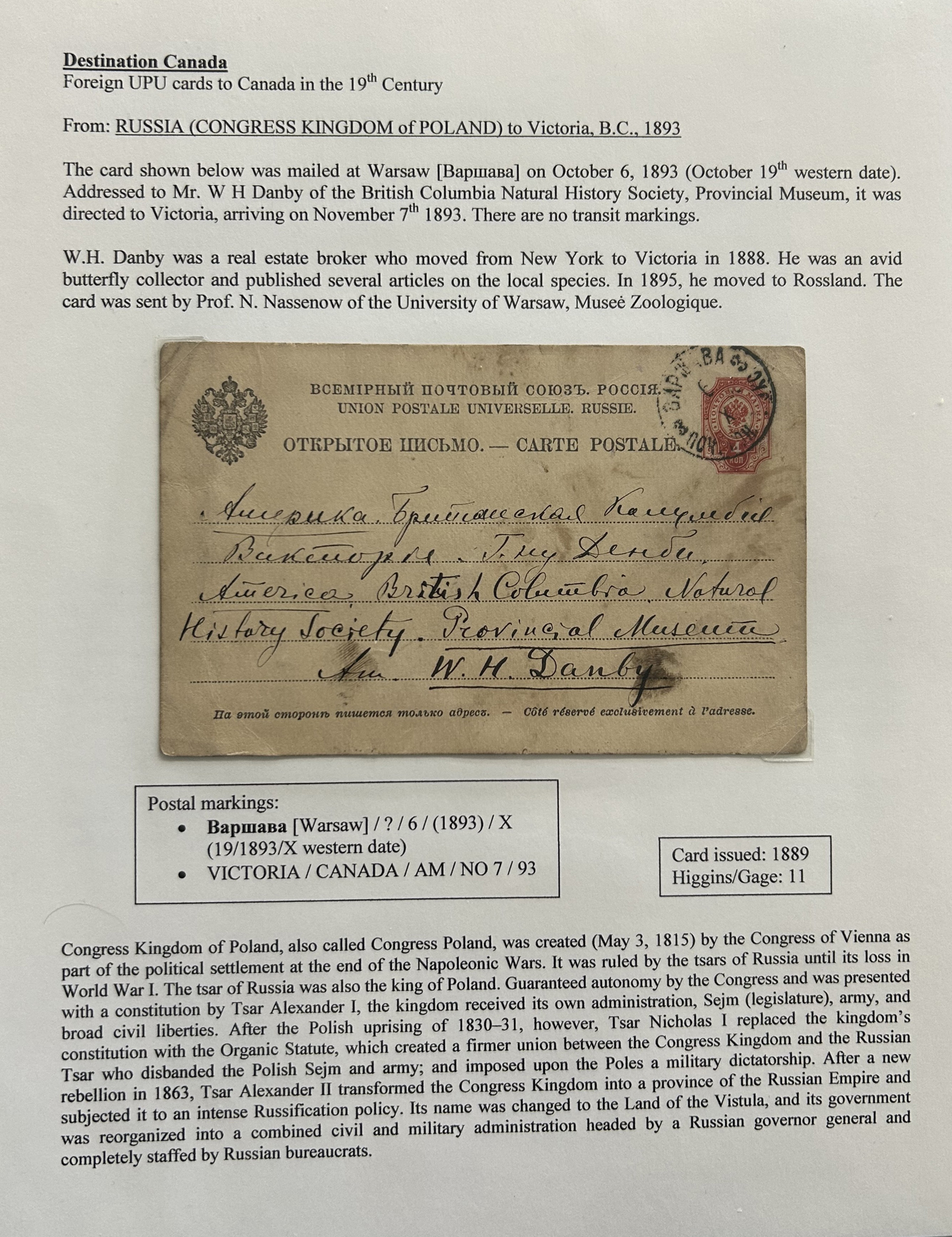 1359 PC   imageExtensive Collection of Used Worldwide U.P.U. Postal Stationery Cards to 1900, with 295 cards from about 115 different countries of the world (no France or Great Britain - offered elsewhere in this sale), all well researched and written-up on pages. Within each country, when there is duplication it is either of a different type, destination, etc. Except for a few rare exceptions, none of the cards were uprated, and all pay the proper rate for mailing to a foreign country. We note many difficult to obtain cards from countries one rarely encounters, and there is great postmark interest as well as different country destinations. An exceptional collection just waiting to be exhibited, and a rare opportunity to acquire such a variety of different cards. Overall very fine, our online photos only show a small representation. Should easily be worth our low estimate of $5 per card, as most were bought in the range of $10 to $50 and in some cases more. Also includes a useful photocopy of all the Higgins and Gage listings pertaining to pre-1900 U.P.U. cards in three volumes. (Scan 1) (Scan 2) (Scan 3) (Scan 4) (Scan 5) (Scan 6) (Scan 7) (Scan 8) (Scan 9) (Scan 10) (Scan 11) (Scan 12) (Scan 13) (Scan 14) (Scan 15) (Scan 16) (Scan 17) (Scan 18) (Scan 19) (Scan 20) (Scan 21) (Scan 22) (Scan 23) (Scan 24) (Scan 25) (Scan 26) (Scan 27) (Scan 28) (Scan 29) (Scan 30) (Scan 31) (Scan 32) (Scan 33) (Scan 34) (Scan 35) (Scan 36) (Scan 37) (Scan 38) (Scan 39) (Scan 40) (Scan 41) (Scan 42) (Scan 43) (Scan 44) (Scan 45) (Scan 46) (All Scans)