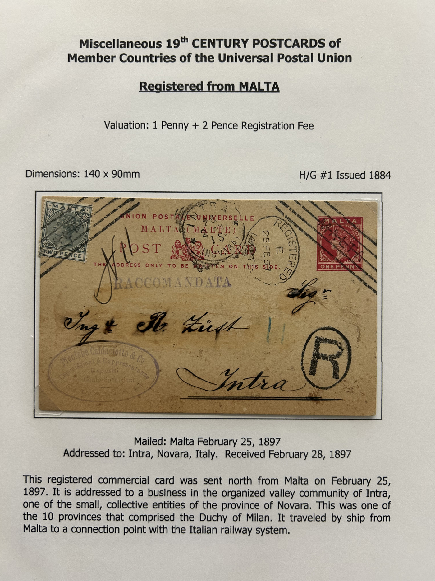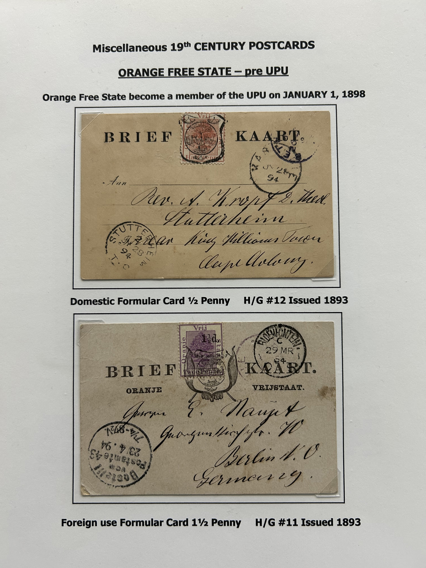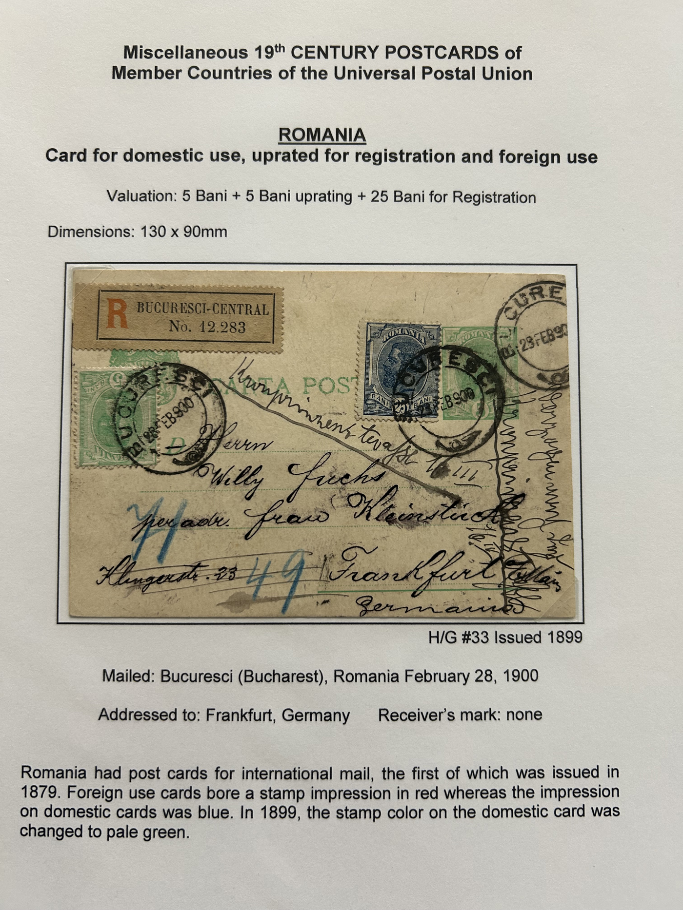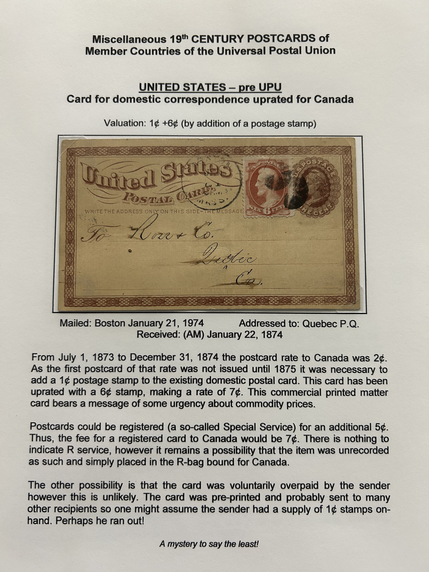 1357 PC   imageCollection of Used Worldwide U.P.U. (and pre-U.P.U.) Postal Stationery Cards, Including Registered, 1871 to 1900, with 32 cards, 27 of which are well researched and written-up on pages. We note cards from Austria (1872 to Silesia), Belgium (1872 and 1873, both domestic), Belgium (1878 uprated to France), Belgium (1889 and 1895 uprated to GB), Canada (1873 and 1874 uprated to United States), Germany (5x "Century" cards mailed to various places), Great Britain (1886 uprated to Panama), Italy (1875 uprated to GB and 1877 uprated to Belgium), Mexico (1894 domestic) Orange Free State (two foreign use formulars to Germany), Romania (1896 uprated to Austria), United States (1874 uprated with a 6c Lincoln (registered?!) to Canada), United States (1874 uprated to Canada), Italy (1899 uprated registered to Portugal), Malta (1897 uprated registered to Italy), Austria (1885 uprated "Express" Bohemia card to Vienna), Wurttemberg (1895 uprated registered to Italy), Romania (1900 uprated registered to Germany) and a few more. Overall very fine, see photos for a good sampling. (Scan 1) (Scan 2) (Scan 3) (Scan 4) (Scan 5) (Scan 6) (Scan 7) (Scan 8) (Scan 9) (Scan 10) (Scan 11) (Scan 12) (Scan 13) (Scan 14) (Scan 15) (Scan 16) (Scan 17) (Scan 18) (All Scans)