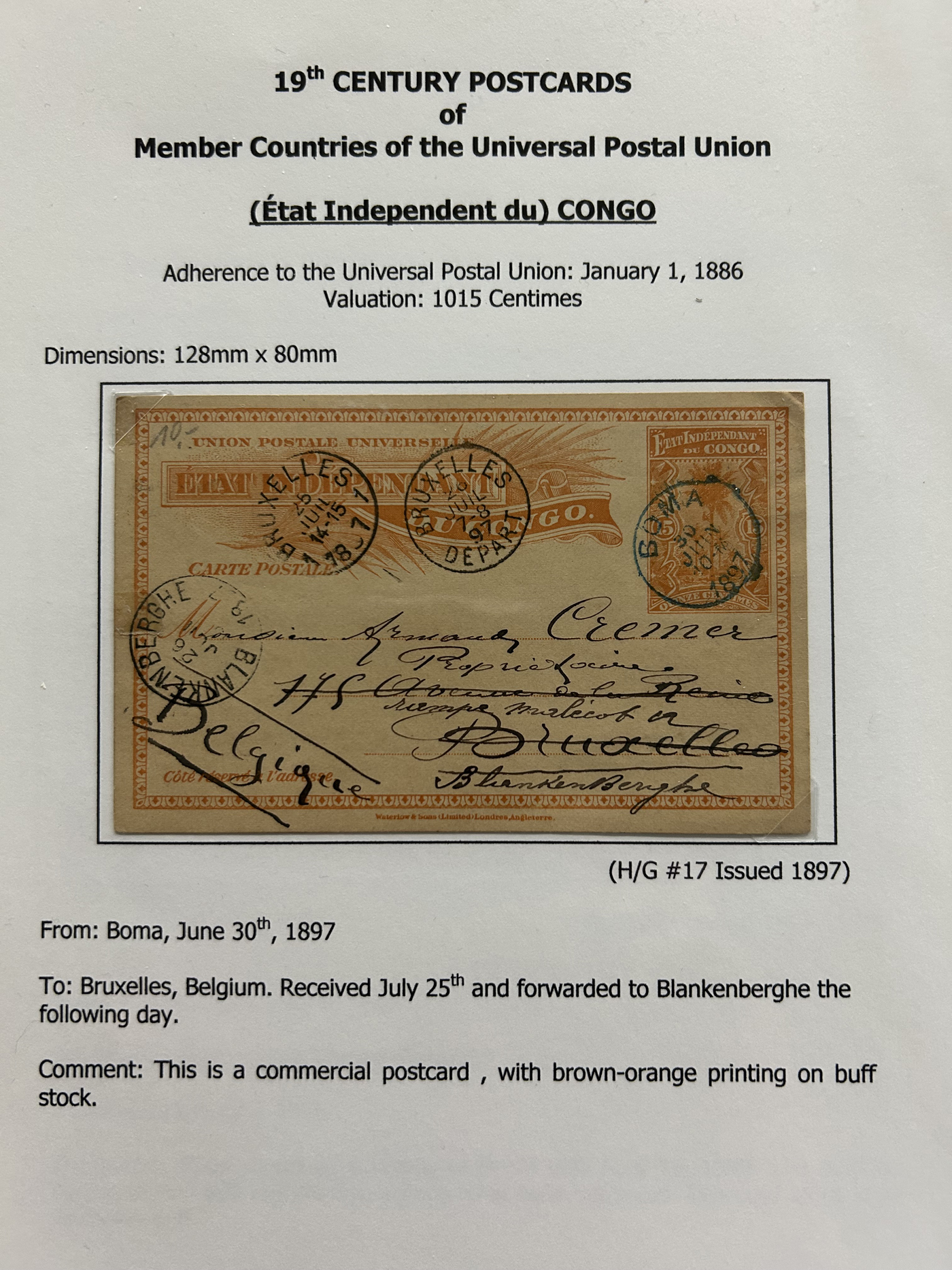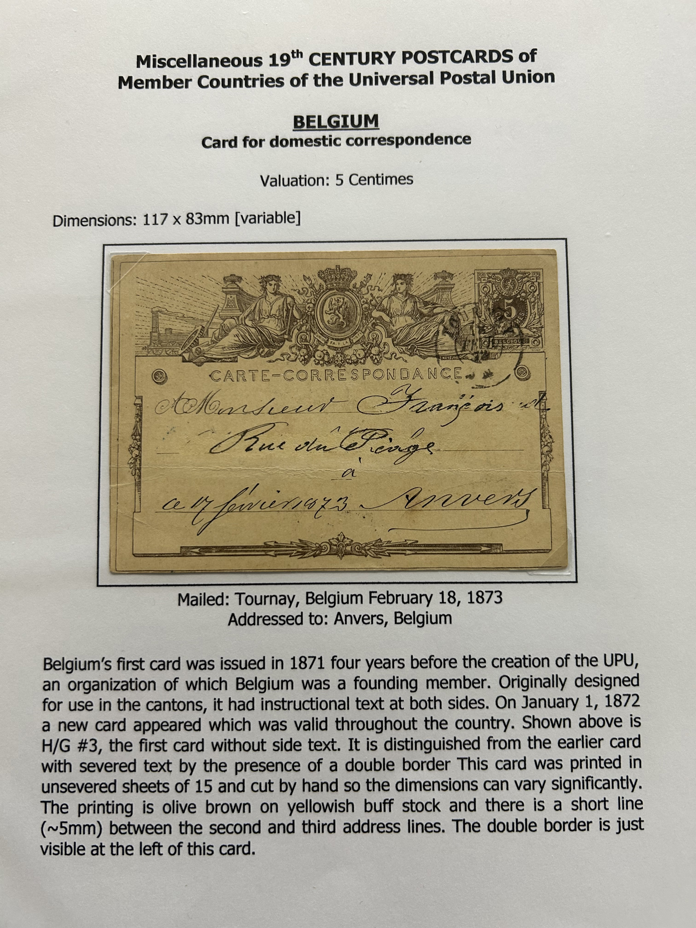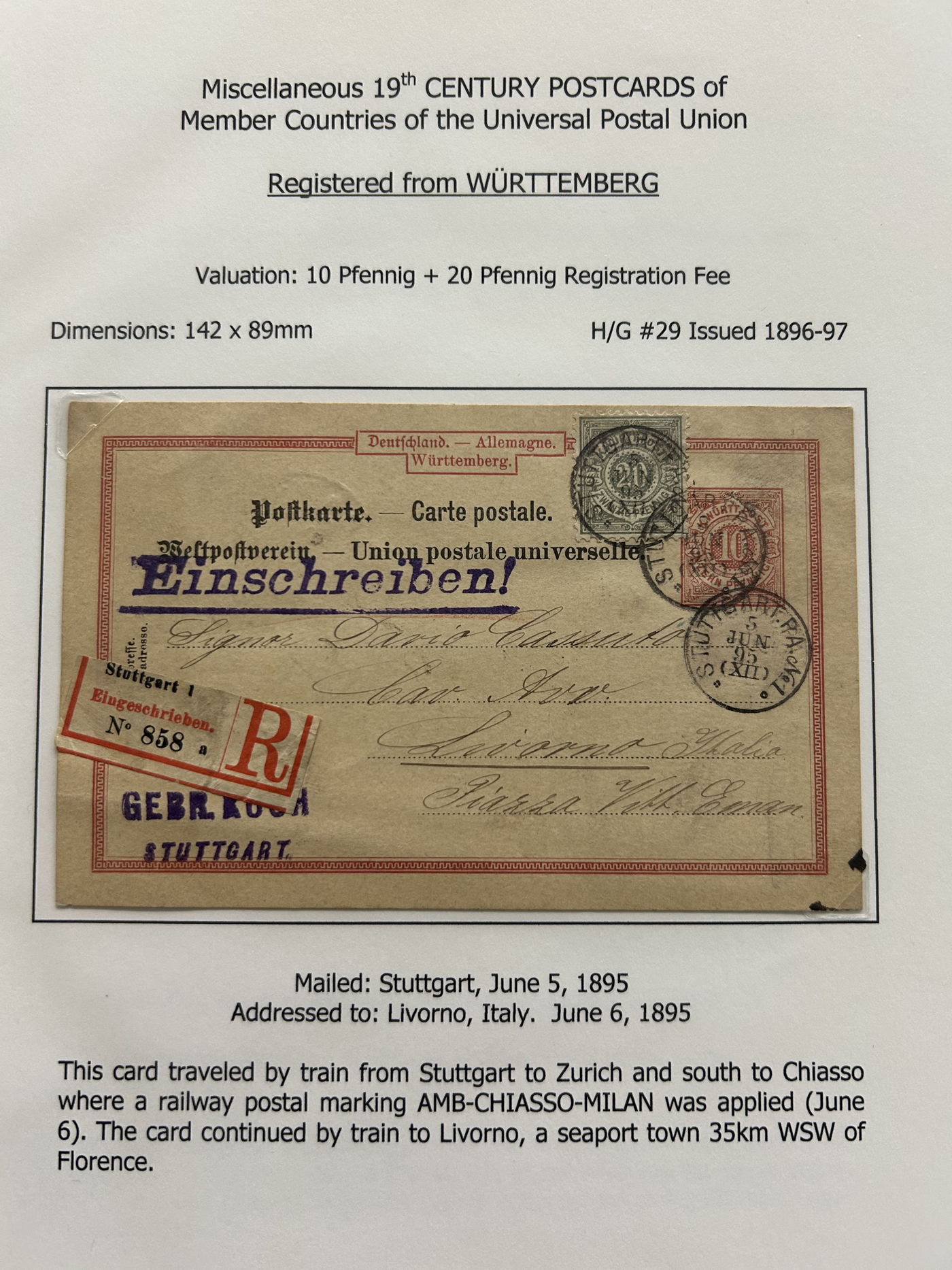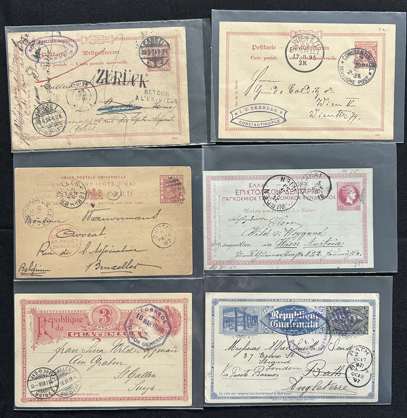 1357 PC   imageCollection of Used Worldwide U.P.U. (and pre-U.P.U.) Postal Stationery Cards, Including Registered, 1871 to 1900, with 32 cards, 27 of which are well researched and written-up on pages. We note cards from Austria (1872 to Silesia), Belgium (1872 and 1873, both domestic), Belgium (1878 uprated to France), Belgium (1889 and 1895 uprated to GB), Canada (1873 and 1874 uprated to United States), Germany (5x "Century" cards mailed to various places), Great Britain (1886 uprated to Panama), Italy (1875 uprated to GB and 1877 uprated to Belgium), Mexico (1894 domestic) Orange Free State (two foreign use formulars to Germany), Romania (1896 uprated to Austria), United States (1874 uprated with a 6c Lincoln (registered?!) to Canada), United States (1874 uprated to Canada), Italy (1899 uprated registered to Portugal), Malta (1897 uprated registered to Italy), Austria (1885 uprated "Express" Bohemia card to Vienna), Wurttemberg (1895 uprated registered to Italy), Romania (1900 uprated registered to Germany) and a few more. Overall very fine, see photos for a good sampling. (Scan 1) (Scan 2) (Scan 3) (Scan 4) (Scan 5) (Scan 6) (Scan 7) (Scan 8) (Scan 9) (Scan 10) (Scan 11) (Scan 12) (Scan 13) (Scan 14) (Scan 15) (Scan 16) (Scan 17) (Scan 18) (All Scans)