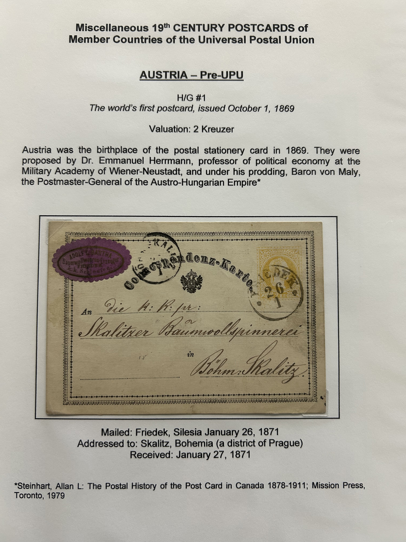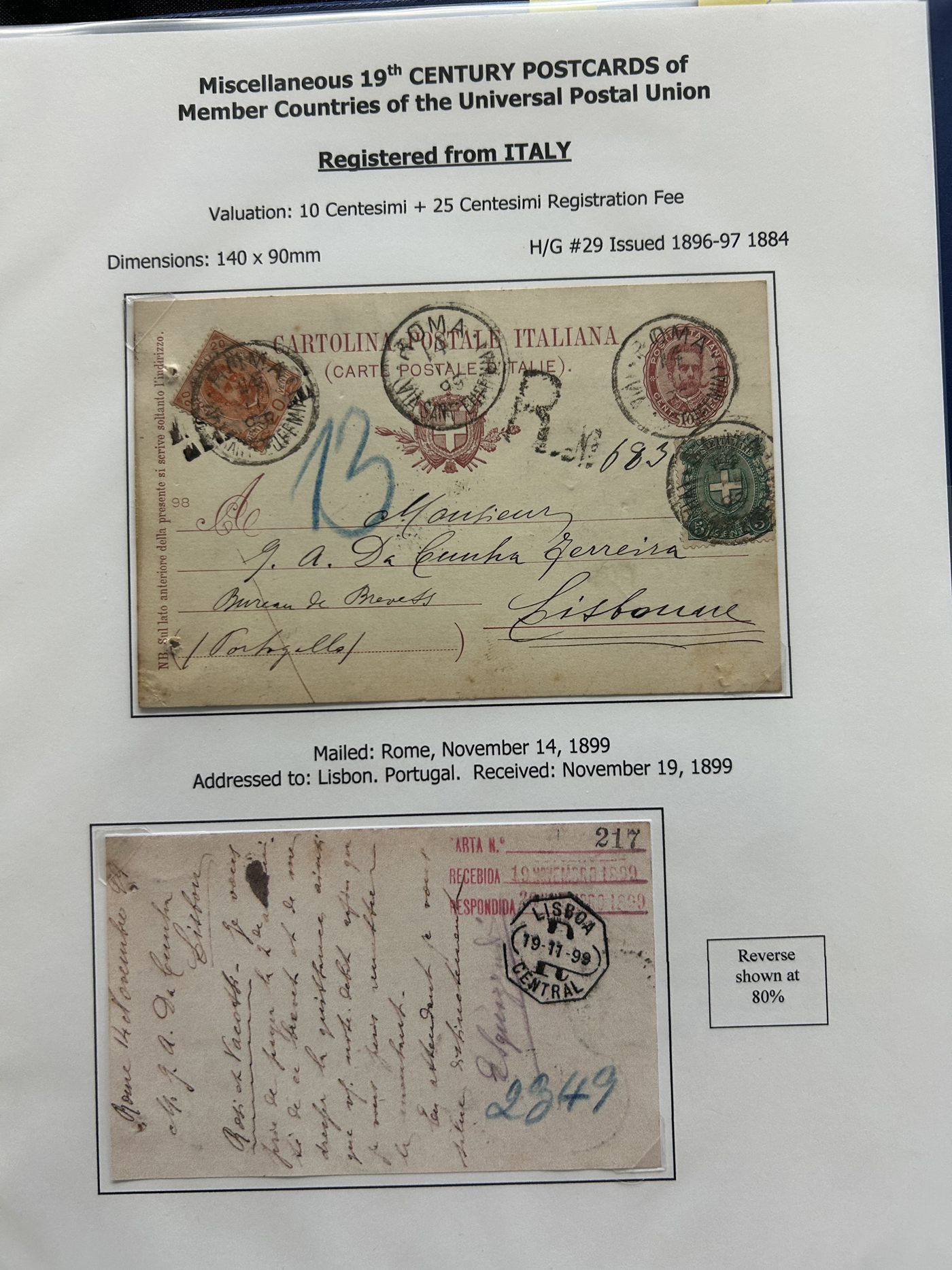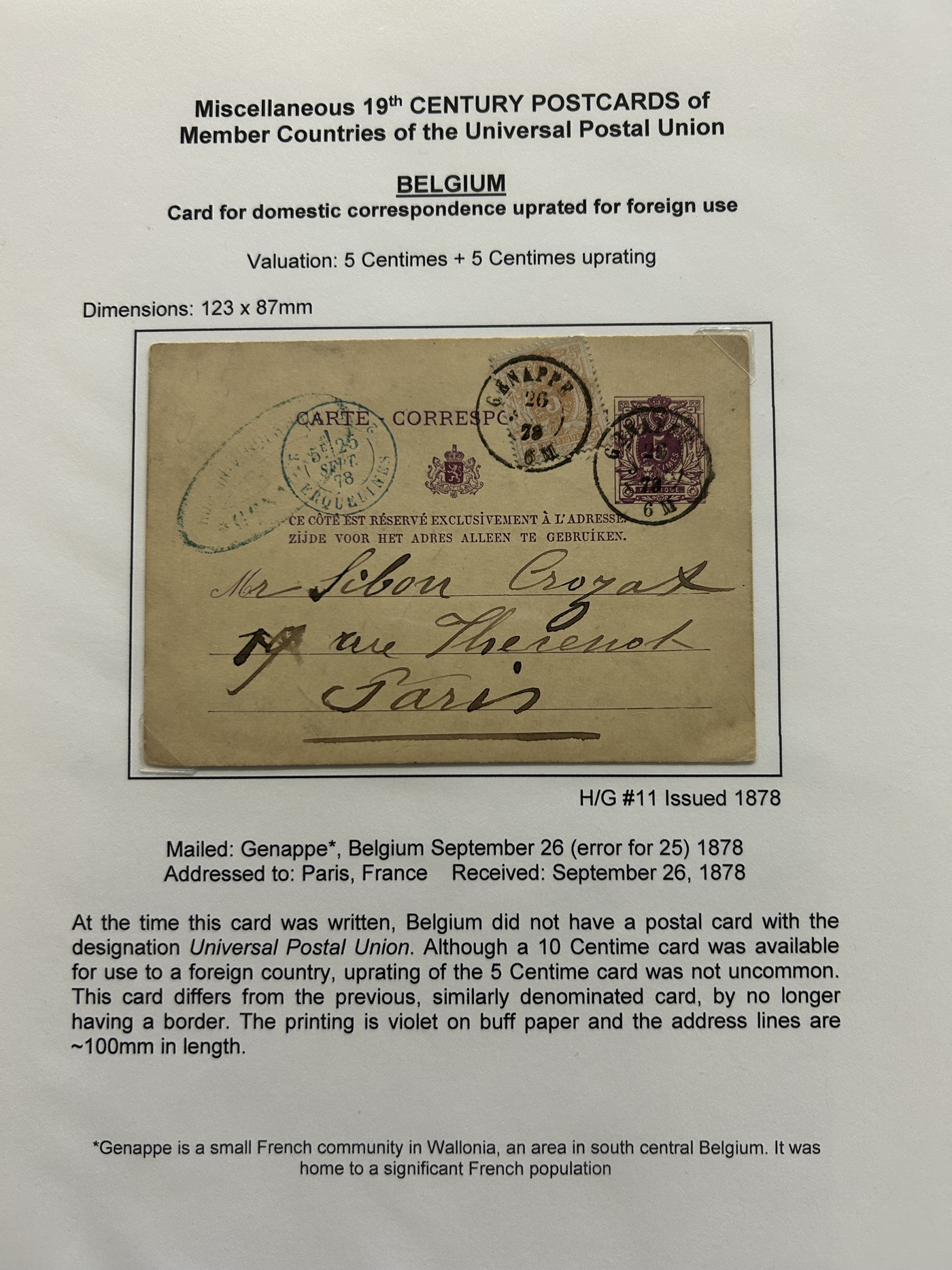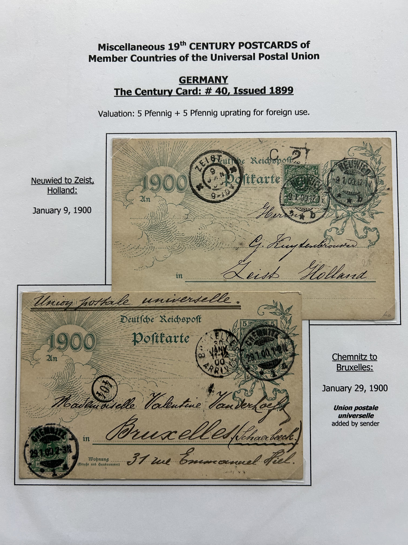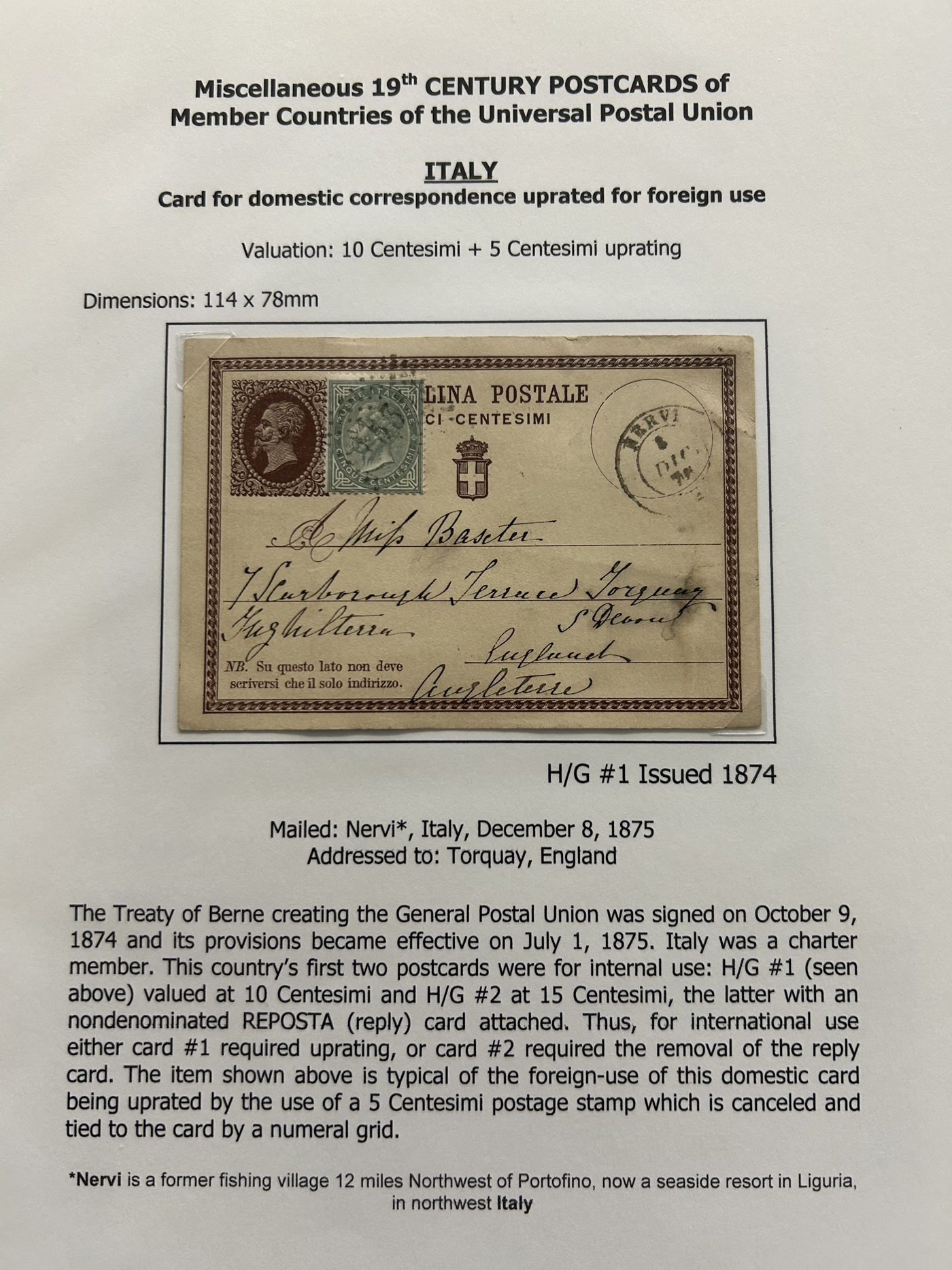 1357 PC   imageCollection of Used Worldwide U.P.U. (and pre-U.P.U.) Postal Stationery Cards, Including Registered, 1871 to 1900, with 32 cards, 27 of which are well researched and written-up on pages. We note cards from Austria (1872 to Silesia), Belgium (1872 and 1873, both domestic), Belgium (1878 uprated to France), Belgium (1889 and 1895 uprated to GB), Canada (1873 and 1874 uprated to United States), Germany (5x "Century" cards mailed to various places), Great Britain (1886 uprated to Panama), Italy (1875 uprated to GB and 1877 uprated to Belgium), Mexico (1894 domestic) Orange Free State (two foreign use formulars to Germany), Romania (1896 uprated to Austria), United States (1874 uprated with a 6c Lincoln (registered?!) to Canada), United States (1874 uprated to Canada), Italy (1899 uprated registered to Portugal), Malta (1897 uprated registered to Italy), Austria (1885 uprated "Express" Bohemia card to Vienna), Wurttemberg (1895 uprated registered to Italy), Romania (1900 uprated registered to Germany) and a few more. Overall very fine, see photos for a good sampling. (Scan 1) (Scan 2) (Scan 3) (Scan 4) (Scan 5) (Scan 6) (Scan 7) (Scan 8) (Scan 9) (Scan 10) (Scan 11) (Scan 12) (Scan 13) (Scan 14) (Scan 15) (Scan 16) (Scan 17) (Scan 18) (All Scans)