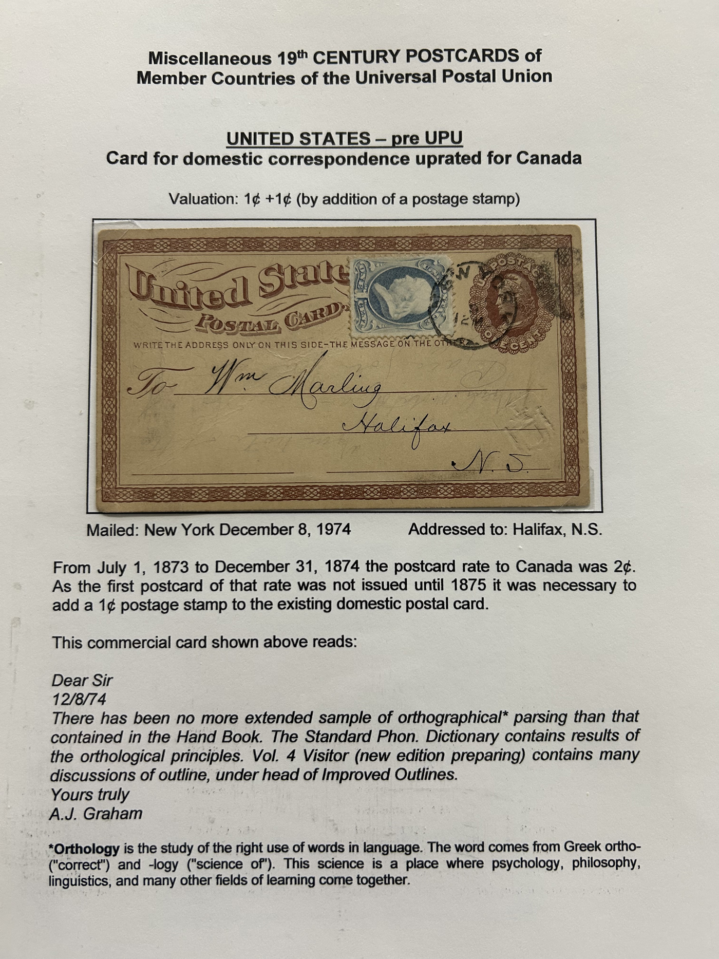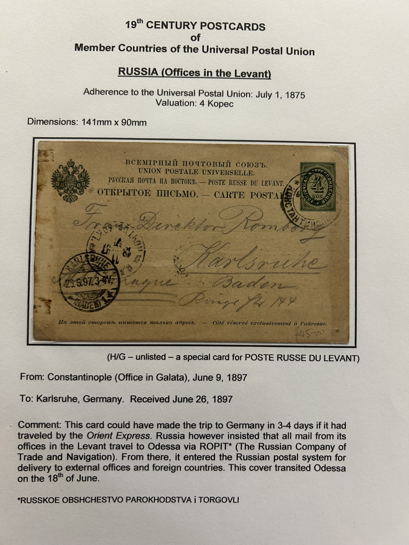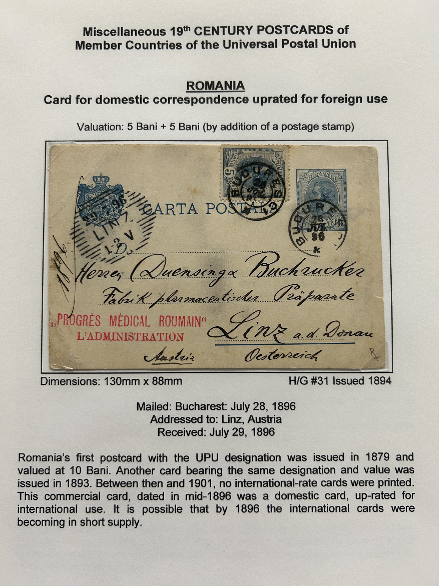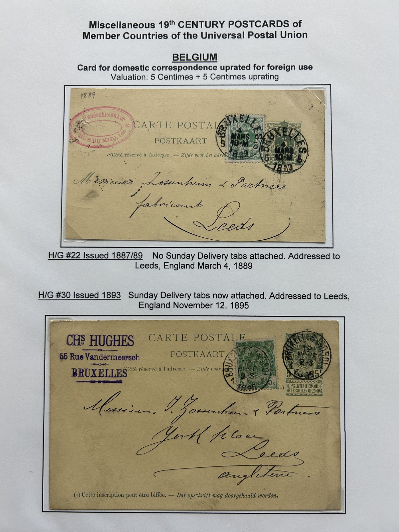 1357 PC   imageCollection of Used Worldwide U.P.U. (and pre-U.P.U.) Postal Stationery Cards, Including Registered, 1871 to 1900, with 32 cards, 27 of which are well researched and written-up on pages. We note cards from Austria (1872 to Silesia), Belgium (1872 and 1873, both domestic), Belgium (1878 uprated to France), Belgium (1889 and 1895 uprated to GB), Canada (1873 and 1874 uprated to United States), Germany (5x "Century" cards mailed to various places), Great Britain (1886 uprated to Panama), Italy (1875 uprated to GB and 1877 uprated to Belgium), Mexico (1894 domestic) Orange Free State (two foreign use formulars to Germany), Romania (1896 uprated to Austria), United States (1874 uprated with a 6c Lincoln (registered?!) to Canada), United States (1874 uprated to Canada), Italy (1899 uprated registered to Portugal), Malta (1897 uprated registered to Italy), Austria (1885 uprated "Express" Bohemia card to Vienna), Wurttemberg (1895 uprated registered to Italy), Romania (1900 uprated registered to Germany) and a few more. Overall very fine, see photos for a good sampling. (Scan 1) (Scan 2) (Scan 3) (Scan 4) (Scan 5) (Scan 6) (Scan 7) (Scan 8) (Scan 9) (Scan 10) (Scan 11) (Scan 12) (Scan 13) (Scan 14) (Scan 15) (Scan 16) (Scan 17) (Scan 18) (All Scans)