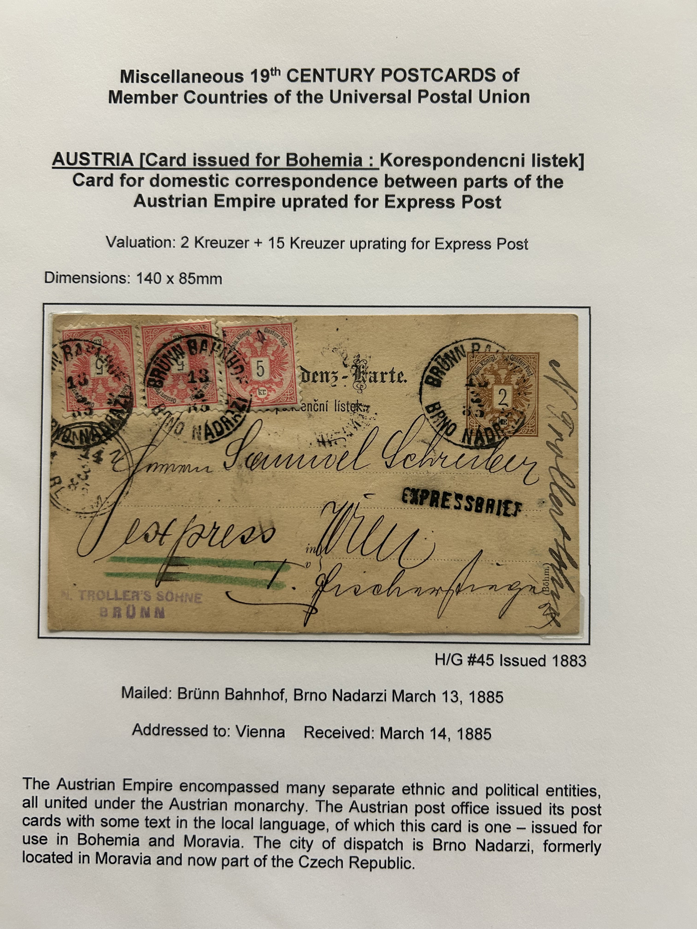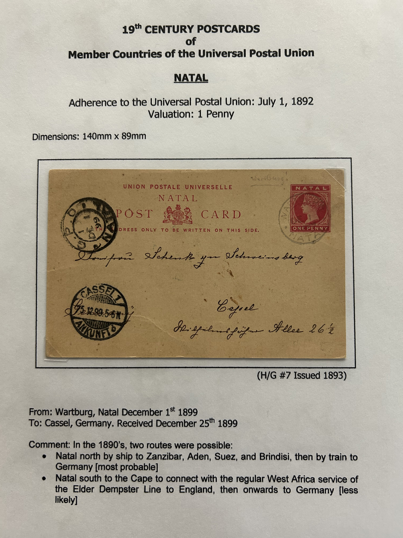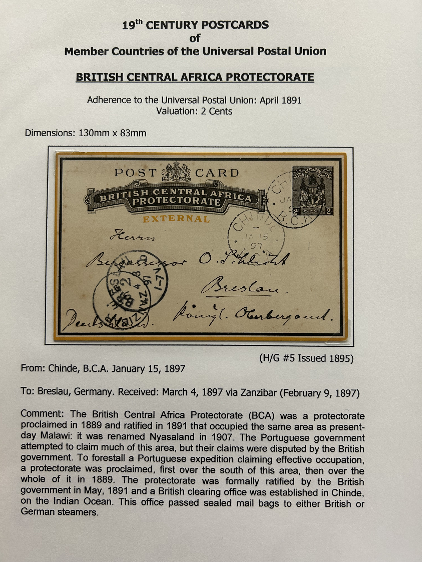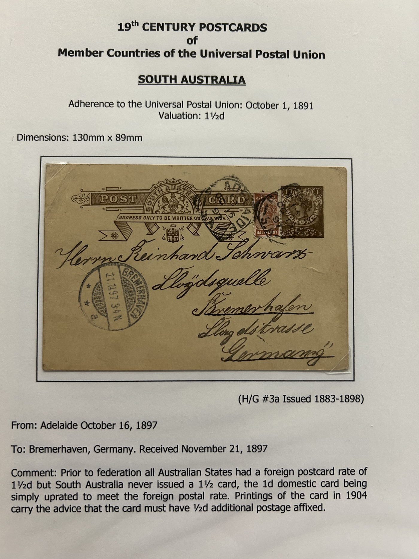 1357 PC   imageCollection of Used Worldwide U.P.U. (and pre-U.P.U.) Postal Stationery Cards, Including Registered, 1871 to 1900, with 32 cards, 27 of which are well researched and written-up on pages. We note cards from Austria (1872 to Silesia), Belgium (1872 and 1873, both domestic), Belgium (1878 uprated to France), Belgium (1889 and 1895 uprated to GB), Canada (1873 and 1874 uprated to United States), Germany (5x "Century" cards mailed to various places), Great Britain (1886 uprated to Panama), Italy (1875 uprated to GB and 1877 uprated to Belgium), Mexico (1894 domestic) Orange Free State (two foreign use formulars to Germany), Romania (1896 uprated to Austria), United States (1874 uprated with a 6c Lincoln (registered?!) to Canada), United States (1874 uprated to Canada), Italy (1899 uprated registered to Portugal), Malta (1897 uprated registered to Italy), Austria (1885 uprated "Express" Bohemia card to Vienna), Wurttemberg (1895 uprated registered to Italy), Romania (1900 uprated registered to Germany) and a few more. Overall very fine, see photos for a good sampling. (Scan 1) (Scan 2) (Scan 3) (Scan 4) (Scan 5) (Scan 6) (Scan 7) (Scan 8) (Scan 9) (Scan 10) (Scan 11) (Scan 12) (Scan 13) (Scan 14) (Scan 15) (Scan 16) (Scan 17) (Scan 18) (All Scans)