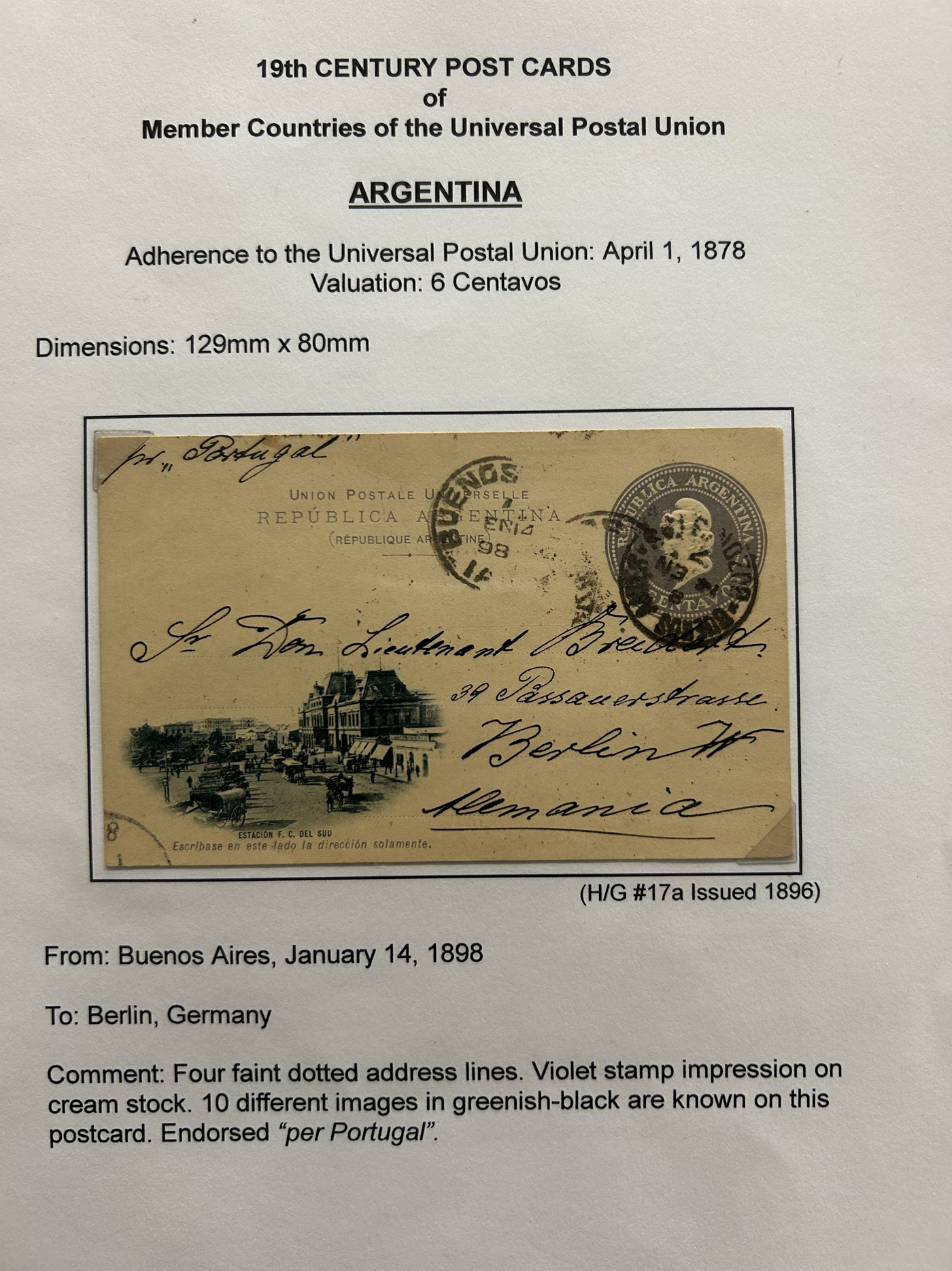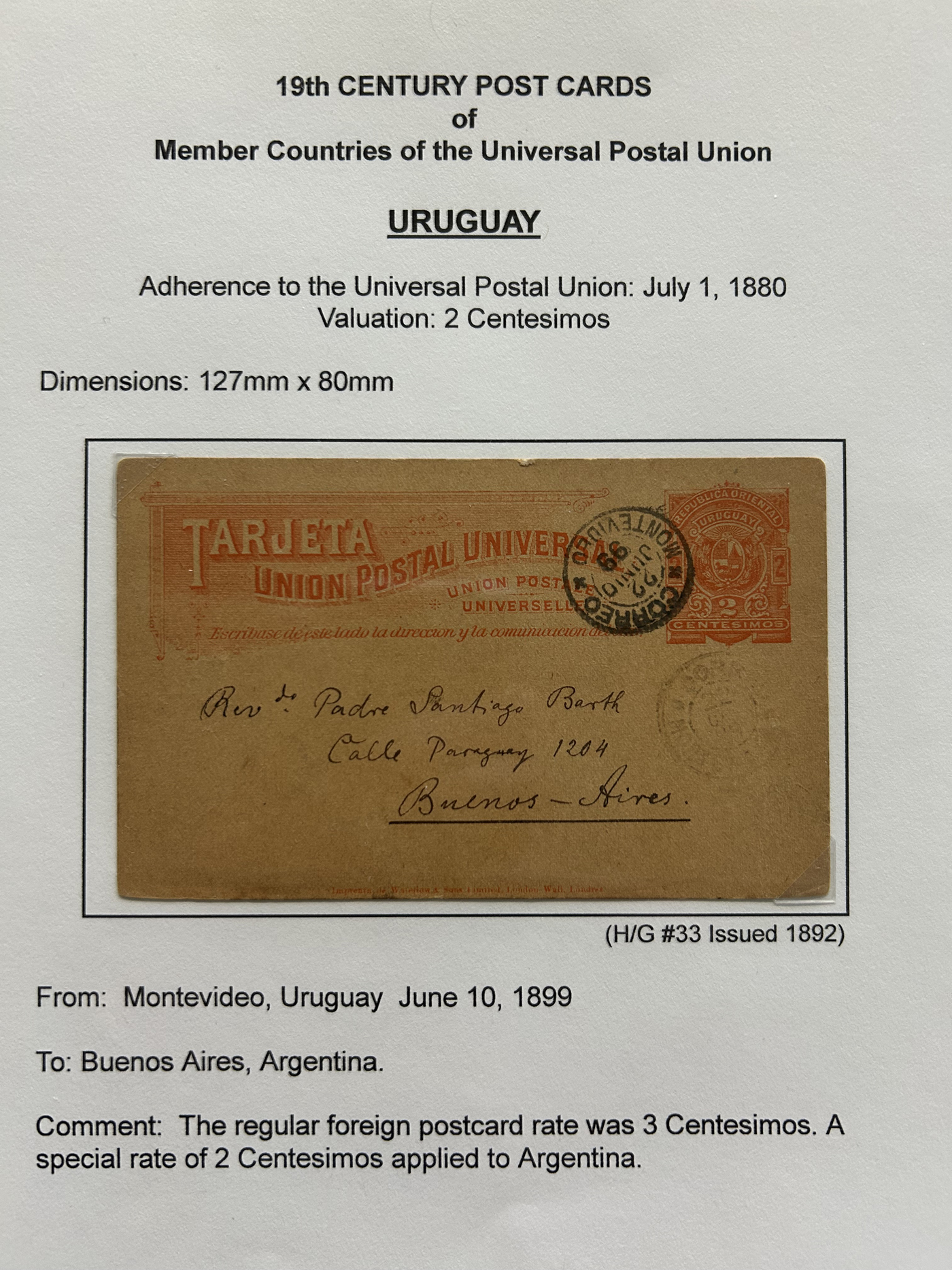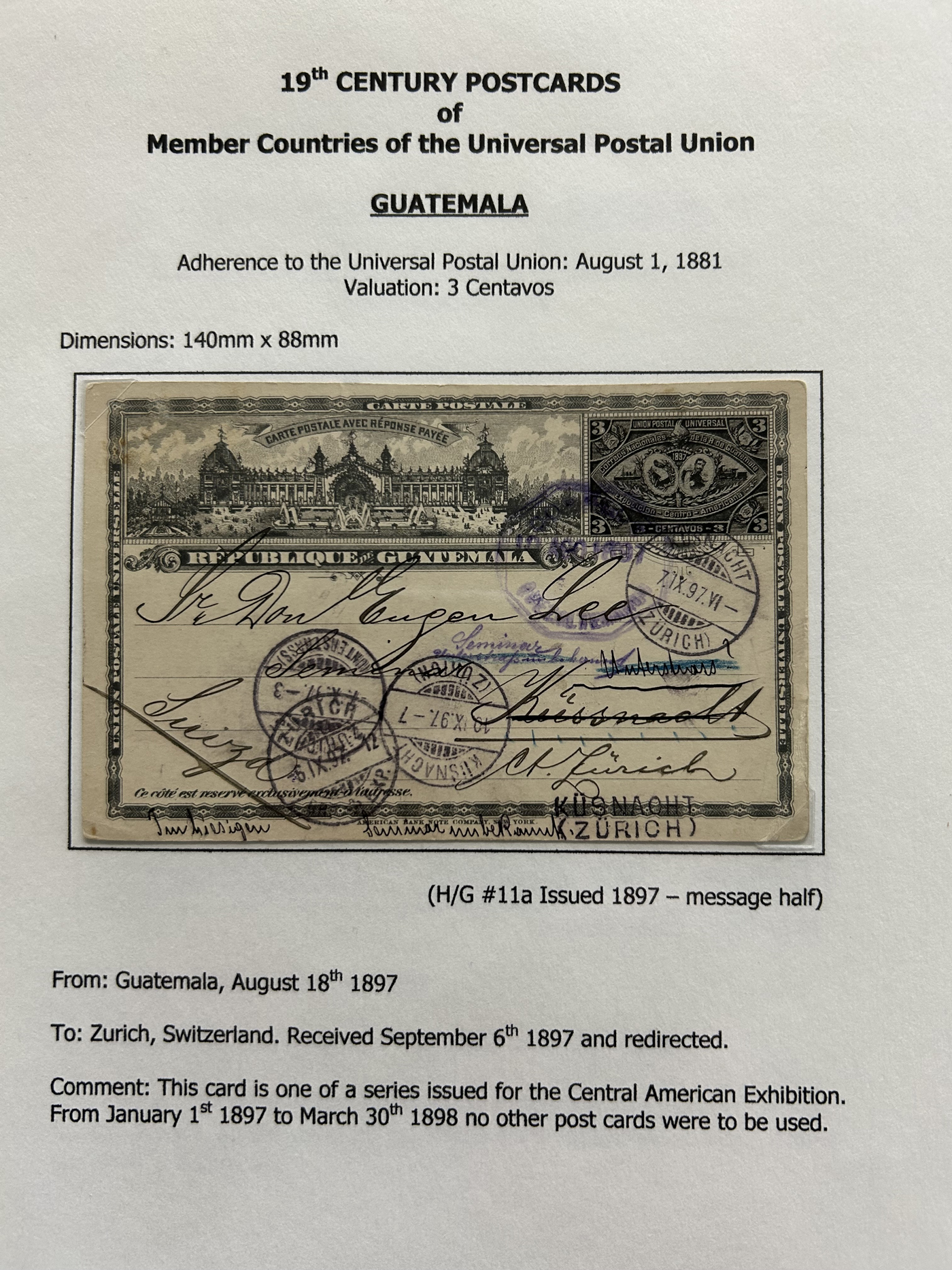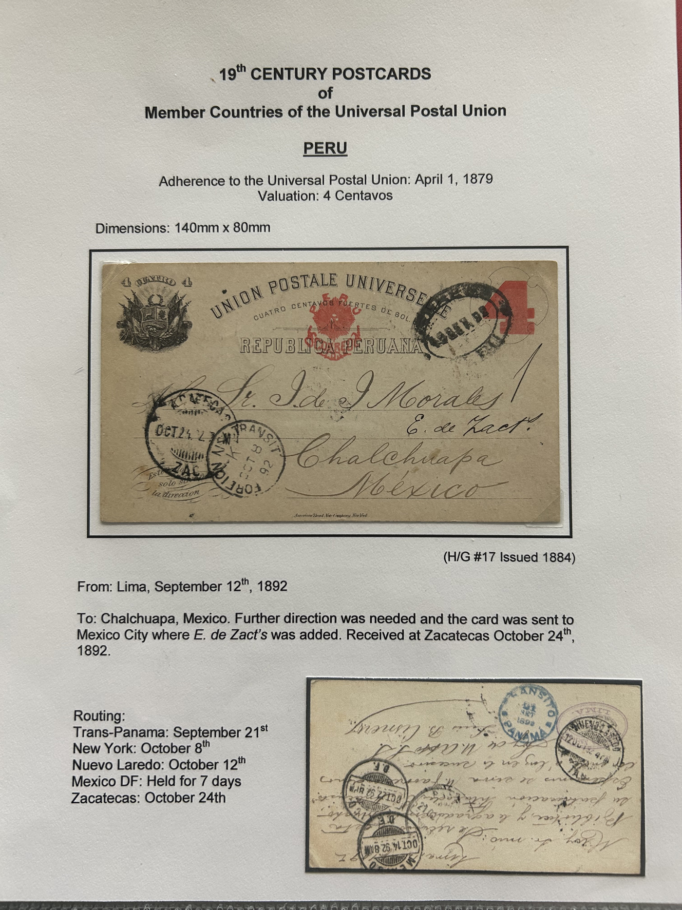 1358 PC   imageExhibit of Used Central and South American U.P.U. Postal Stationery Cards to 1900, a three frame (48 page) exhibit of cards that were correctly mailed outside of the country of origin, from Argentina to Venezuela. All of the cards are government issued and pay the correct rate (no uprating necessary) except for one card which is uprated to pay a ferriage rate across the Isthmus of Panama. We counted 16 different countries, and each countries' cards are different, except for some exceptions where there is a different destination, routing or some other reason. Very fine throughout, pictures show a sampling only. (Scan 1) (Scan 2) (Scan 3) (Scan 4) (Scan 5) (Scan 6) (Scan 7) (Scan 8) (Scan 9) (Scan 10) (Scan 11) (Scan 12) (Scan 13) (Scan 14) (All Scans)