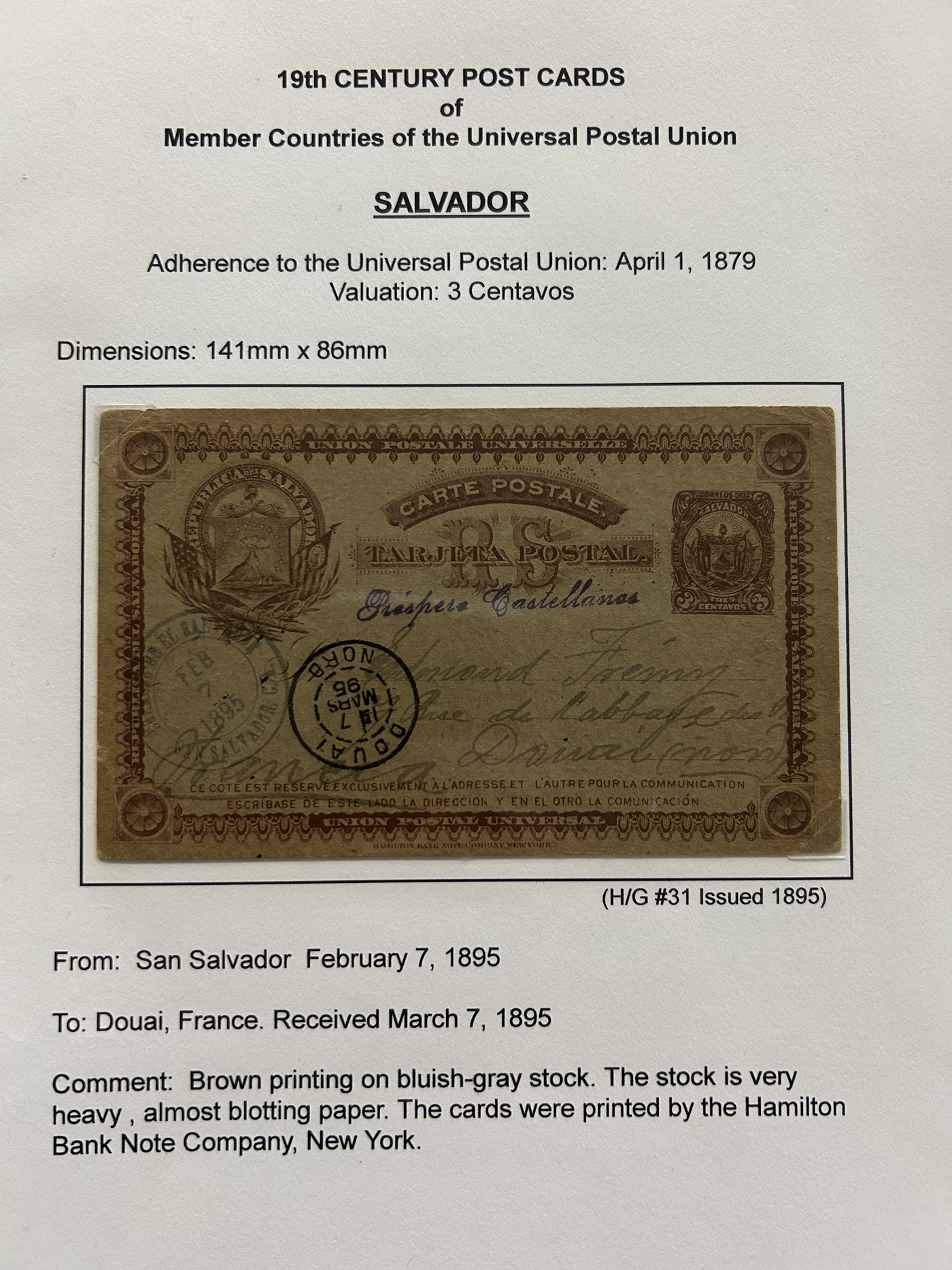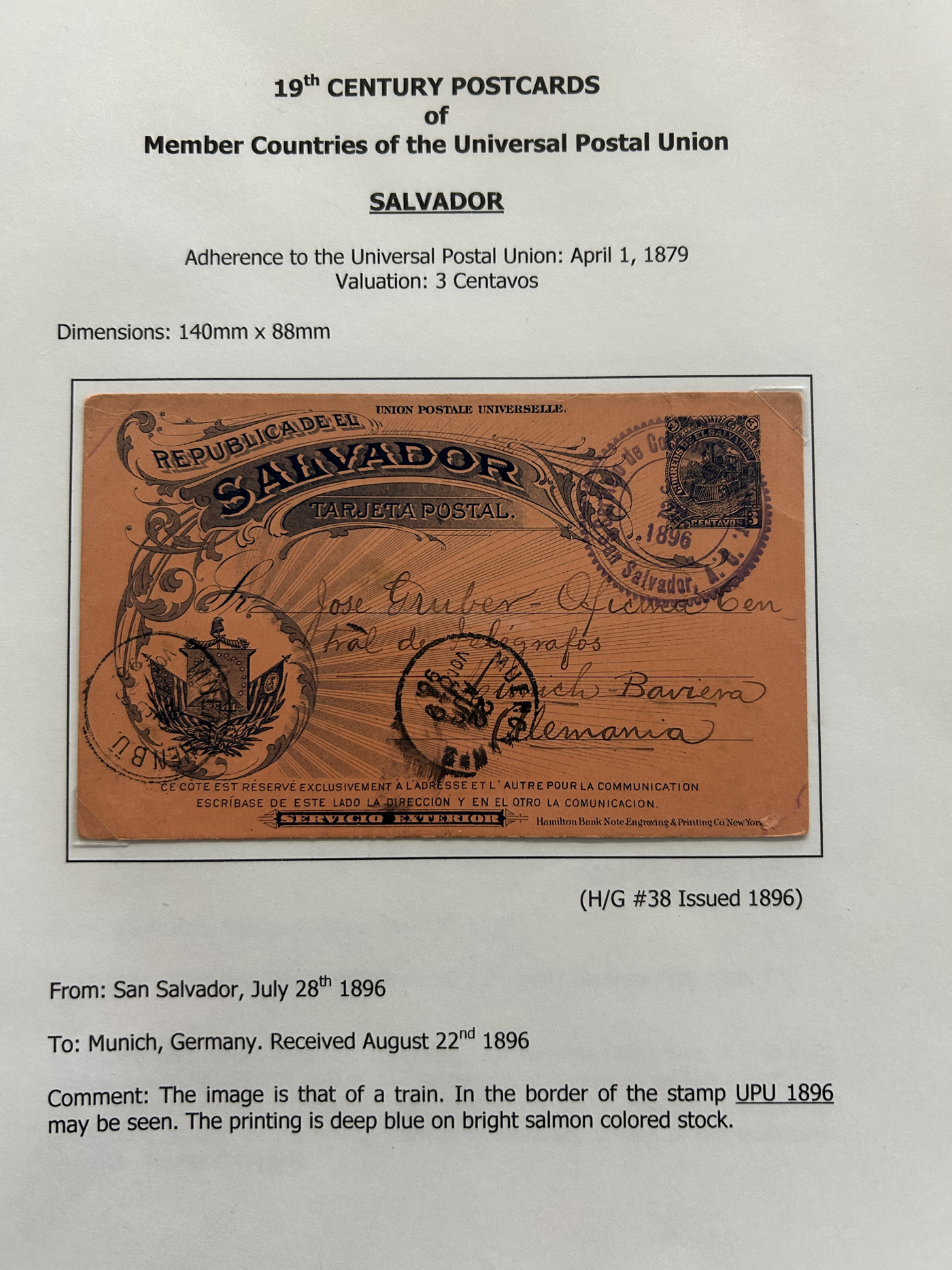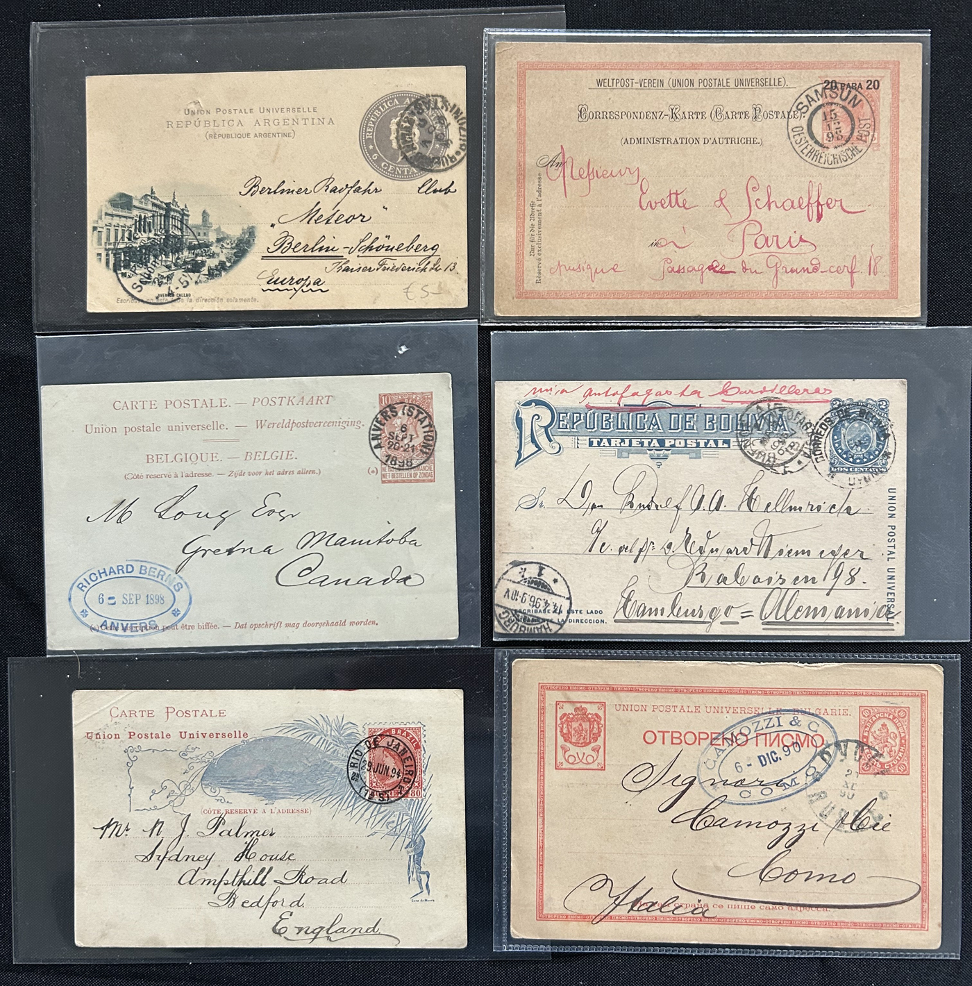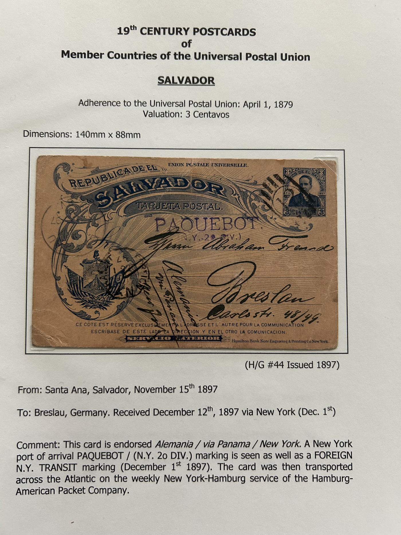 1358 PC   imageExhibit of Used Central and South American U.P.U. Postal Stationery Cards to 1900, a three frame (48 page) exhibit of cards that were correctly mailed outside of the country of origin, from Argentina to Venezuela. All of the cards are government issued and pay the correct rate (no uprating necessary) except for one card which is uprated to pay a ferriage rate across the Isthmus of Panama. We counted 16 different countries, and each countries' cards are different, except for some exceptions where there is a different destination, routing or some other reason. Very fine throughout, pictures show a sampling only. (Scan 1) (Scan 2) (Scan 3) (Scan 4) (Scan 5) (Scan 6) (Scan 7) (Scan 8) (Scan 9) (Scan 10) (Scan 11) (Scan 12) (Scan 13) (Scan 14) (All Scans)