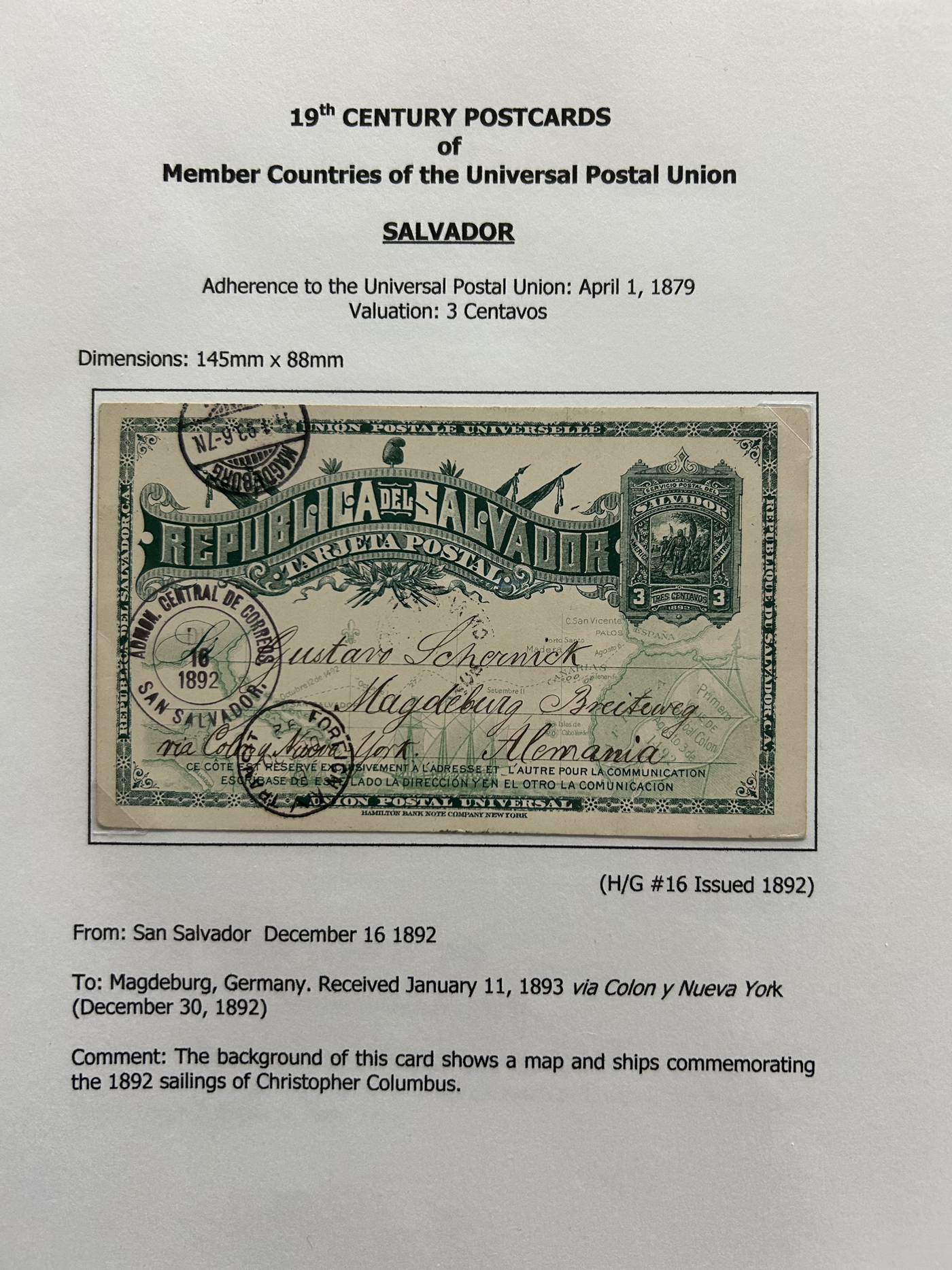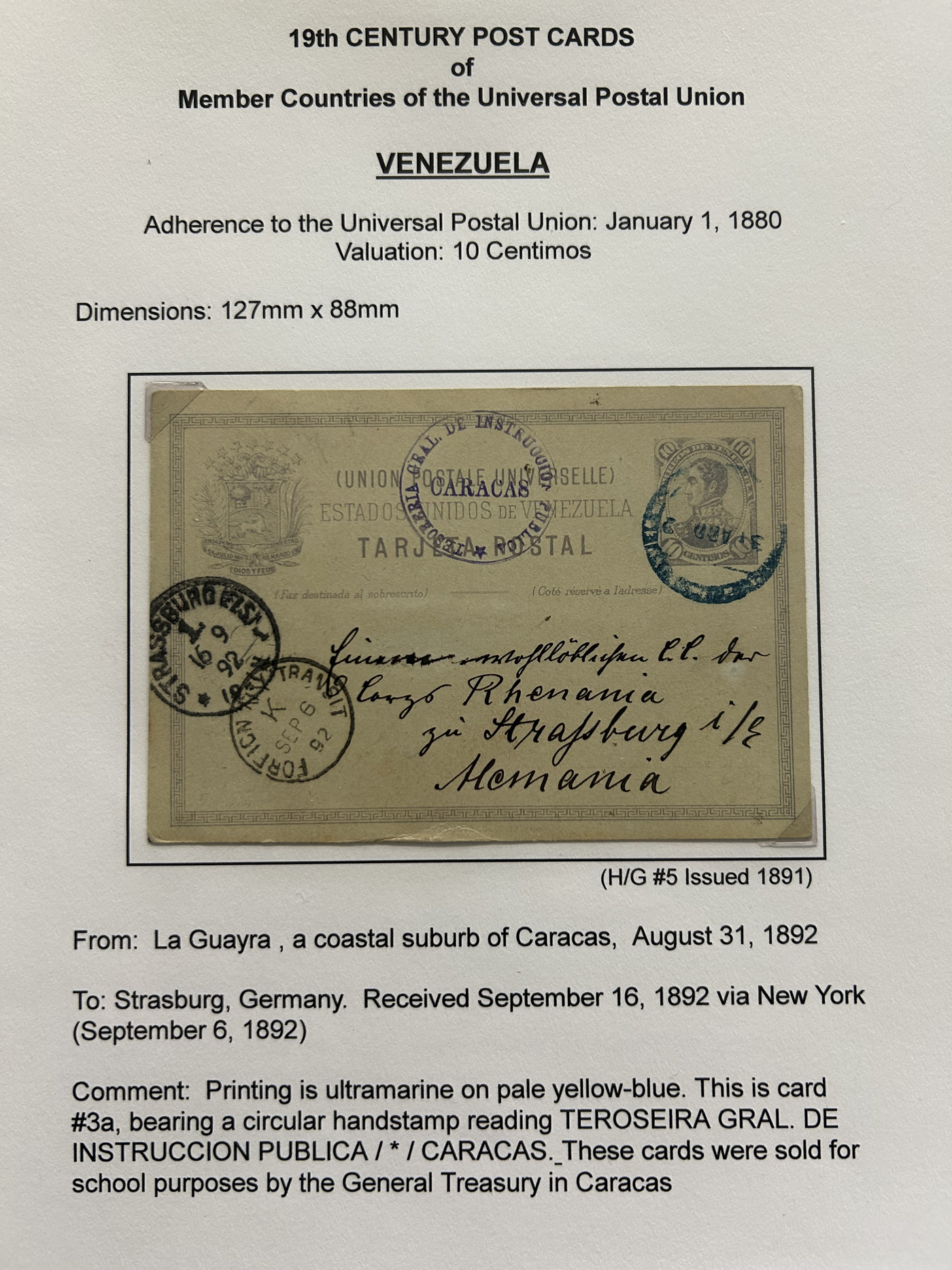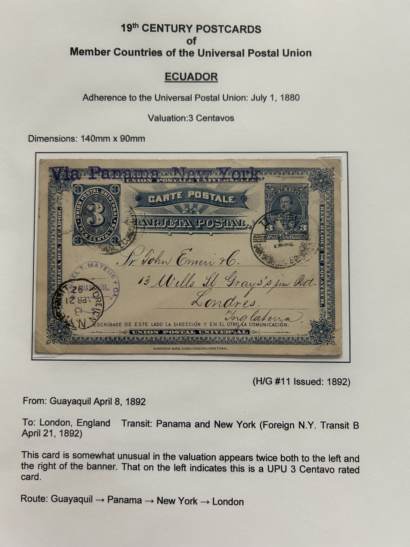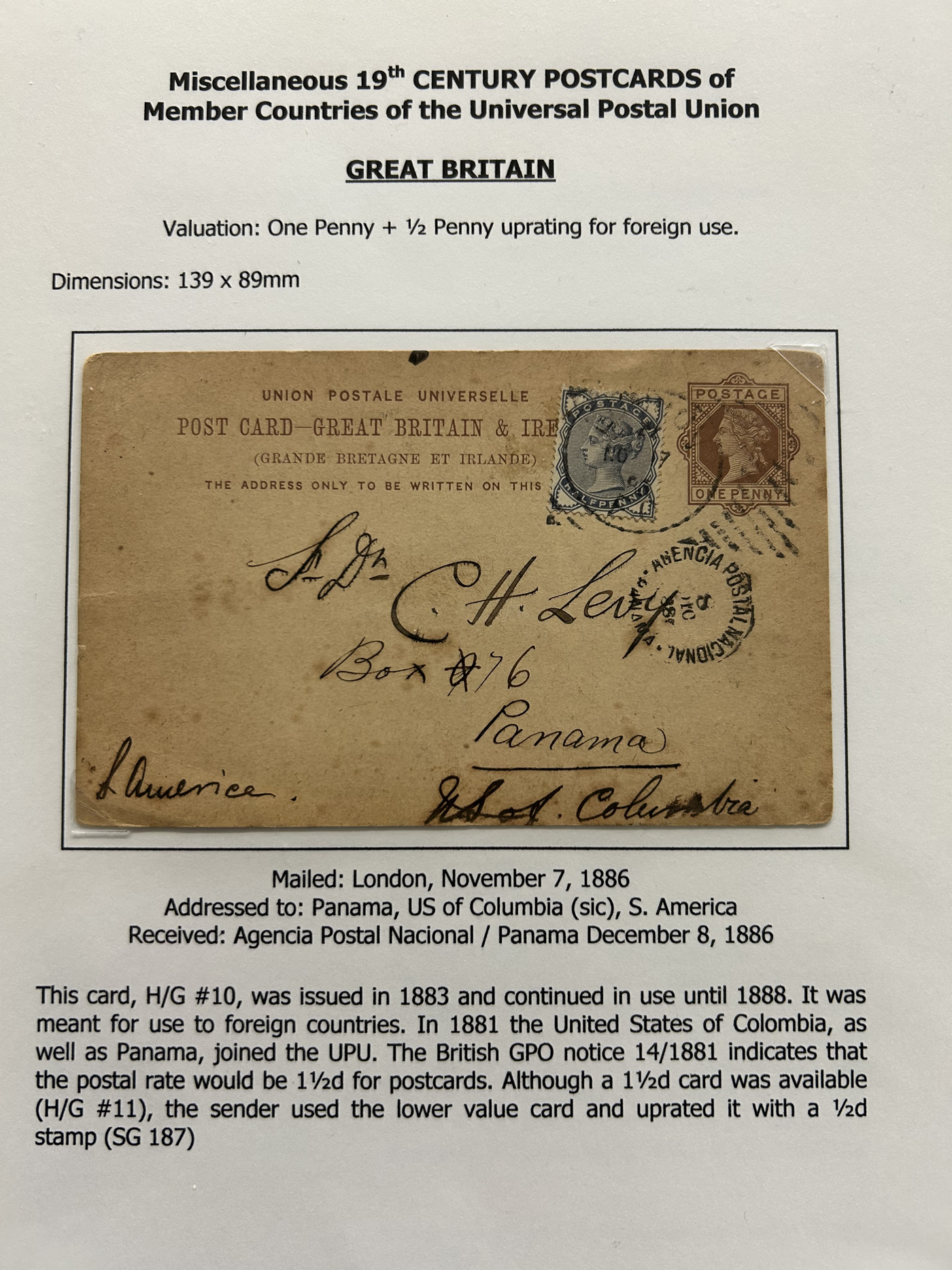 1358 PC   imageExhibit of Used Central and South American U.P.U. Postal Stationery Cards to 1900, a three frame (48 page) exhibit of cards that were correctly mailed outside of the country of origin, from Argentina to Venezuela. All of the cards are government issued and pay the correct rate (no uprating necessary) except for one card which is uprated to pay a ferriage rate across the Isthmus of Panama. We counted 16 different countries, and each countries' cards are different, except for some exceptions where there is a different destination, routing or some other reason. Very fine throughout, pictures show a sampling only. (Scan 1) (Scan 2) (Scan 3) (Scan 4) (Scan 5) (Scan 6) (Scan 7) (Scan 8) (Scan 9) (Scan 10) (Scan 11) (Scan 12) (Scan 13) (Scan 14) (All Scans)