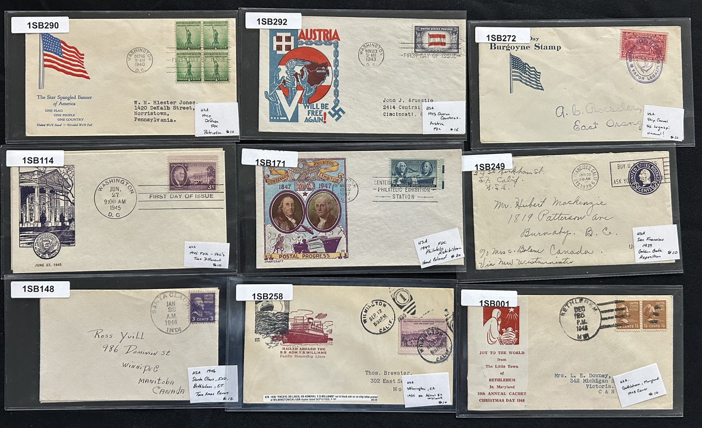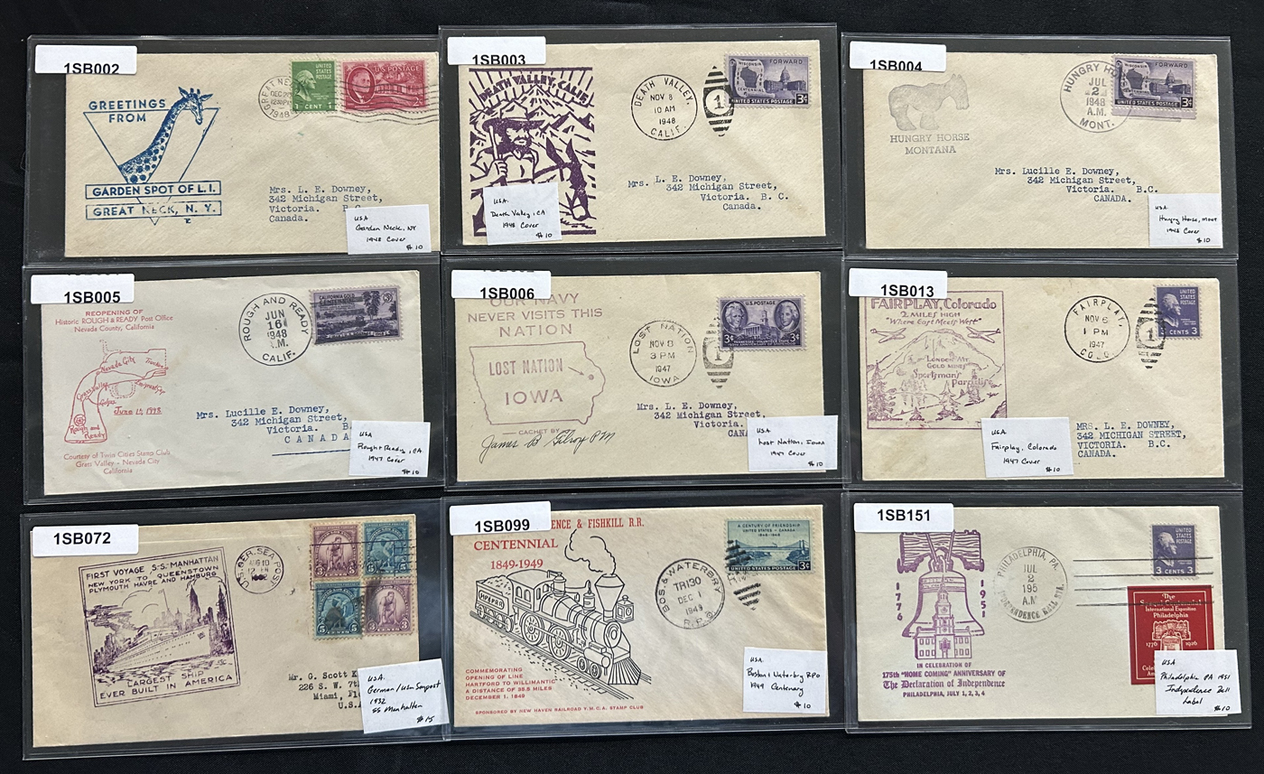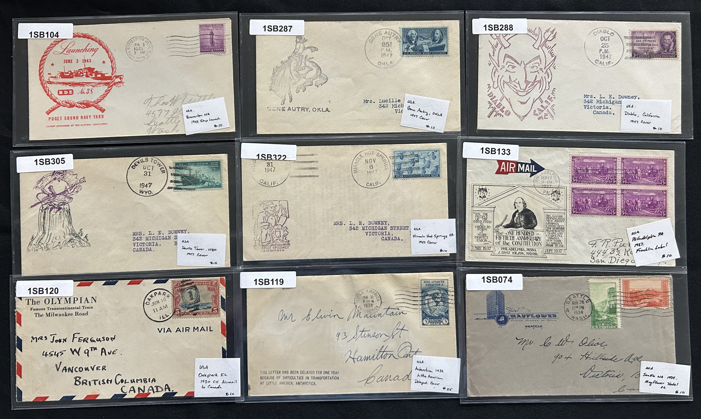 1341 CVR   imageGroup of 54 covers Plus 9 Postcards, Mostly 1910s to 1940s, the great majority of which have cachets, either for First Day or special events, we also note some illustrated advertising covers, (some on both sides), a group of 4 covers each with a different 1926 International Philatelic Exposition label, a delayed 1934 Little America Antarctica cover, a C11 Airmail cover to Canada, a group of 11 covers with a cachet for American town names the same as a country (for example Norway, Kansas, etc.) and more. All covers are sleeved, priced and very fine, all items photographed online. (Scan 1) (Scan 2) (Scan 3) (Scan 4) (Scan 5) (Scan 6) (Scan 7) (All Scans)
