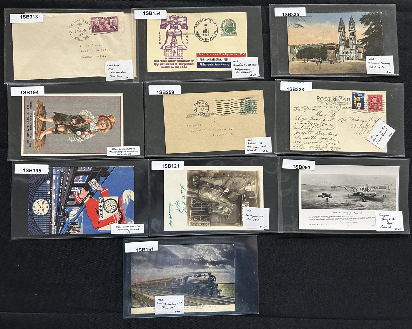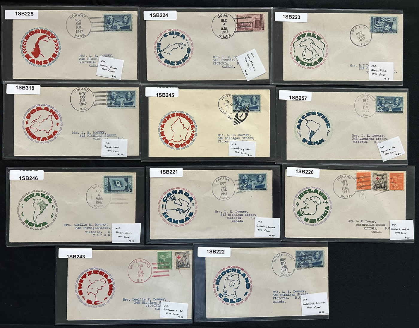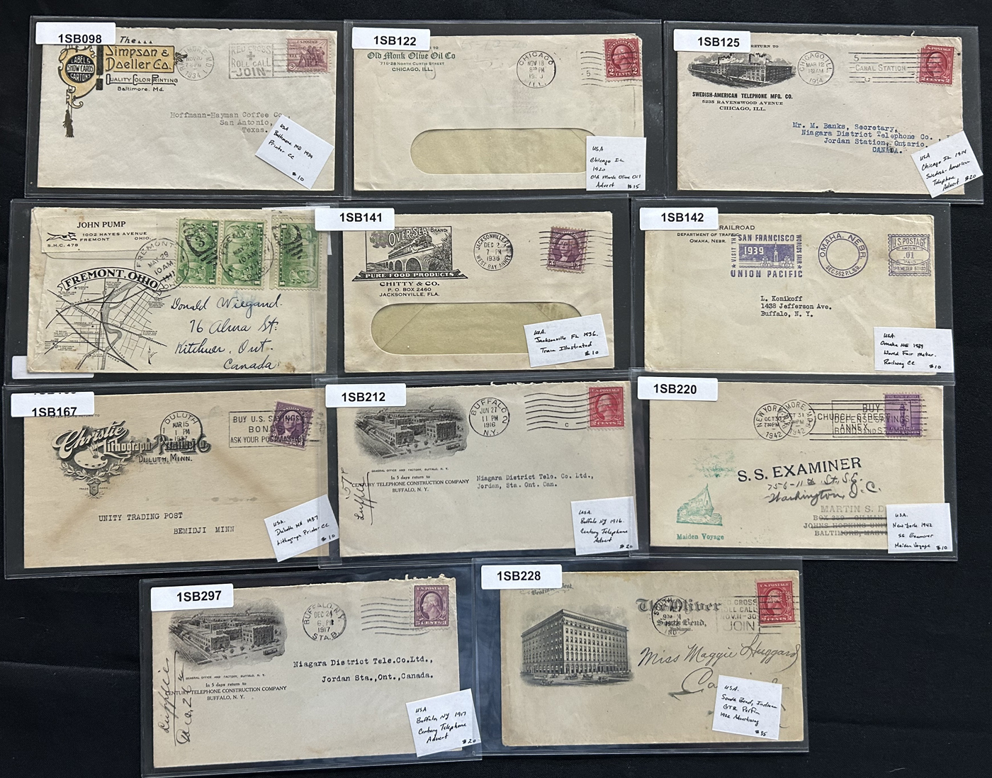 1341 CVR   imageGroup of 54 covers Plus 9 Postcards, Mostly 1910s to 1940s, the great majority of which have cachets, either for First Day or special events, we also note some illustrated advertising covers, (some on both sides), a group of 4 covers each with a different 1926 International Philatelic Exposition label, a delayed 1934 Little America Antarctica cover, a C11 Airmail cover to Canada, a group of 11 covers with a cachet for American town names the same as a country (for example Norway, Kansas, etc.) and more. All covers are sleeved, priced and very fine, all items photographed online. (Scan 1) (Scan 2) (Scan 3) (Scan 4) (Scan 5) (Scan 6) (Scan 7) (All Scans)