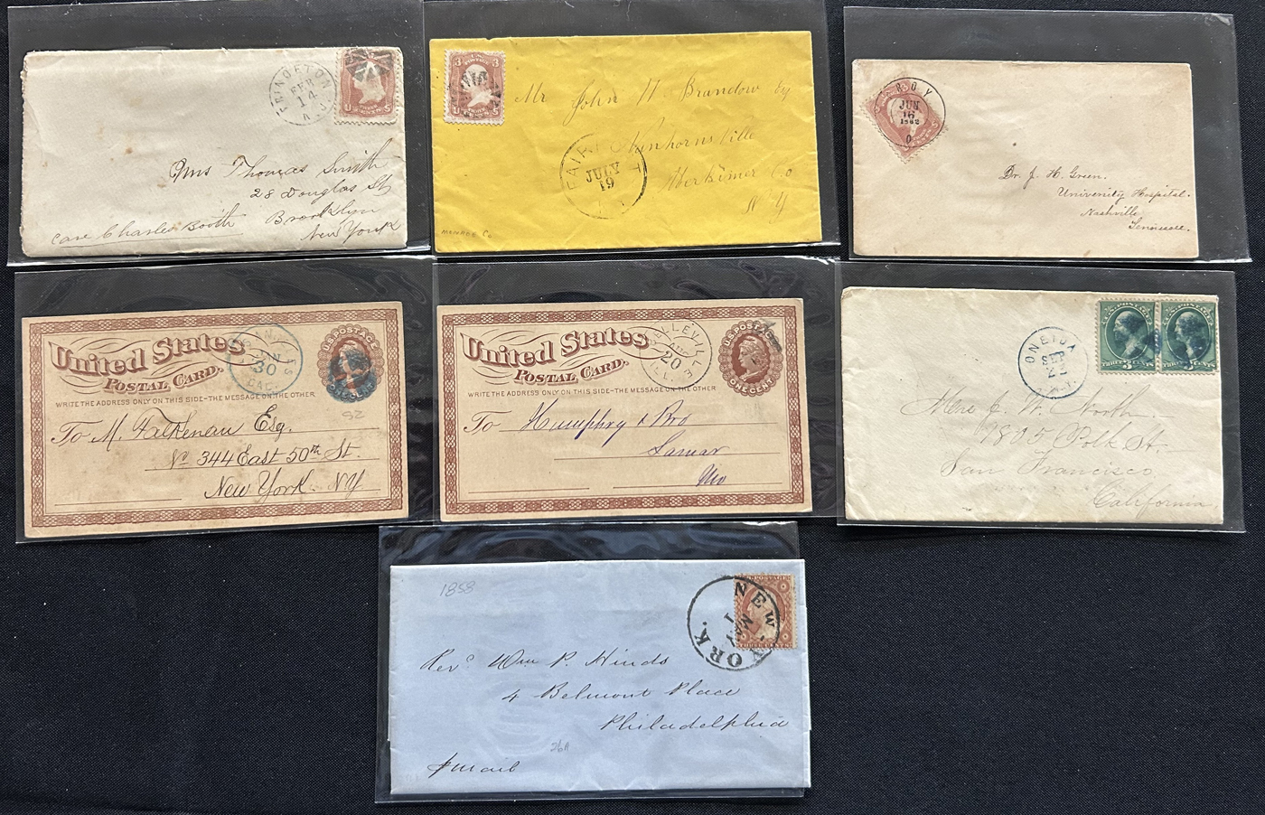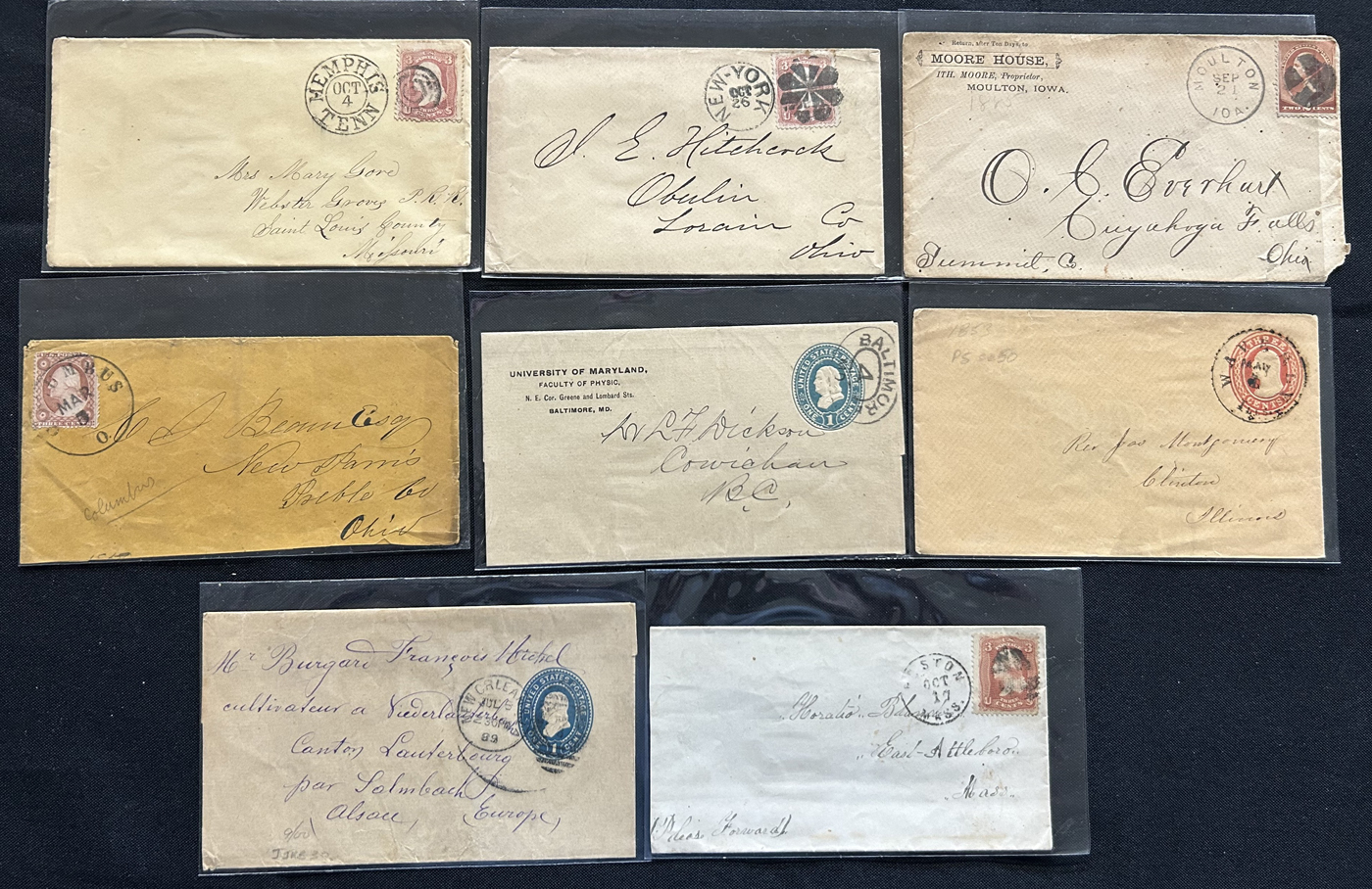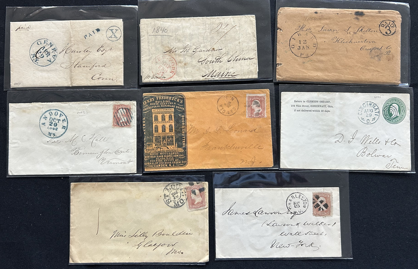 1342 CVR   imageGroup of 23 Older United States Covers, 1840s to 1890s, noting 3 stampless, several fancy cork duplex, a few corner cards (one is illustrated), some stationery cards and covers, good range of town postmarks, and more. A few small faults, still a clean and fine or better group. All are pictured online. (Scan 1) (Scan 2) (Scan 3) (All Scans)