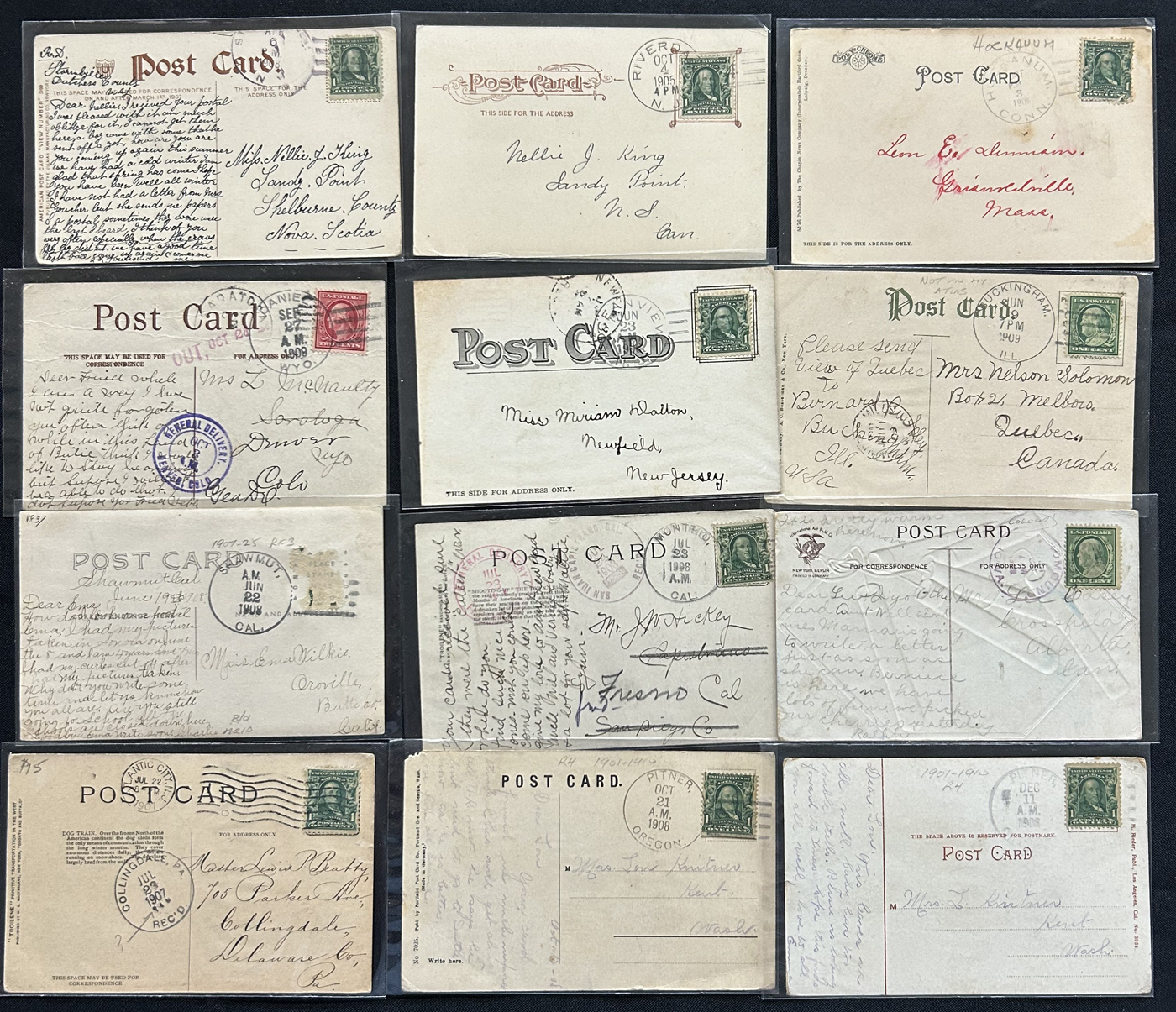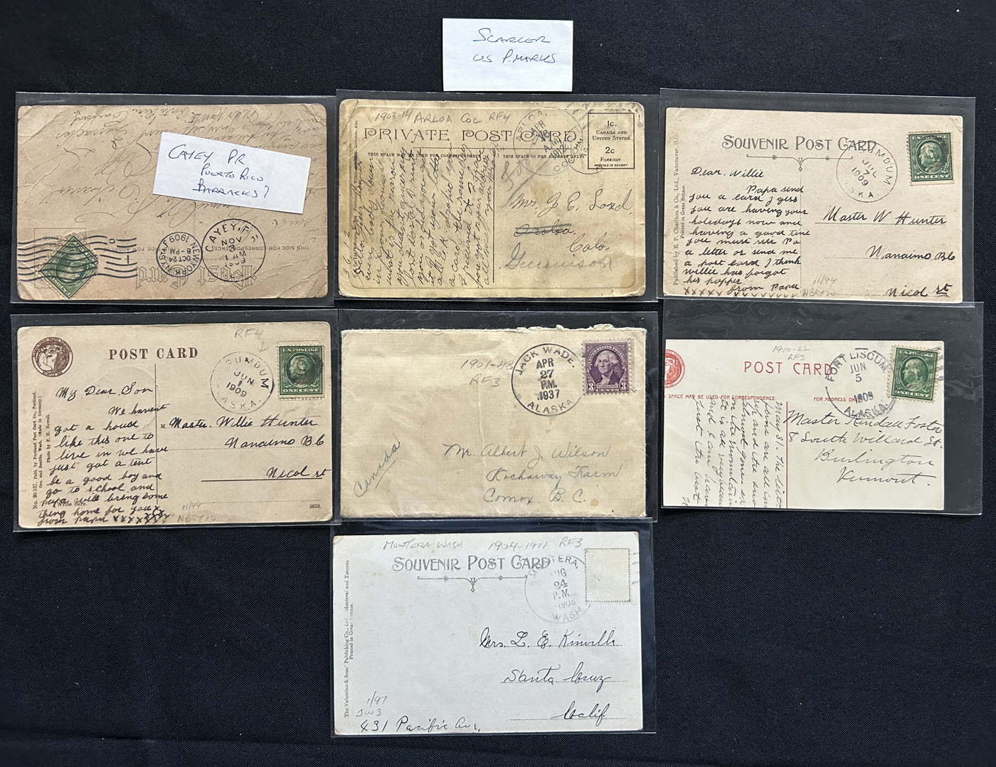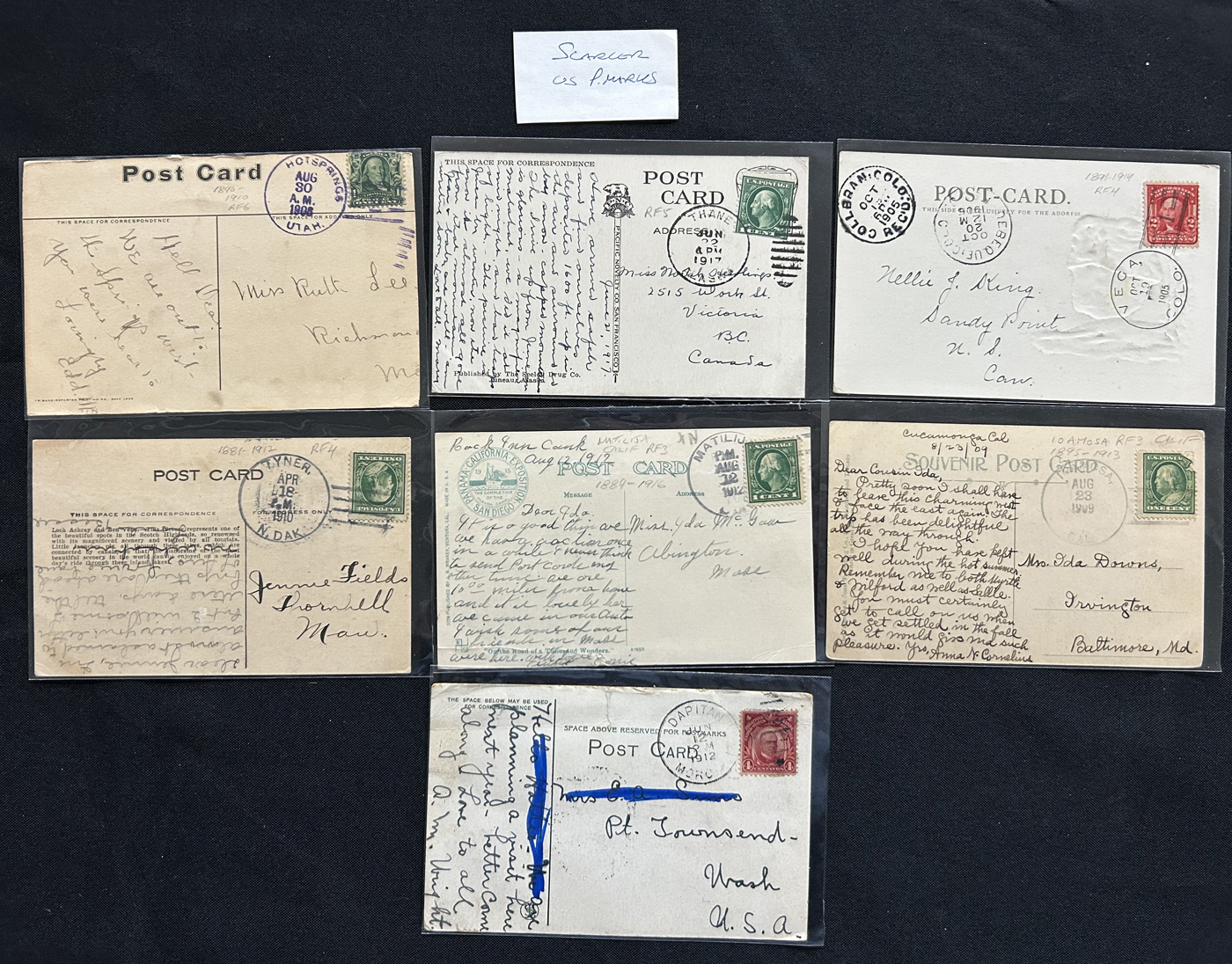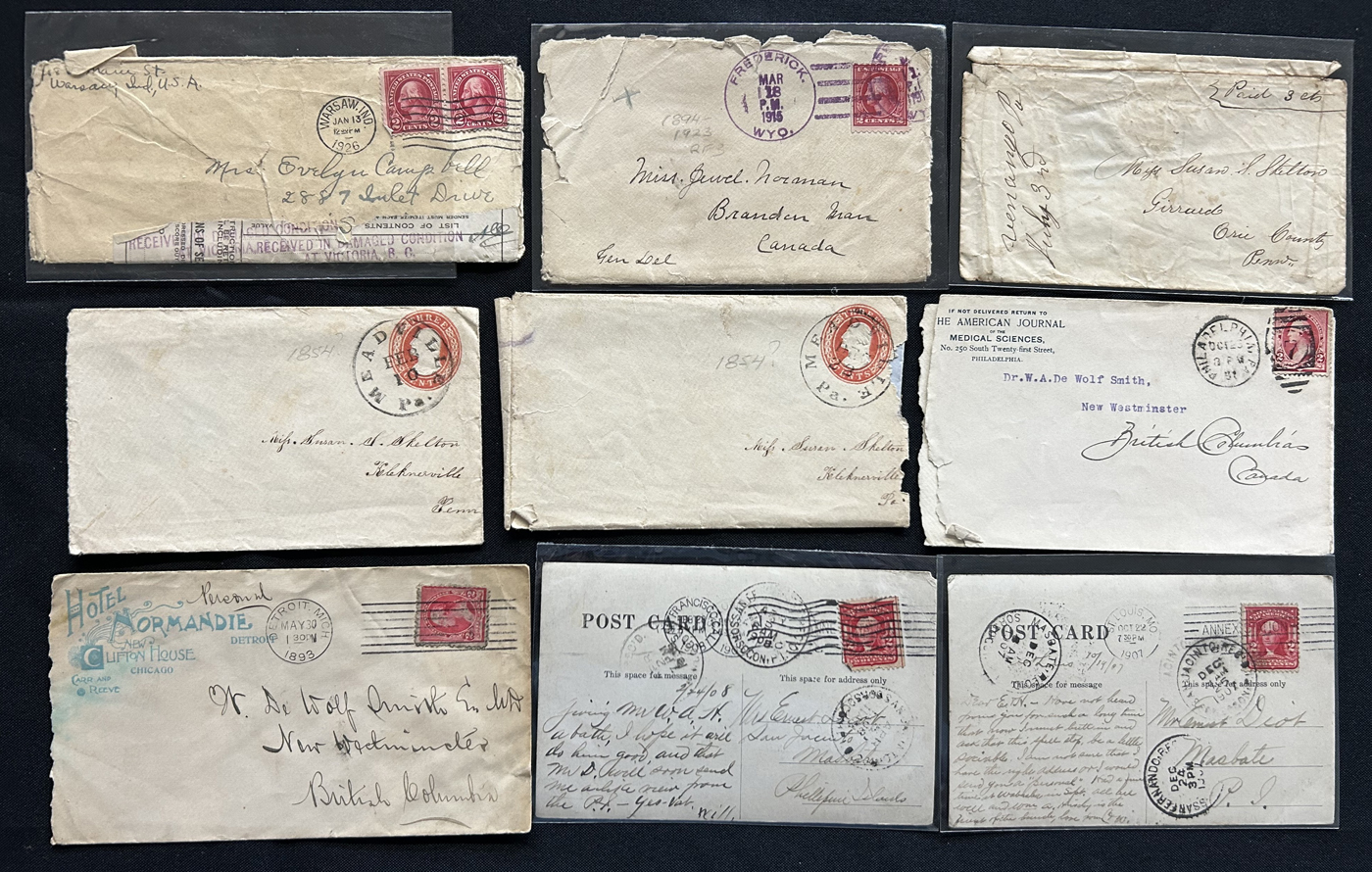 1343 PC/CVR   imageGroup of 8 Covers Plus 68 Picture Postcards from the United States, 1910s to 1920s, mostly collected by previous owner for town better postmarks (most of which are large circle duplex), 14 cards are labeled "scarcer postmarks" and we note postmarks in various colours (black, purple, red, green, etc.), some having RF factors and opening / closing dated. A useful, and overall fine or better group. All items photographed online. (Scan 1) (Scan 2) (Scan 3) (Scan 4) (Scan 5) (Scan 6) (Scan 7) (Scan 8) (All Scans)