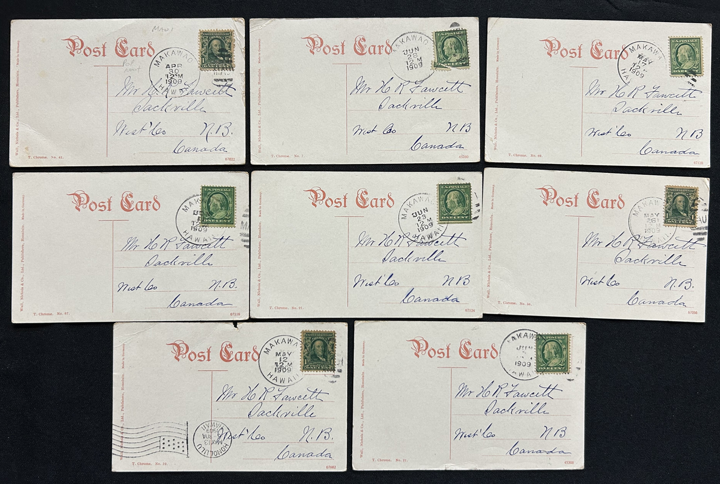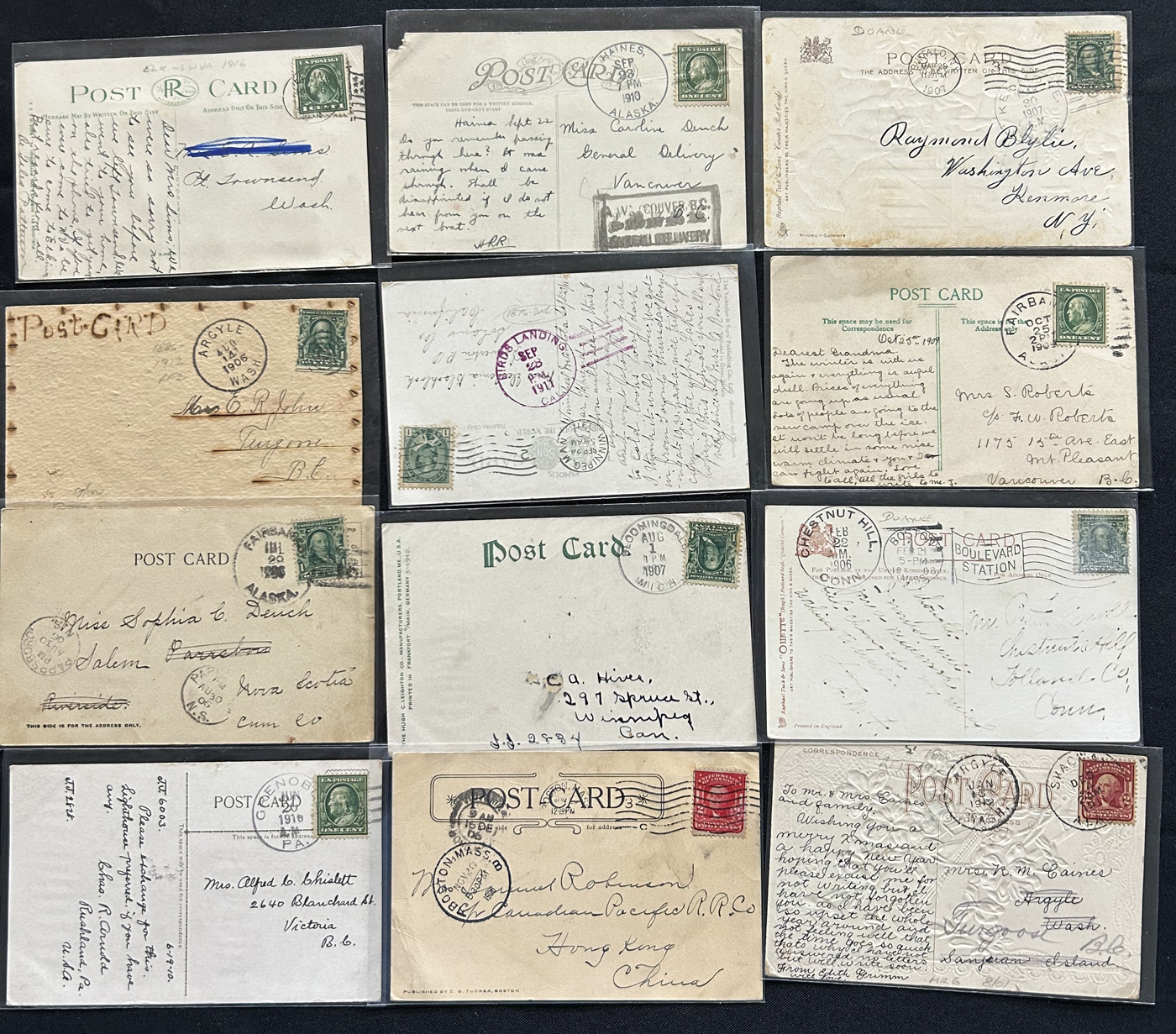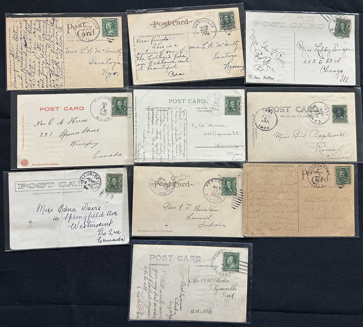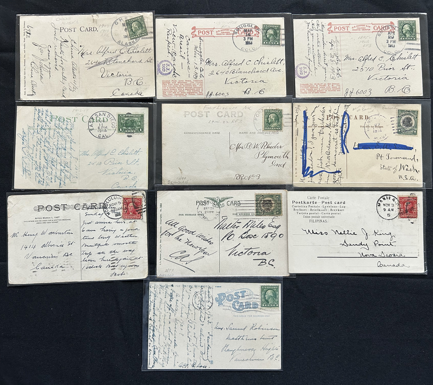 1343 PC/CVR   imageGroup of 8 Covers Plus 68 Picture Postcards from the United States, 1910s to 1920s, mostly collected by previous owner for town better postmarks (most of which are large circle duplex), 14 cards are labeled "scarcer postmarks" and we note postmarks in various colours (black, purple, red, green, etc.), some having RF factors and opening / closing dated. A useful, and overall fine or better group. All items photographed online. (Scan 1) (Scan 2) (Scan 3) (Scan 4) (Scan 5) (Scan 6) (Scan 7) (Scan 8) (All Scans)
