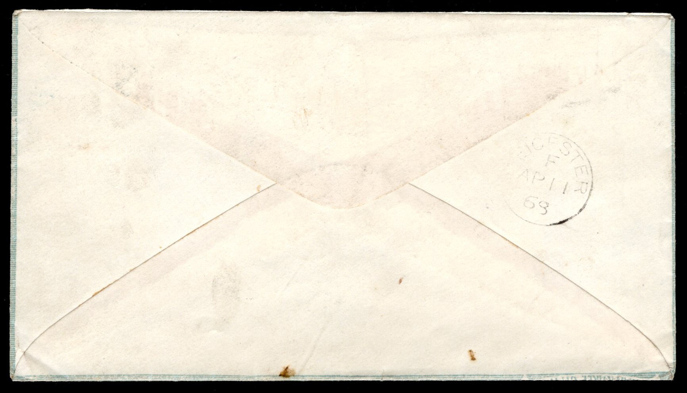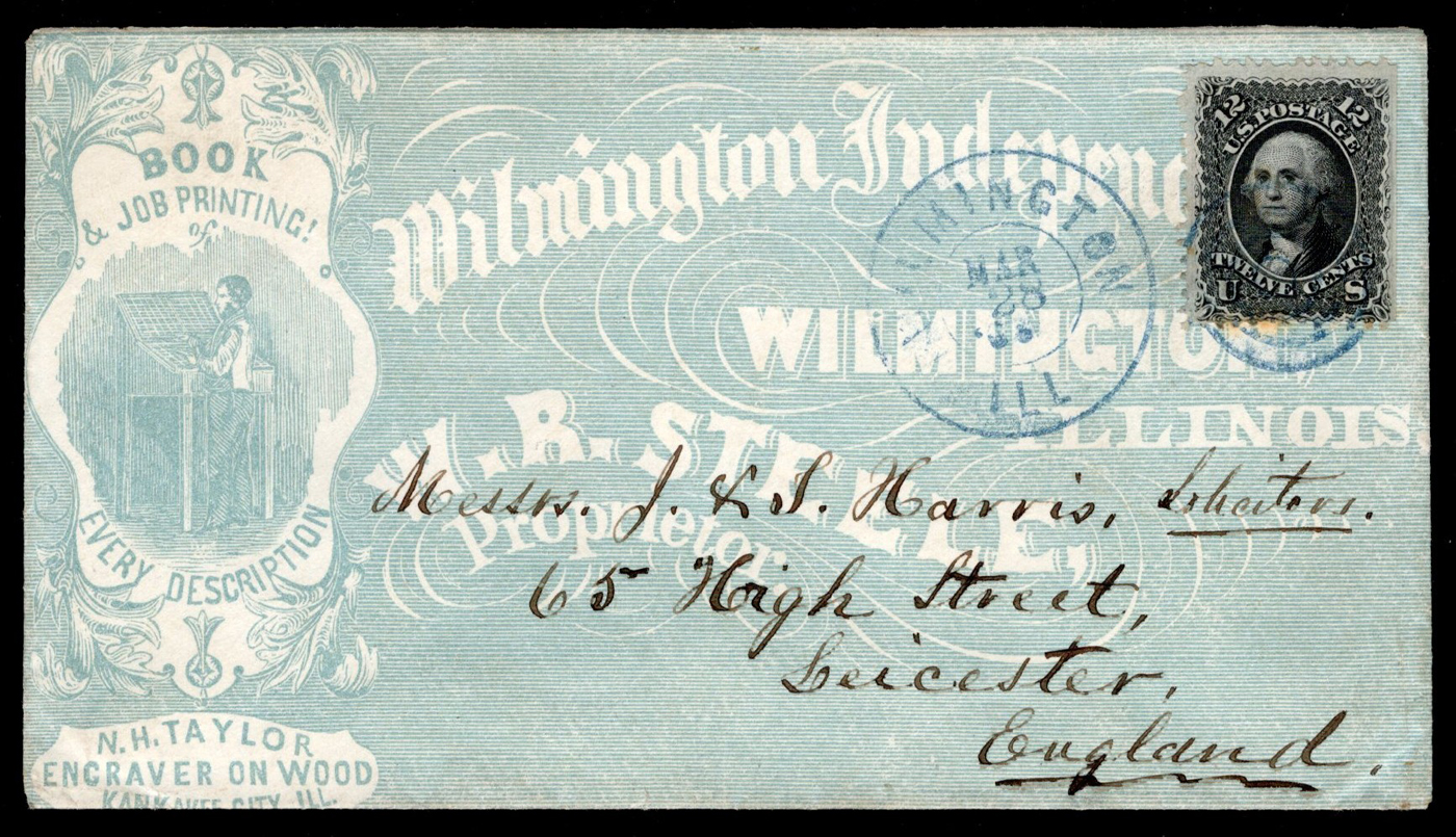 1346 CVR 69 image12c Black Washington on 1868 All-Over Illustrated Cover to England, mailed from Wilmington Illinois on MAR.28.1868 (duplex in blue) to Leicester, England (APR.11.1868 receiver on back), franked with a fine 12c black Washington with a straight edge at right. The cover is from the Wilmington Independent and shows a fully engraved lavish illustration of a typesetter at work, etc. A very clean and lovely cover, rarely seen this nice, very fine. (Scan 1) (Scan 2) (All Scans)