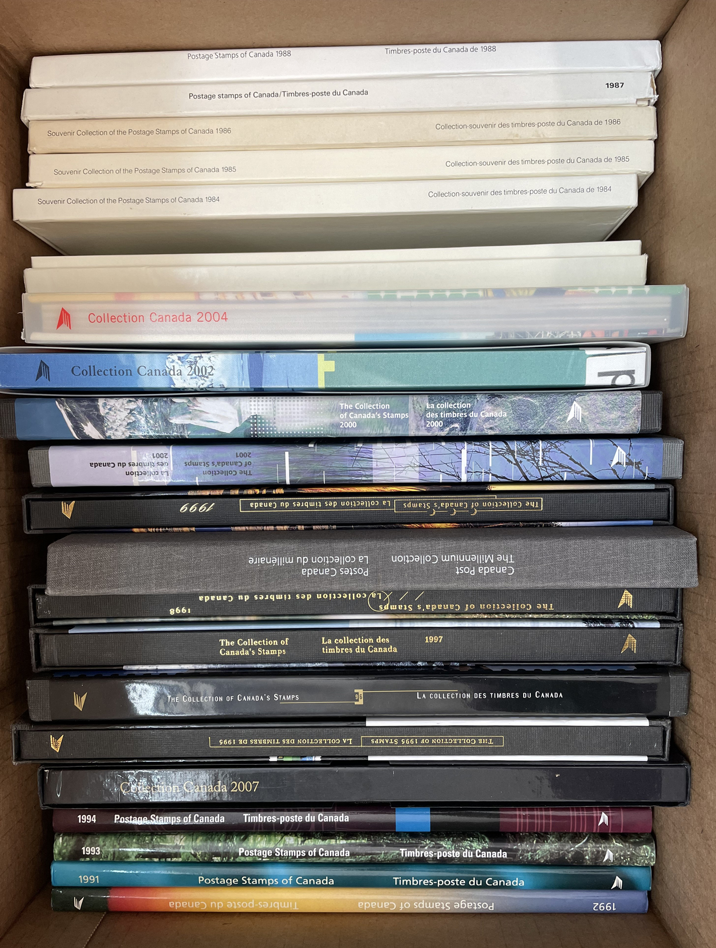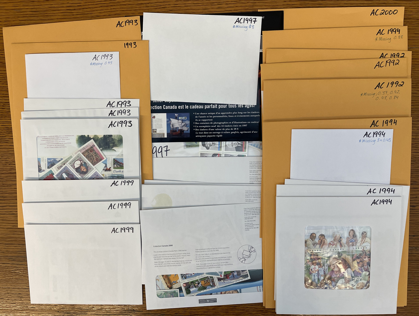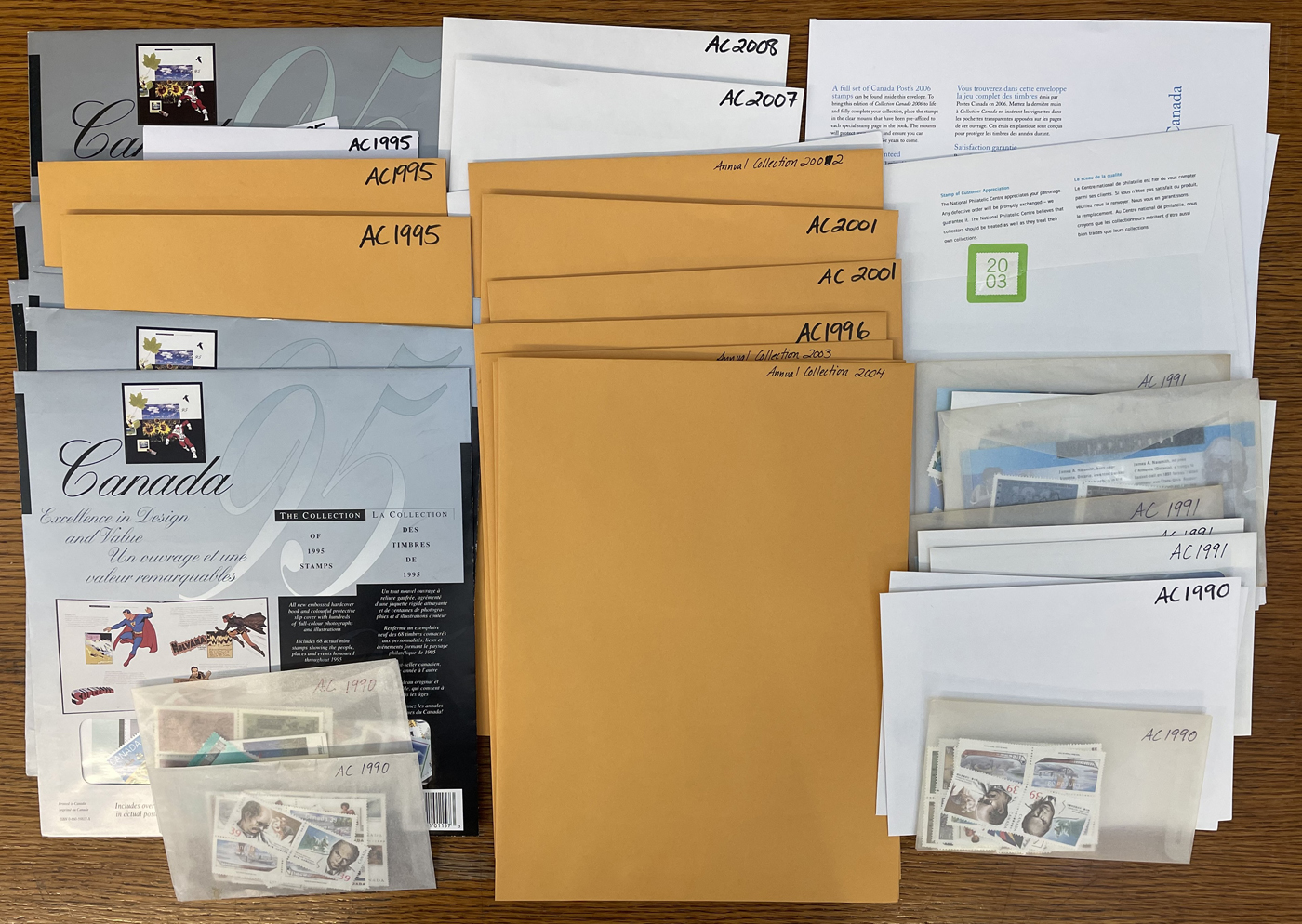 1451 nh   imageGroup of 77 Annual Collections in Individual Envelopes, 1990-2008, with stamps removed from the collector books and put into neatly organized envelopes, or still in the original Canada Post packaging, from years: 1990 (x5), 1991 (x6), 1992 (x4), 1993 (x7), 1994 (x9), 1995 (x12), 1996 (x2), 1997 (x2), 1999 (x4), 2000 (x10), 2001 (x4), 2002 (x3), 2003 (x2), 2004 (x2), 2005, 2006 (x2), 2007-2008. A clean lot, ideal for collectors, dealers, and postage users. (Scan 1) (Scan 2) (Scan 3) (All Scans)