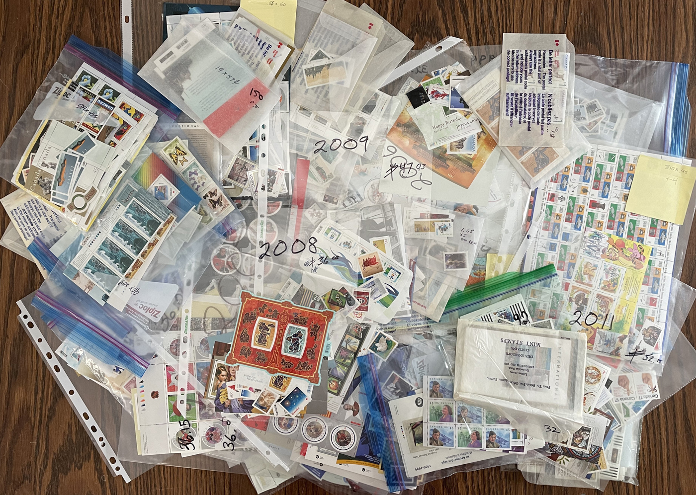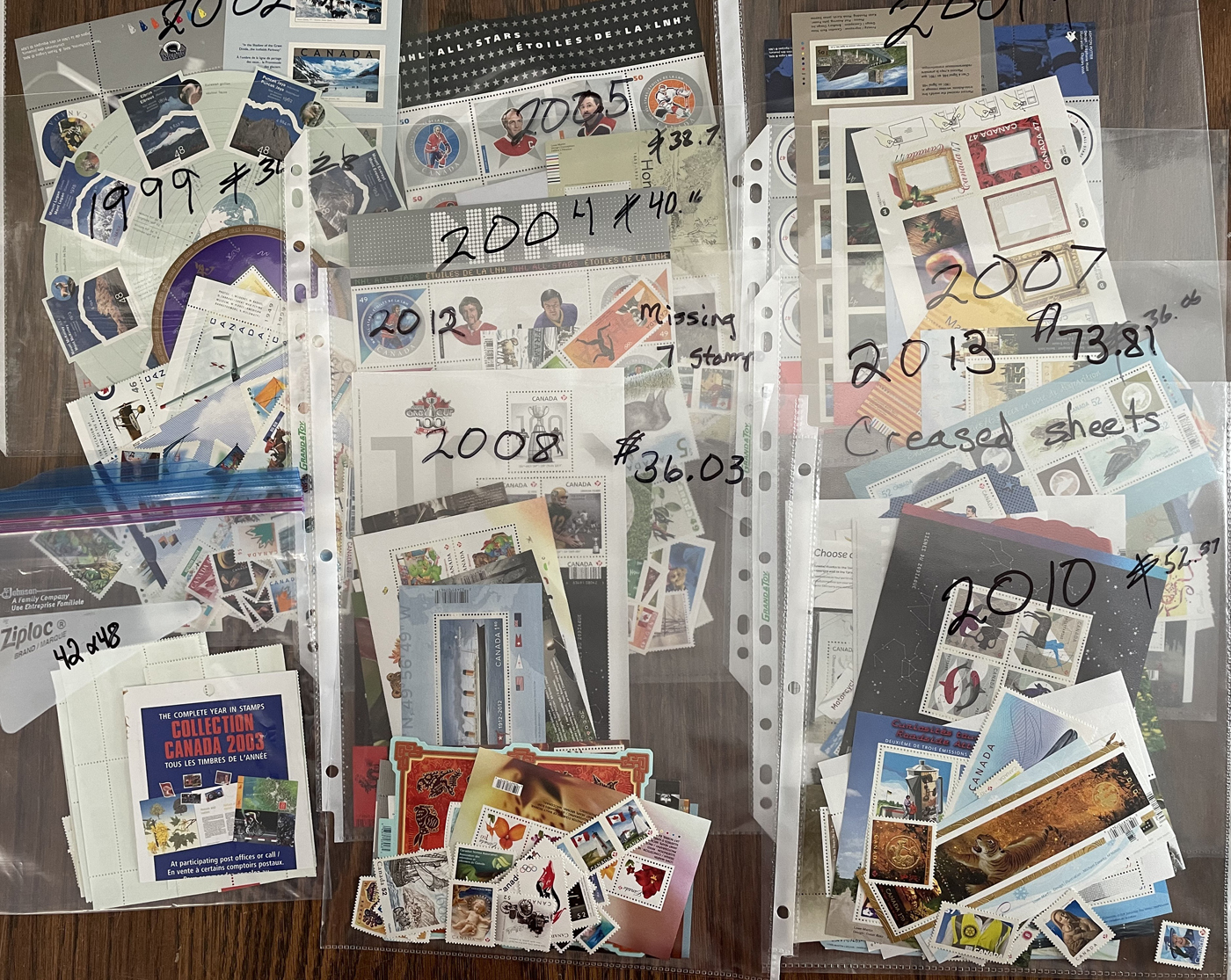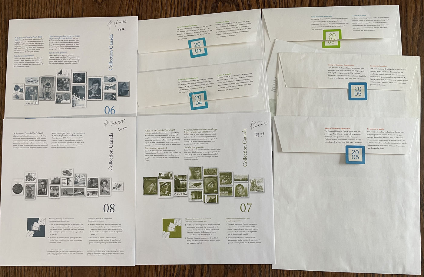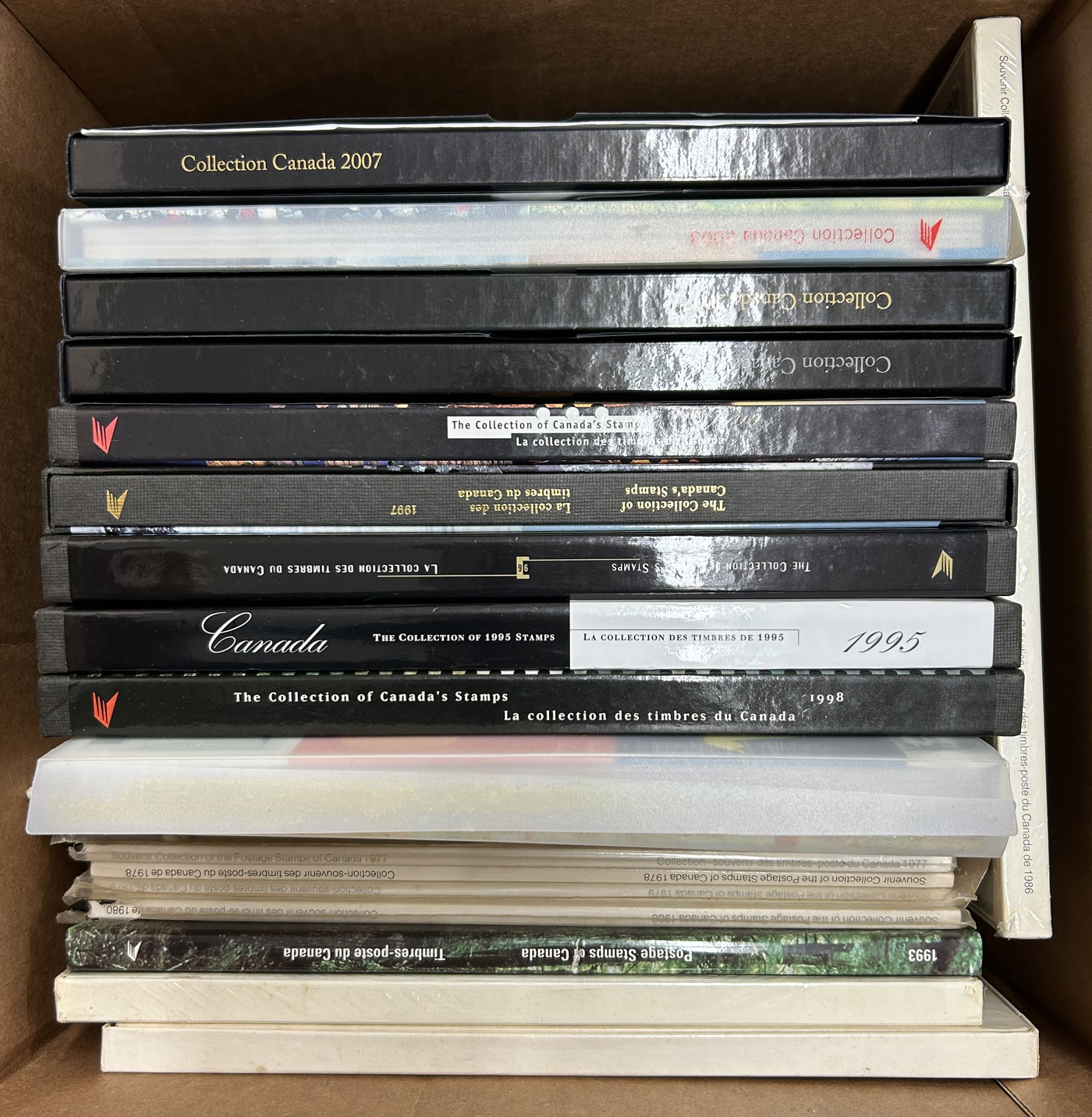 1451 nh   imageGroup of 77 Annual Collections in Individual Envelopes, 1990-2008, with stamps removed from the collector books and put into neatly organized envelopes, or still in the original Canada Post packaging, from years: 1990 (x5), 1991 (x6), 1992 (x4), 1993 (x7), 1994 (x9), 1995 (x12), 1996 (x2), 1997 (x2), 1999 (x4), 2000 (x10), 2001 (x4), 2002 (x3), 2003 (x2), 2004 (x2), 2005, 2006 (x2), 2007-2008. A clean lot, ideal for collectors, dealers, and postage users. (Scan 1) (Scan 2) (Scan 3) (All Scans)