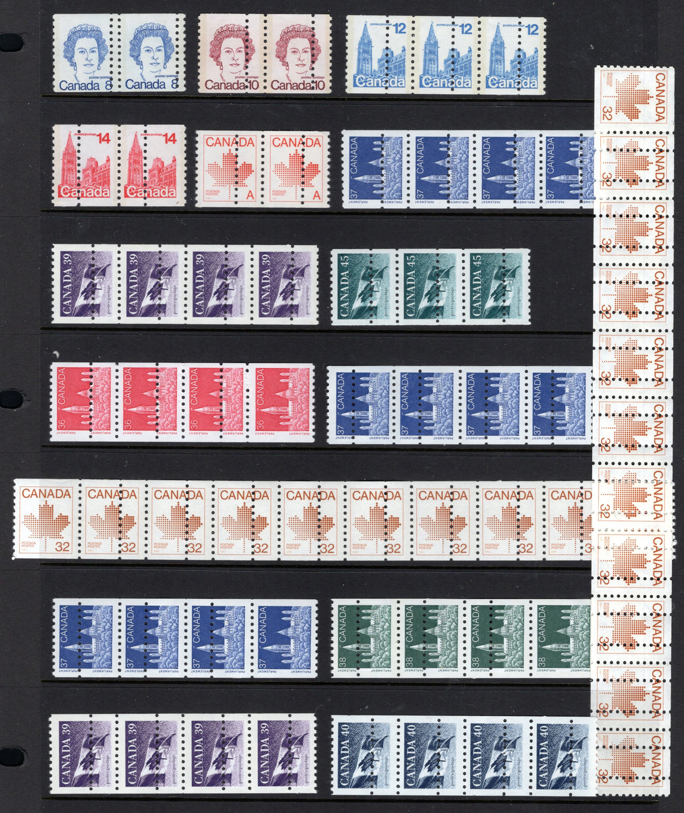 1449 nh 604/1396 imageCollection of 16 Coil Multiples with Extra Perforations, with 4 pairs, 2 strips of three, 8 strips of four, 1 strip of 10 and a strip of eleven, each with one or more extra row of perforations. The issues are Scott #s 604, 605, 729, 730, 908, 951, 953, 1194 (x3), 1194A, 1194B (x2), 1194C and 1396. Assumed as all fakes, but unsubstantiated as such, as it is difficult to ascertain genuineness on small multiples. We are selling this lot as is, for research purposes only. Accompanied by an in-depth article written by John Jamieson and Léopold Beaudet on this subject.