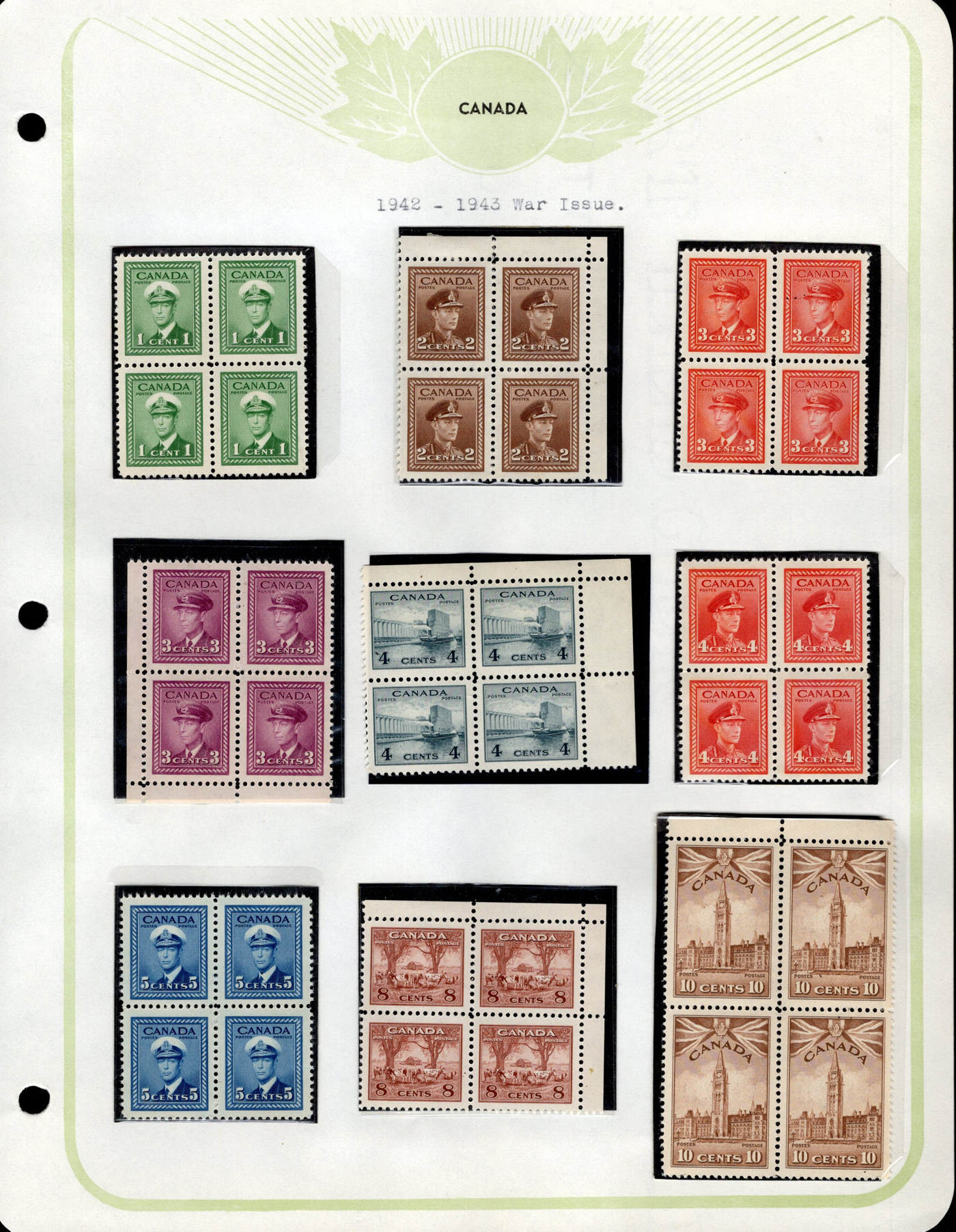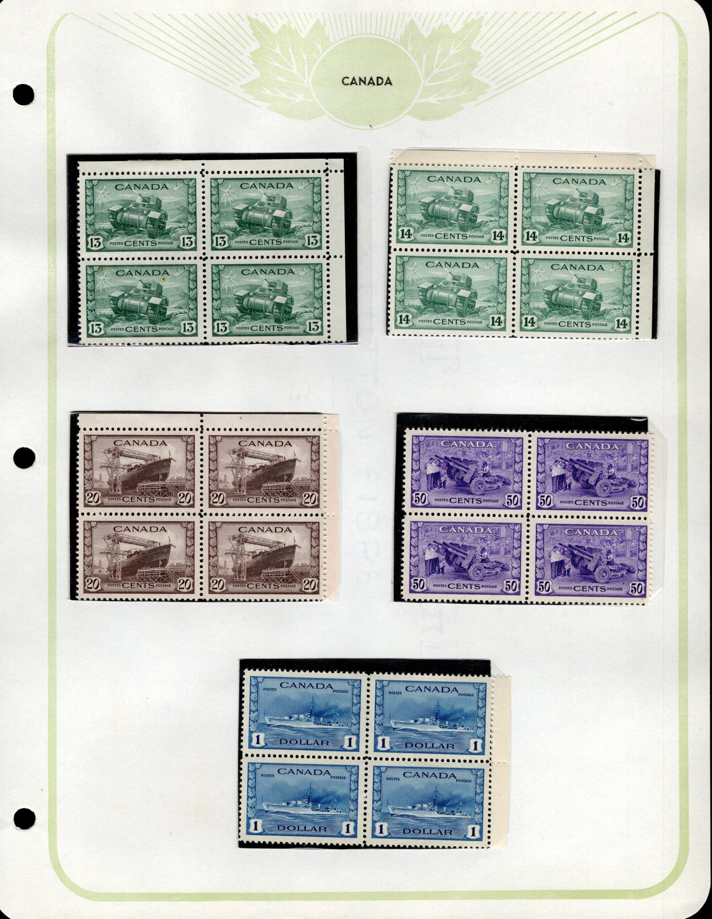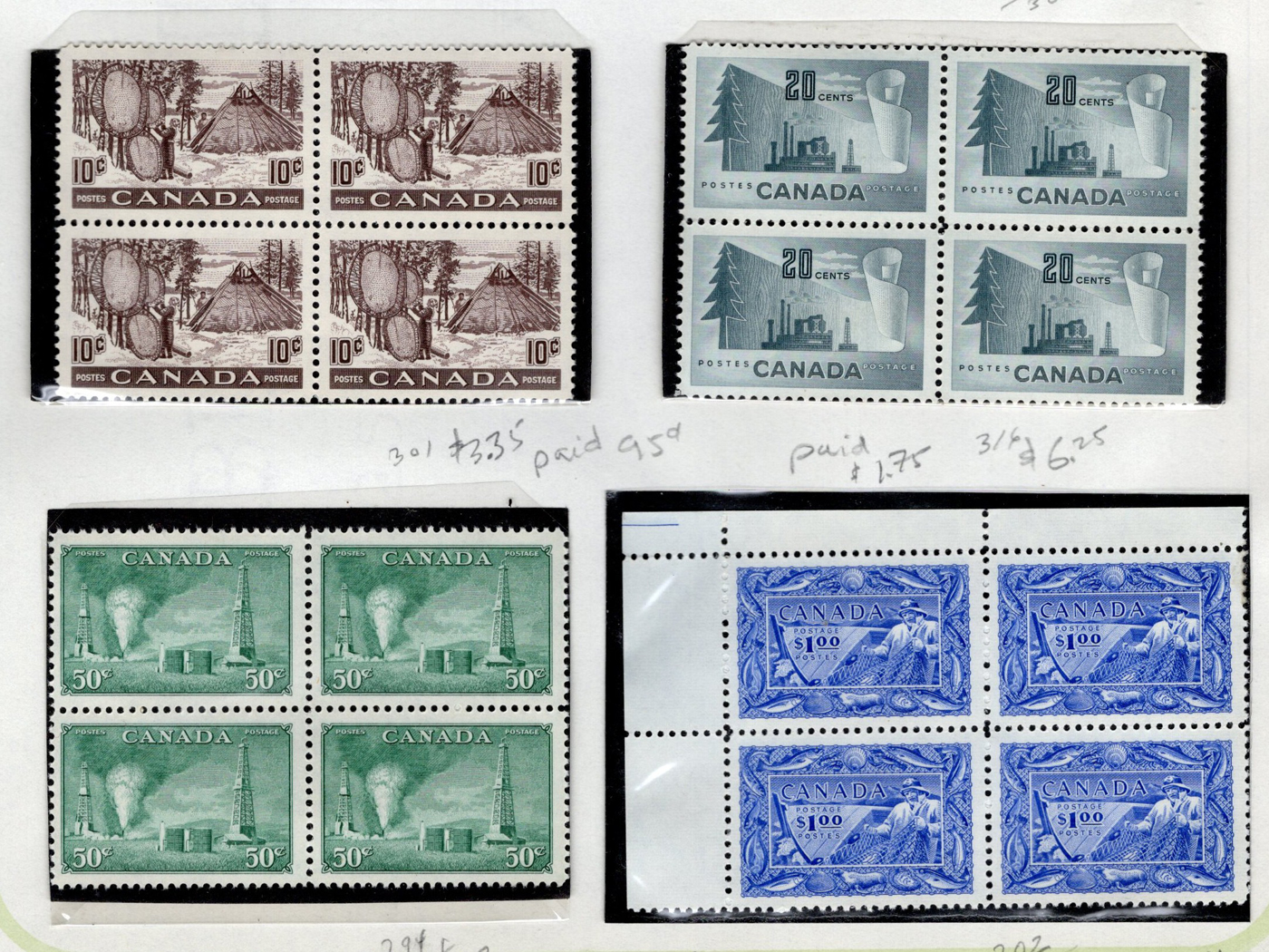 1445 og/nh 249/315 imageCollection of Mint Blocks of Four, 1942 to 1951, we counted 57 different blocks of four in the period, including complete War set (with two blocks of the 50c), complete Peace set, 50c Oil Wells, $1 Fisheries, etc. Owner's note indicate that most of the blocks have 3 NH and one hinged, and his older catalogue value was over $1,400, overall very fine. (Scan 1) (Scan 2) (Scan 3) (Scan 4) (Scan 5) (Scan 6) (Scan 7) (Scan 8) (Scan 9) (All Scans)