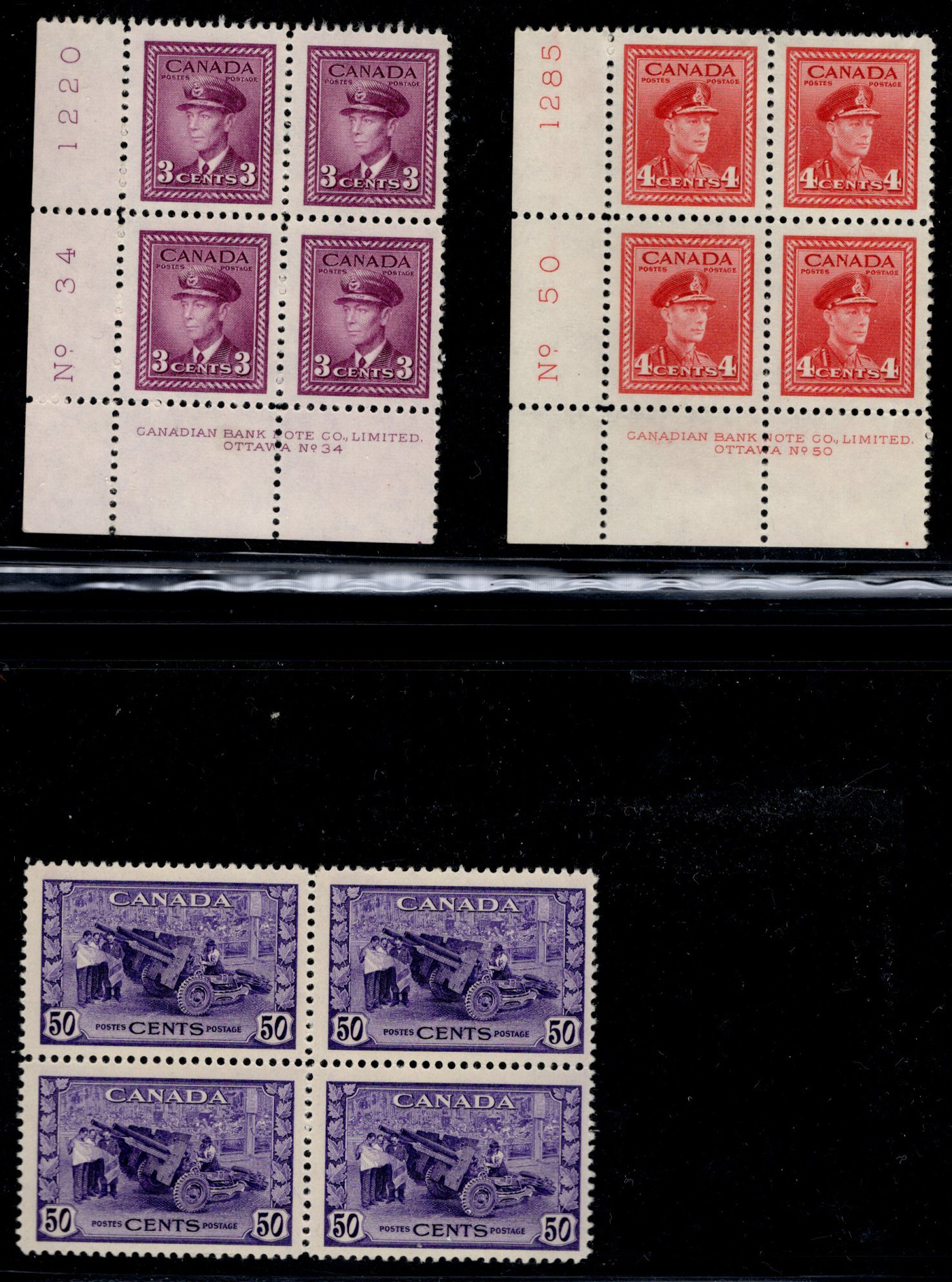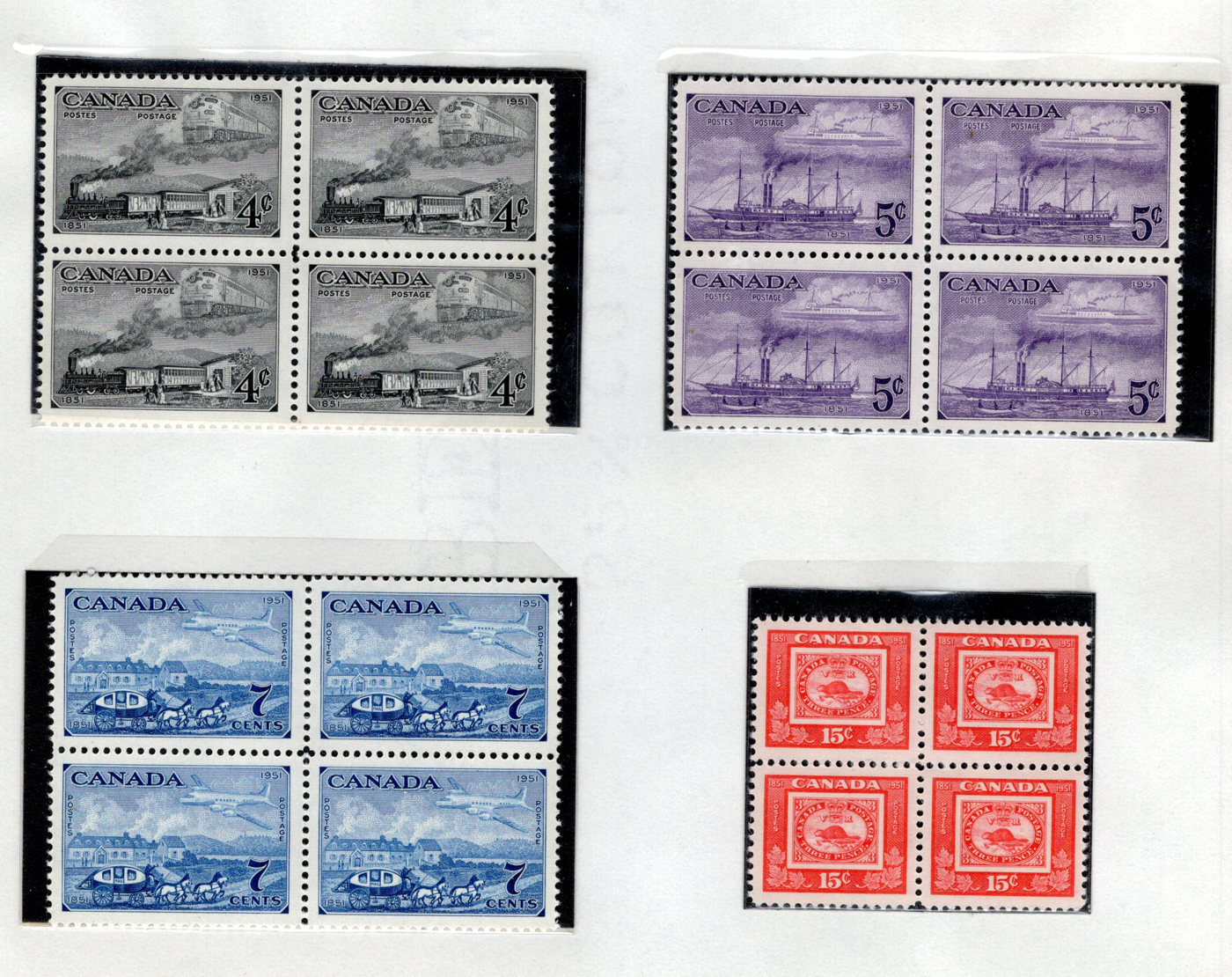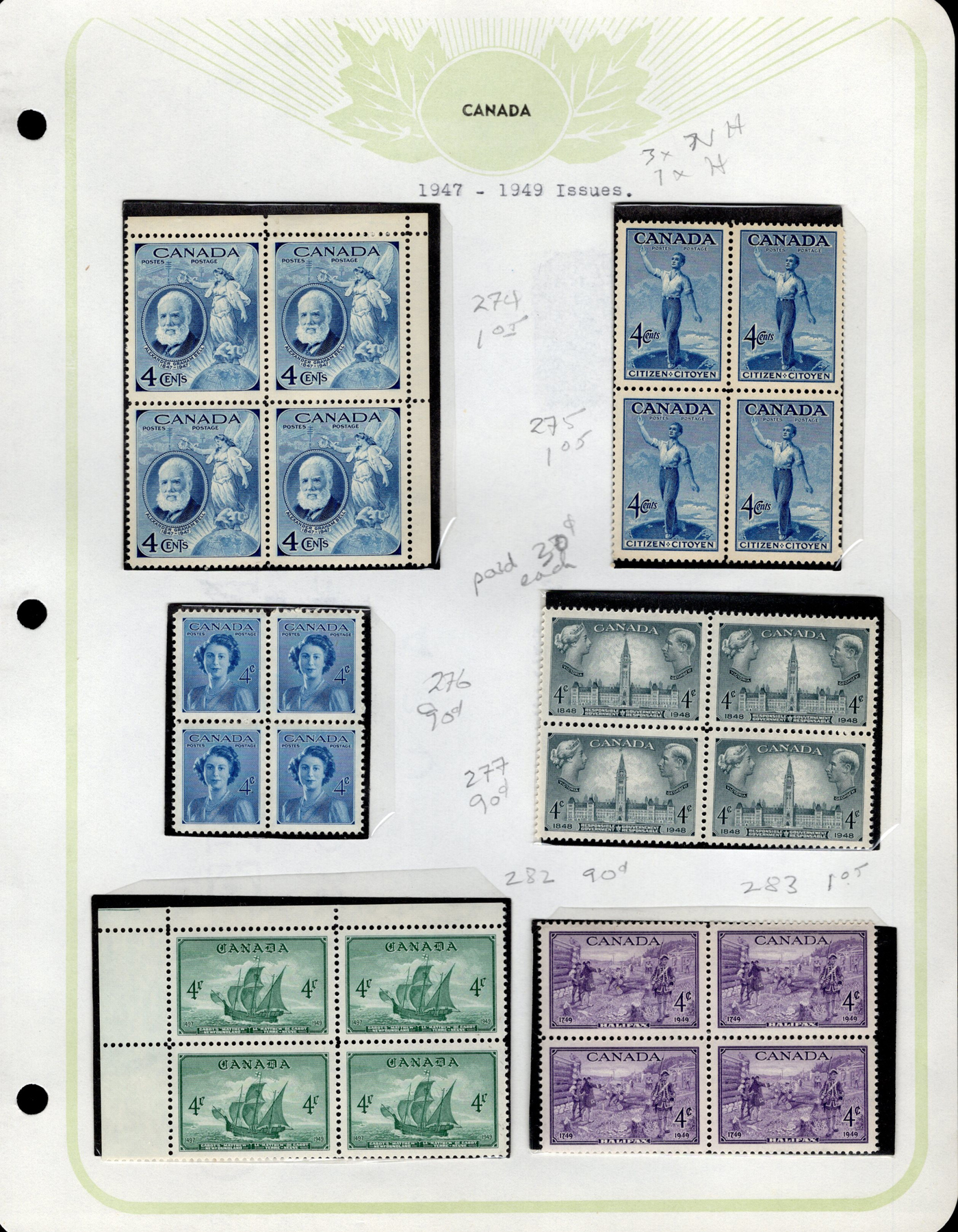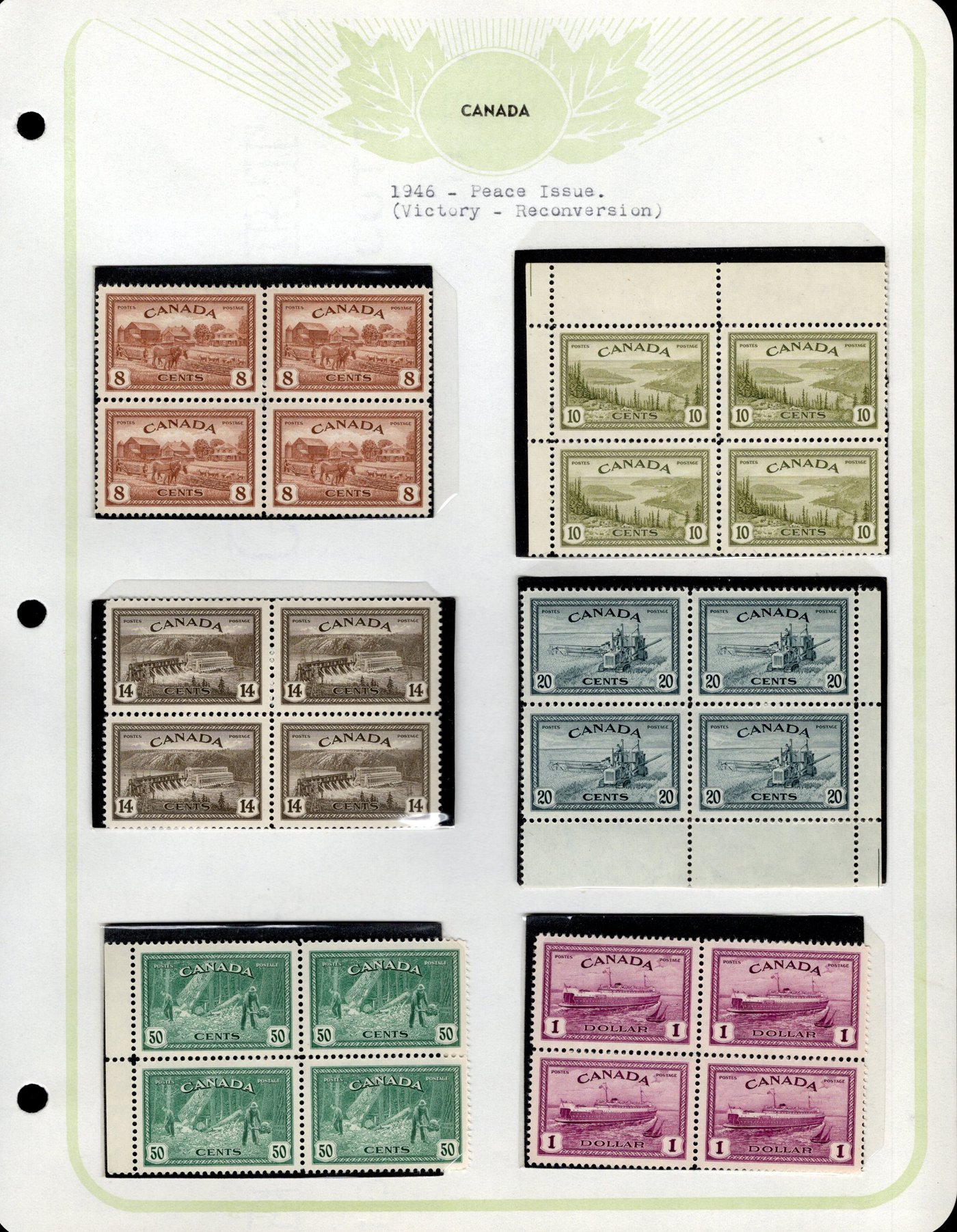 1445 og/nh 249/315 imageCollection of Mint Blocks of Four, 1942 to 1951, we counted 57 different blocks of four in the period, including complete War set (with two blocks of the 50c), complete Peace set, 50c Oil Wells, $1 Fisheries, etc. Owner's note indicate that most of the blocks have 3 NH and one hinged, and his older catalogue value was over $1,400, overall very fine. (Scan 1) (Scan 2) (Scan 3) (Scan 4) (Scan 5) (Scan 6) (Scan 7) (Scan 8) (Scan 9) (All Scans)