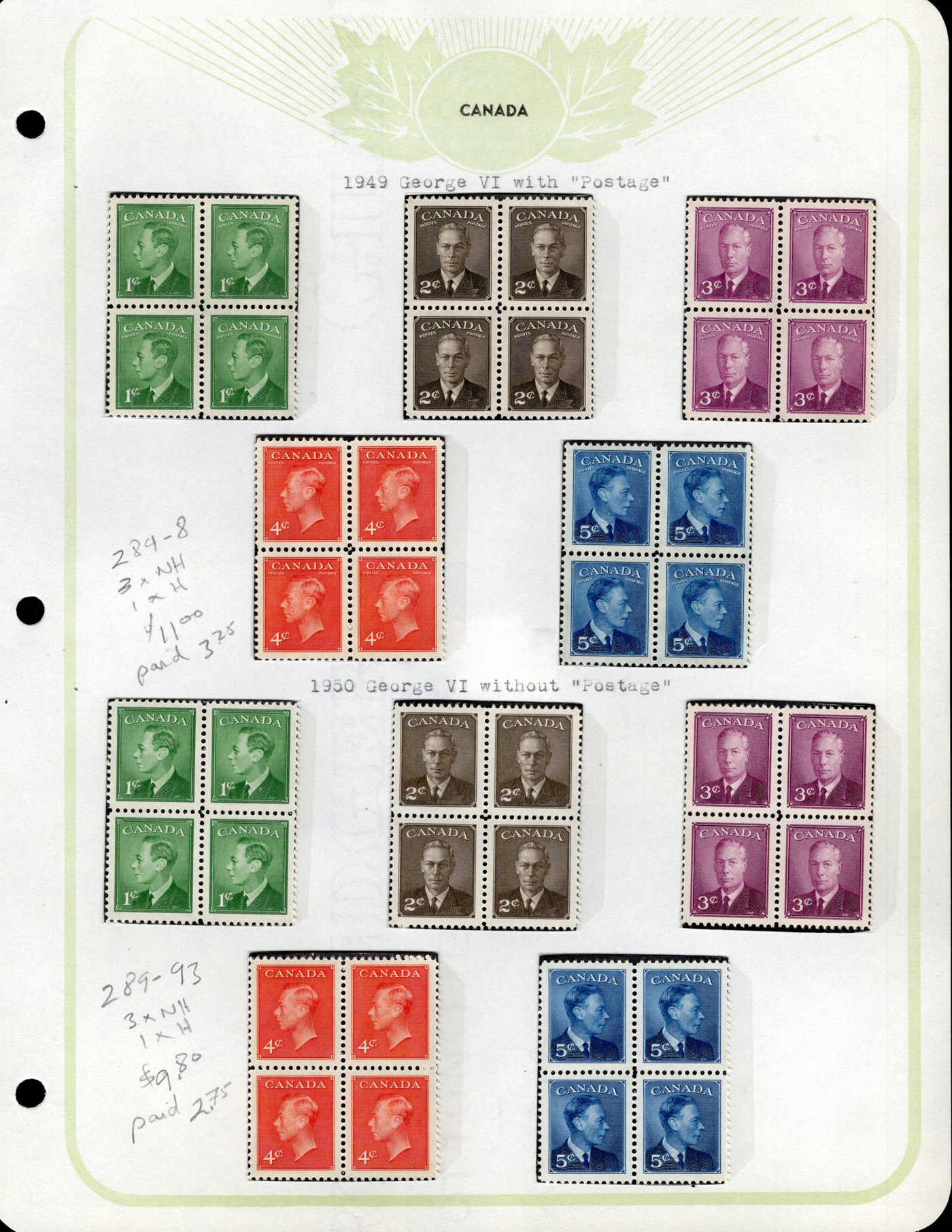 1448 nh 289/1228 imageCollection of Mint Canada in Four Volumes, 1950 to 1988, close to complete in range, starts off with singles, then turns into mostly blocks of four and plate blocks of every issue present. Also note the presence of souvenir sheets, several booklets and more. Overall very fine mint never hinged, previous owner counted face value of nearly $600. (Scan 1) (Scan 2) (Scan 3) (Scan 4) (Scan 5) (Scan 6) (Scan 7) (Scan 8) (Scan 9) (All Scans)