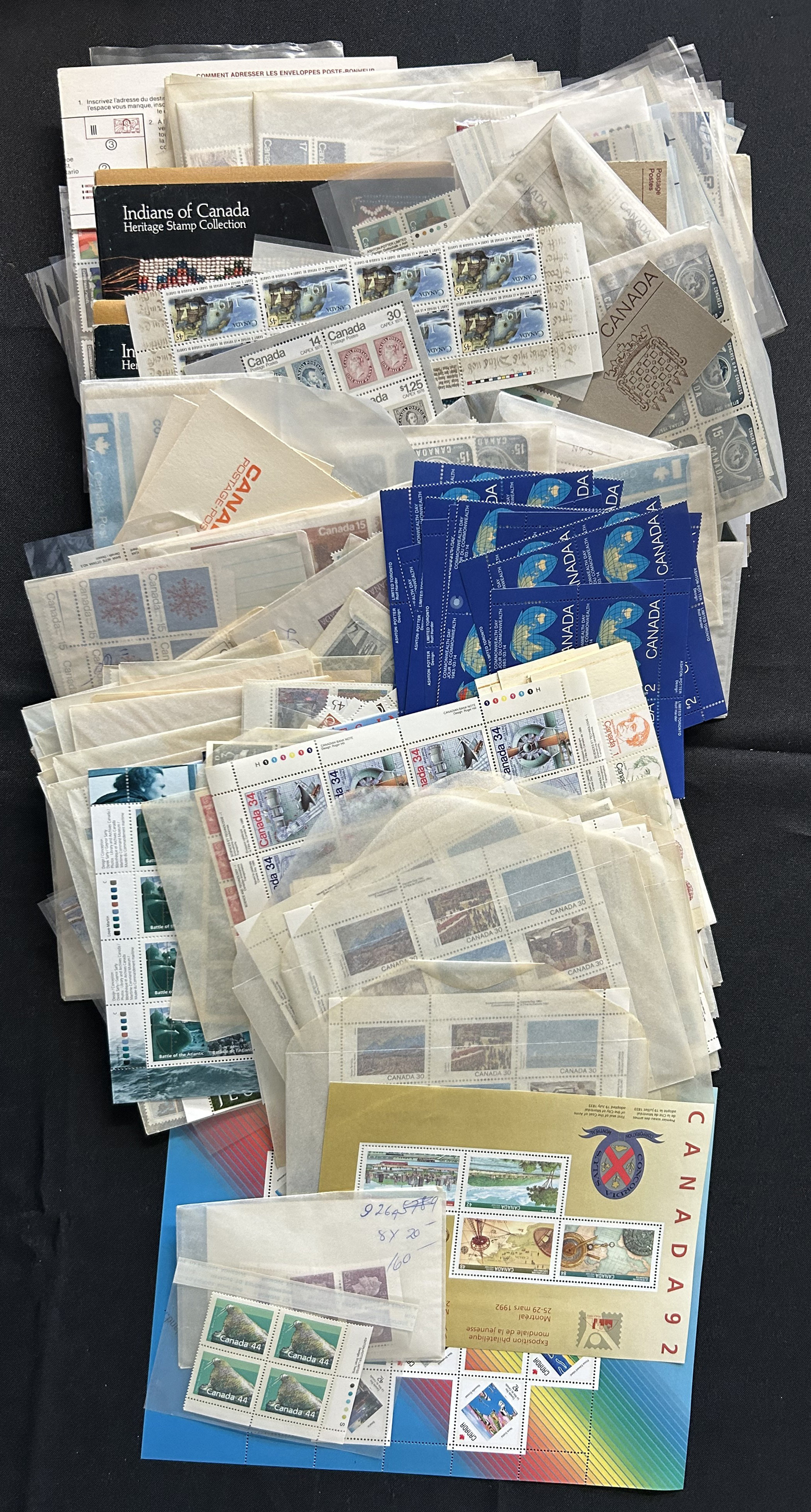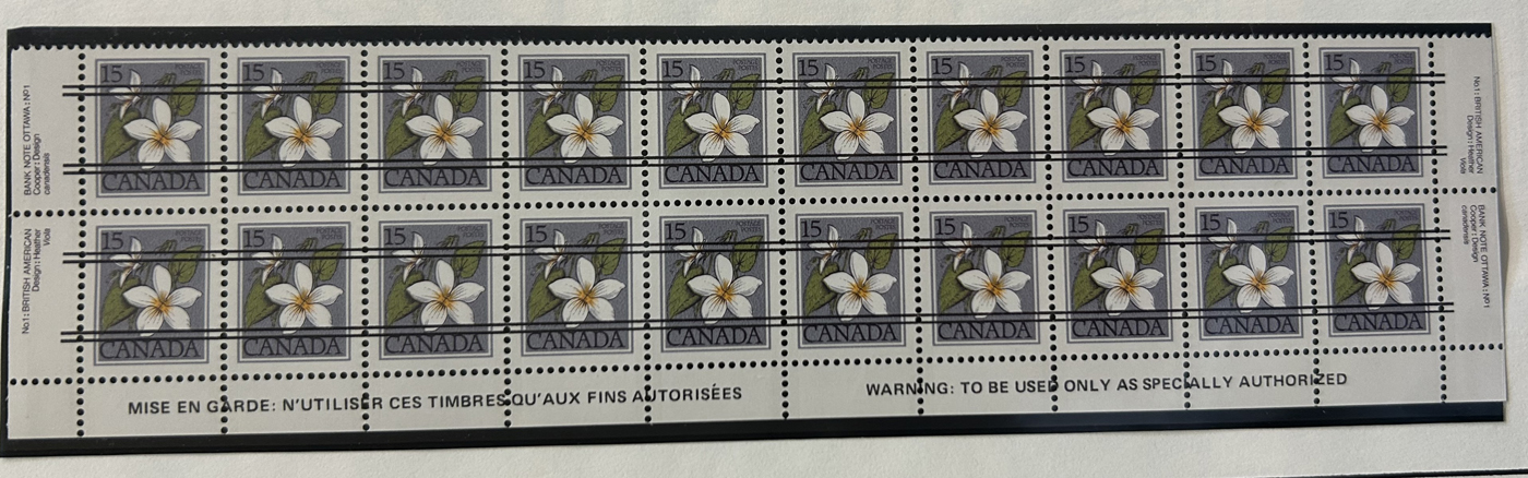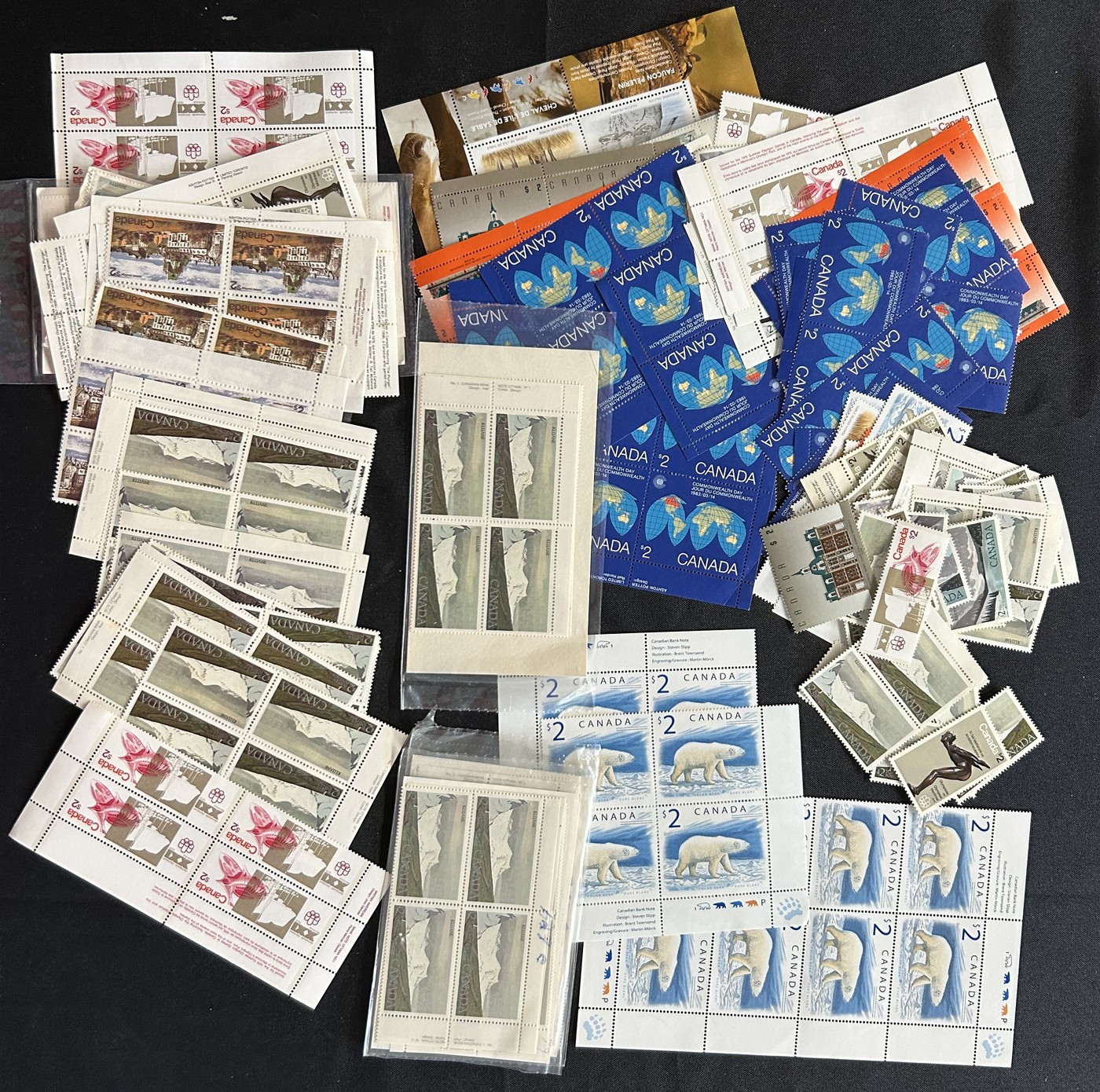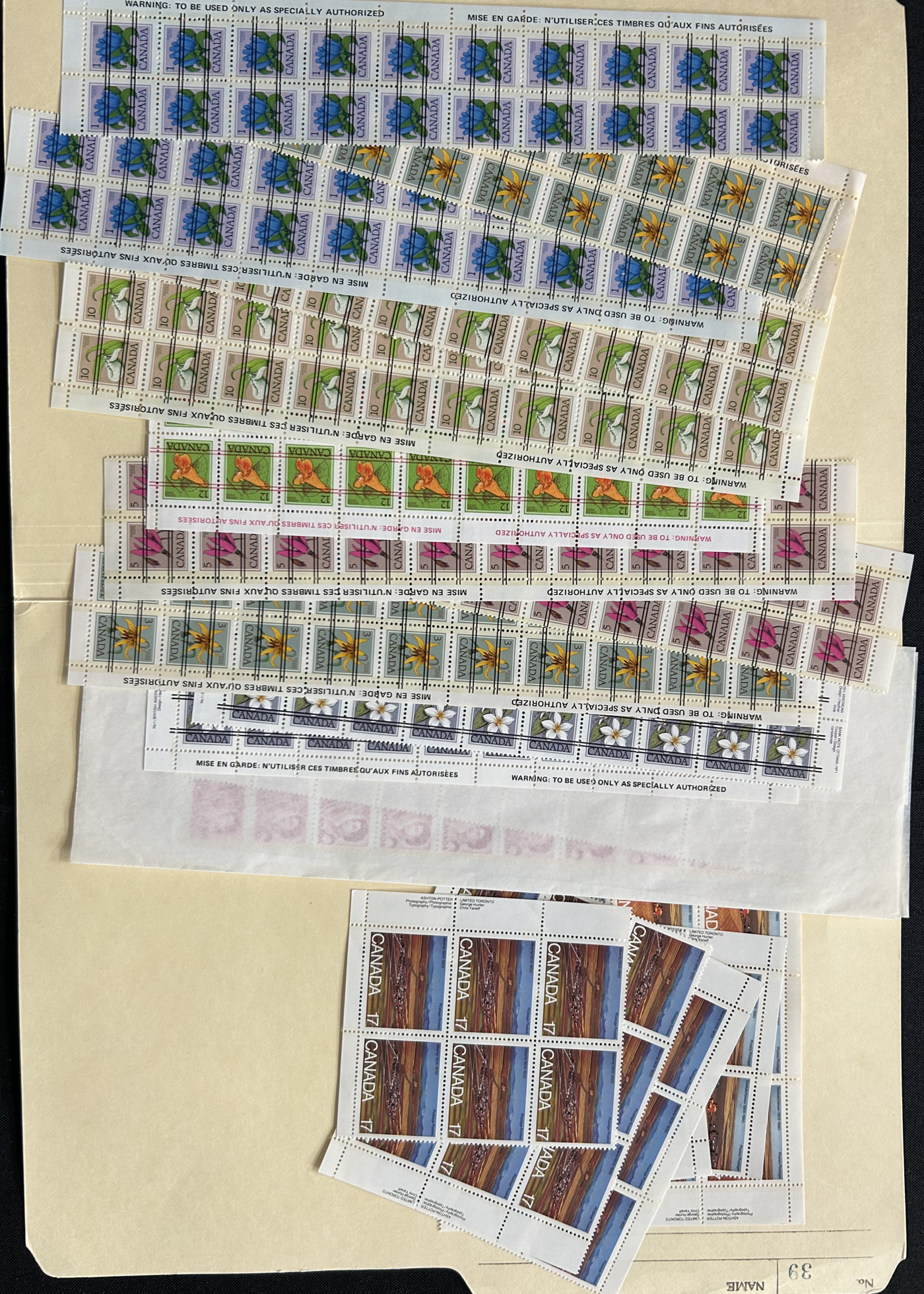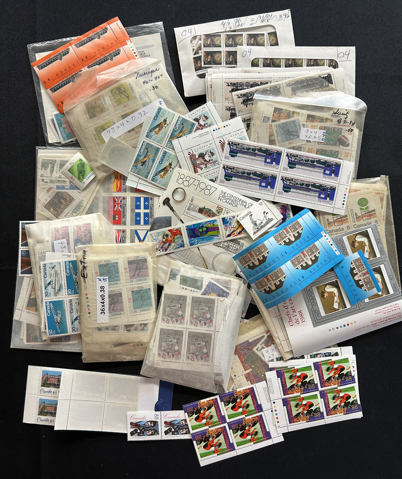 1455 nh   imageBox of Various Mint Canada Items, the vast majority being in the form of plate blocks (incl. a good quantity of matched sets), souvenir sheets and sheets, as well as singles and other multiples (all this was counted to $1,230 face). Also included is another box containing stamps that were not counted, including several Caricature and Centennial booklets, and 4 envelopes with scarce Bileski variety offerings. Last but not least is a collection of 11 precancel warning strips of 20. (Scan 1) (Scan 2) (Scan 3) (Scan 4) (All Scans)
