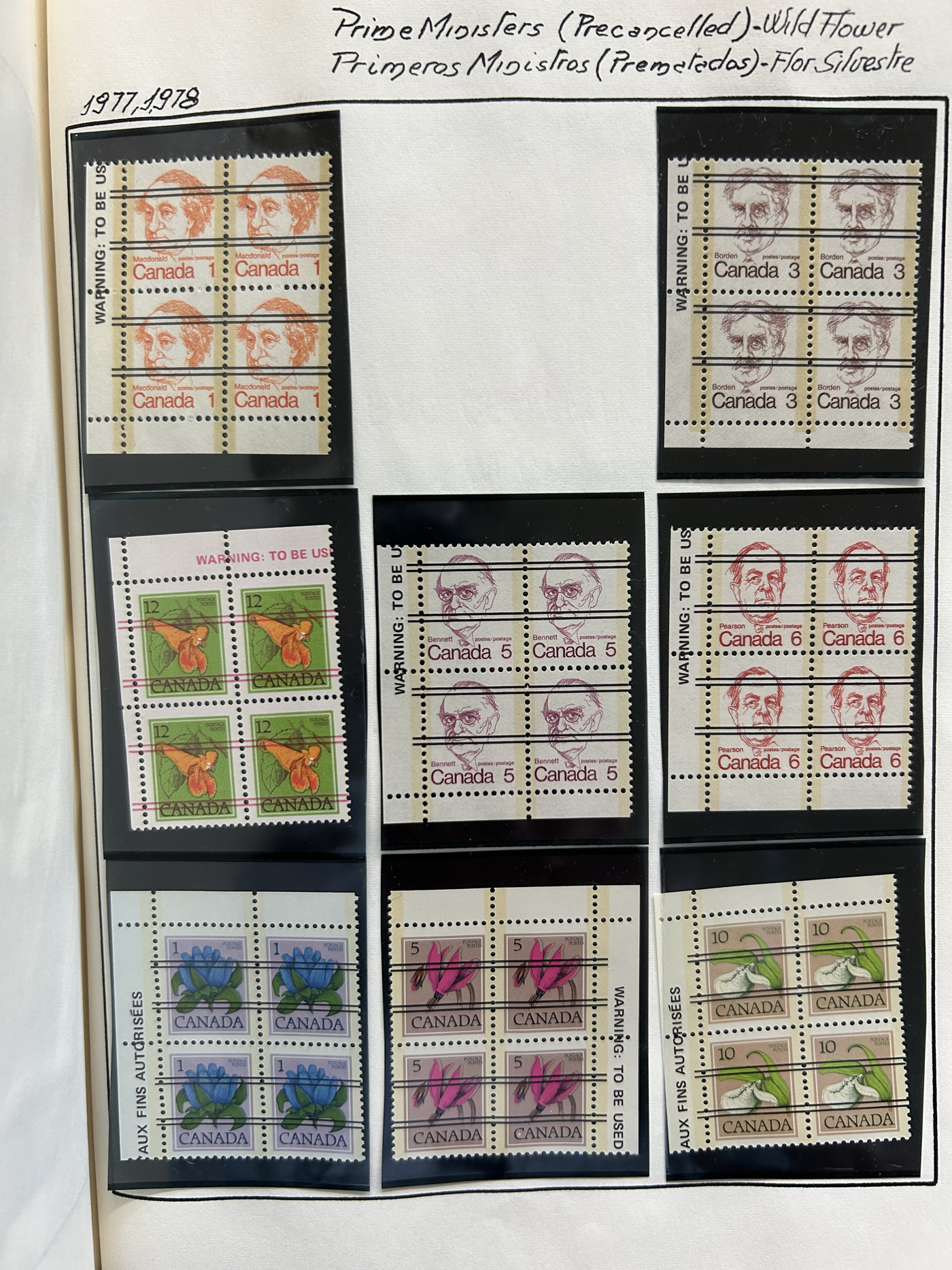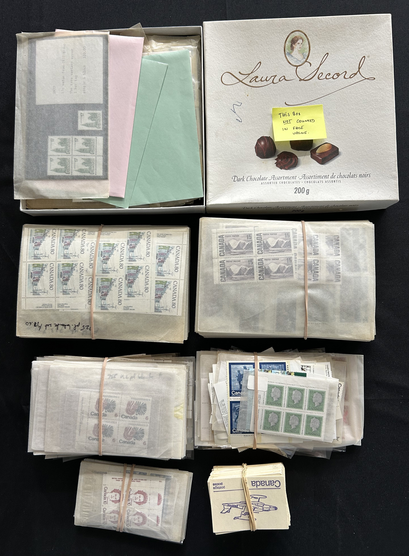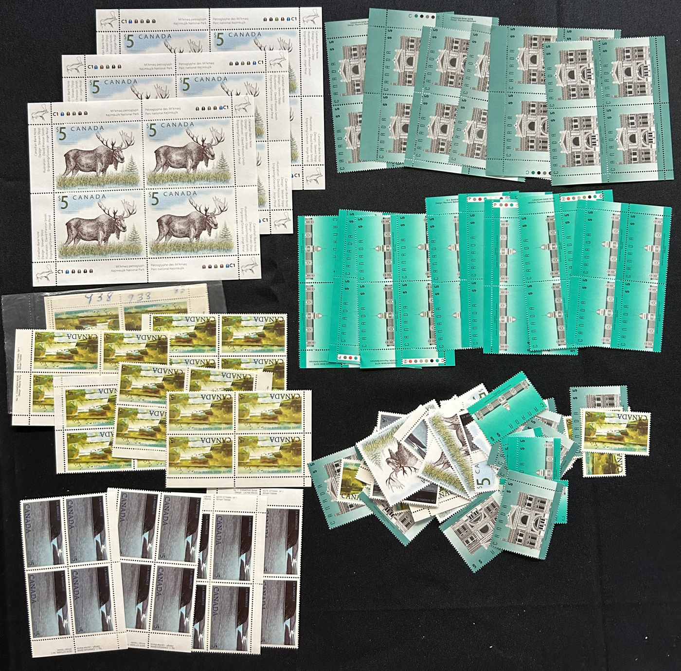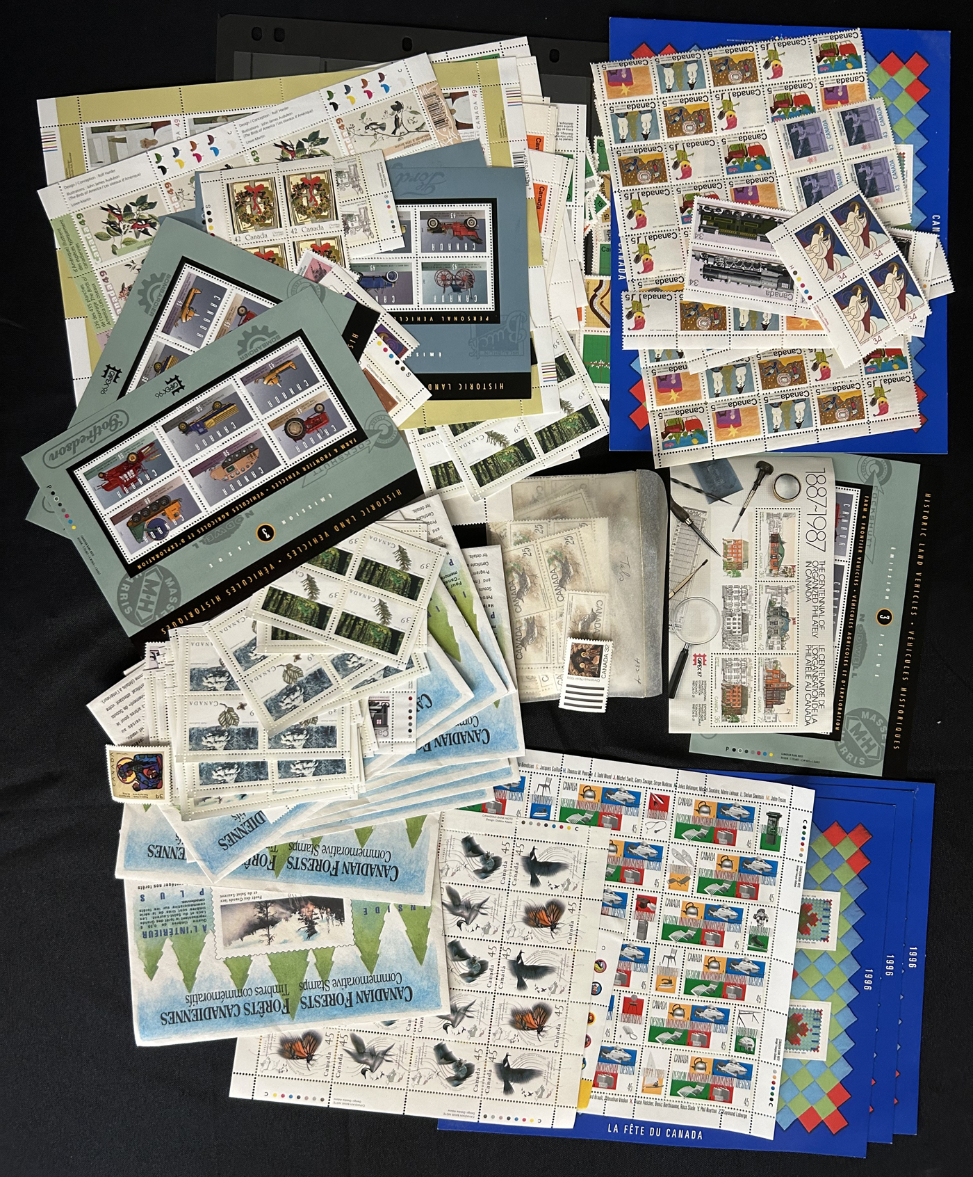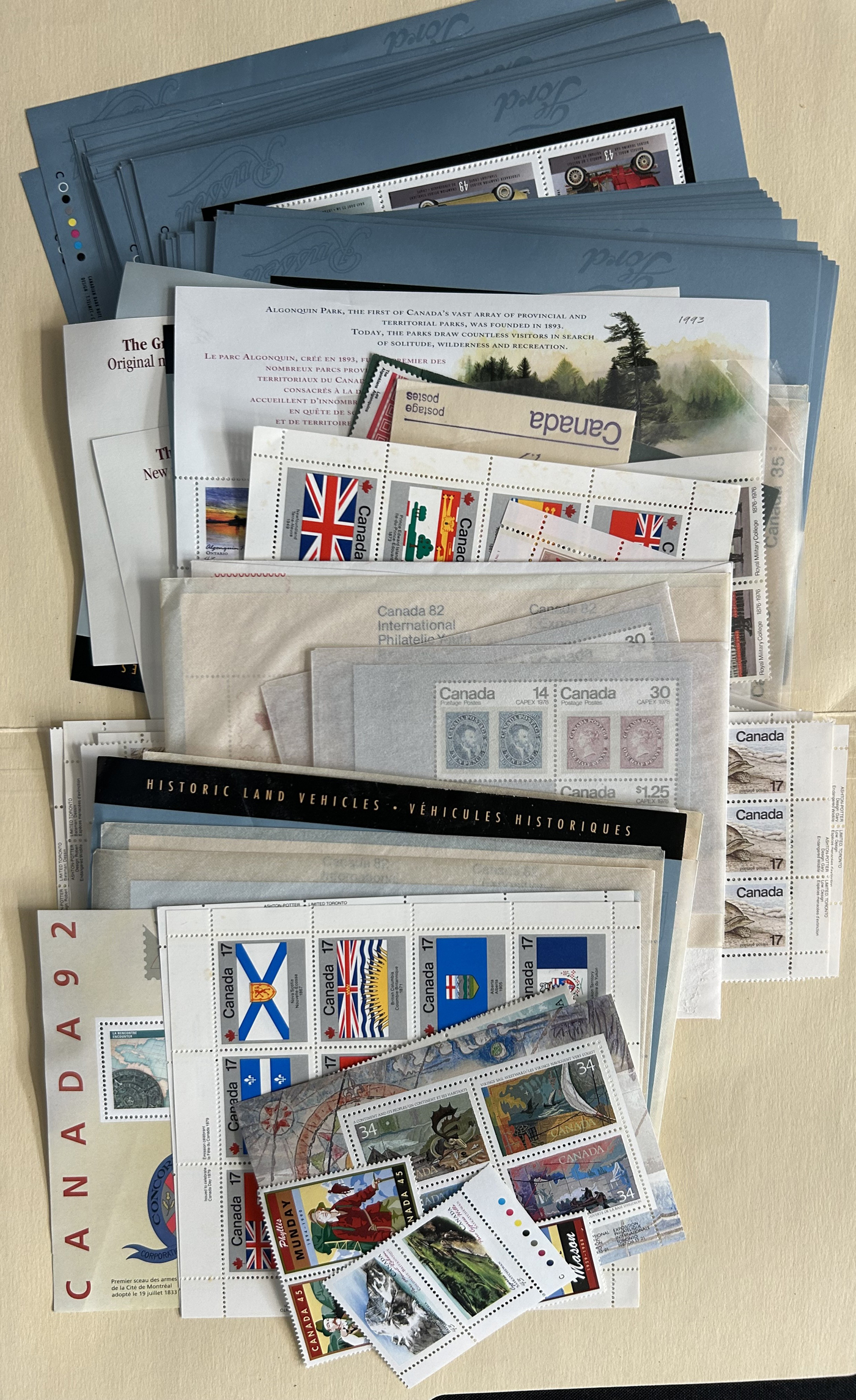 1455 nh   imageBox of Various Mint Canada Items, the vast majority being in the form of plate blocks (incl. a good quantity of matched sets), souvenir sheets and sheets, as well as singles and other multiples (all this was counted to $1,230 face). Also included is another box containing stamps that were not counted, including several Caricature and Centennial booklets, and 4 envelopes with scarce Bileski variety offerings. Last but not least is a collection of 11 precancel warning strips of 20. (Scan 1) (Scan 2) (Scan 3) (Scan 4) (All Scans)