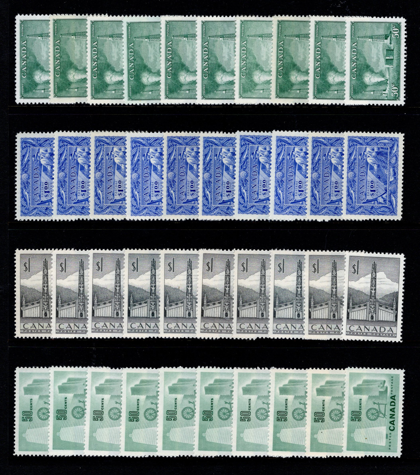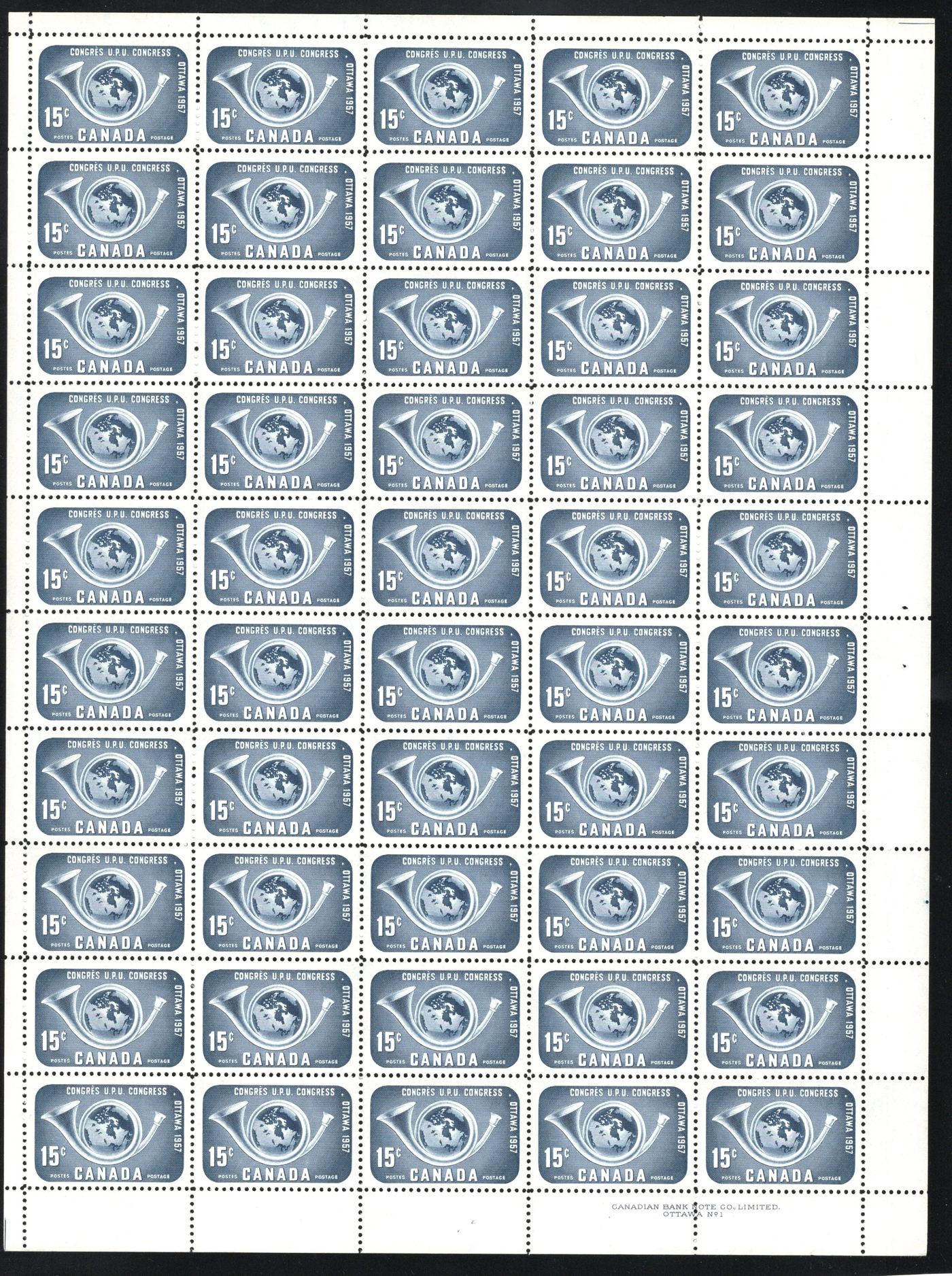 1447 nh 282/486 imageGroup of 64 Complete Mint Sheets, 1949 to 1968, with duplication of a few, mostly 4c and 5c issues, but also noted some KGVI definitives (1c to 4c without POSTES / POSTAGE"), the 15c issues #s 314, 415 (x2) and 486. A fresh and very fine lot, see pictures for a small sampling. (Scan 1) (Scan 2) (Scan 3) (Scan 4) (Scan 5) (Scan 6) (All Scans)