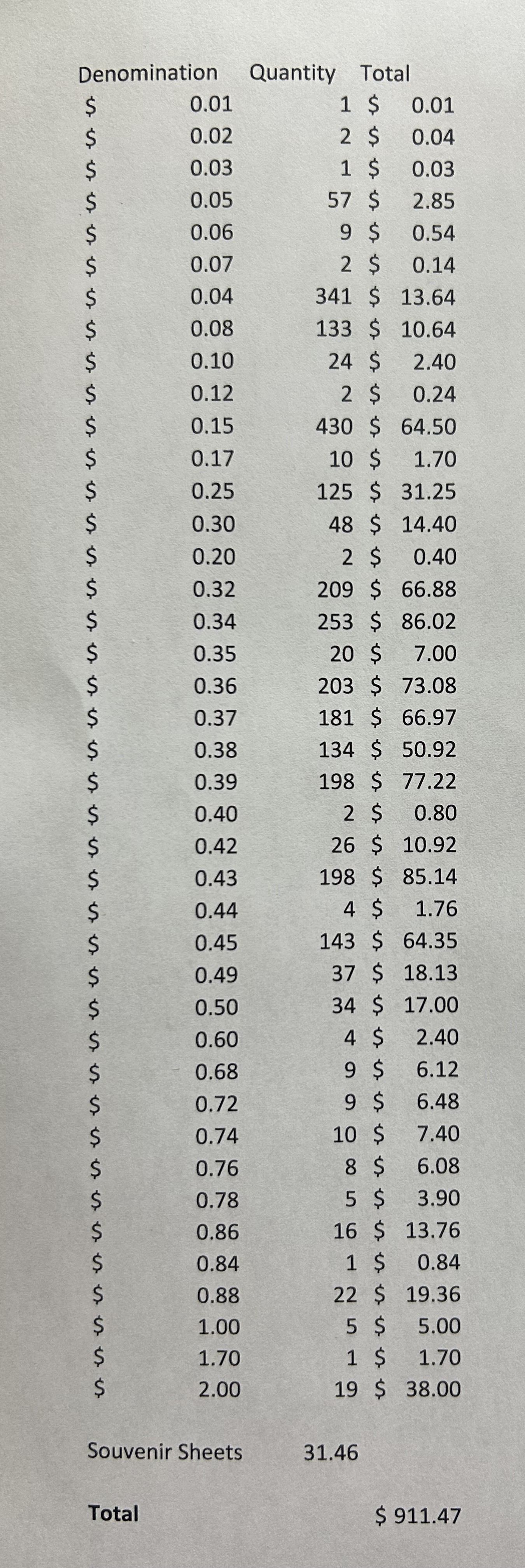 1458 og/nh   imageHuge Accumulation of Mint Face Value Postage, containing singles, blocks, souvenir sheets, sheetlets, booklet panes, and more, with the majority of the material ranging from the 1990s to the 2000s, neatly organized into plastic bags by either denomination or year of issue. Face value totals $4,259 (counting 17c up to $10 only, with the vast majority of stamps in the 40c and above range, including many stamps having denominations of $1 and above). The lot also includes at least 250x "P" denominations, counted at $1.24 each. Our photos show an overview of this large accumulation, ideal for the postage user or reseller. Very fine. (Scan 1) (Scan 2) (Scan 3) (Scan 4) (All Scans)