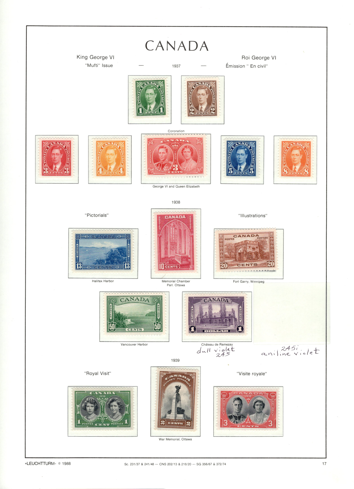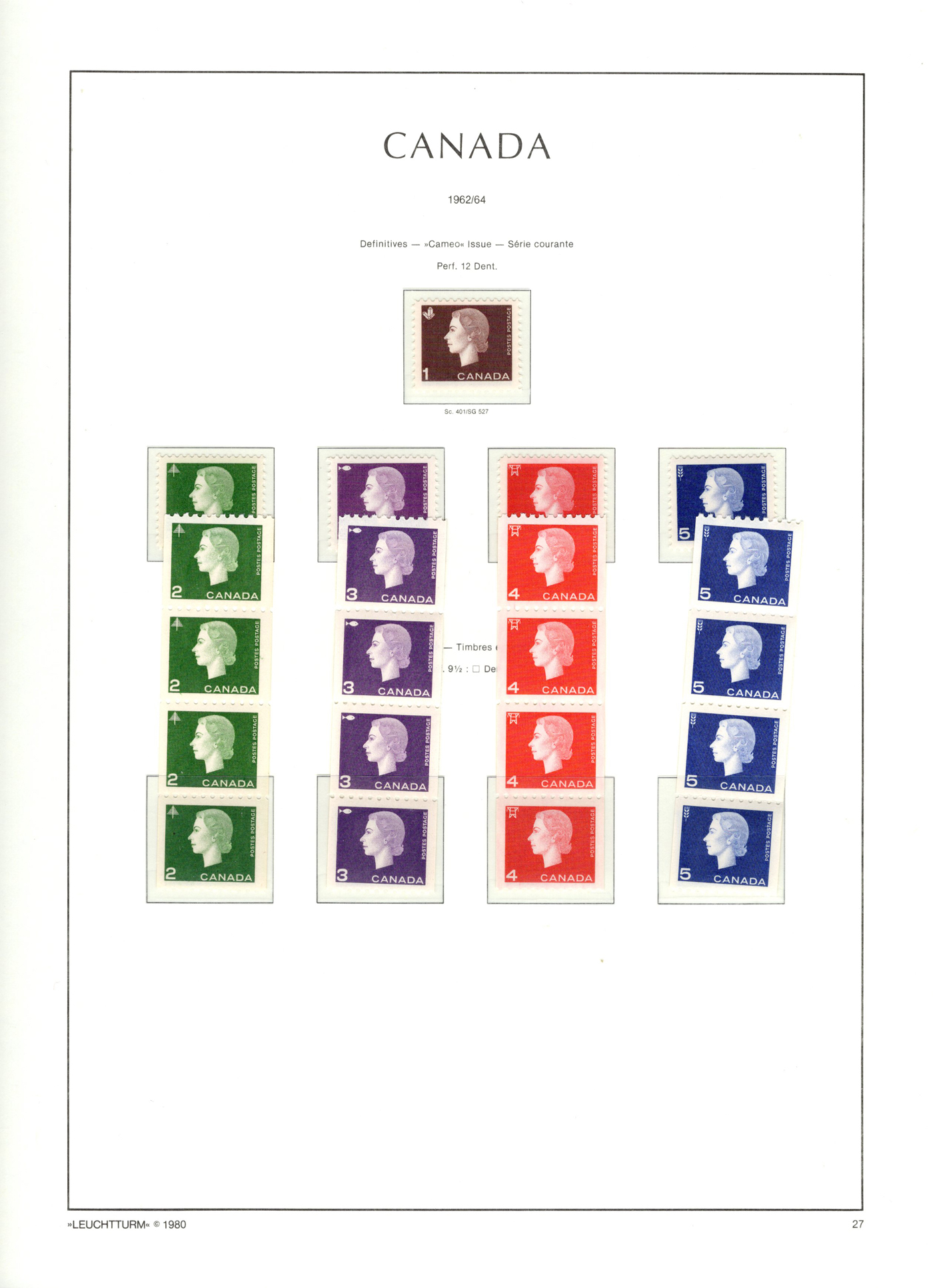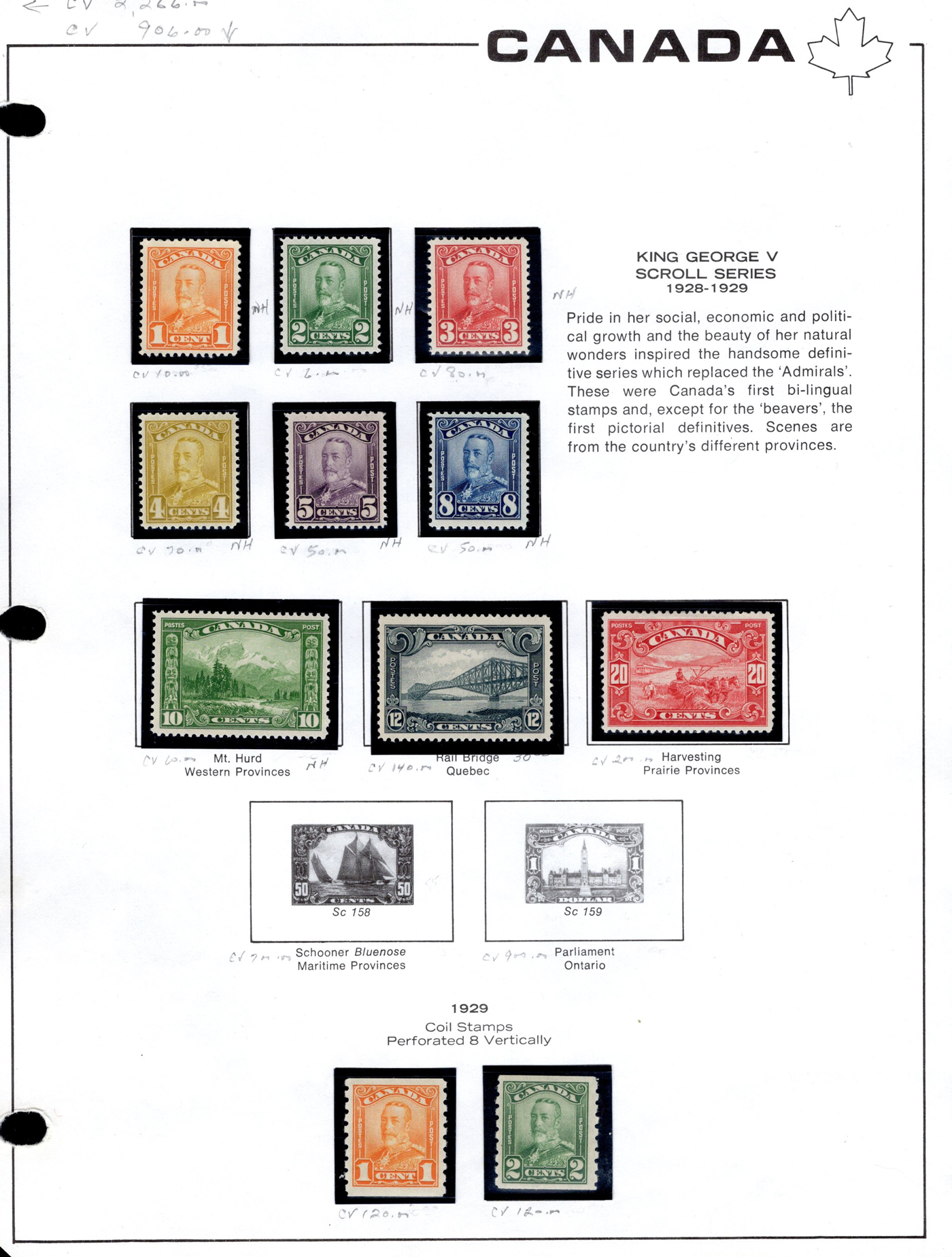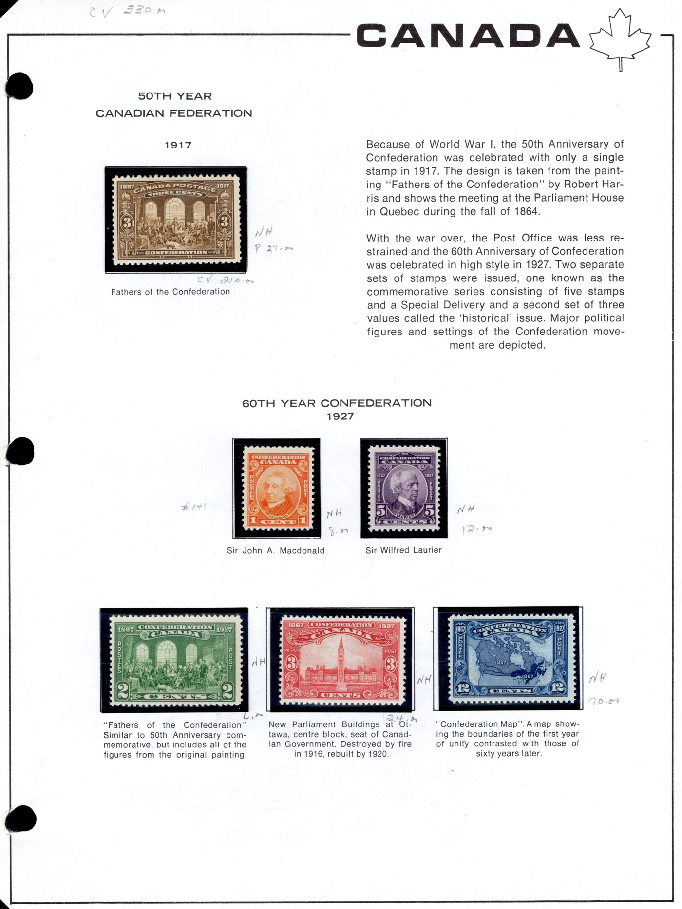 1442 og/nh 135/558 imageCollection of Mint Canada on Album Pages, 1917 to 1971, the first 4 pages contain complete 1917 and 1927 Confederation and Historical sets while the next page has a set of 1c to 10c Arch issues and the 4th page a set of 1c to 20c Scrolls (incl. both coils). The rest of the collection is on 35 Lighthouse hingeless pages with quite a good coverage of the 1930 to 1971 era, missing only a few stamps such as the 13c Britannia (it had a shilling mark and was lotted separately), and a few other low value items. This range does include extras such as many coil pairs and strips (eg. complete KGVI in pairs, etc.), the $1 Champlain Statue in two shades, complete Airmails, several phosphor issues including Centennials, 1970 Christmas 5c and 6c centre blocks and strips), etc. Although we did not check every stamp, a good sampling did not reveal any hinged, so we assume all NH but unconfirmed. This collector put emphasis on well centered stamps, so overall very fine. See photos online for a small idea of the contents. (Scan 1) (Scan 2) (Scan 3) (Scan 4) (Scan 5) (Scan 6) (Scan 7) (Scan 8) (Scan 9) (Scan 10) (Scan 11) (Scan 12) (Scan 13) (All Scans)